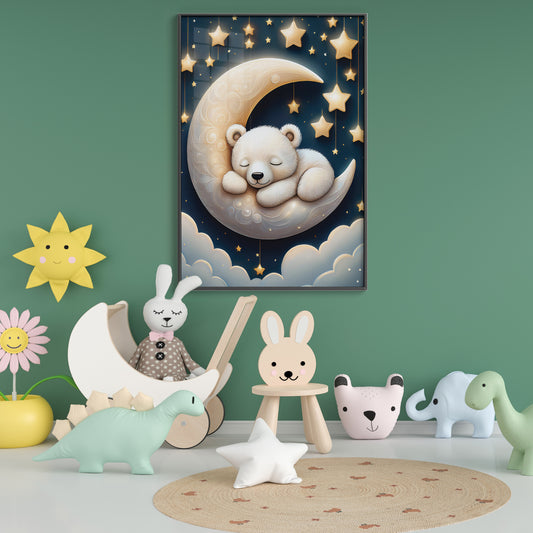White Bear Asleep on Lunar Moon – Starry Night Nursery Wall Decor