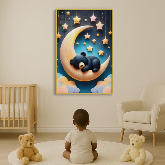 Sleeping Black Bear on Crescent Moon – Dreamy Nursery Wall Art
