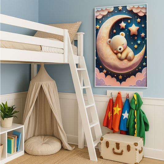 Golden Moon & Sleeping Brown Bear – Gentle Night Sky Wall Art for Nursery Decor