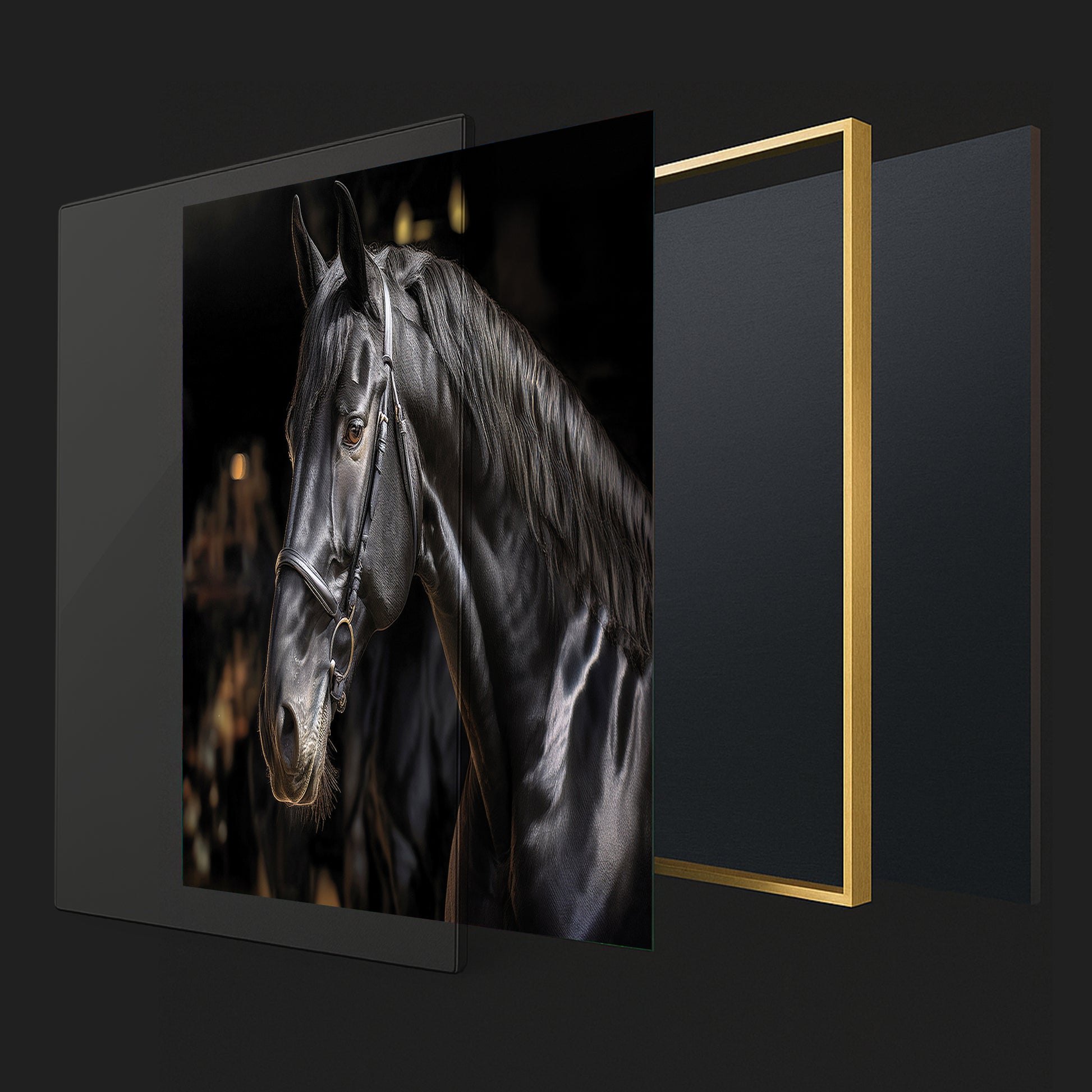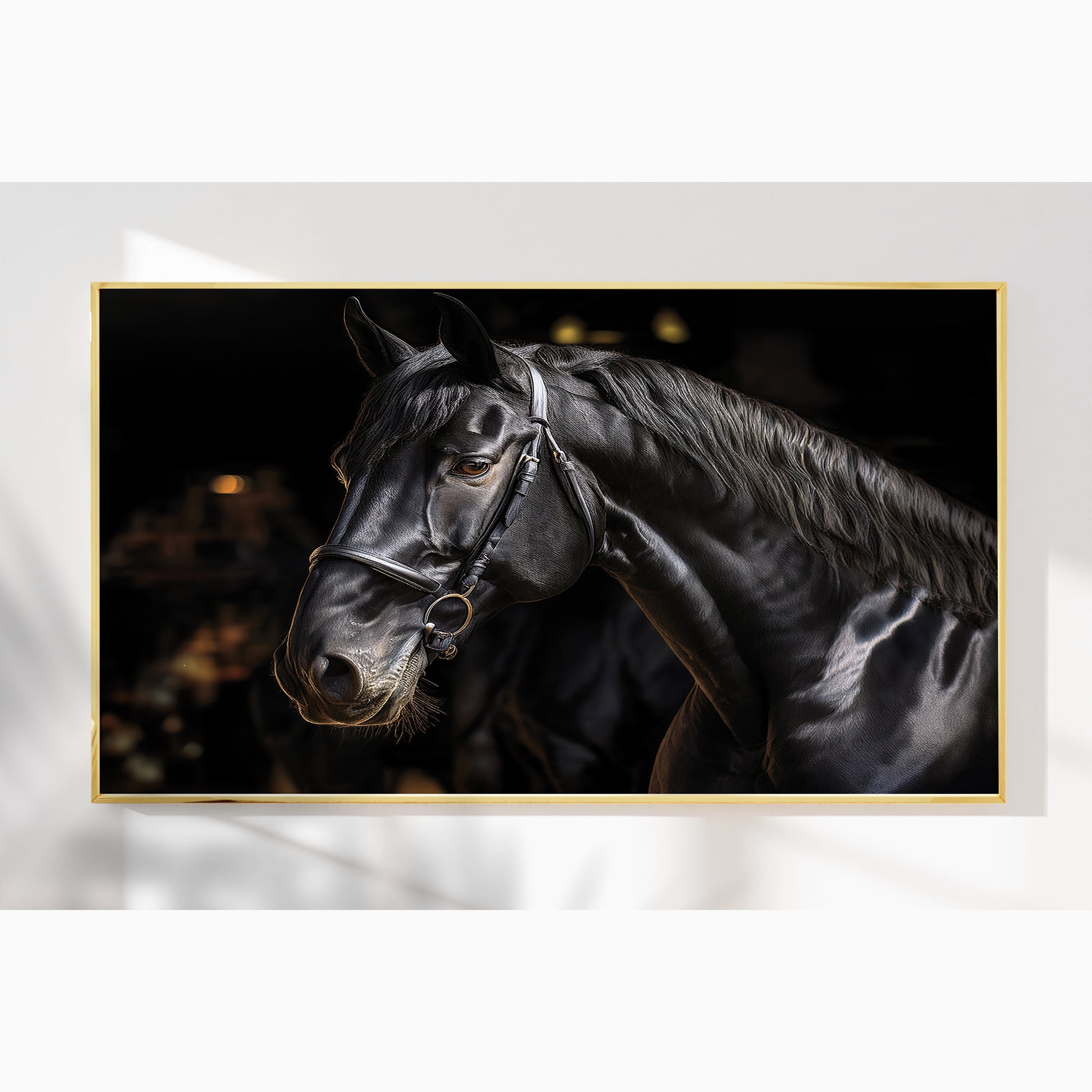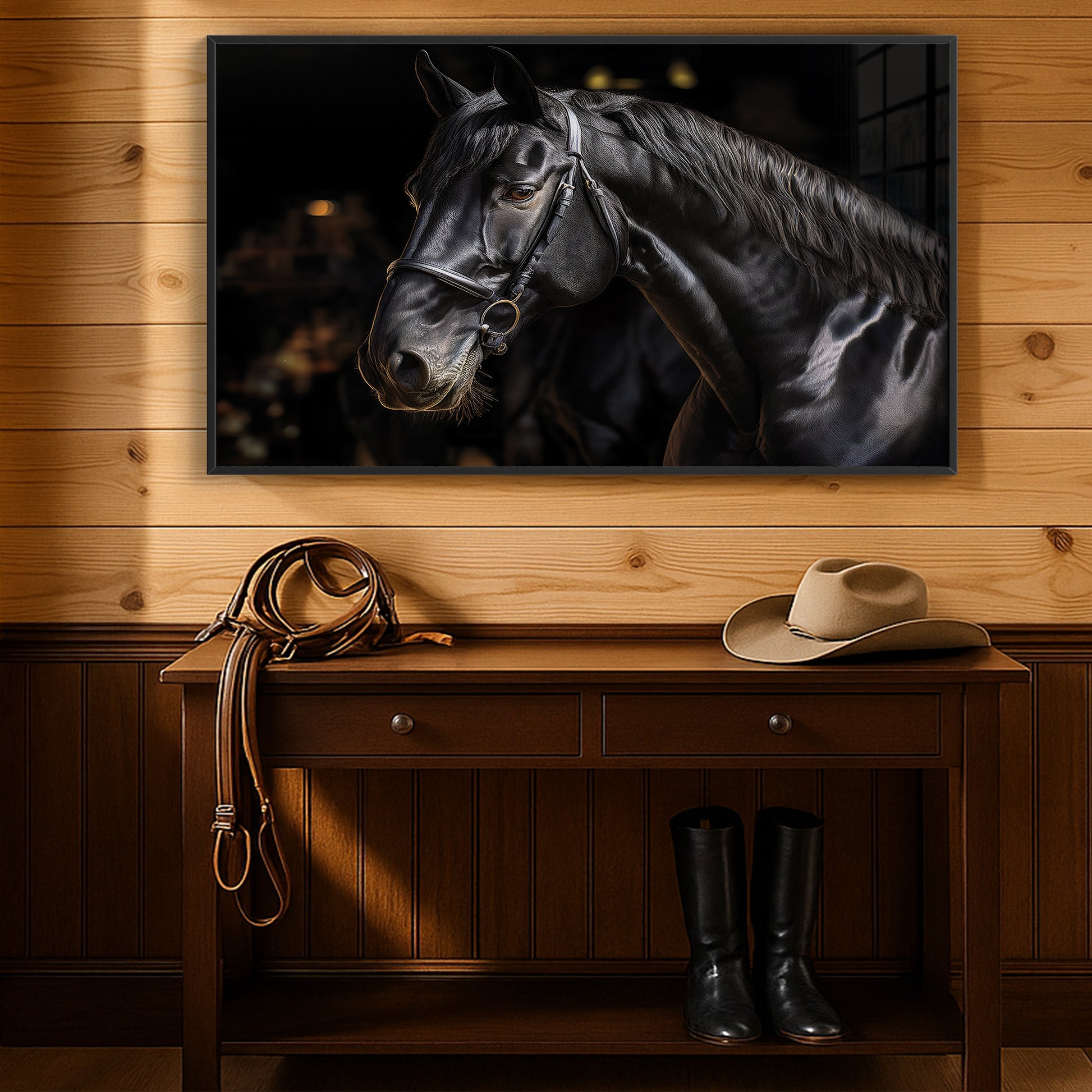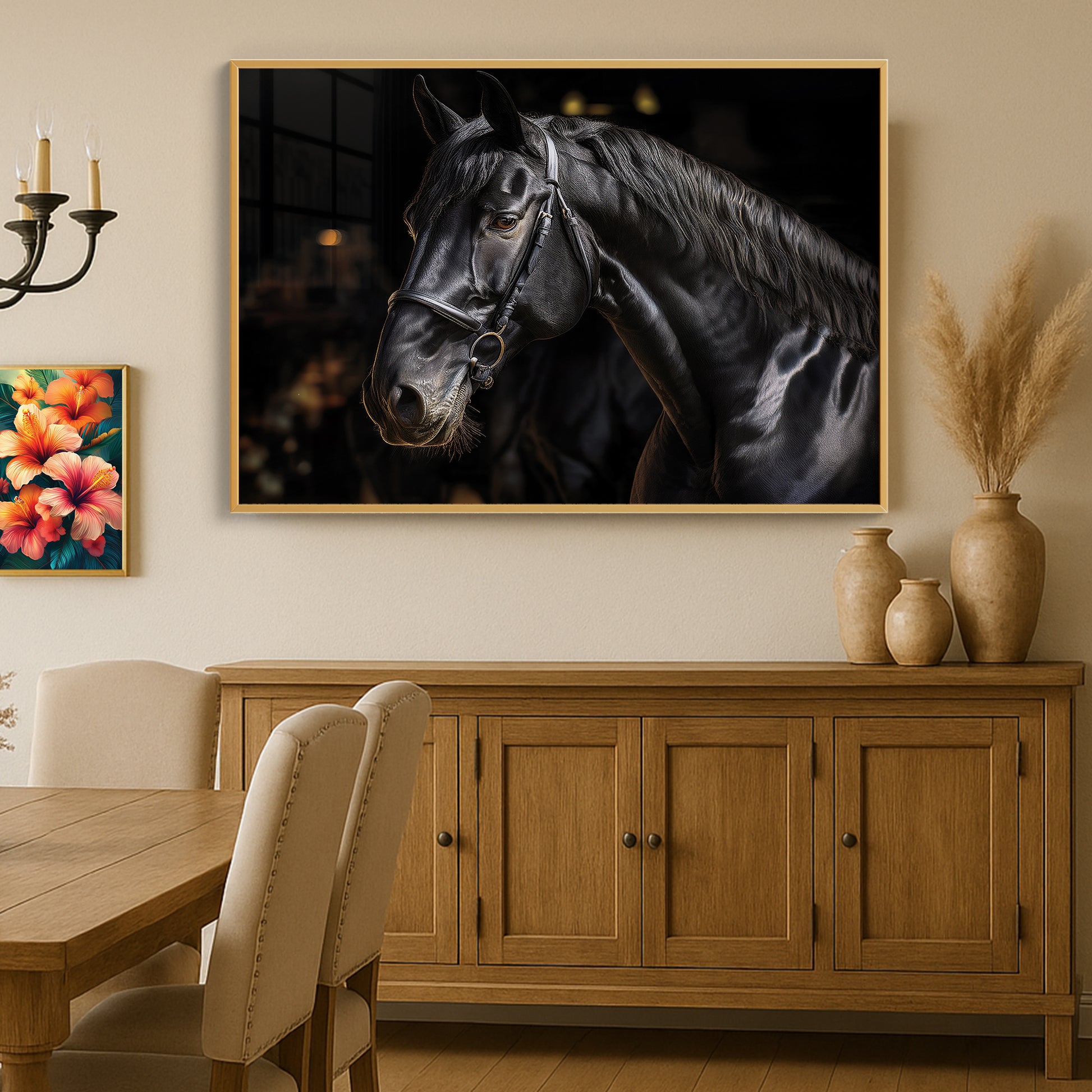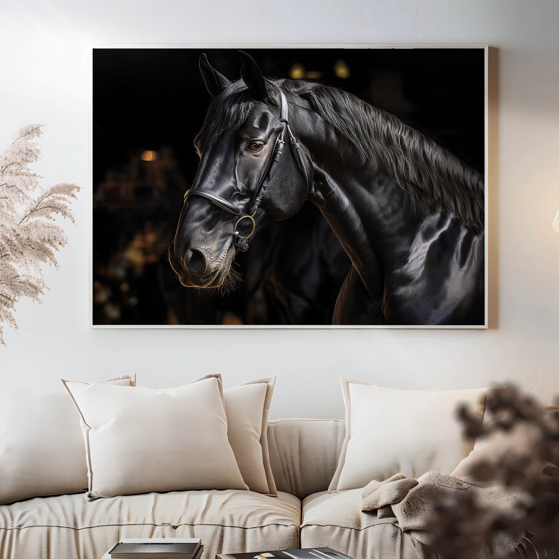 Bring strength and elegance to your space with this striking close-up of a black Percheron horse, bathed in golden light against a dramatic backdrop. Its watchful eye and glossy coat radiate wisdom, calm, and quiet power—perfect for study walls, entryways, or equestrian-inspired interiors.