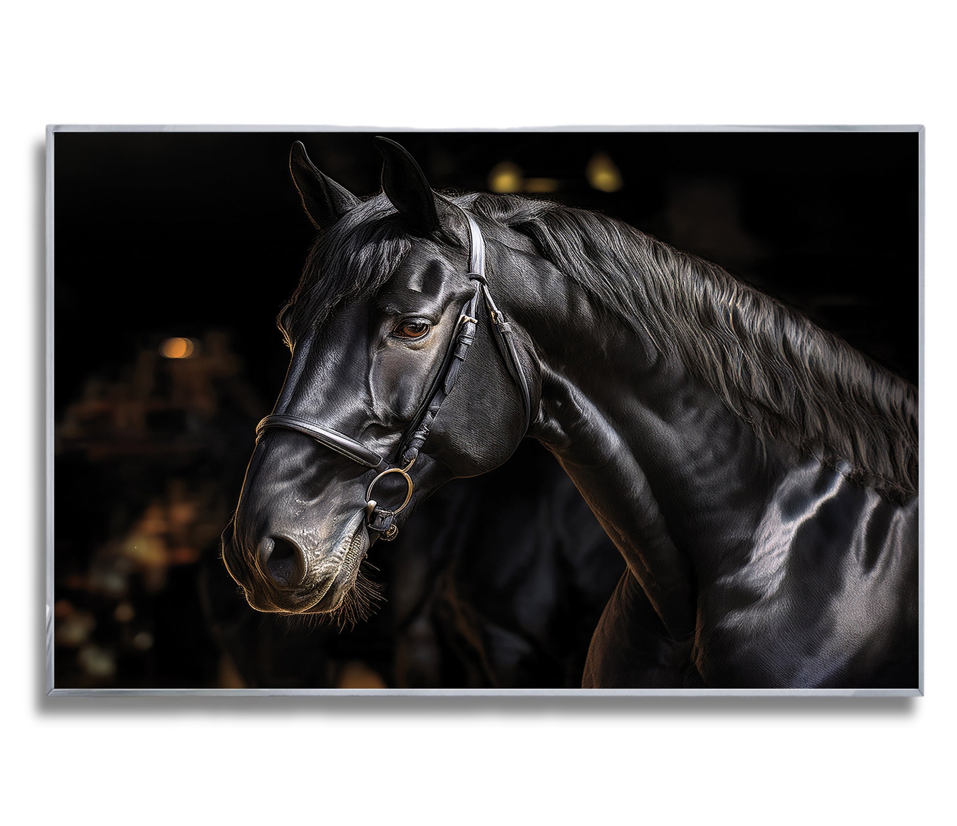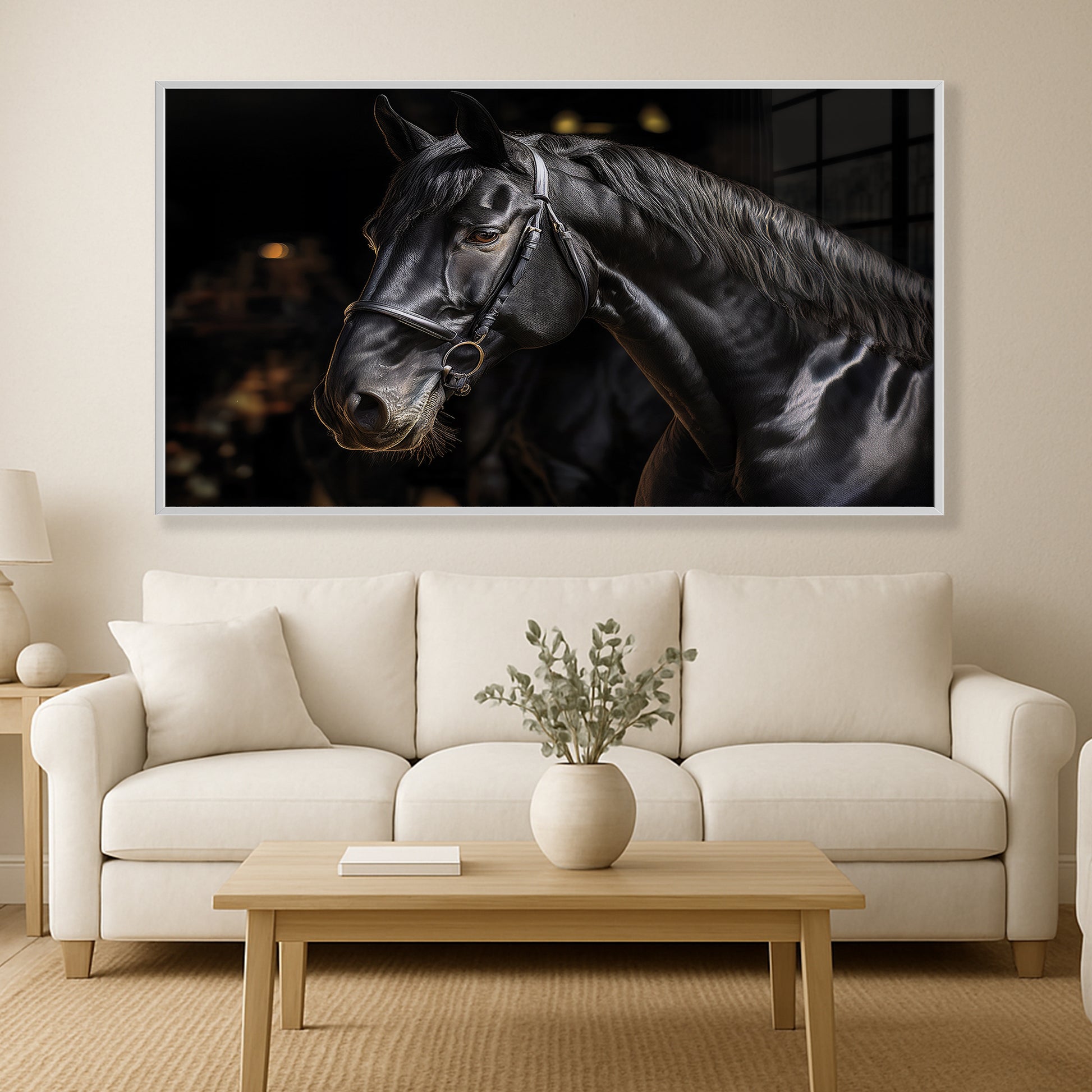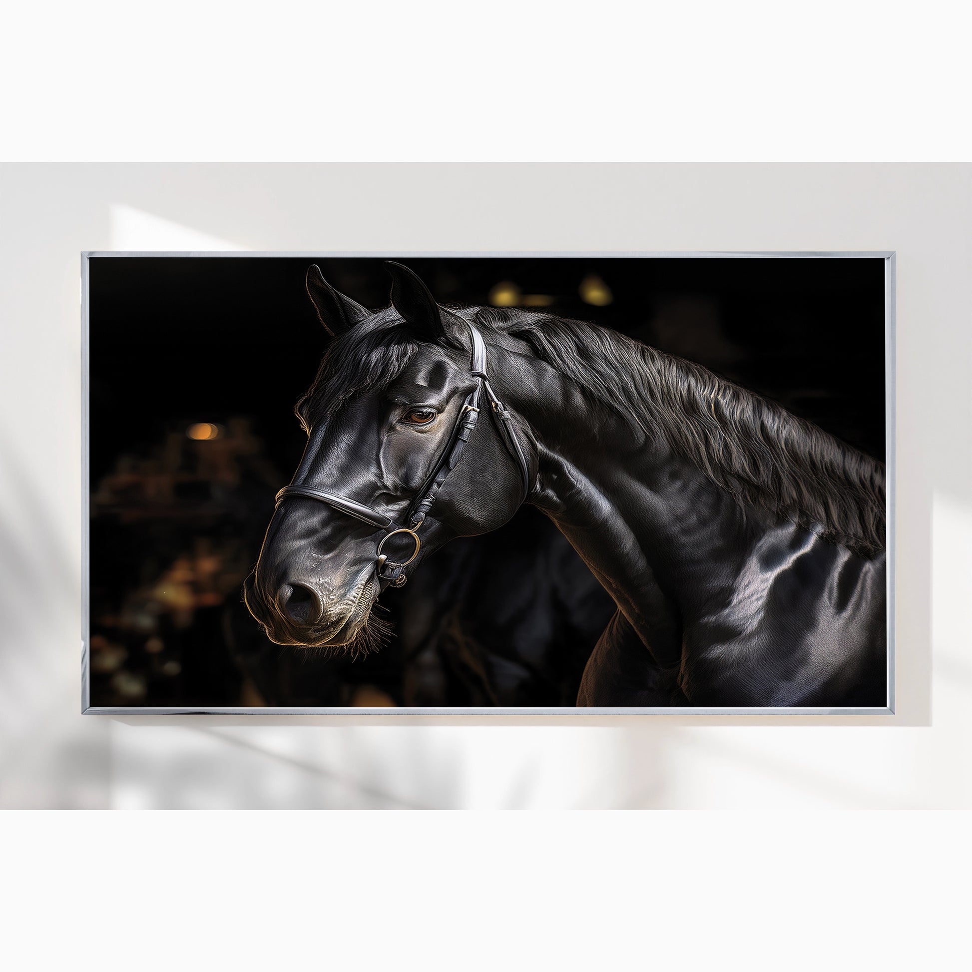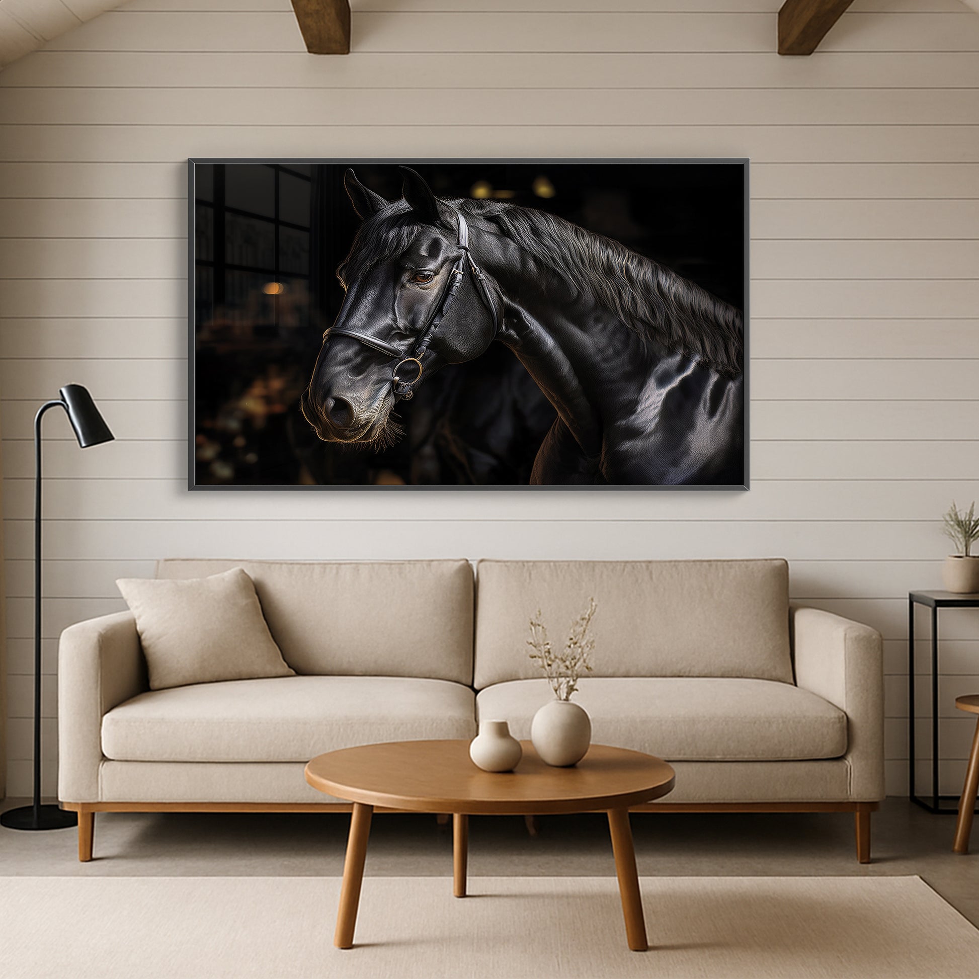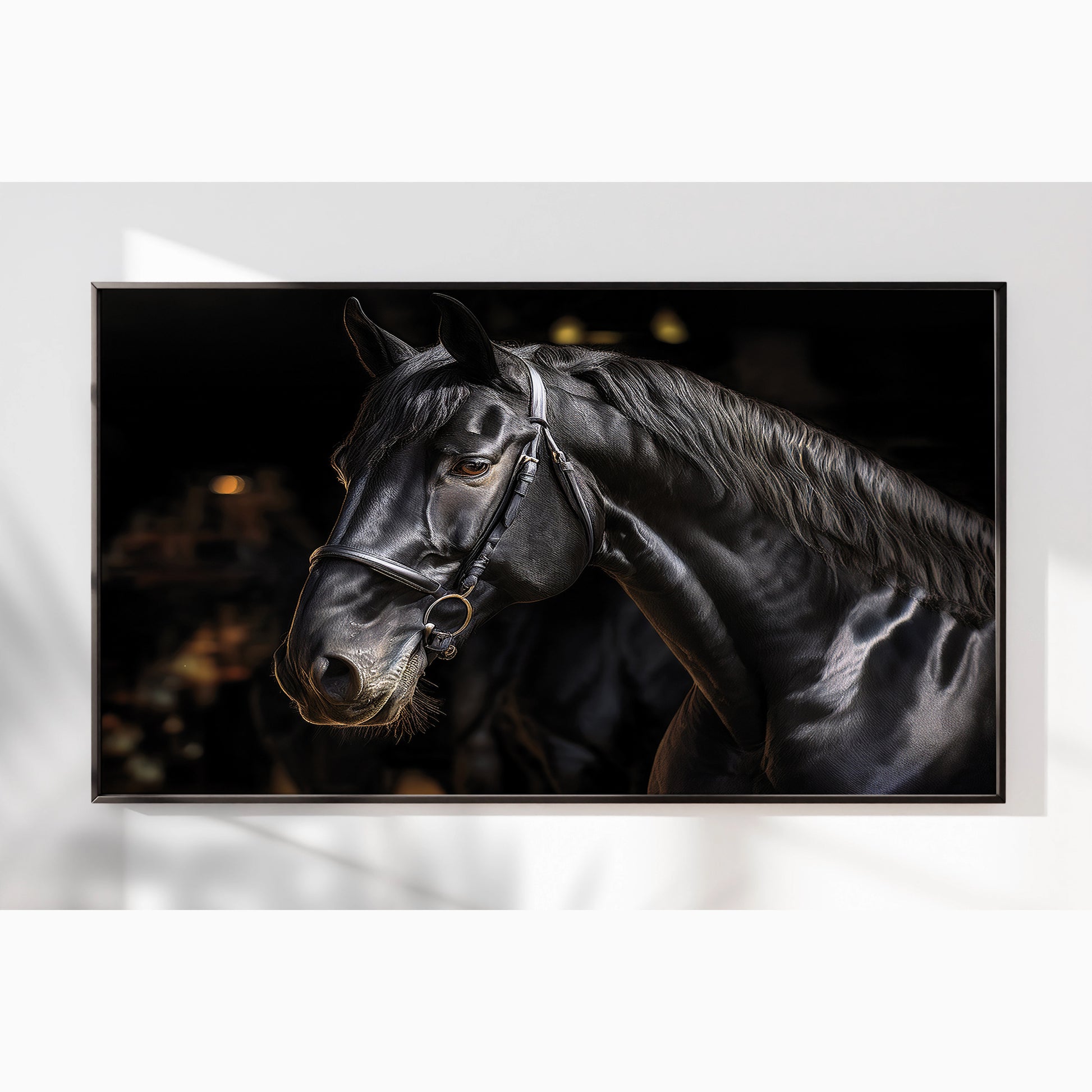Bring strength and elegance to your space with this striking close-up of a black Percheron horse, bathed in golden light against a dramatic backdrop. Its watchful eye and glossy coat radiate wisdom, calm, and quiet power—perfect for study walls, entryways, or equestrian-inspired interiors.