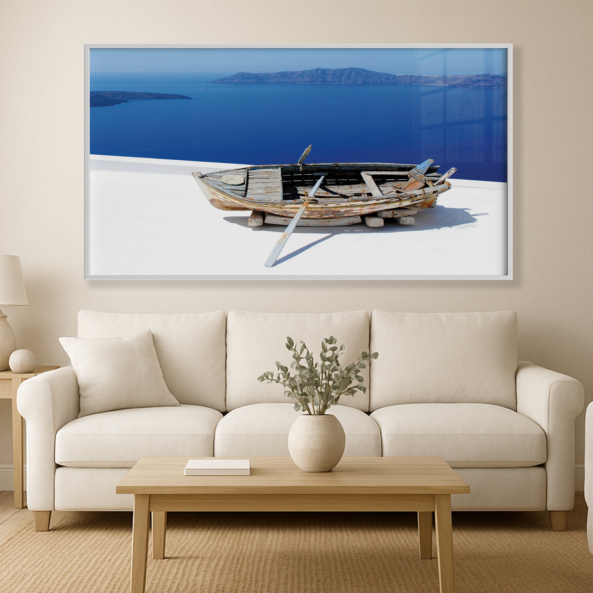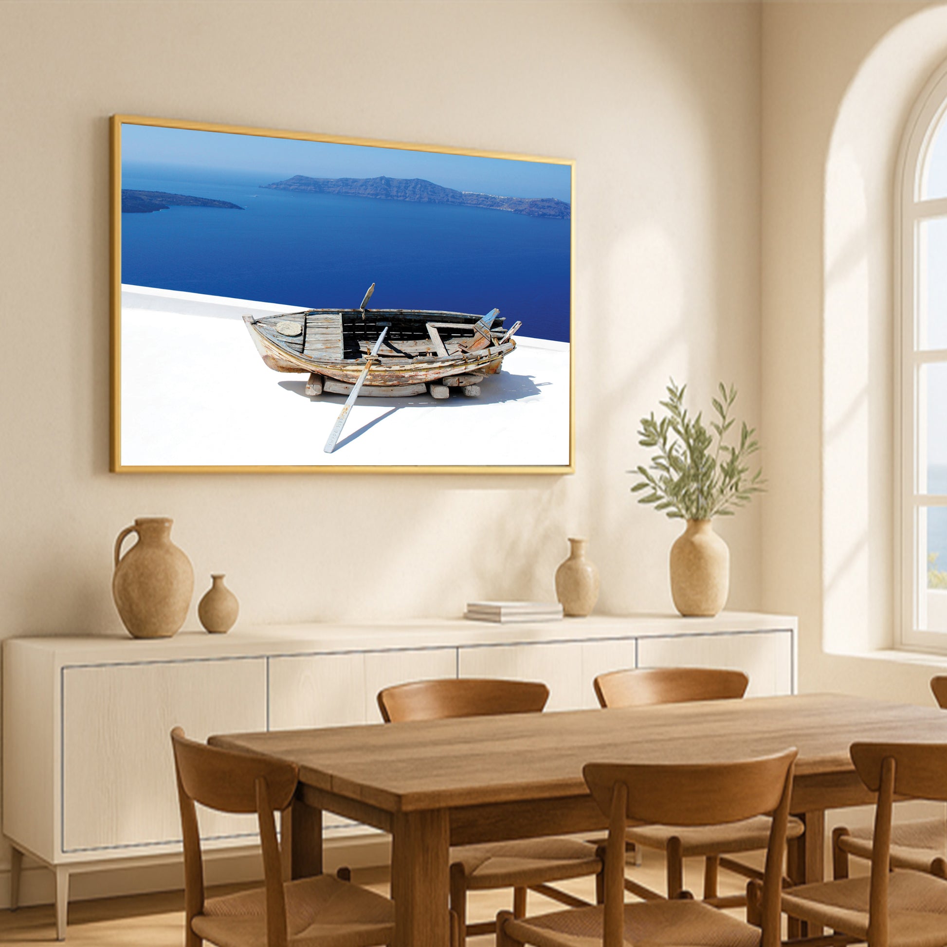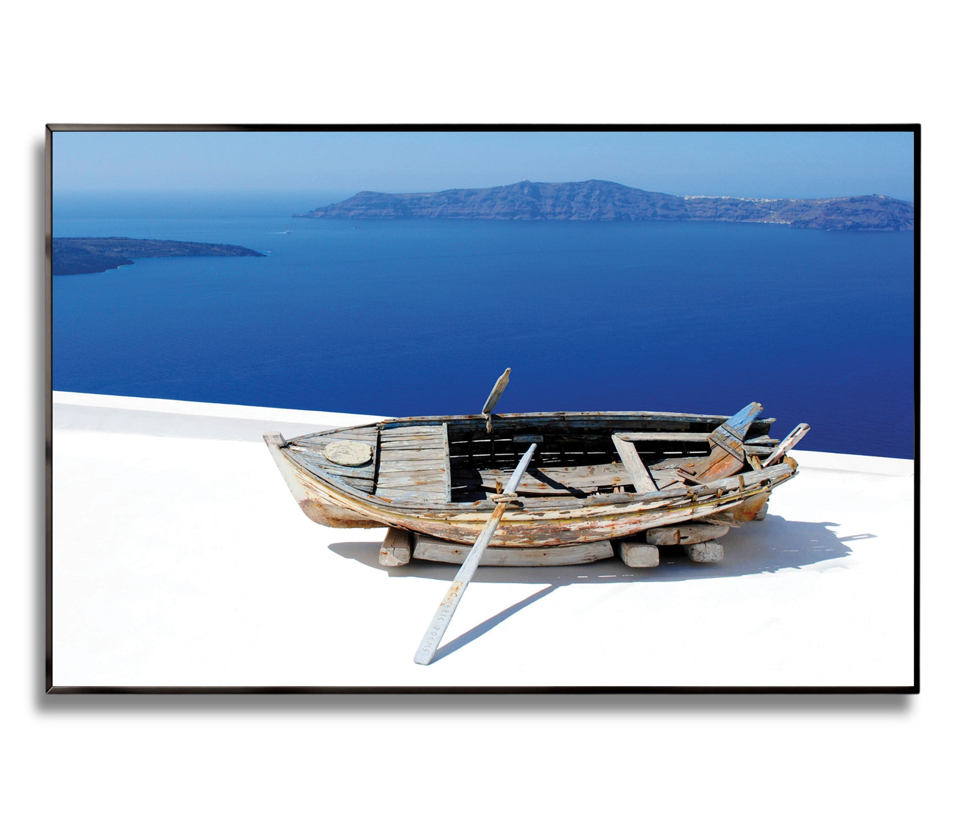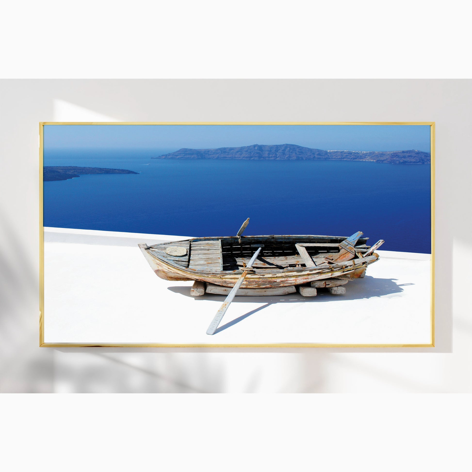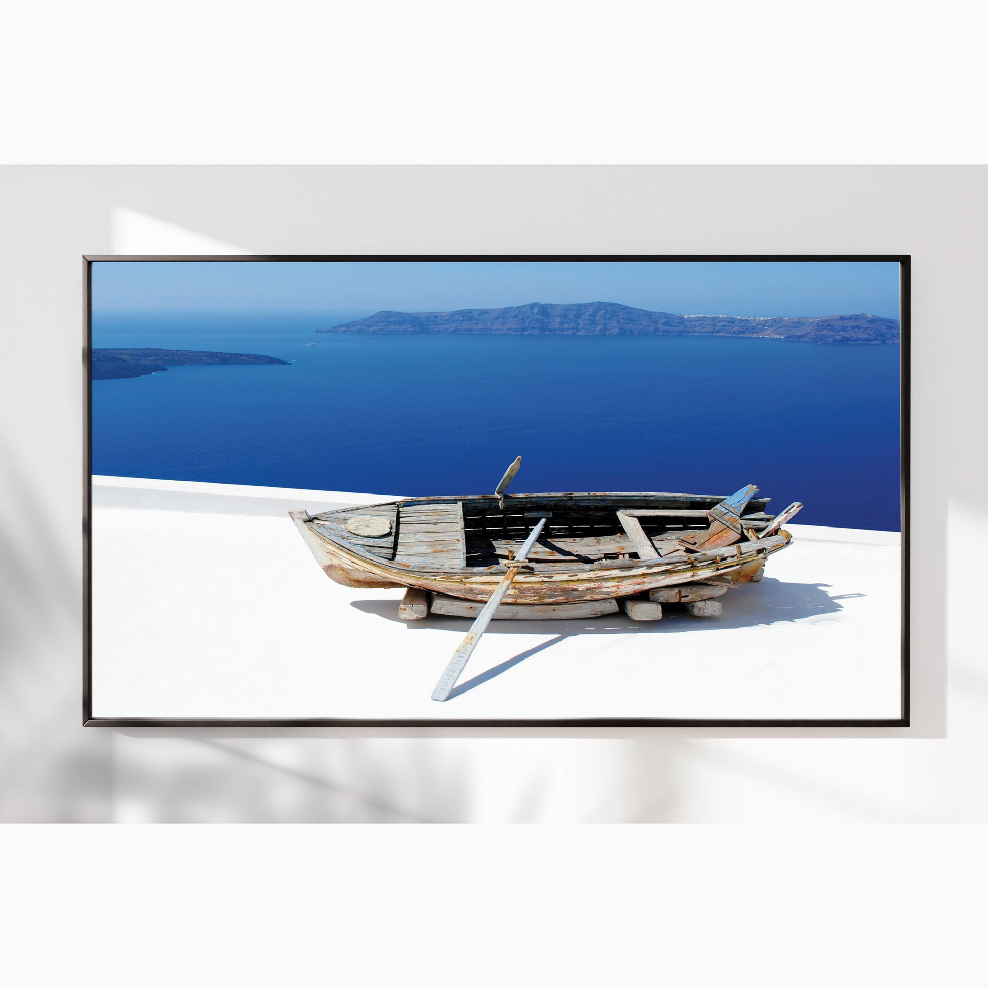 Showcasing a weathered wooden boat resting above the endless blues of the Santorini coast, this artwork captures the raw beauty and rustic charm of Greek island life.