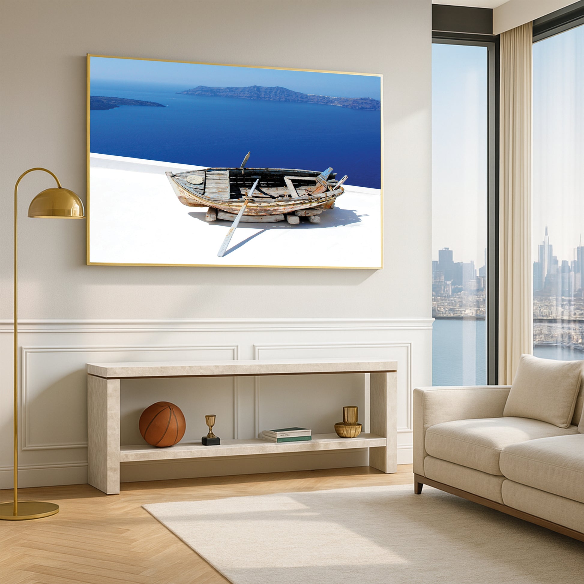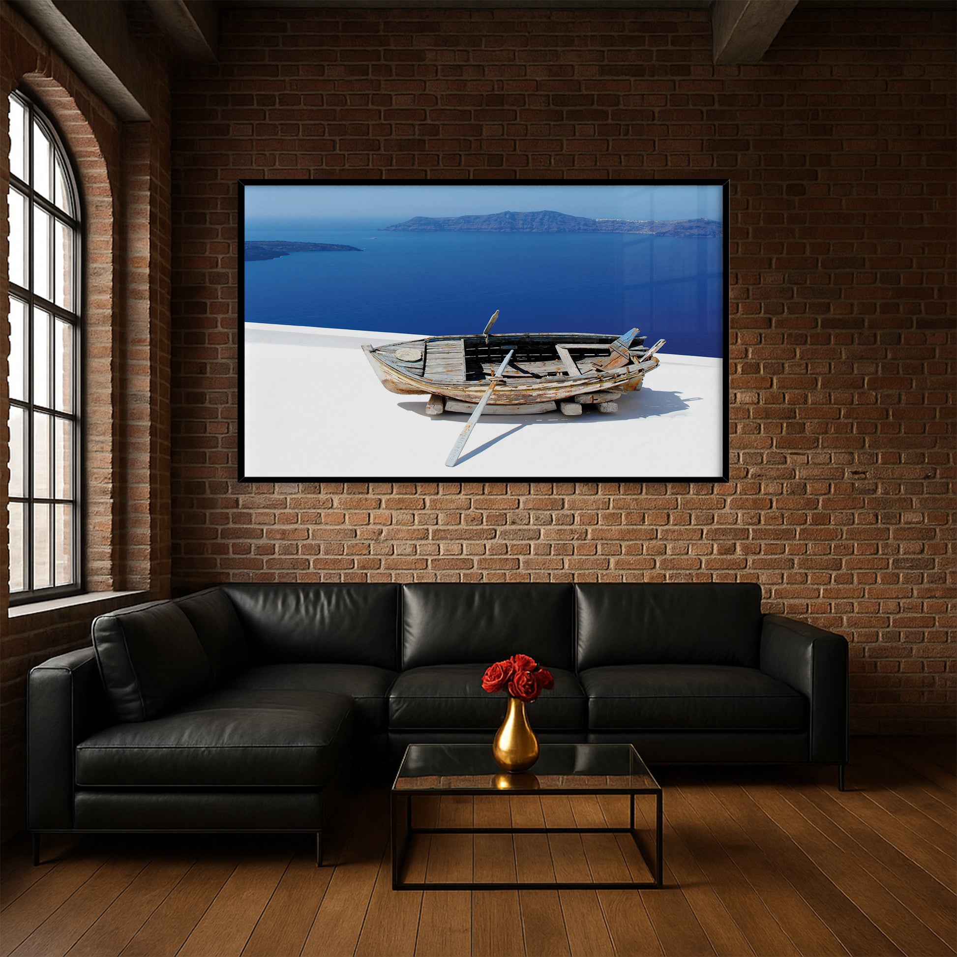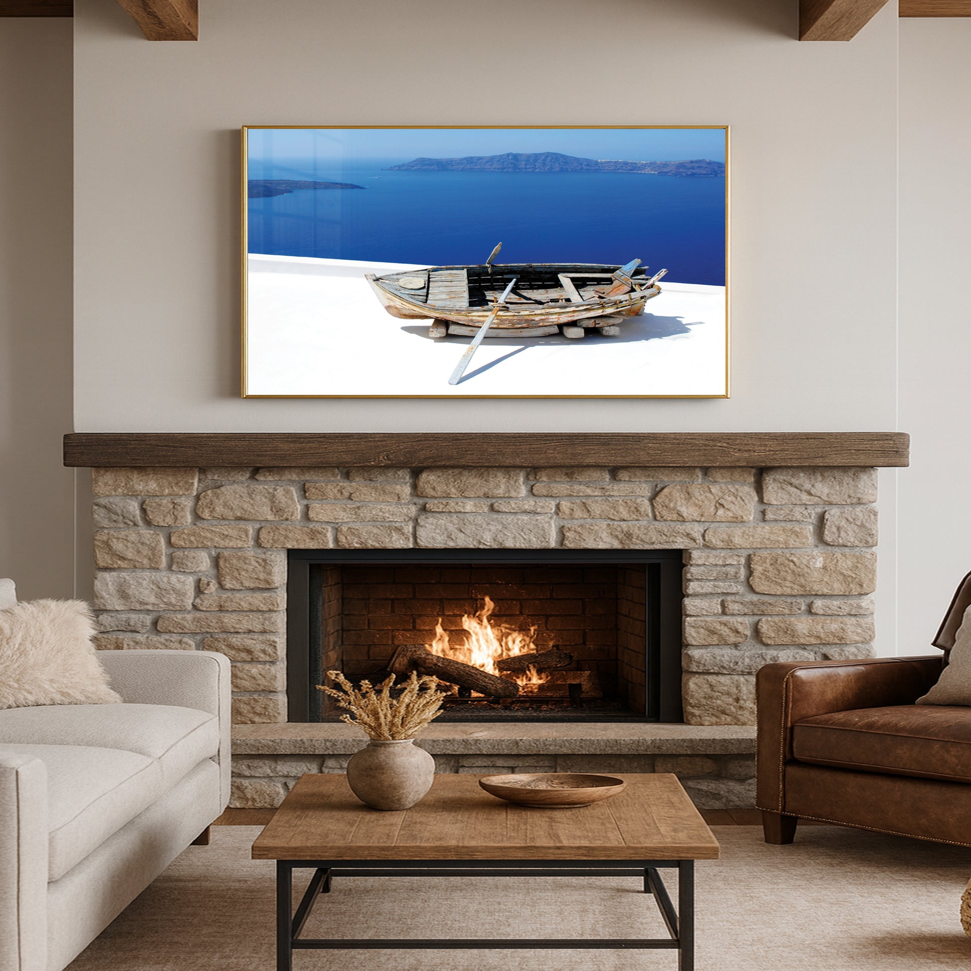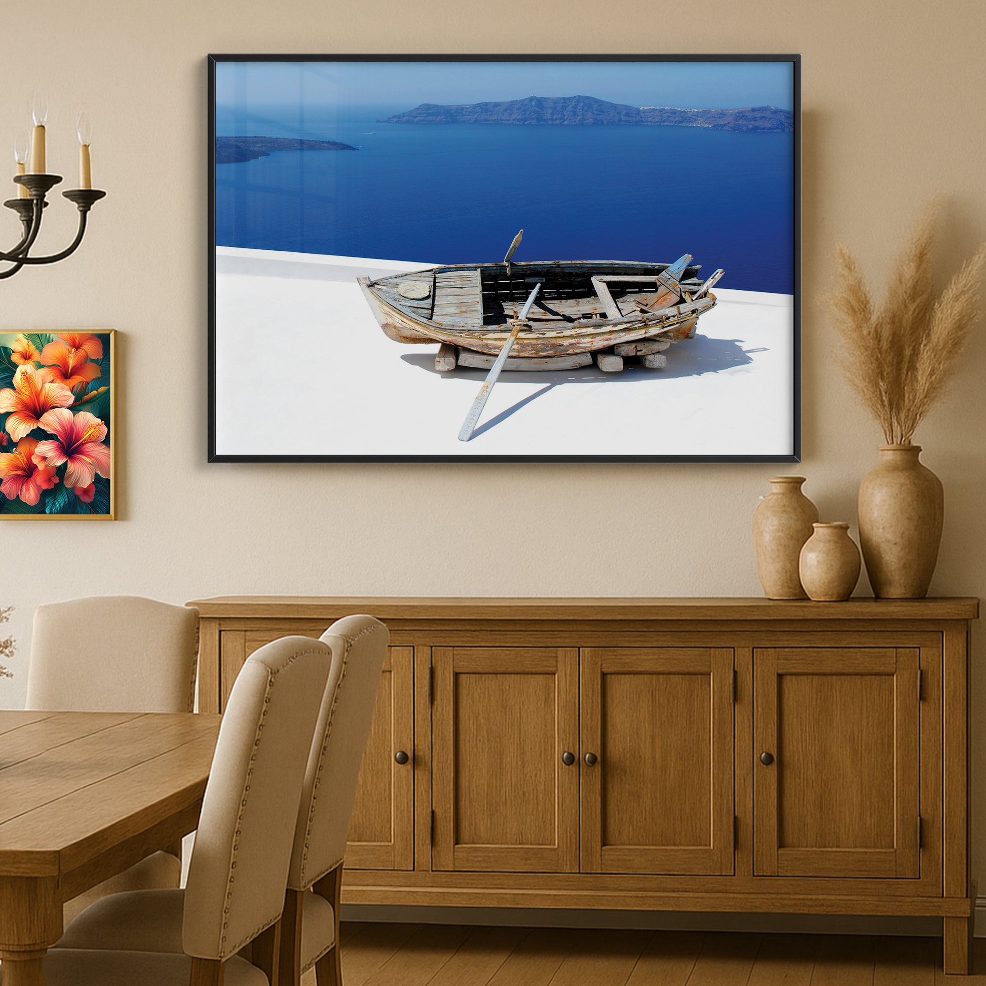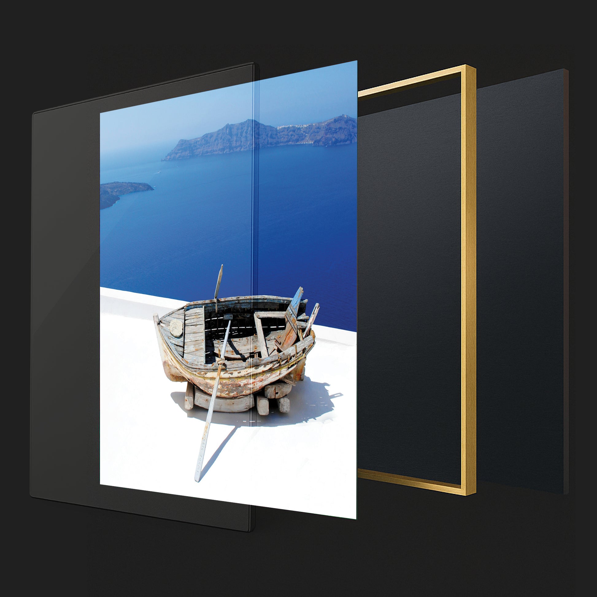 Showcasing a weathered wooden boat resting above the endless blues of the Santorini coast, this artwork captures the raw beauty and rustic charm of Greek island life.