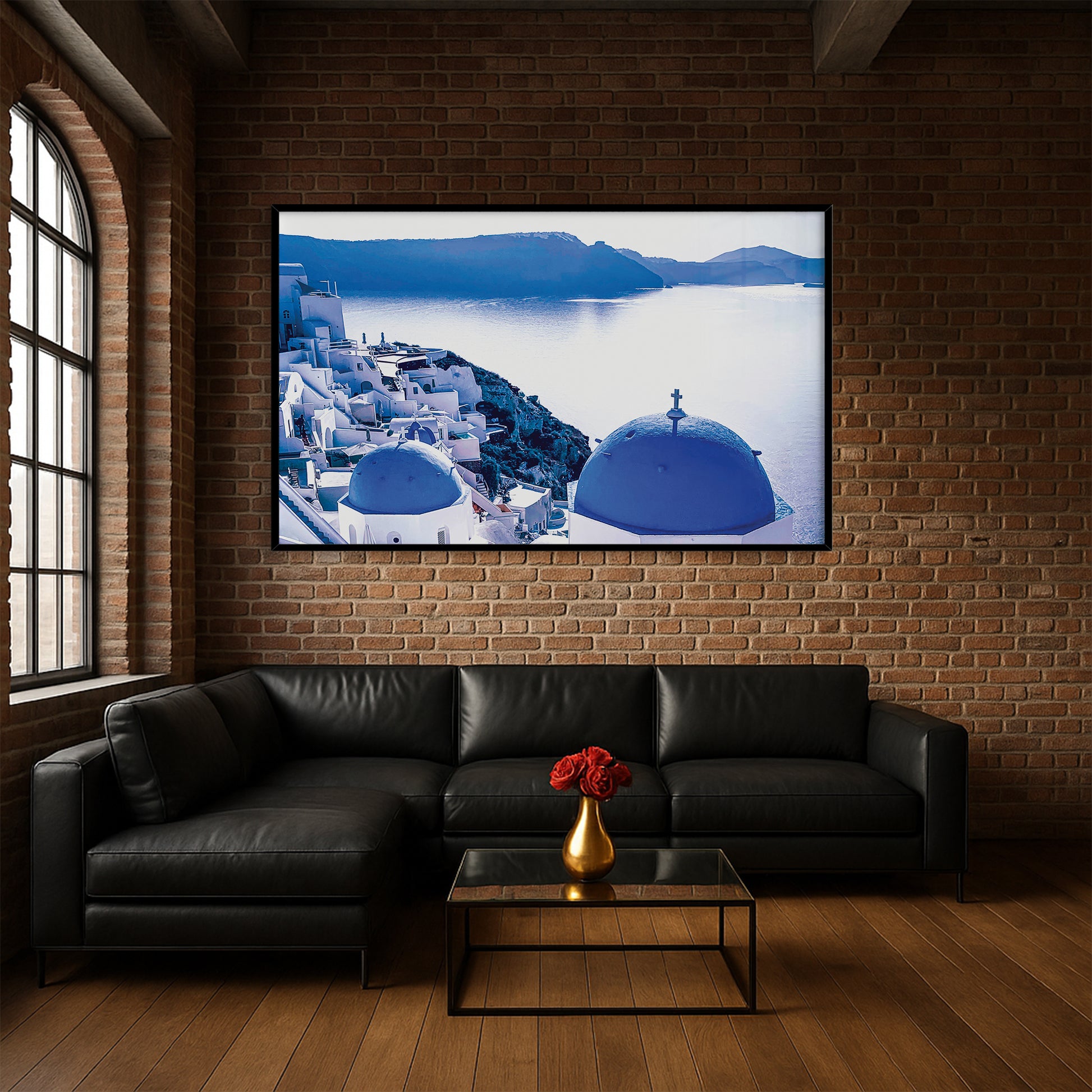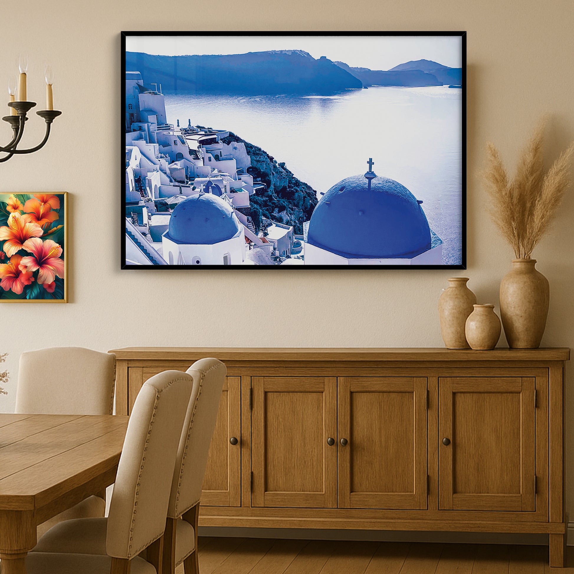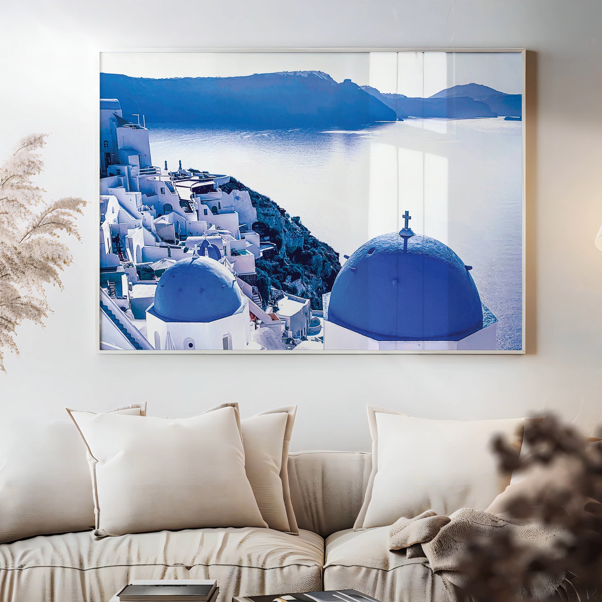 A captivating view of the iconic, blue-domed churches of Oia, perched on the cliffs of Santorini, Greece. This serene scene captures the subtle pastel light of dusk reflecting on the Aegean Sea, with volcanic caldera silhouettes in the background. The stark white Cycladic architecture contrasts beautifully with the deep blue domes, evoking a sense of calm and timeless charm.