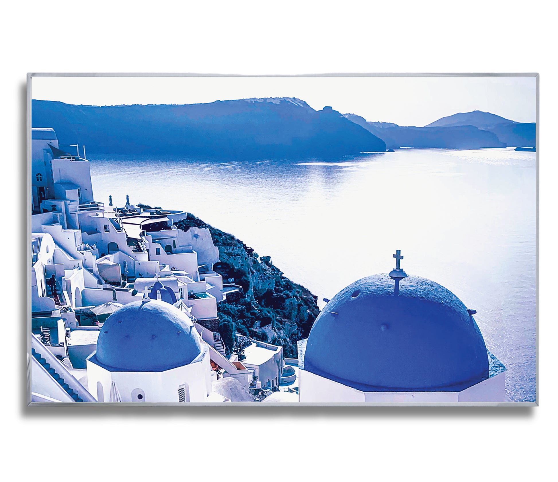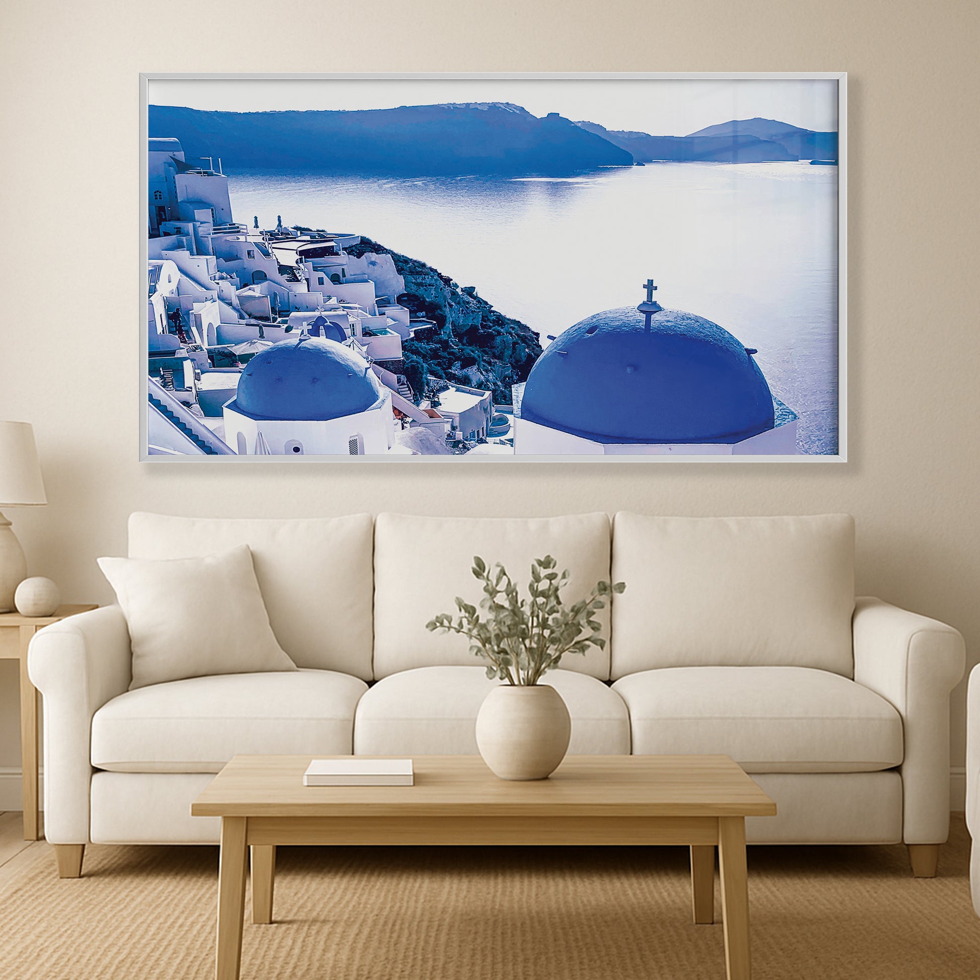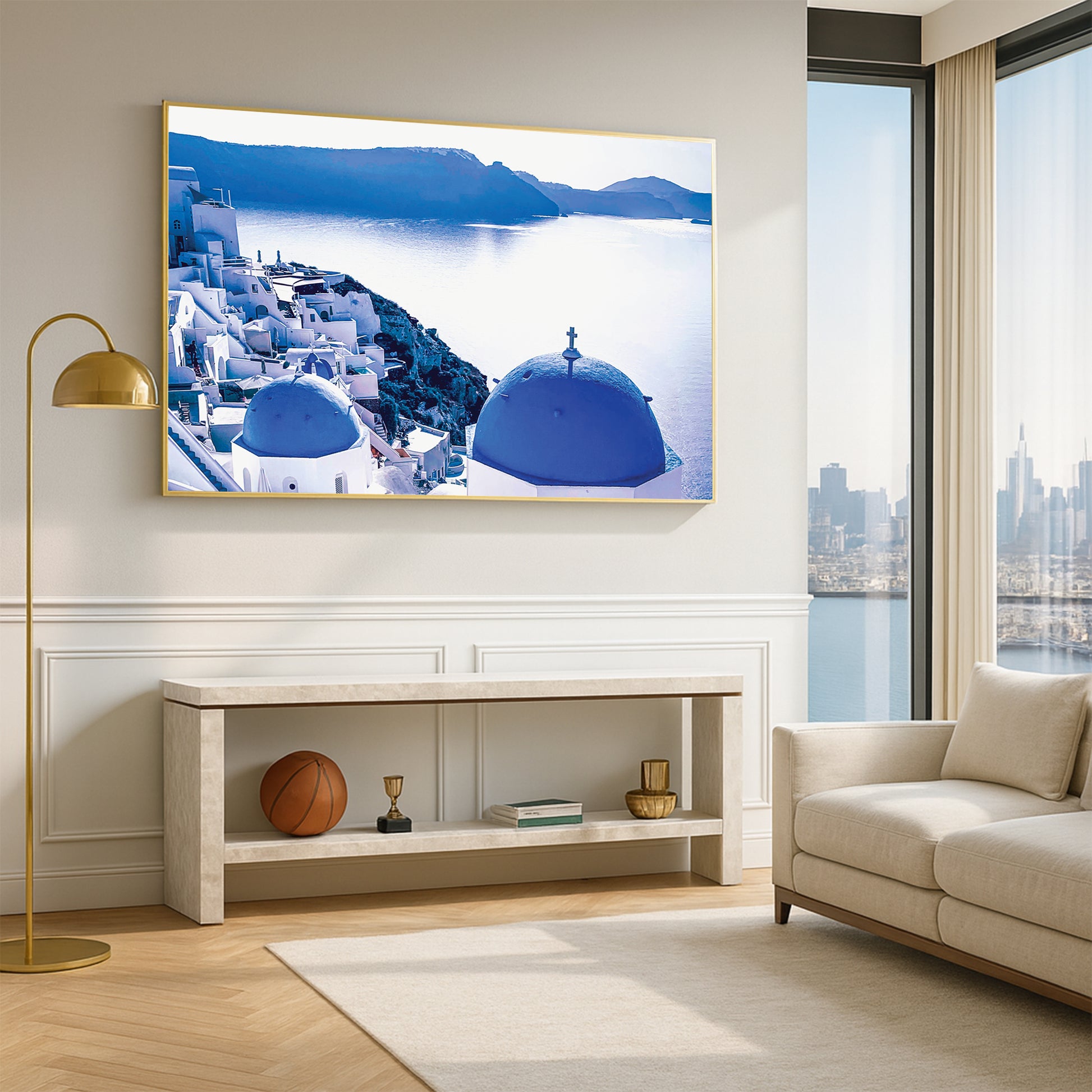A captivating view of the iconic, blue-domed churches of Oia, perched on the cliffs of Santorini, Greece. This serene scene captures the subtle pastel light of dusk reflecting on the Aegean Sea, with volcanic caldera silhouettes in the background. The stark white Cycladic architecture contrasts beautifully with the deep blue domes, evoking a sense of calm and timeless charm.