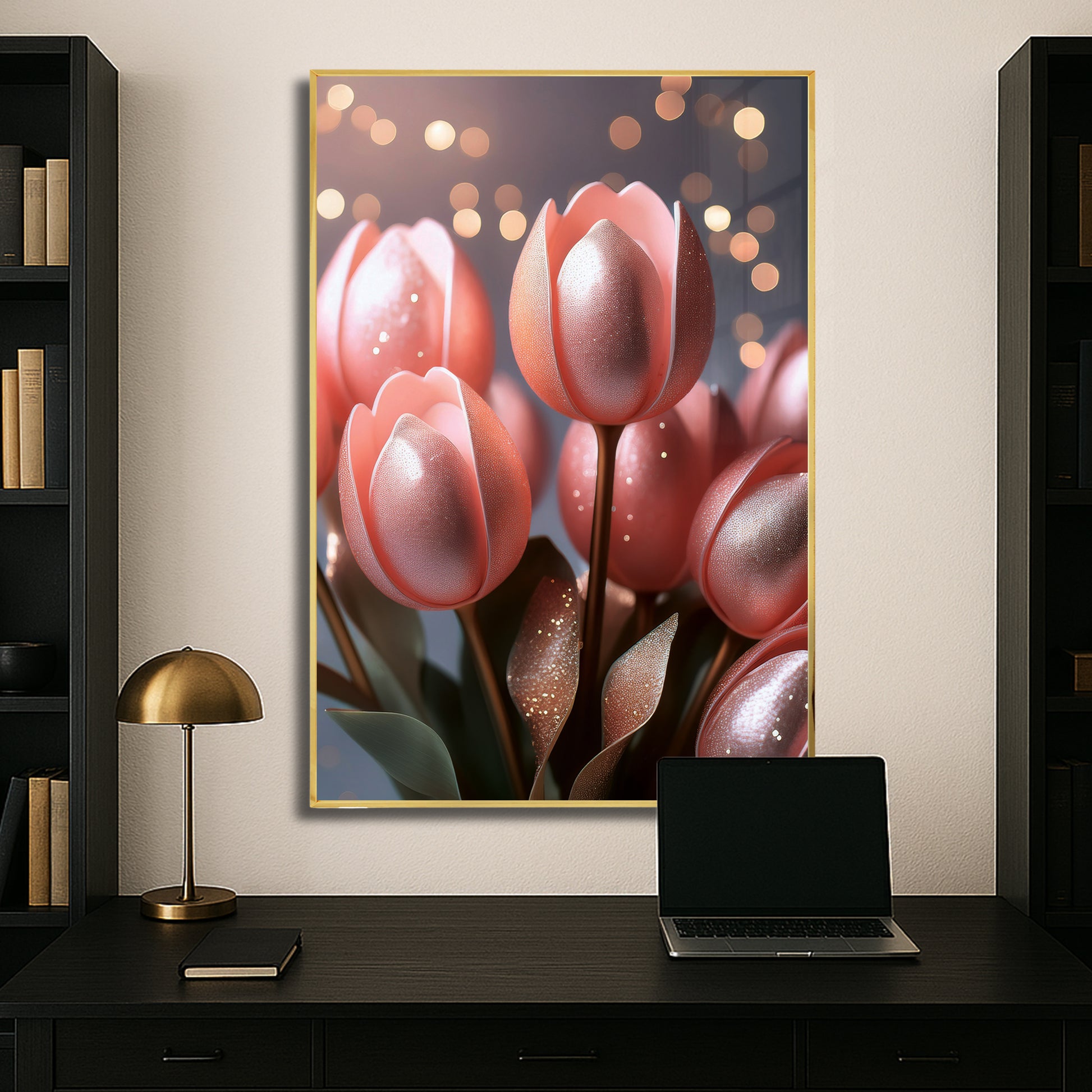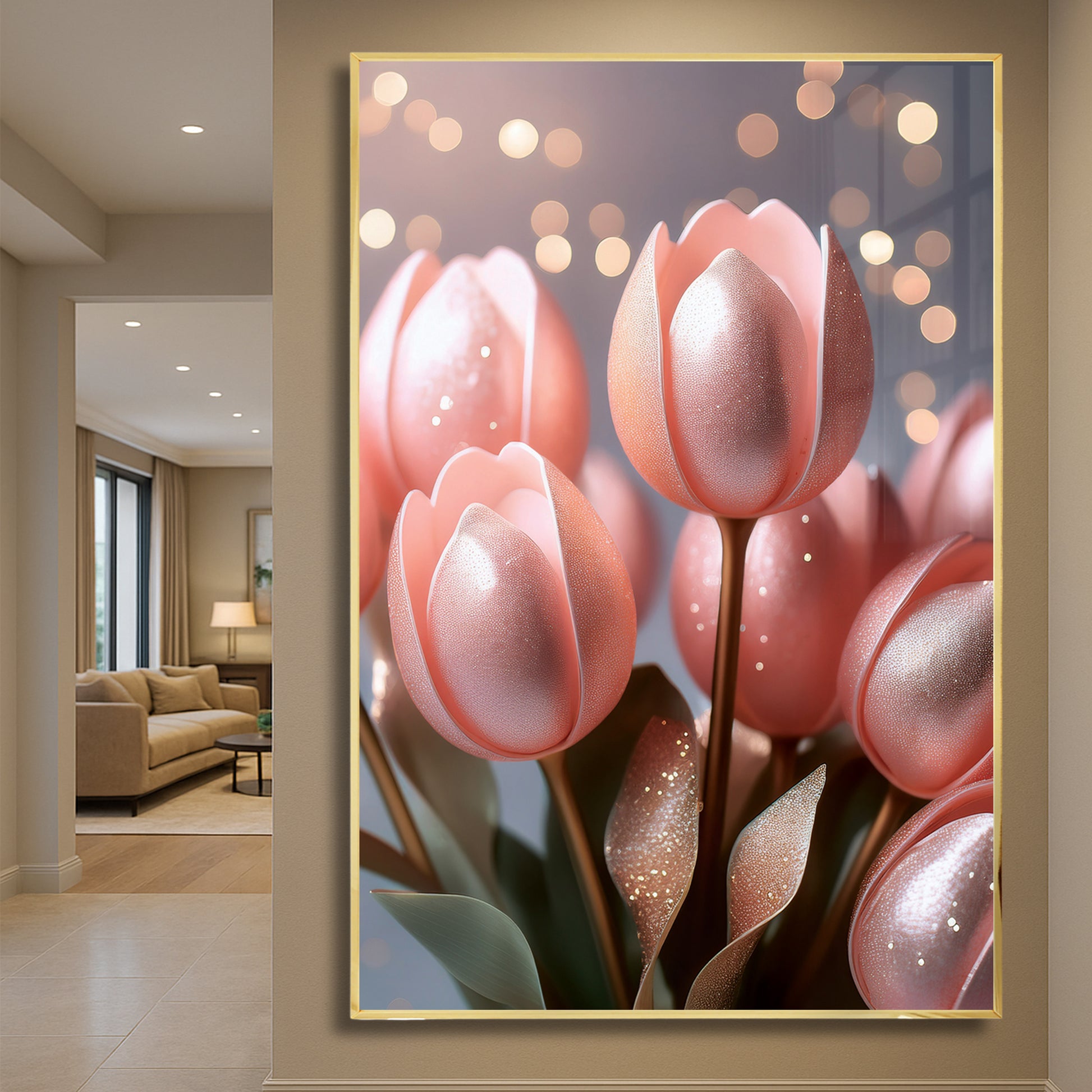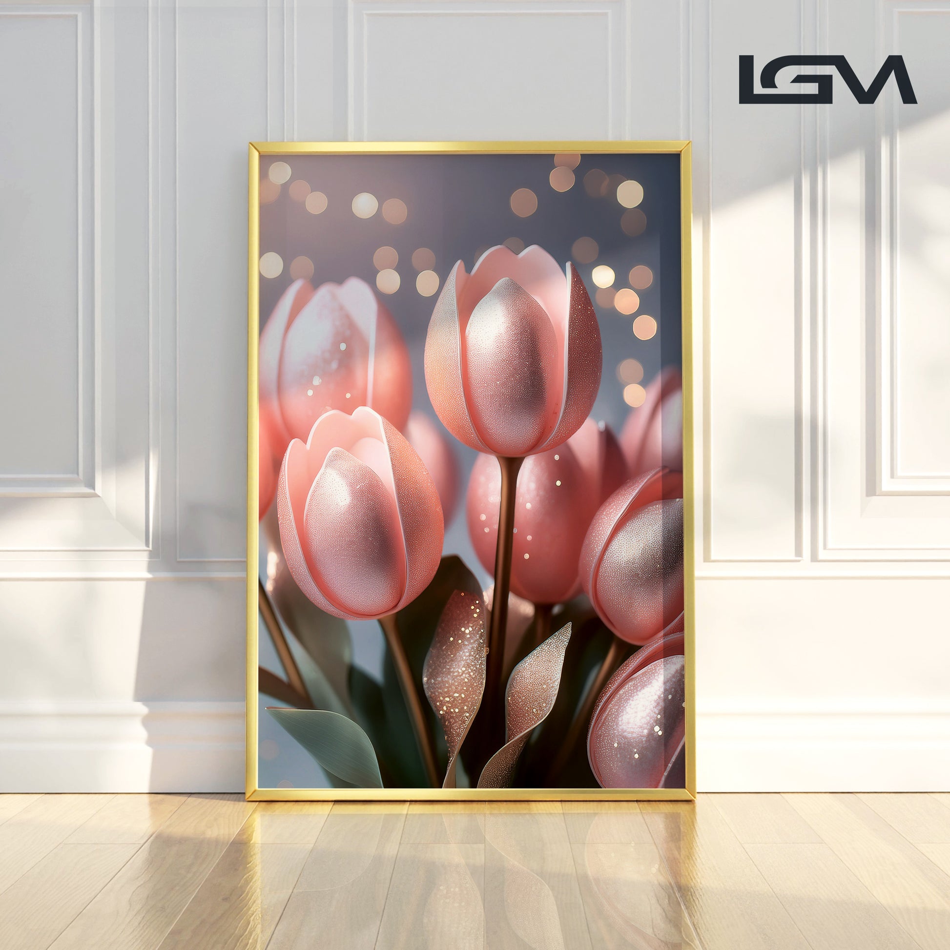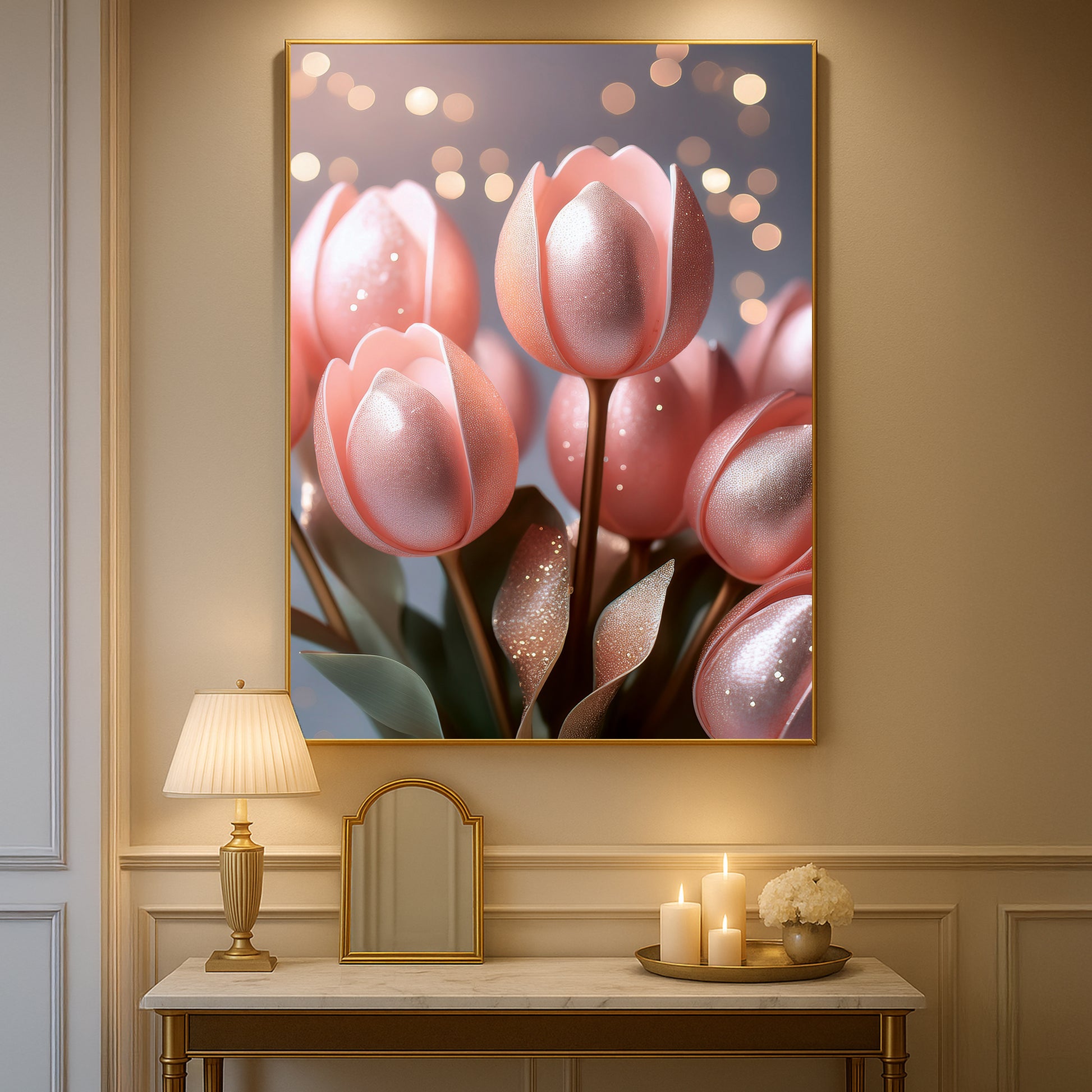 Brighten your space with this Blush Pink Tulip Bouquet Metal Framed Wall Art. Featuring soft, dewy tulips with a subtle shimmer, this artwork brings romance and freshness to any room. The sparkling details and delicate pink tones add a dreamy touch, making it perfect for bedrooms, living rooms, or gift décor. Professionally framed in durable metal, it combines elegance and charm with timeless beauty.