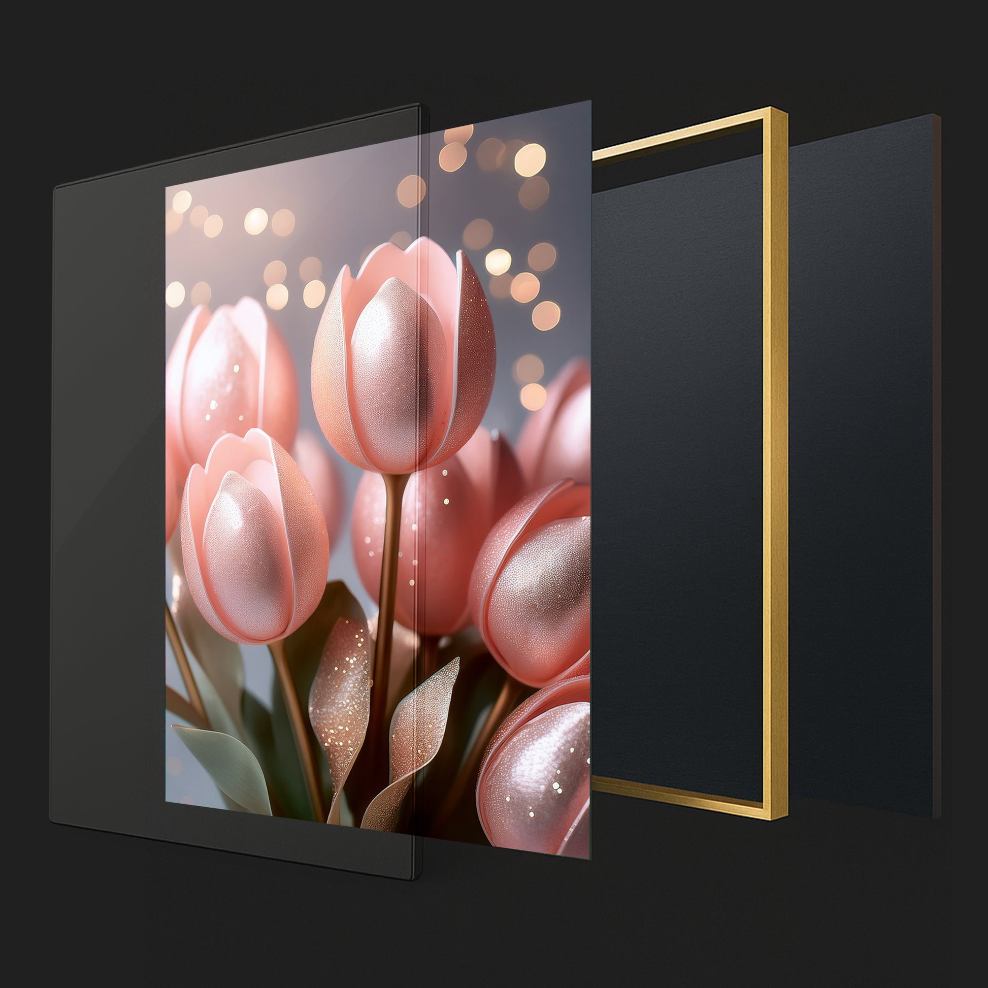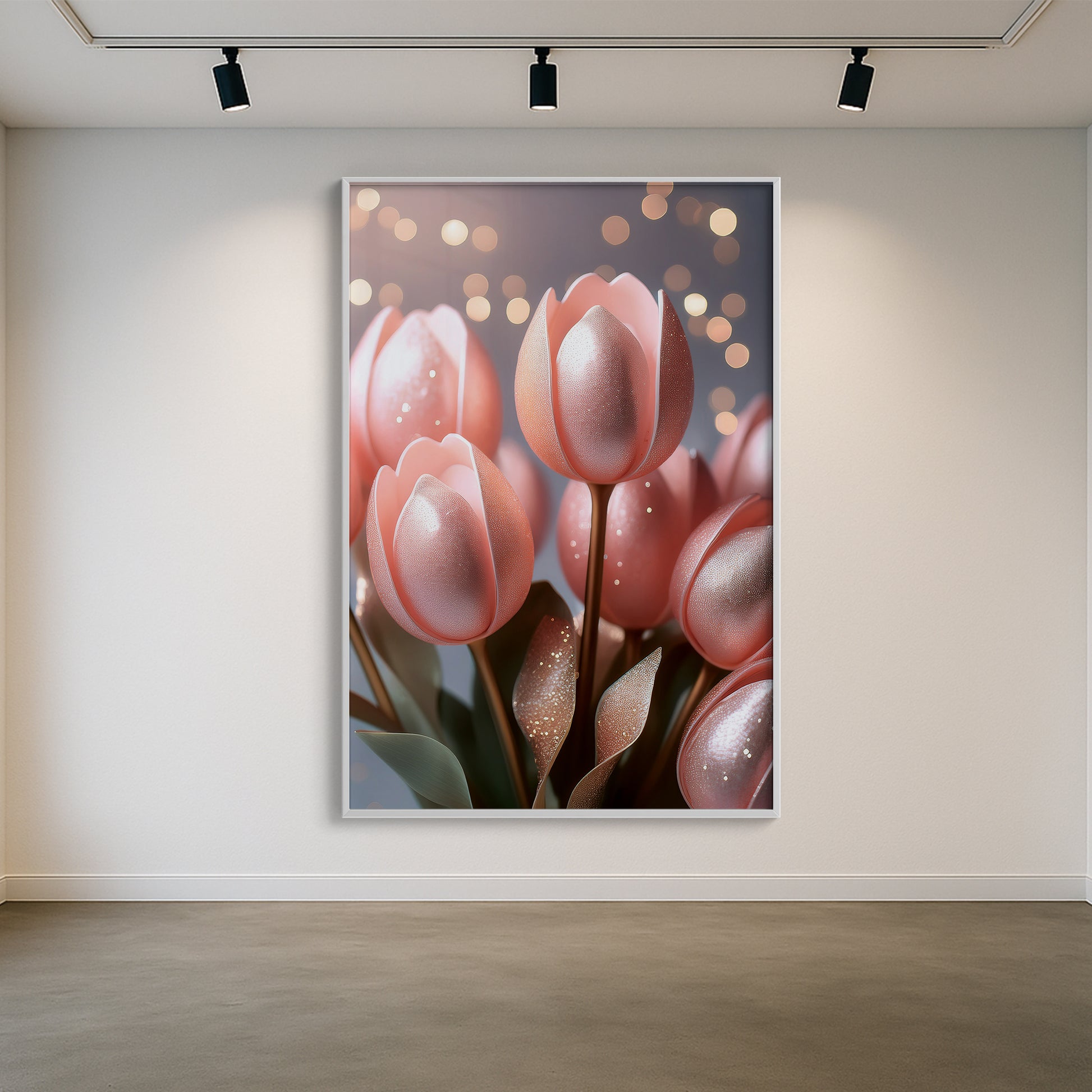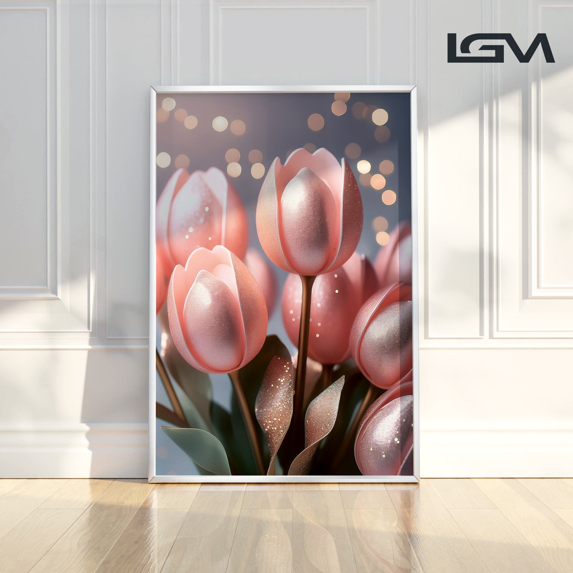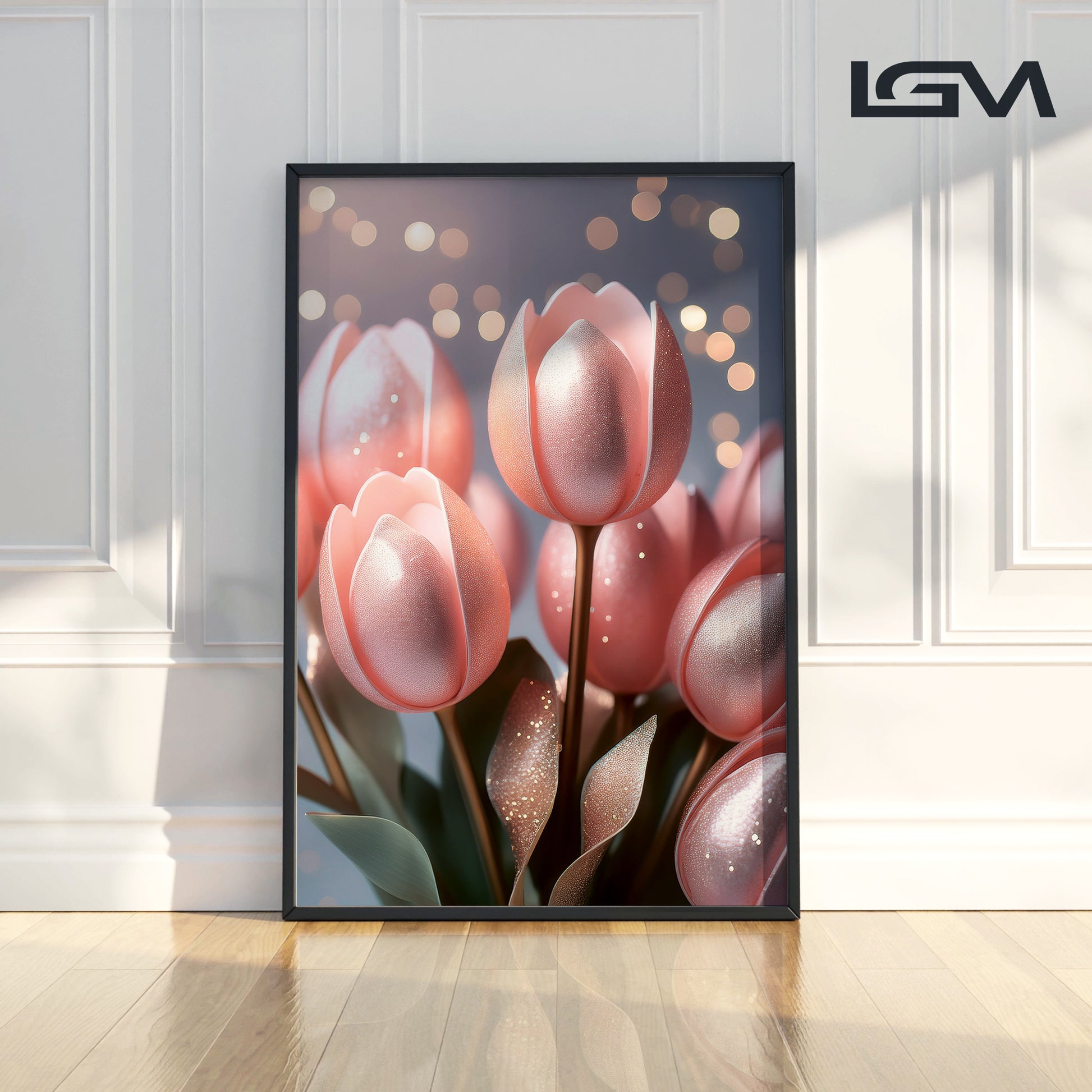 Brighten your space with this Blush Pink Tulip Bouquet Metal Framed Wall Art. Featuring soft, dewy tulips with a subtle shimmer, this artwork brings romance and freshness to any room. The sparkling details and delicate pink tones add a dreamy touch, making it perfect for bedrooms, living rooms, or gift décor. Professionally framed in durable metal, it combines elegance and charm with timeless beauty.