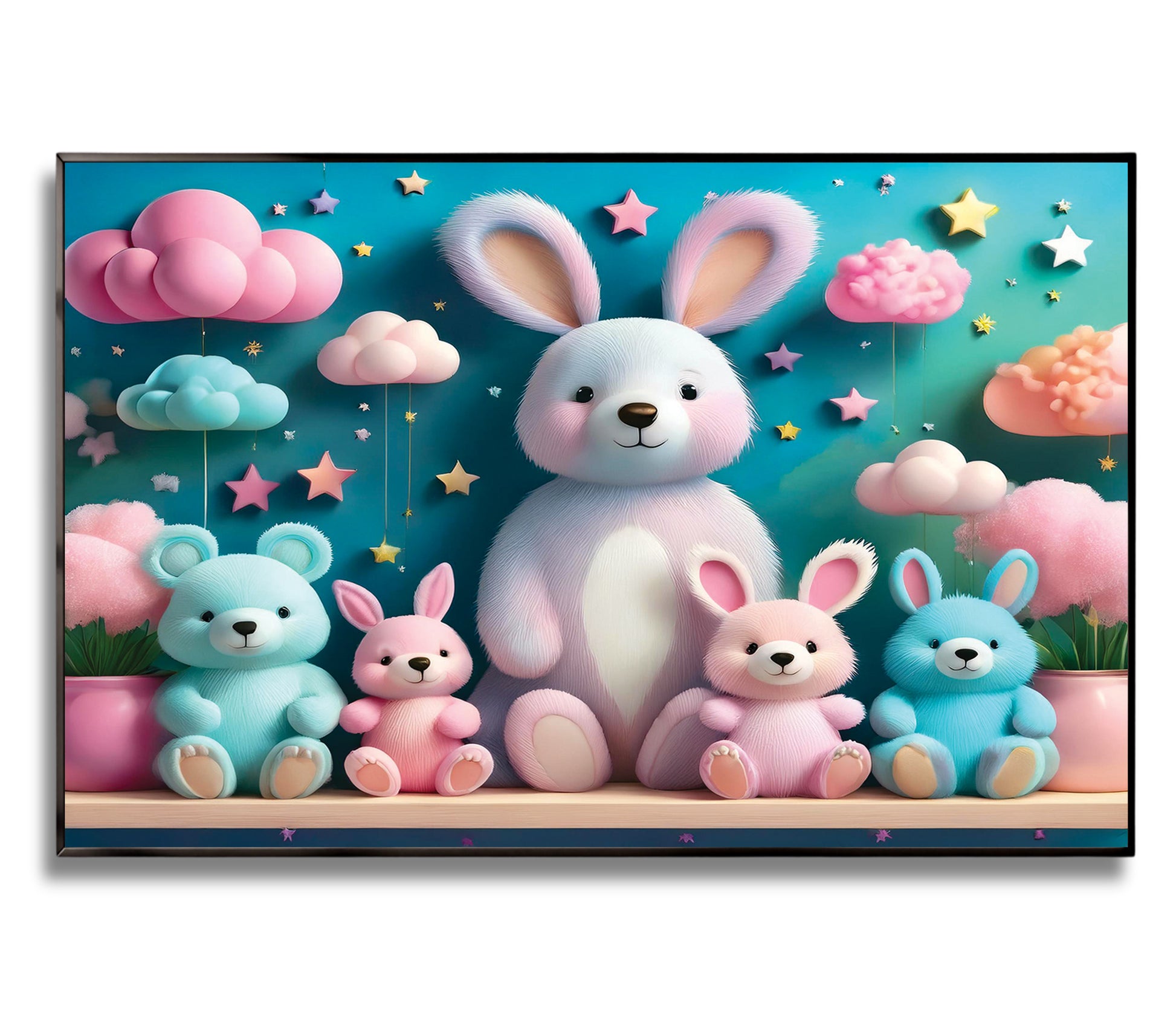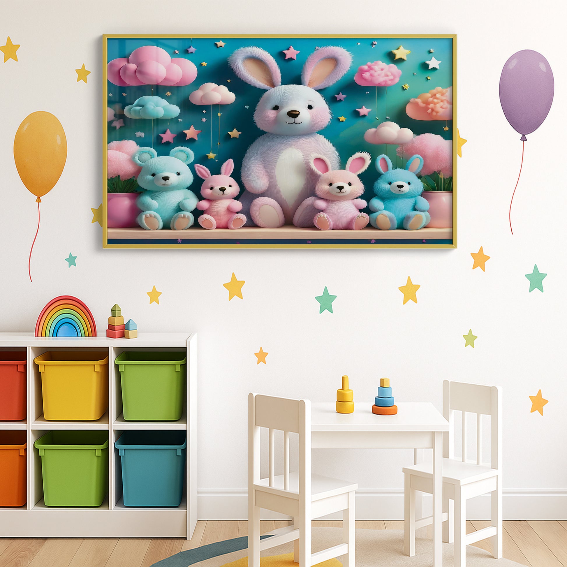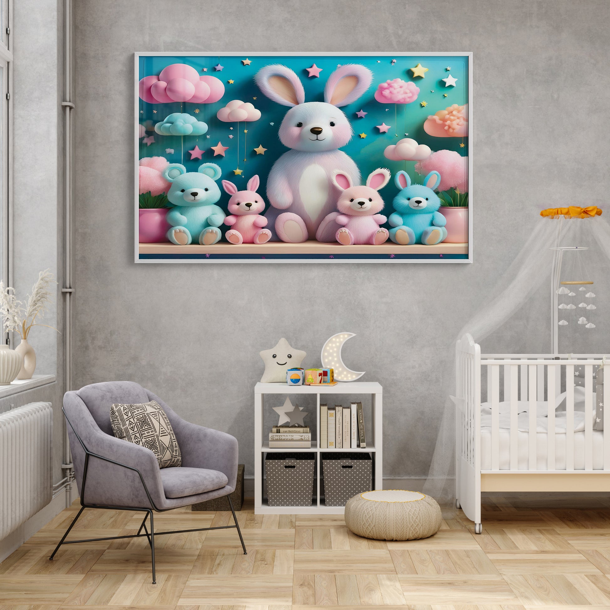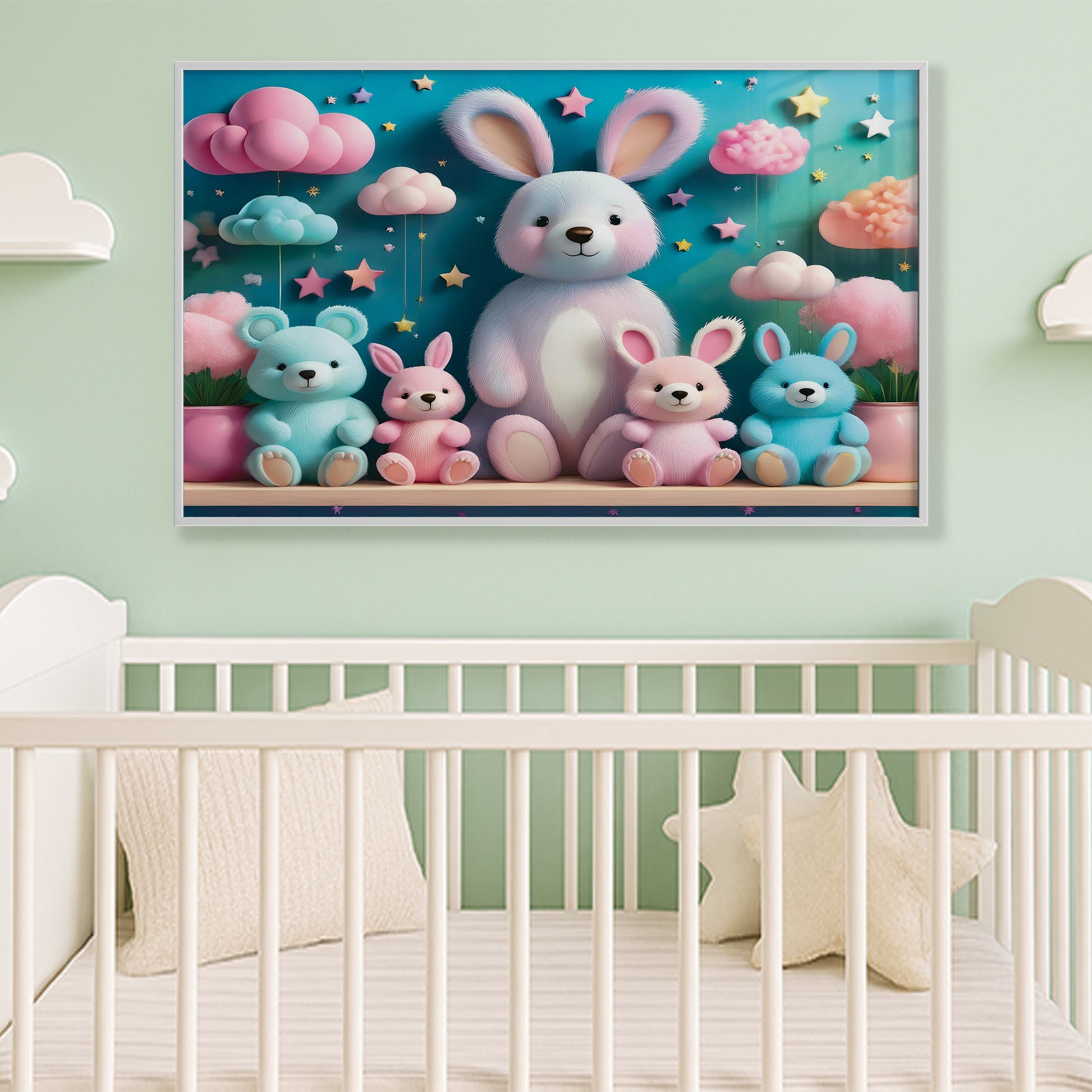 This irresistibly cute 3D-style artwork features a lineup of plushy bunnies and bears under a sky of pastel puffy clouds and floating stars. Perfect for toddlers or newborns, it radiates comfort, playfulness, and modern nursery charm.