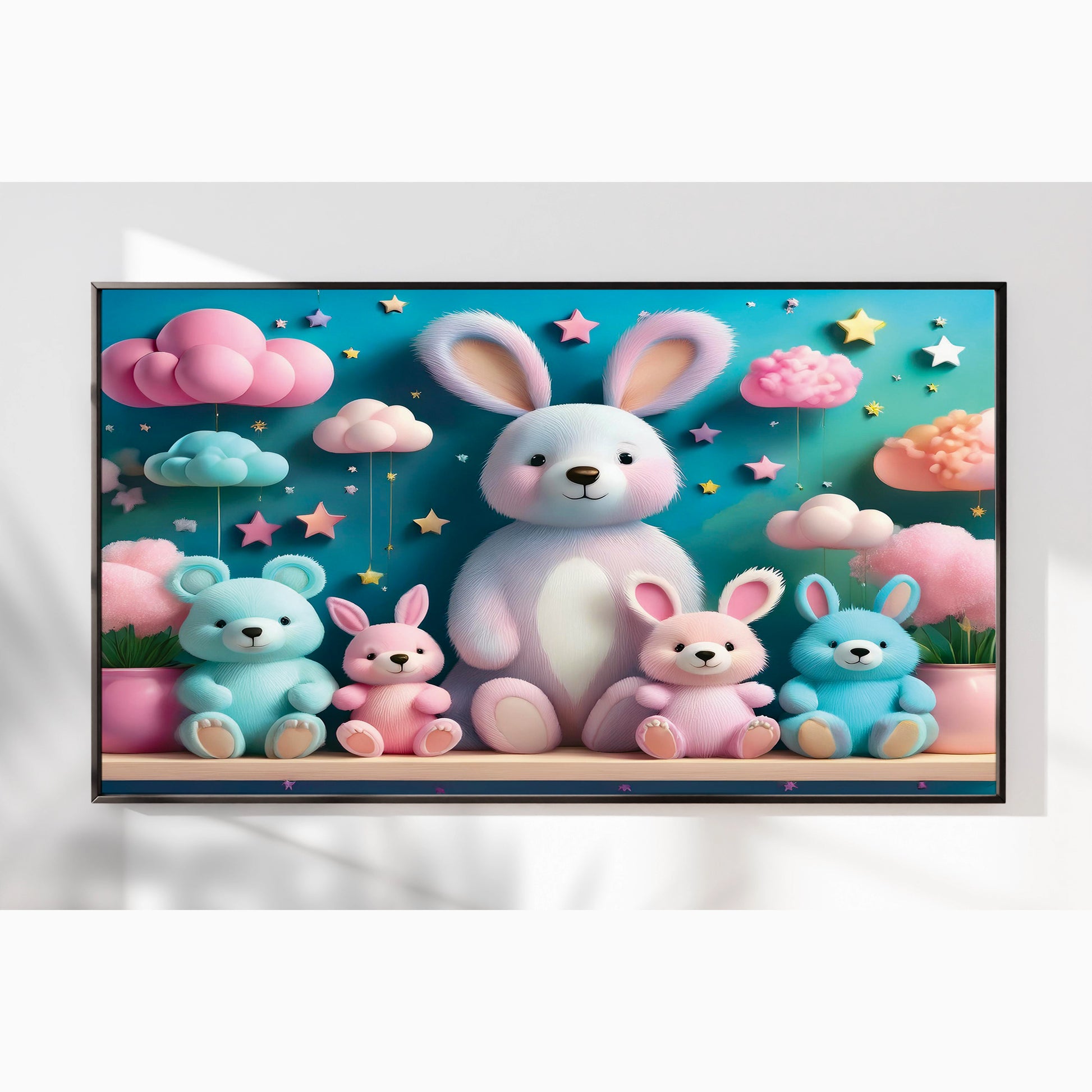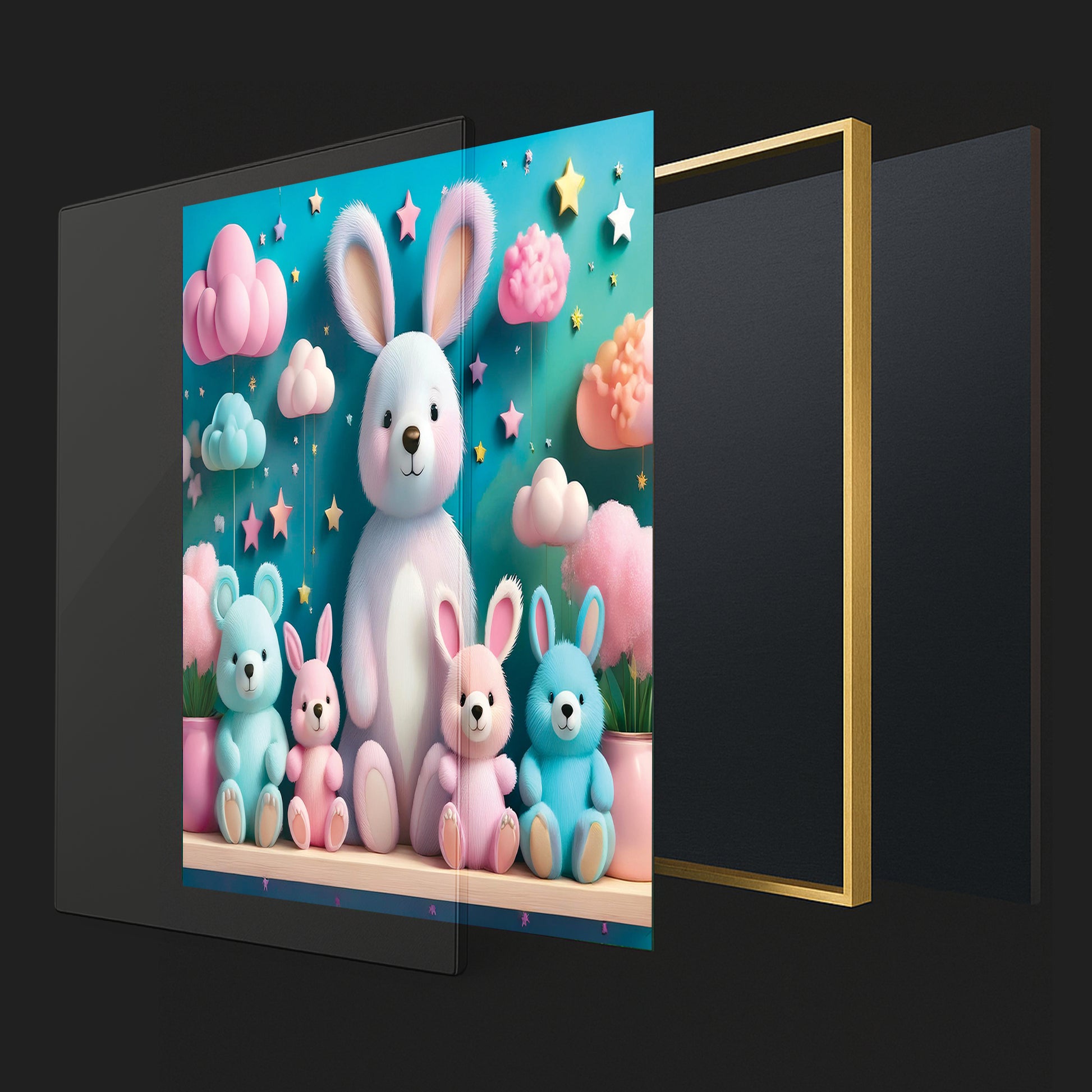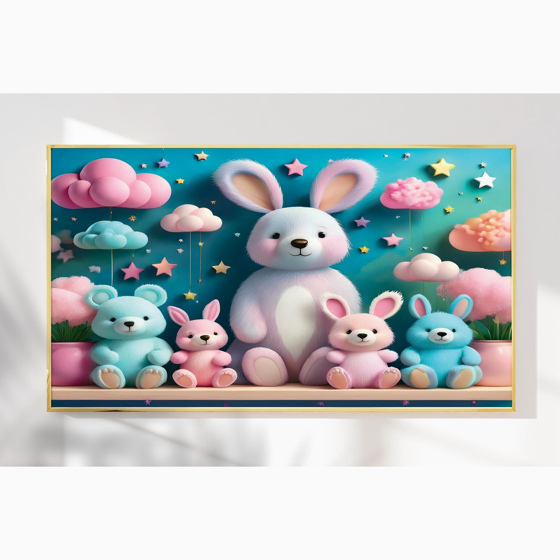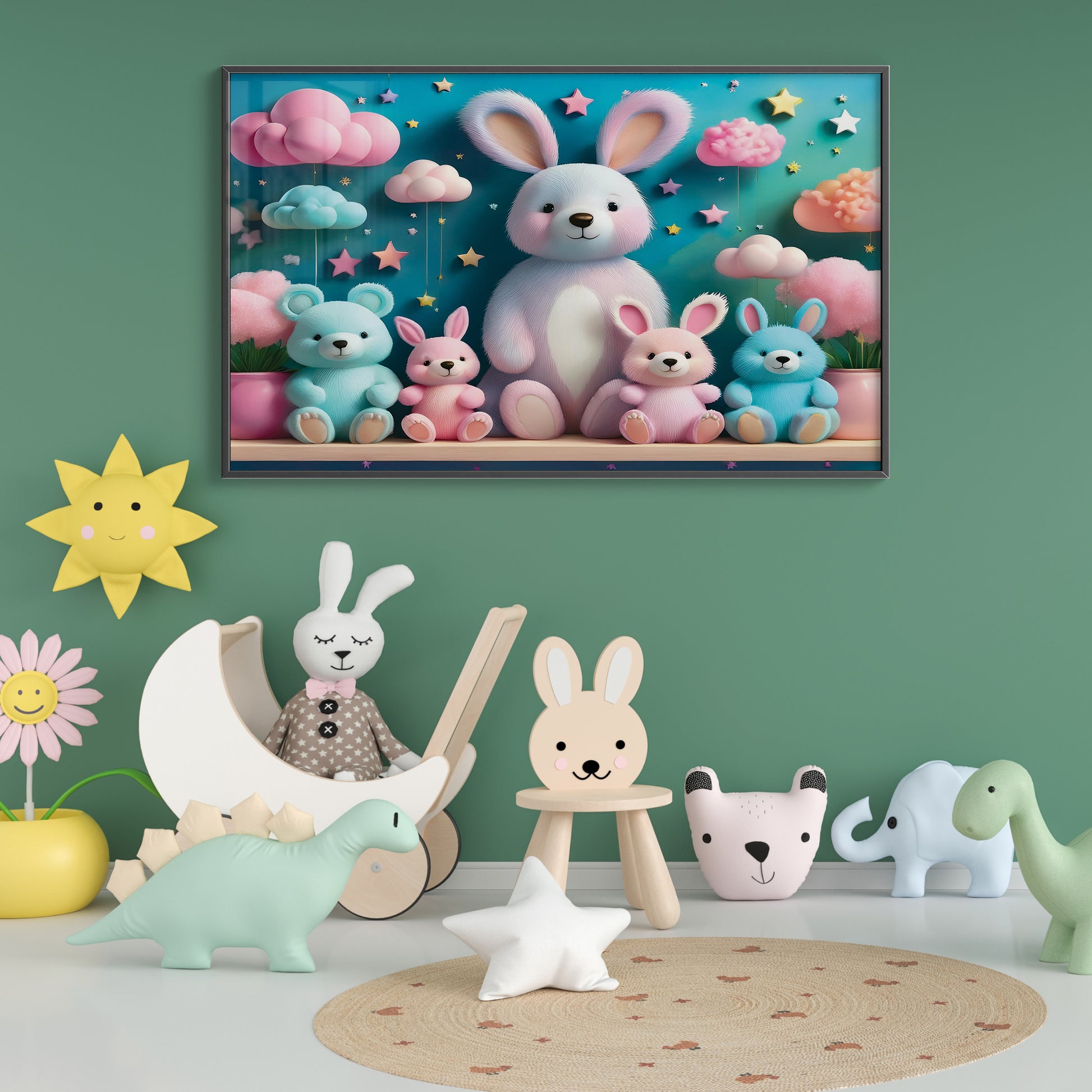 This irresistibly cute 3D-style artwork features a lineup of plushy bunnies and bears under a sky of pastel puffy clouds and floating stars. Perfect for toddlers or newborns, it radiates comfort, playfulness, and modern nursery charm.
