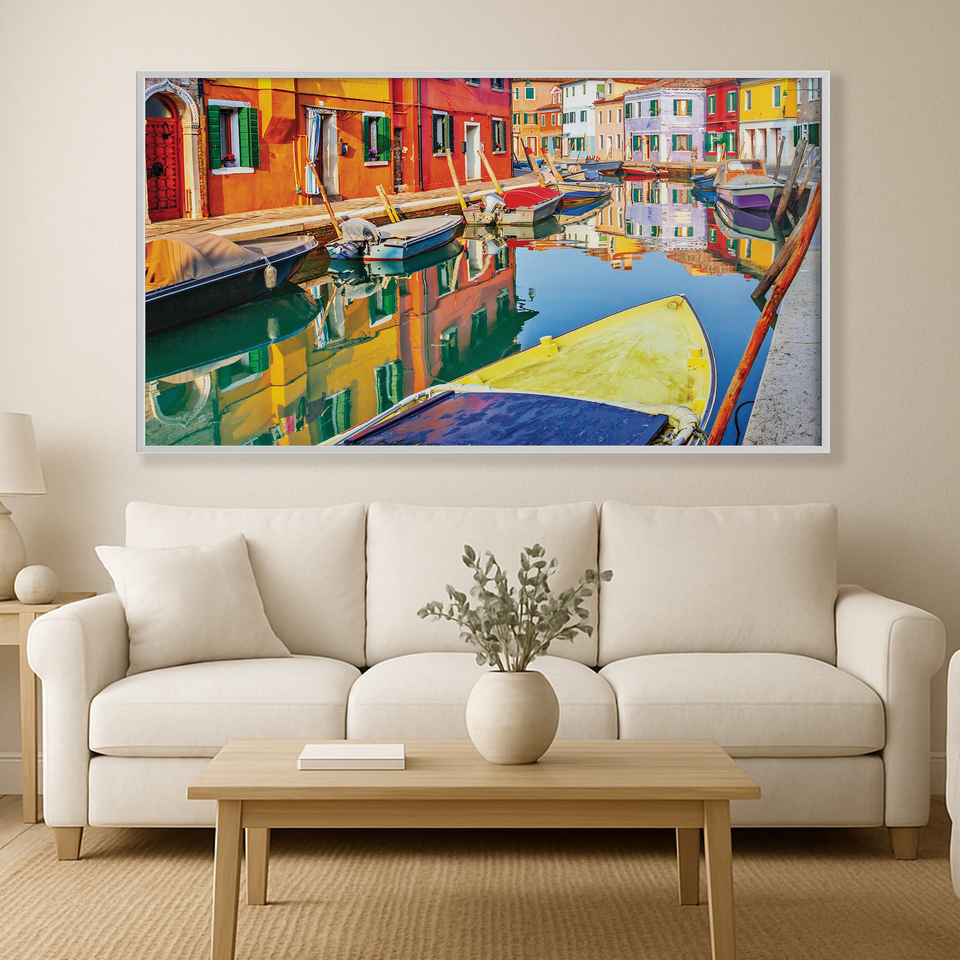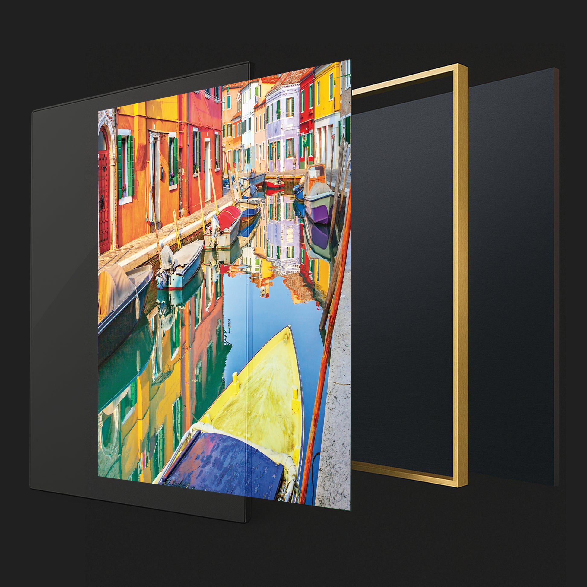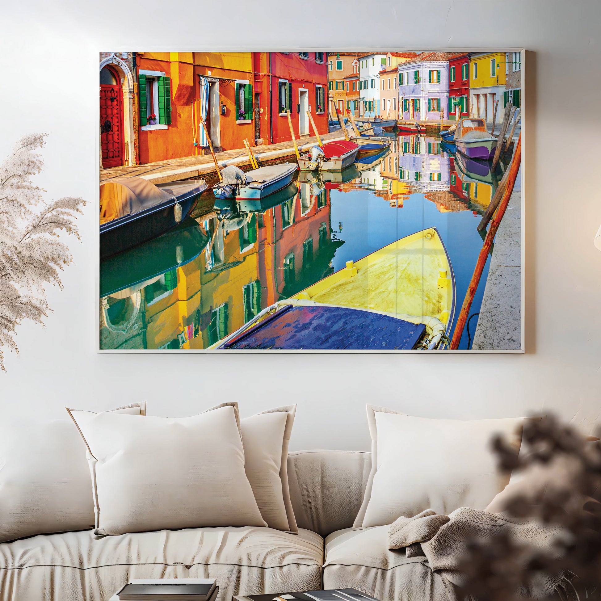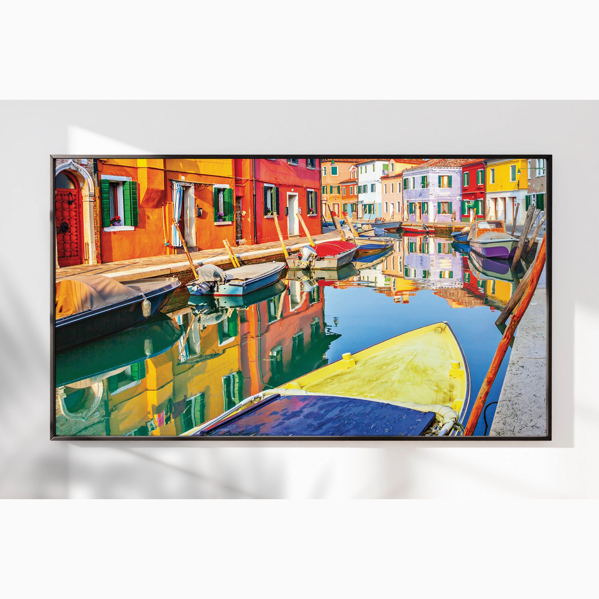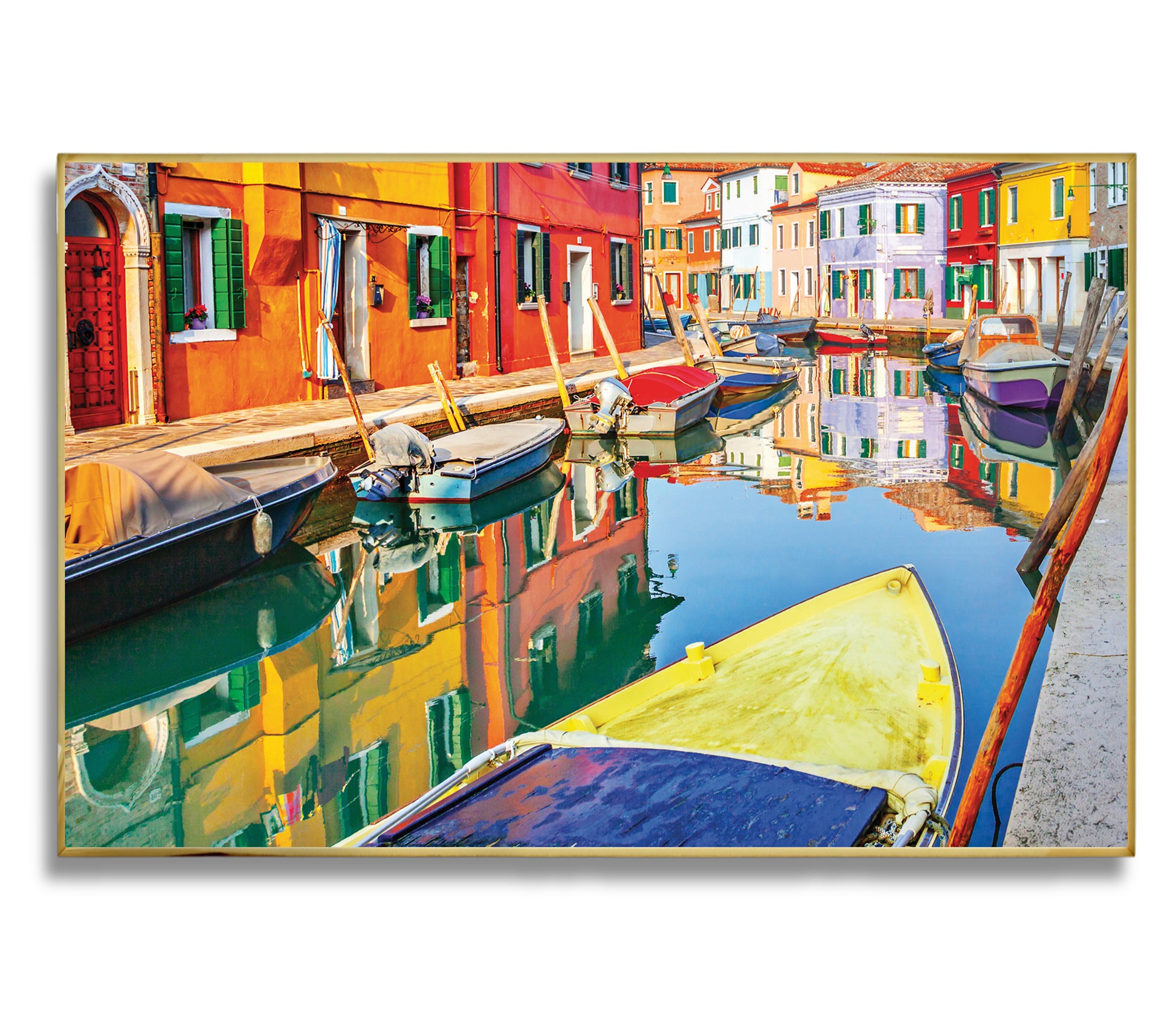 Bursting with life and color, this wall art showcases the painted facades of Burano, Italy, mirrored perfectly in the calm canal. Moored boats add texture and charm to this joyful Venetian neighborhood scene.