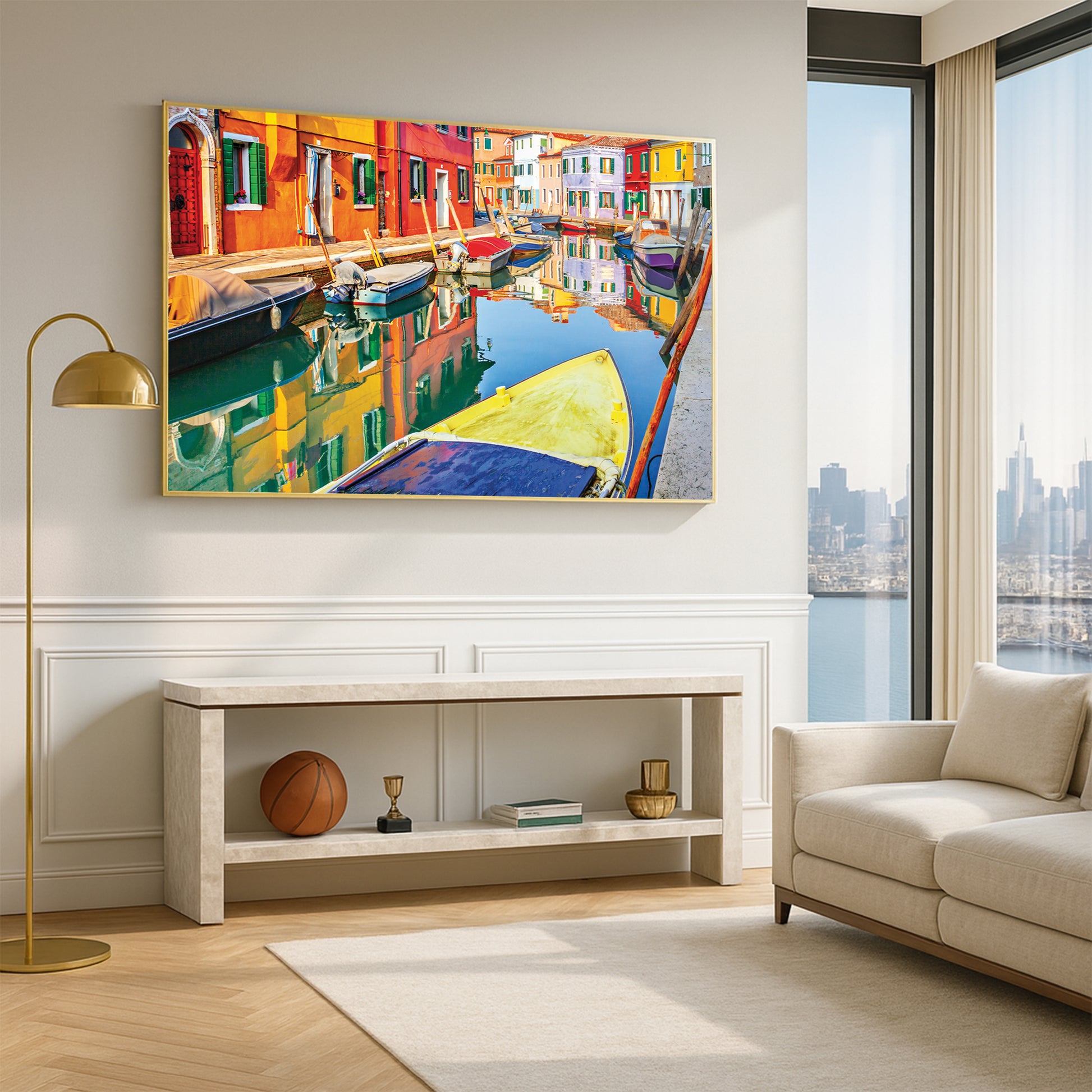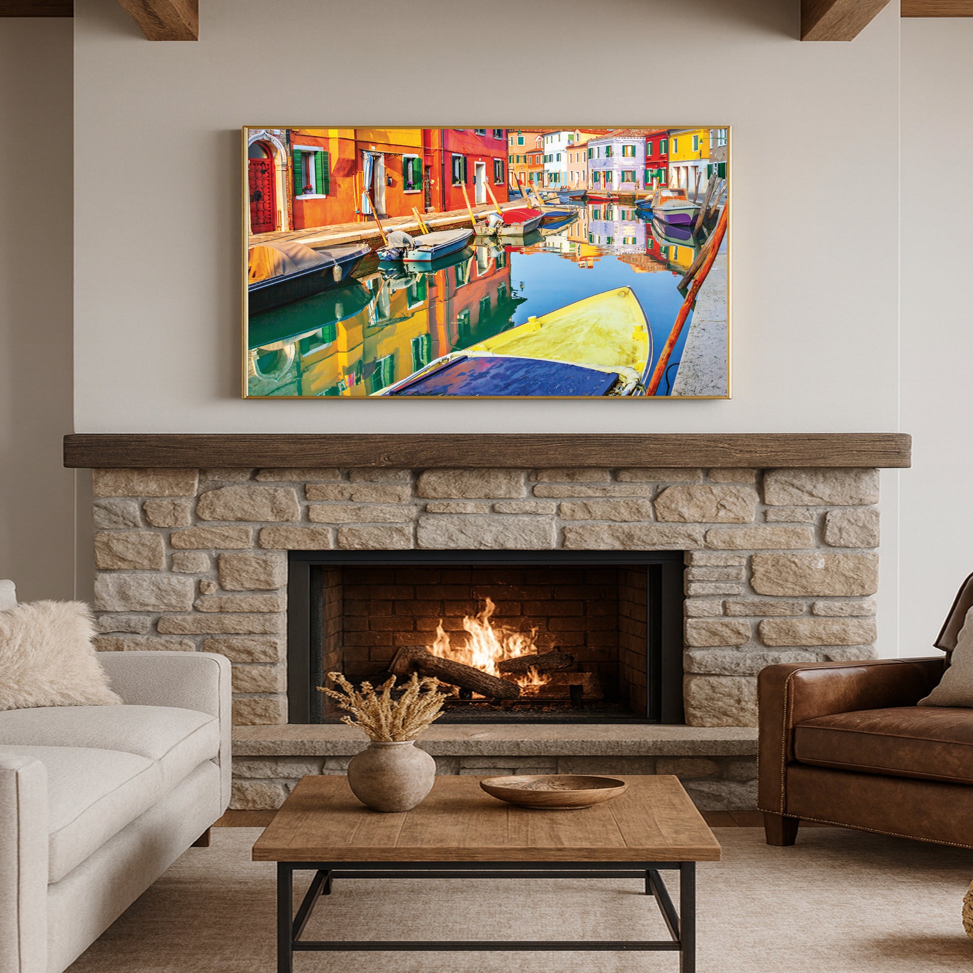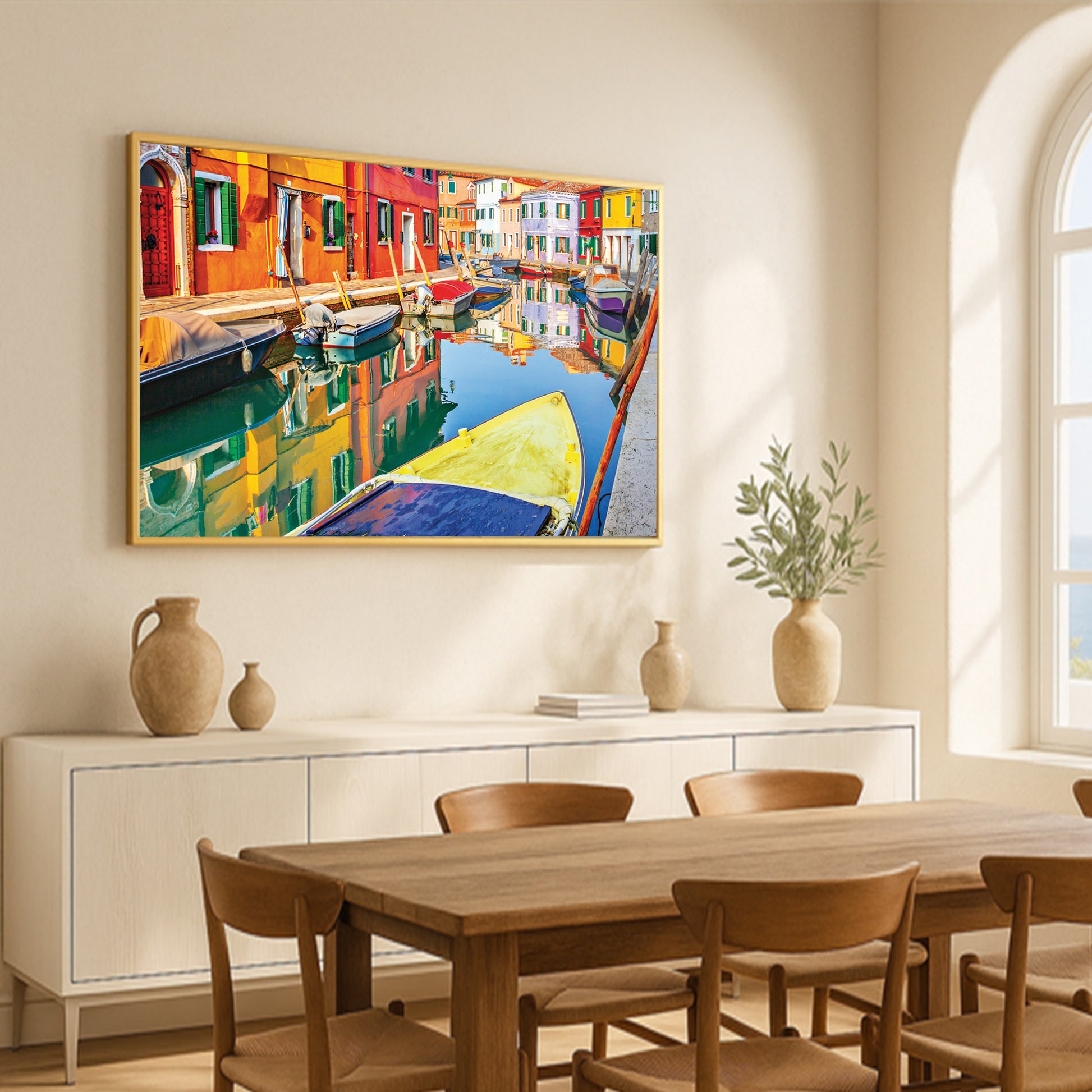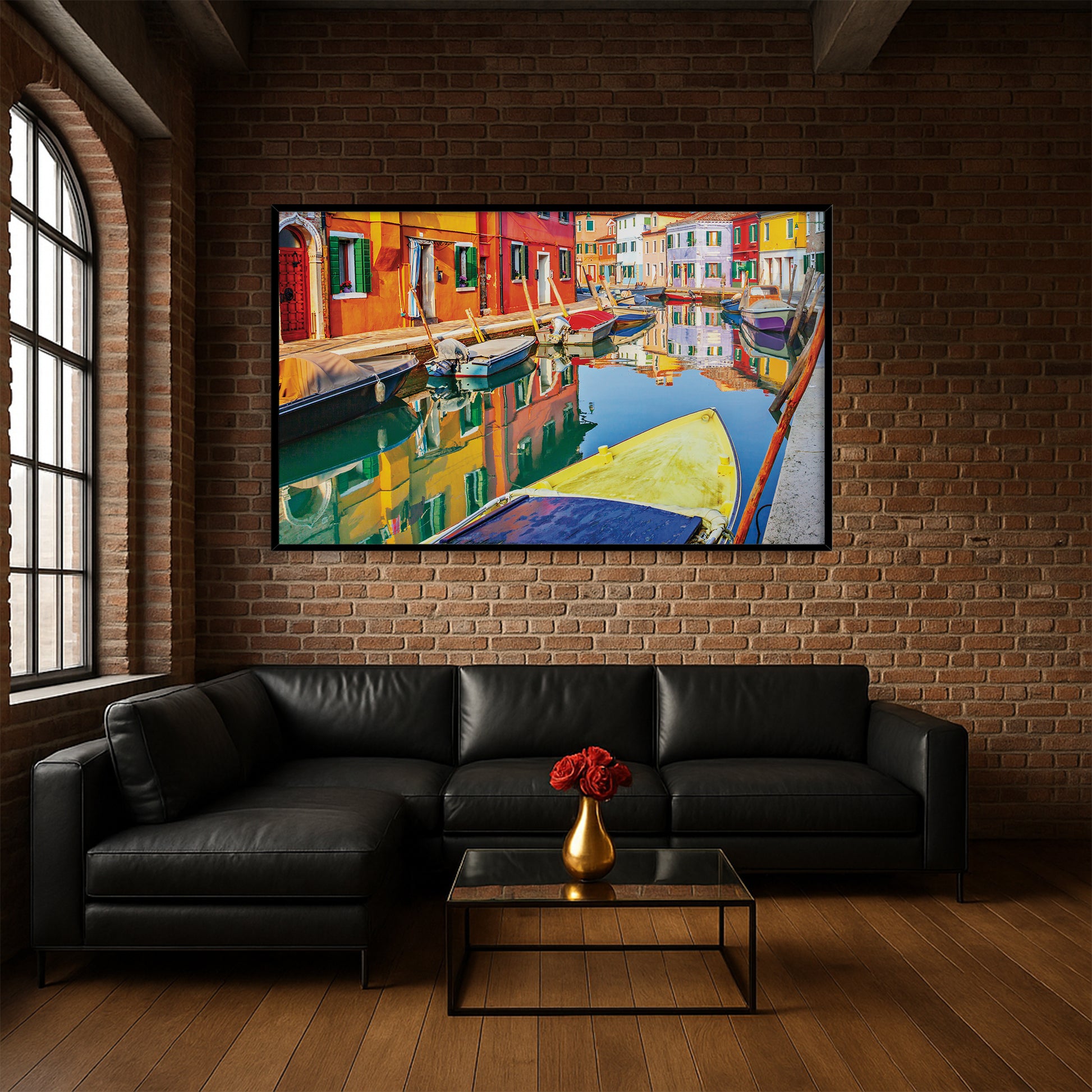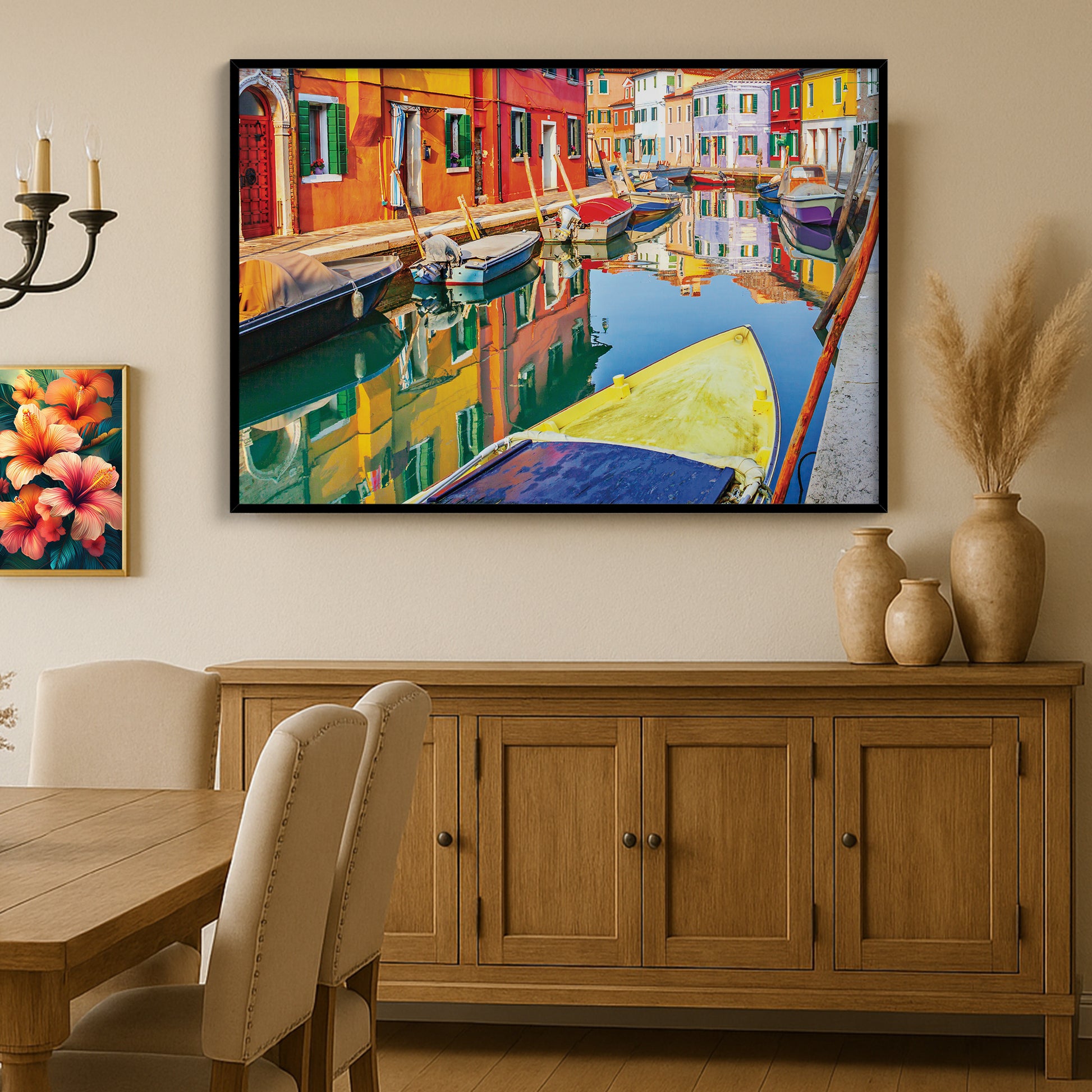 Bursting with life and color, this wall art showcases the painted facades of Burano, Italy, mirrored perfectly in the calm canal. Moored boats add texture and charm to this joyful Venetian neighborhood scene.