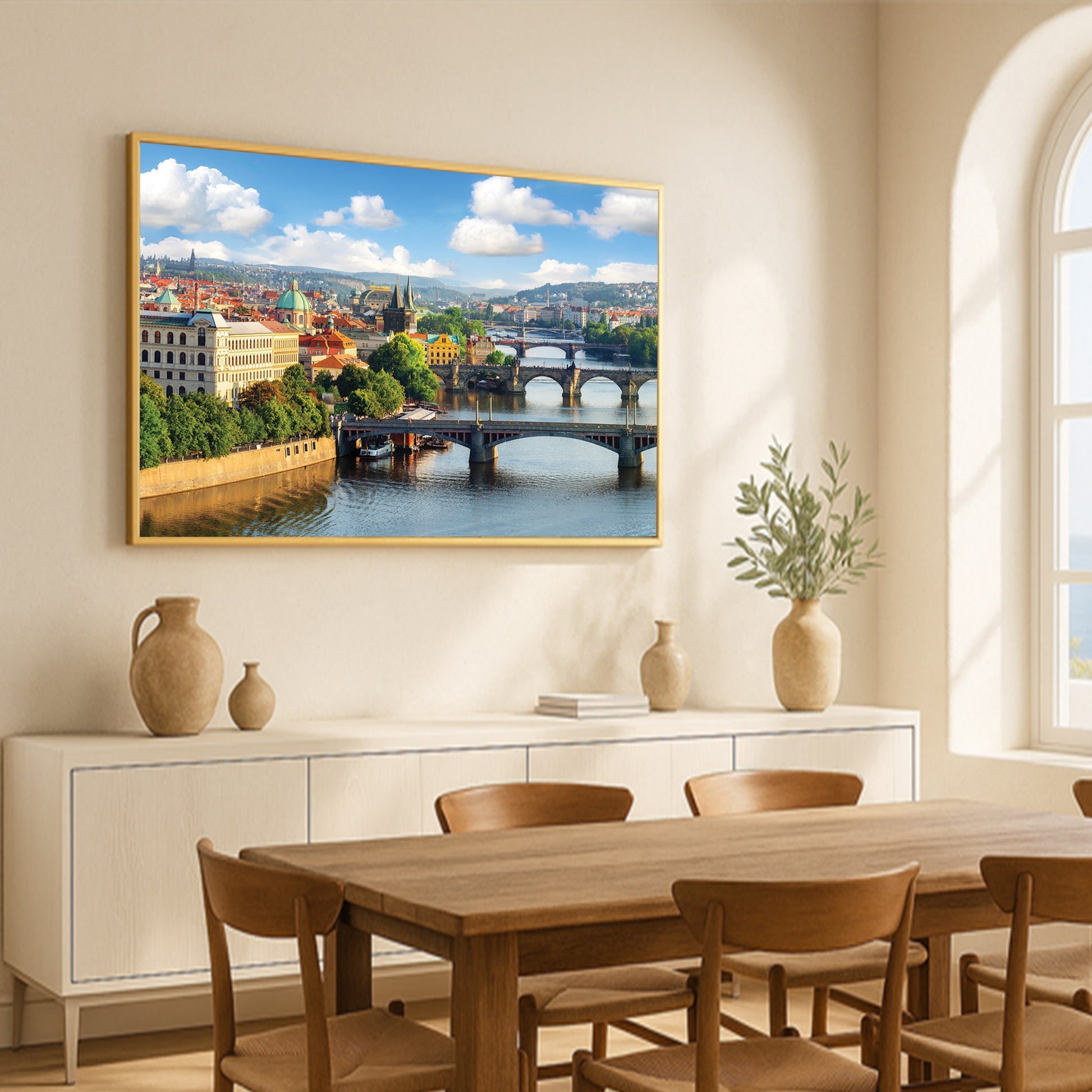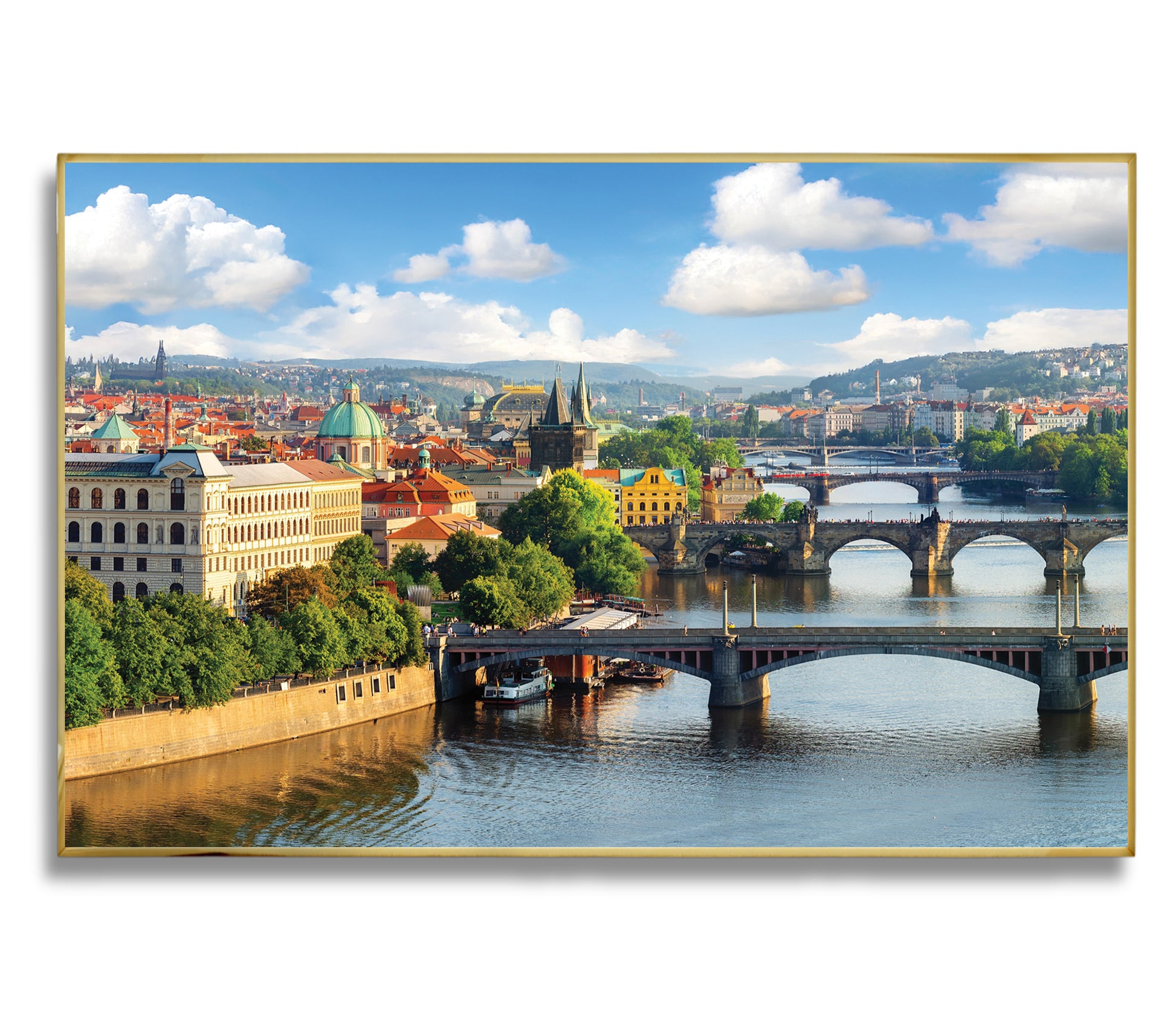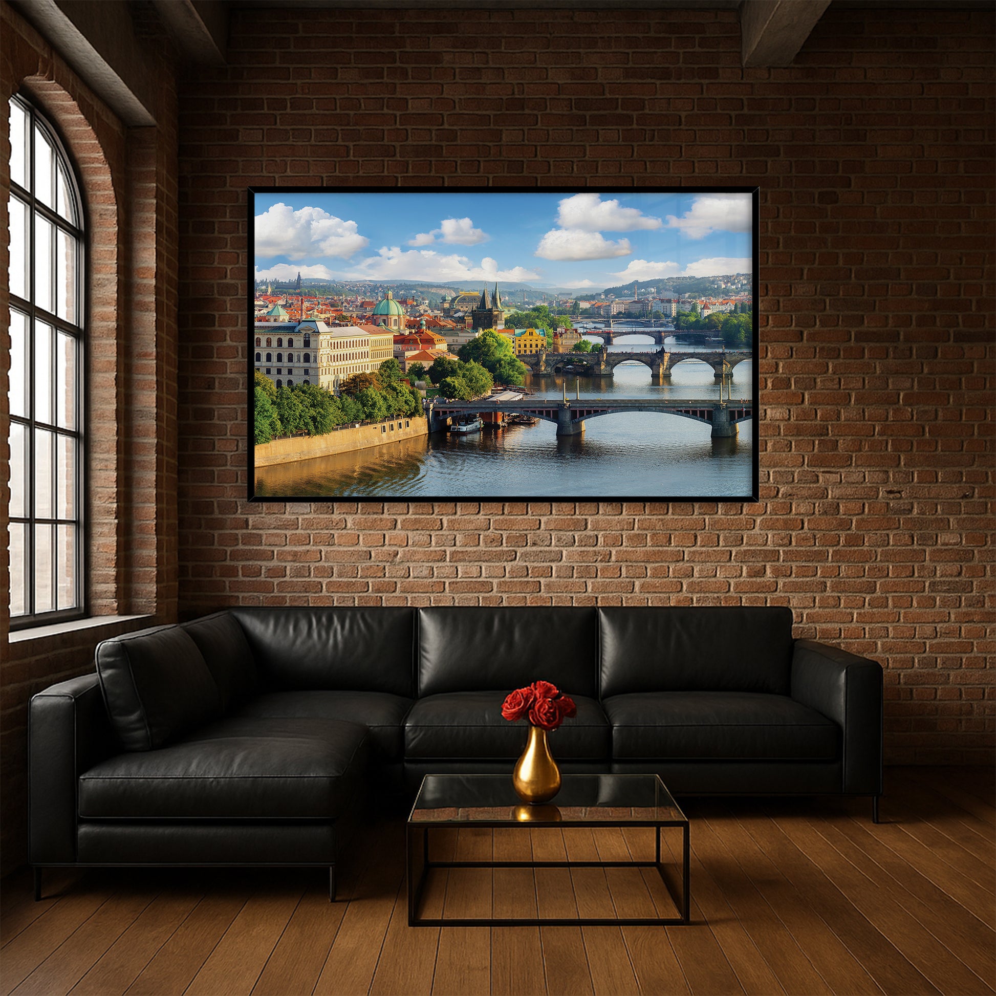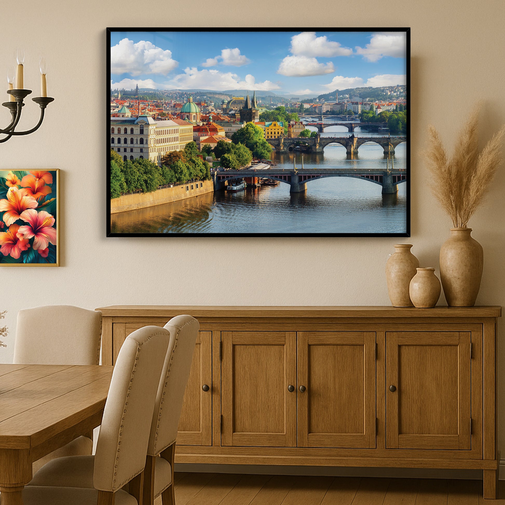 This architectural panorama captures the charm of Prague’s historic bridges arching over the calm Vltava River. The scene layers old-world elegance with modern vibrance, showcasing Gothic towers, red rooftops, and multiple stone bridges bathed in golden sunlight.
