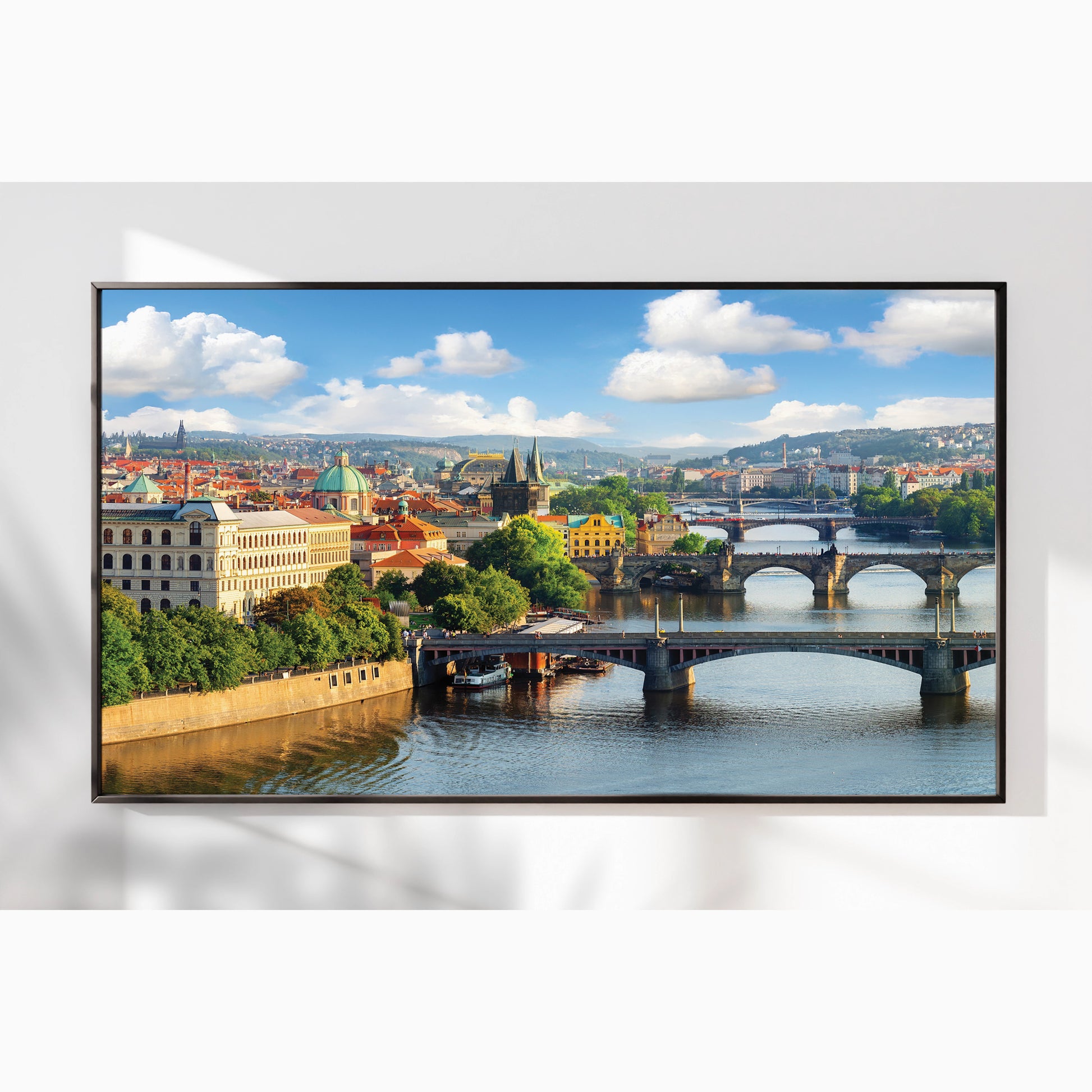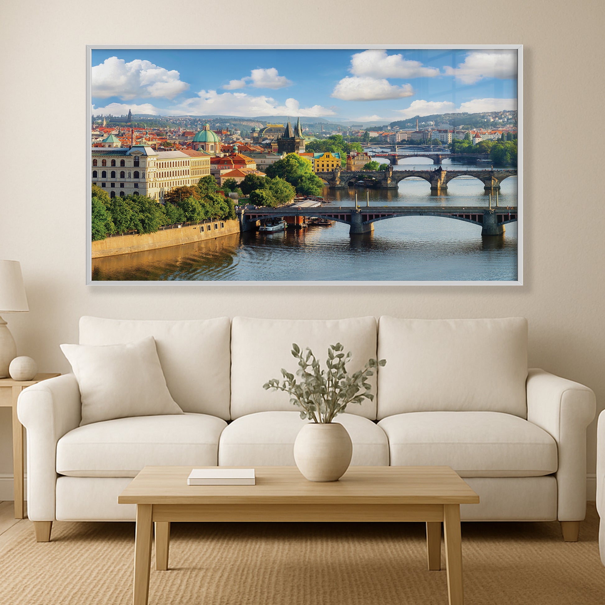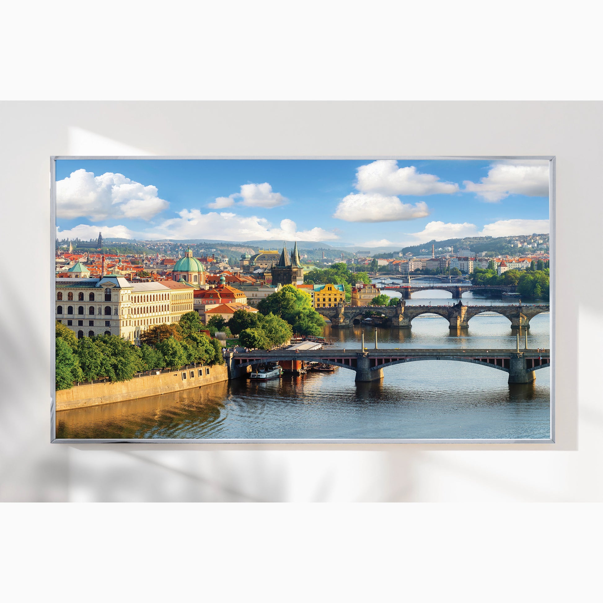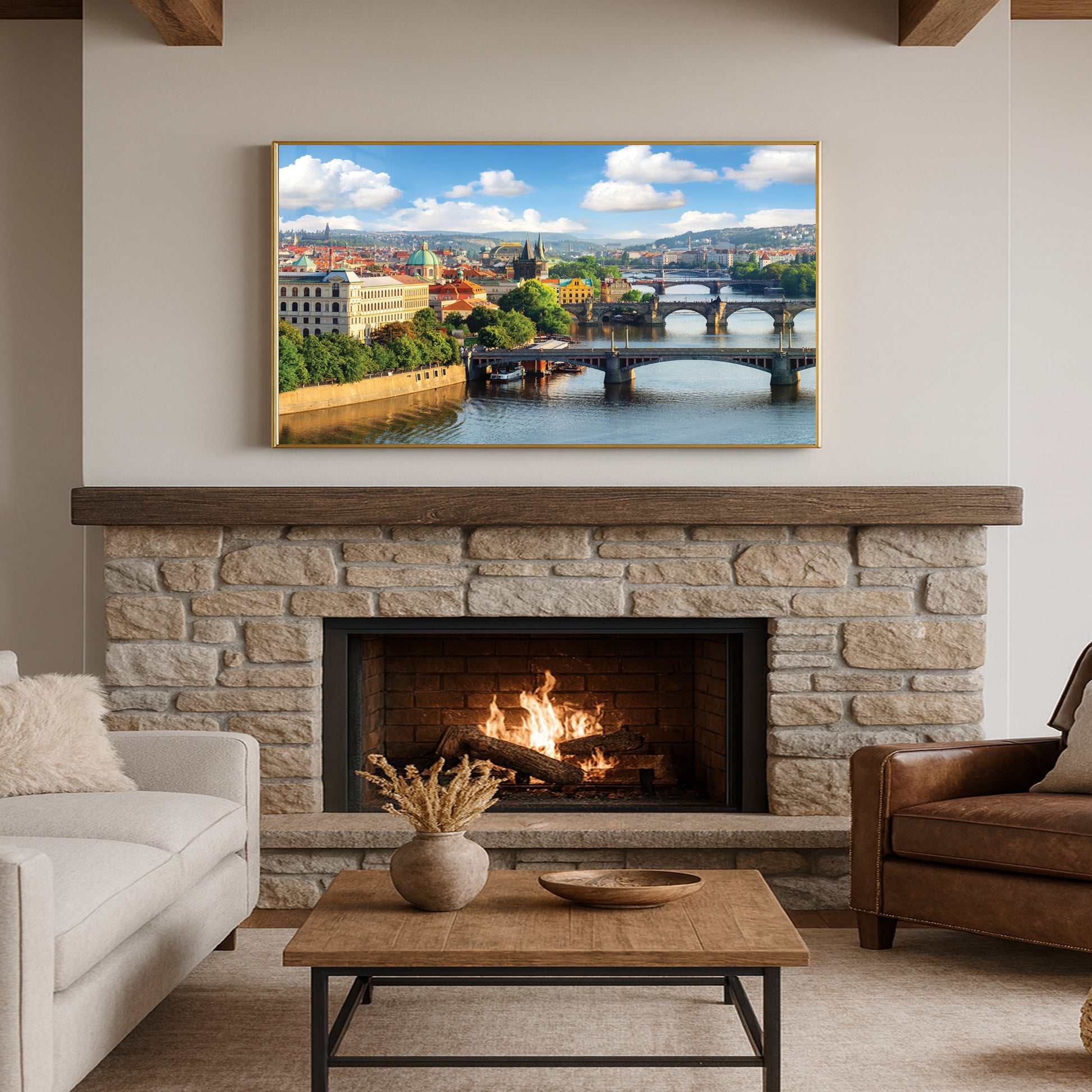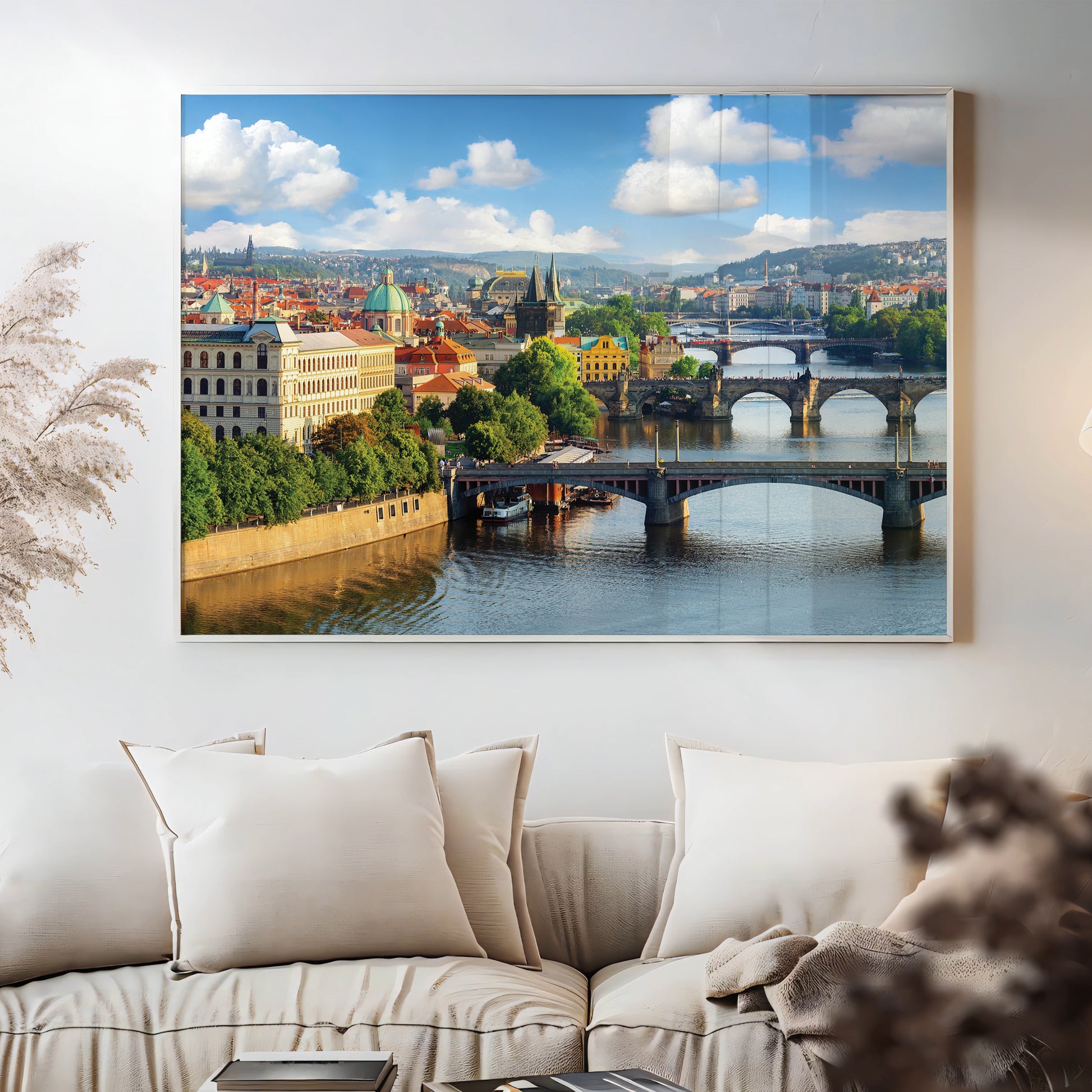 This architectural panorama captures the charm of Prague’s historic bridges arching over the calm Vltava River. The scene layers old-world elegance with modern vibrance, showcasing Gothic towers, red rooftops, and multiple stone bridges bathed in golden sunlight.