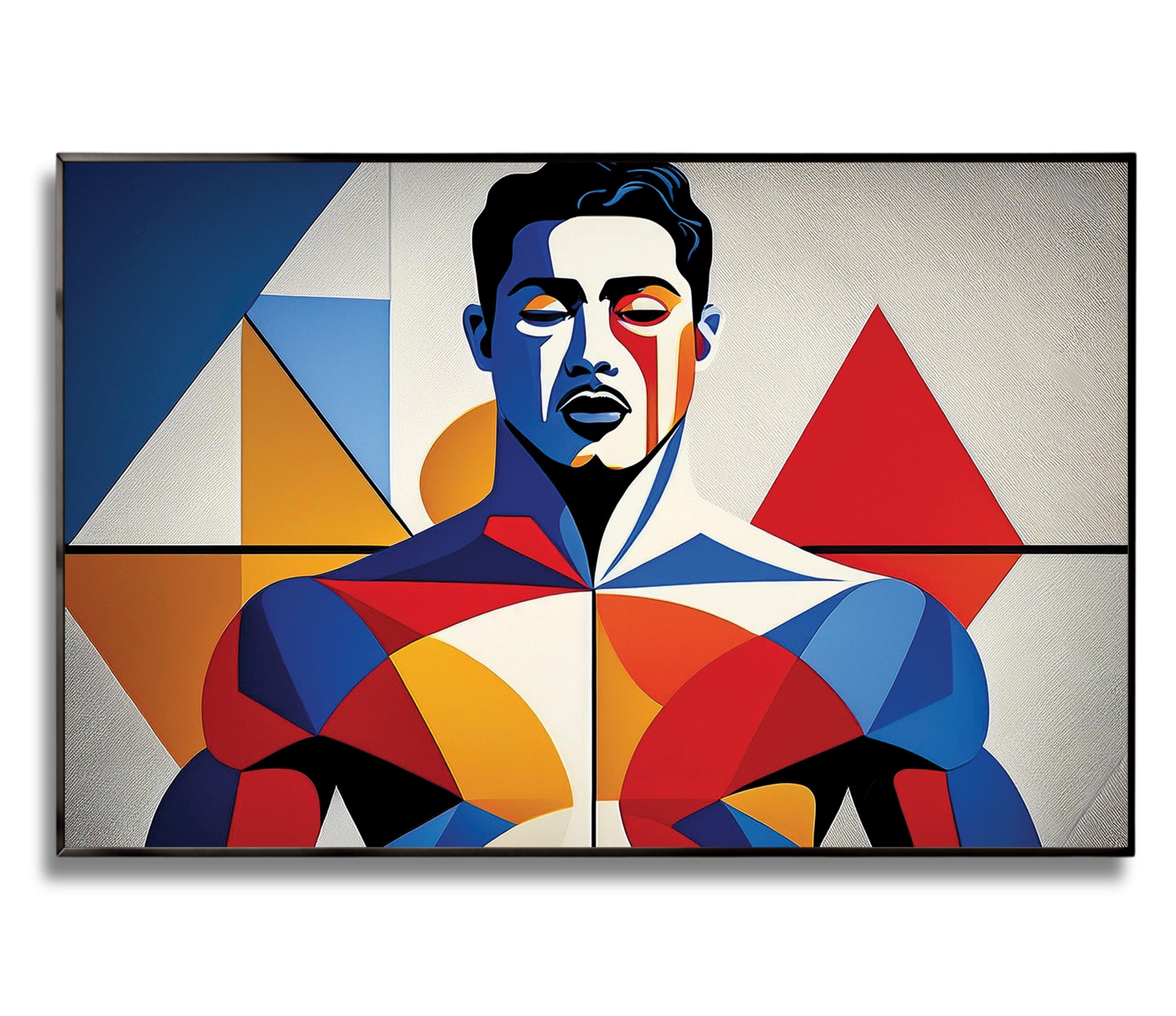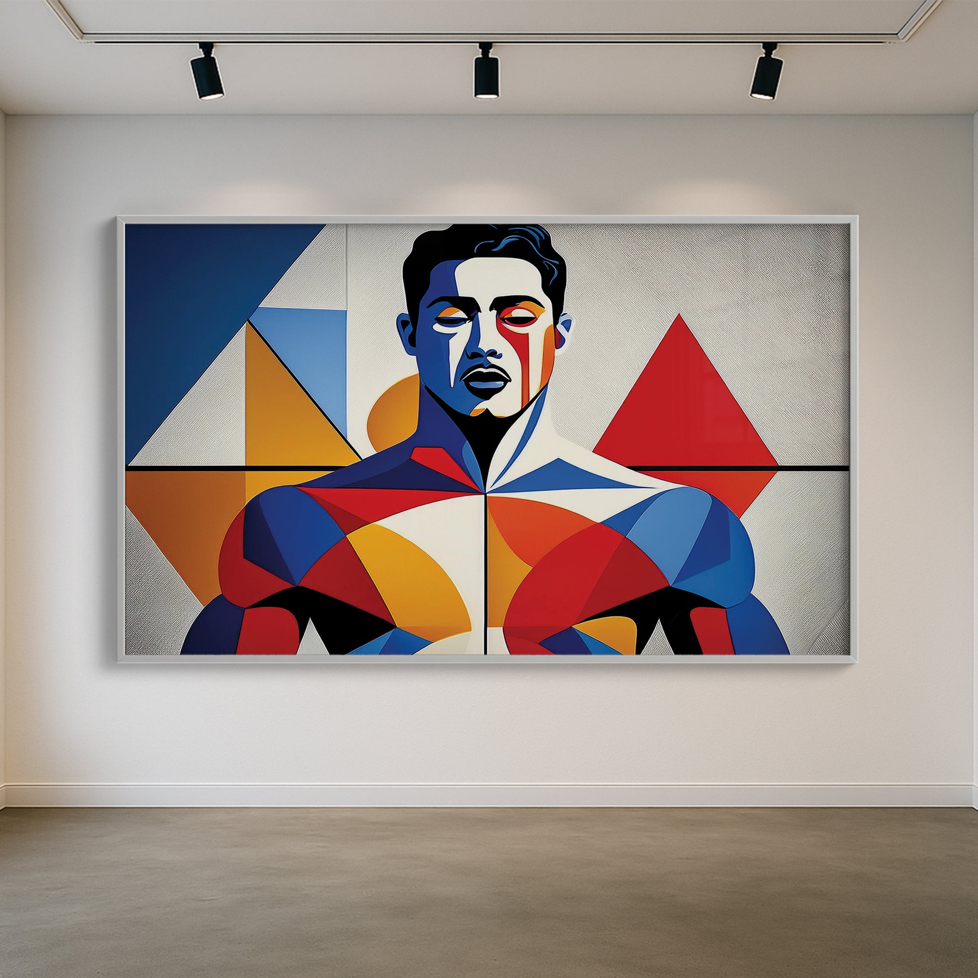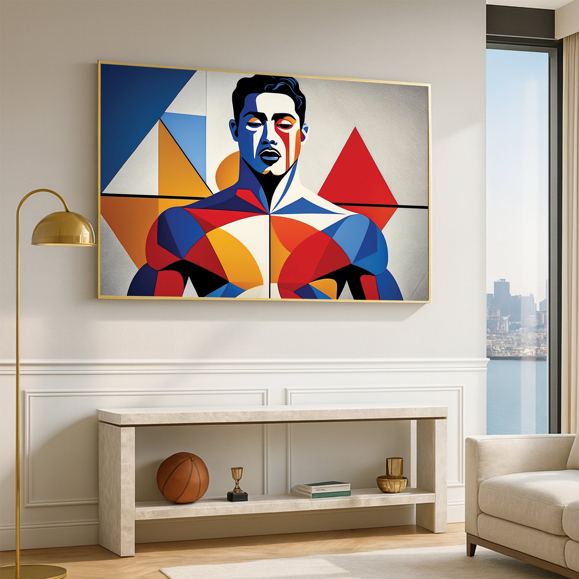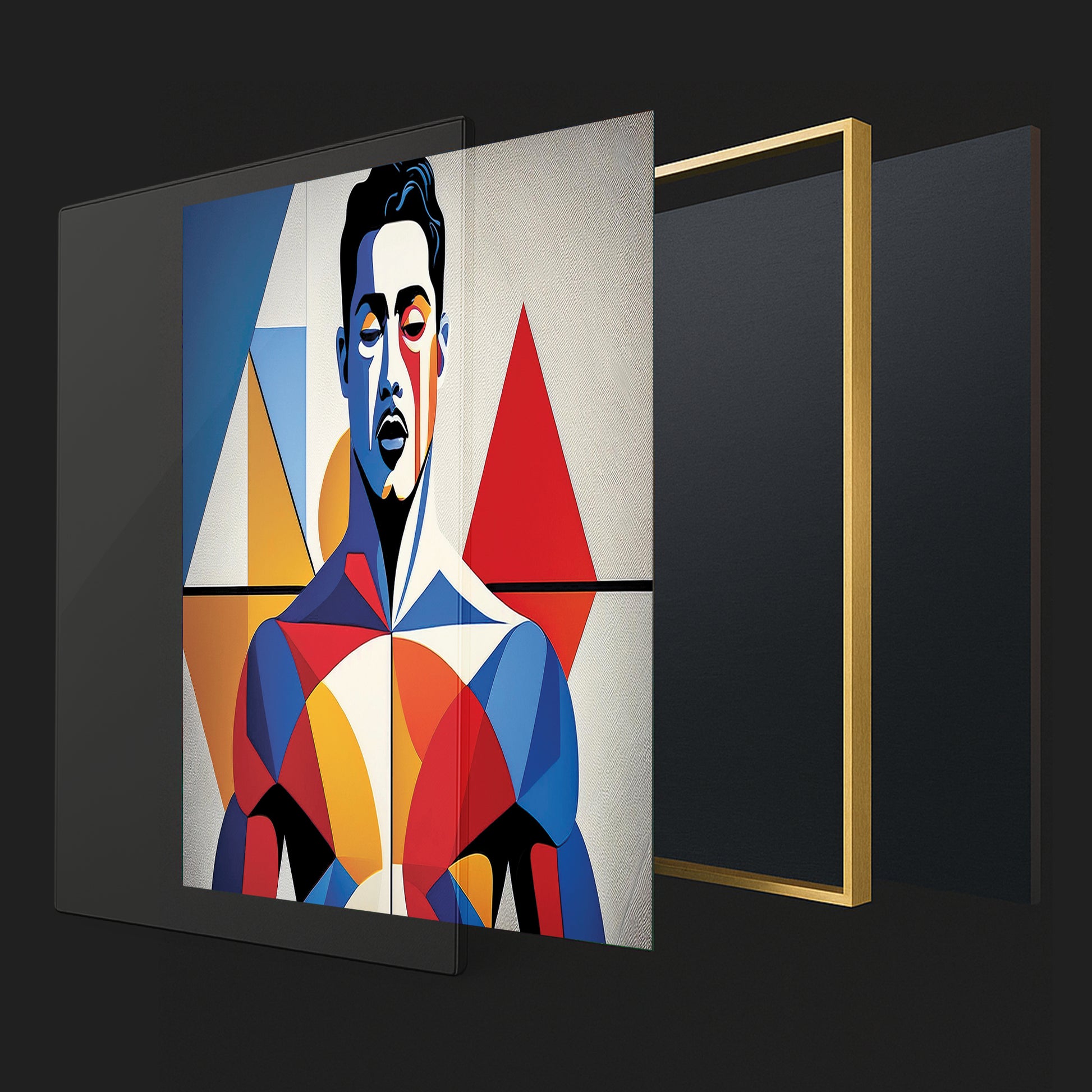🏆 This geometric portrait captures the silent intensity of a focused mind. With bold red, deep blue, and radiant gold blocks, it evokes inner strength, balance, and unshakable calm. A perfect centerpiece for any room that values contemplation and creative energy. Gallery-ready presentation—ideal for modern living rooms, offices, or design studios.