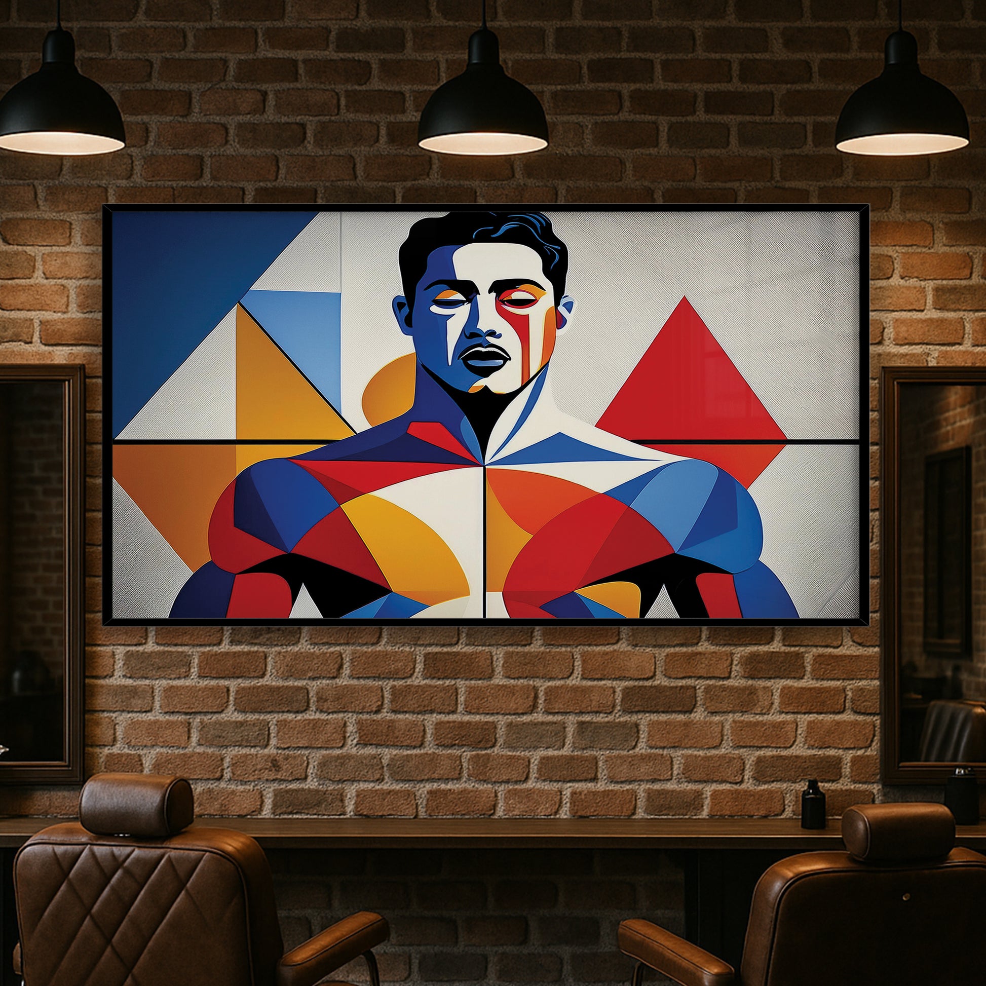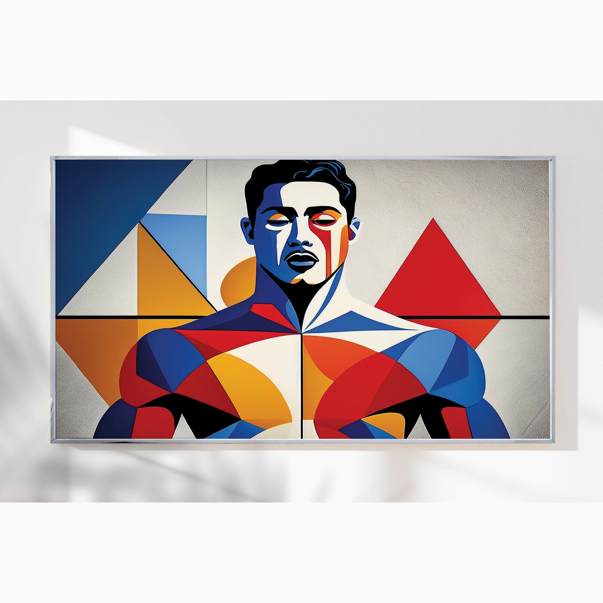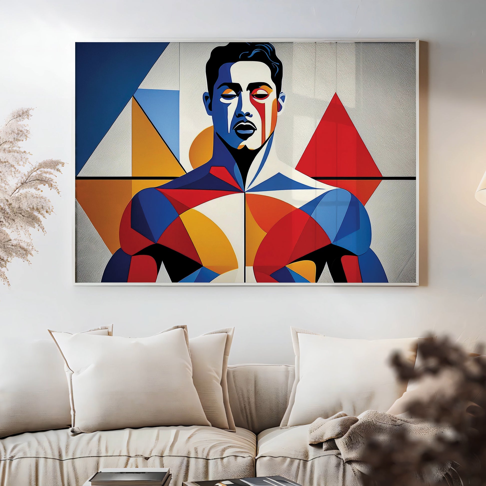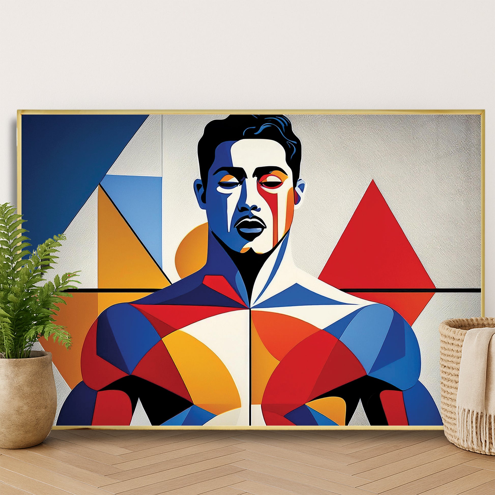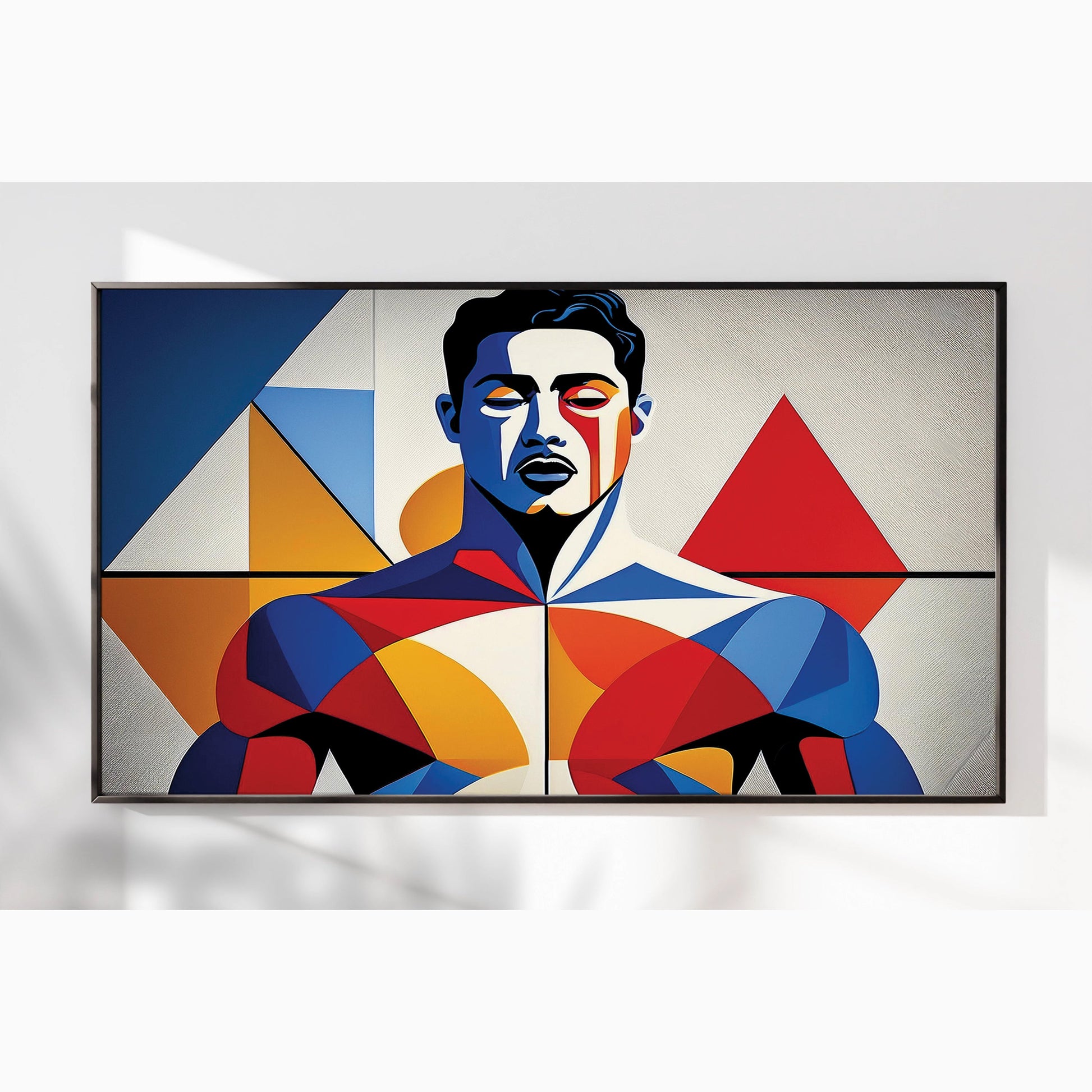 🏆 This geometric portrait captures the silent intensity of a focused mind. With bold red, deep blue, and radiant gold blocks, it evokes inner strength, balance, and unshakable calm. A perfect centerpiece for any room that values contemplation and creative energy. Gallery-ready presentation—ideal for modern living rooms, offices, or design studios.