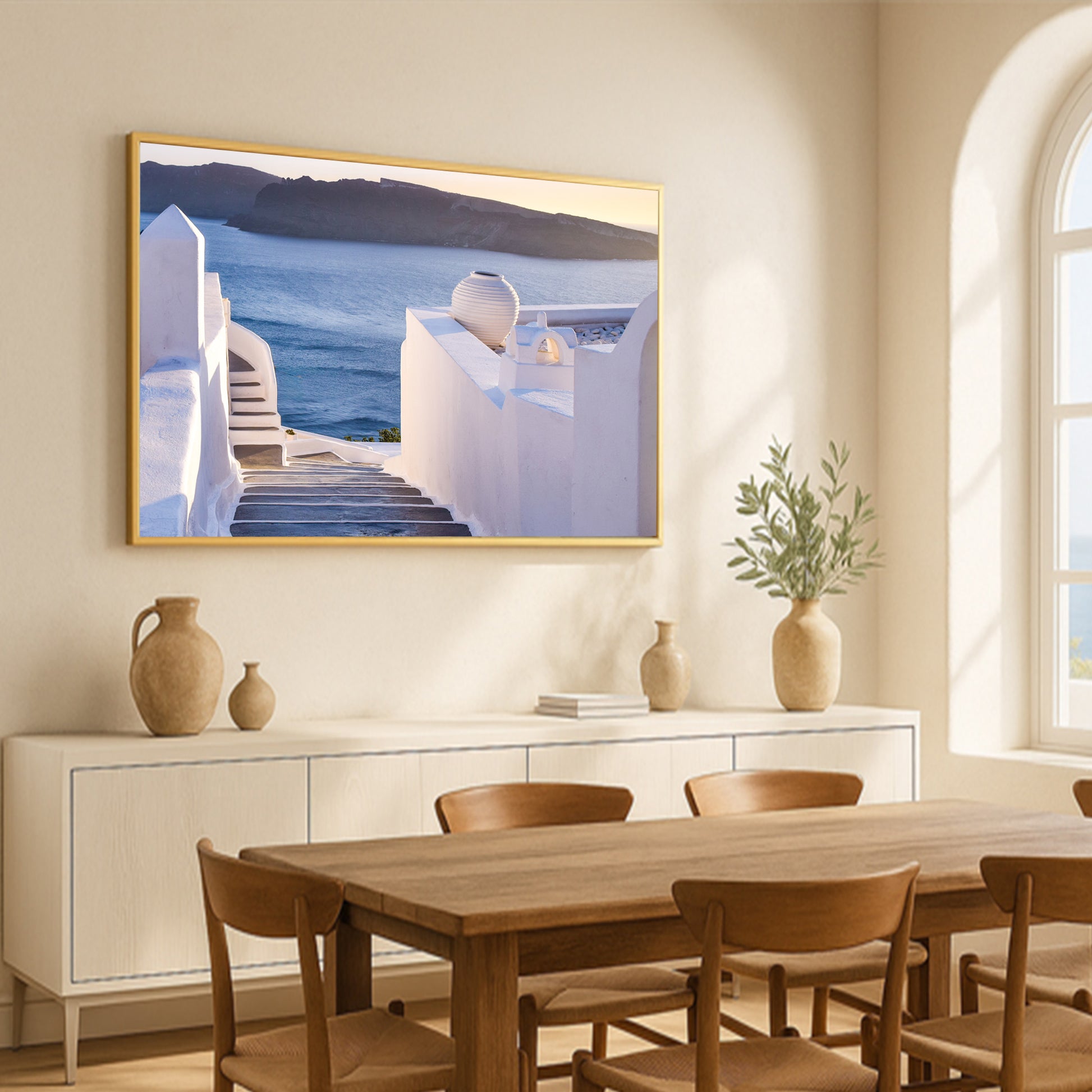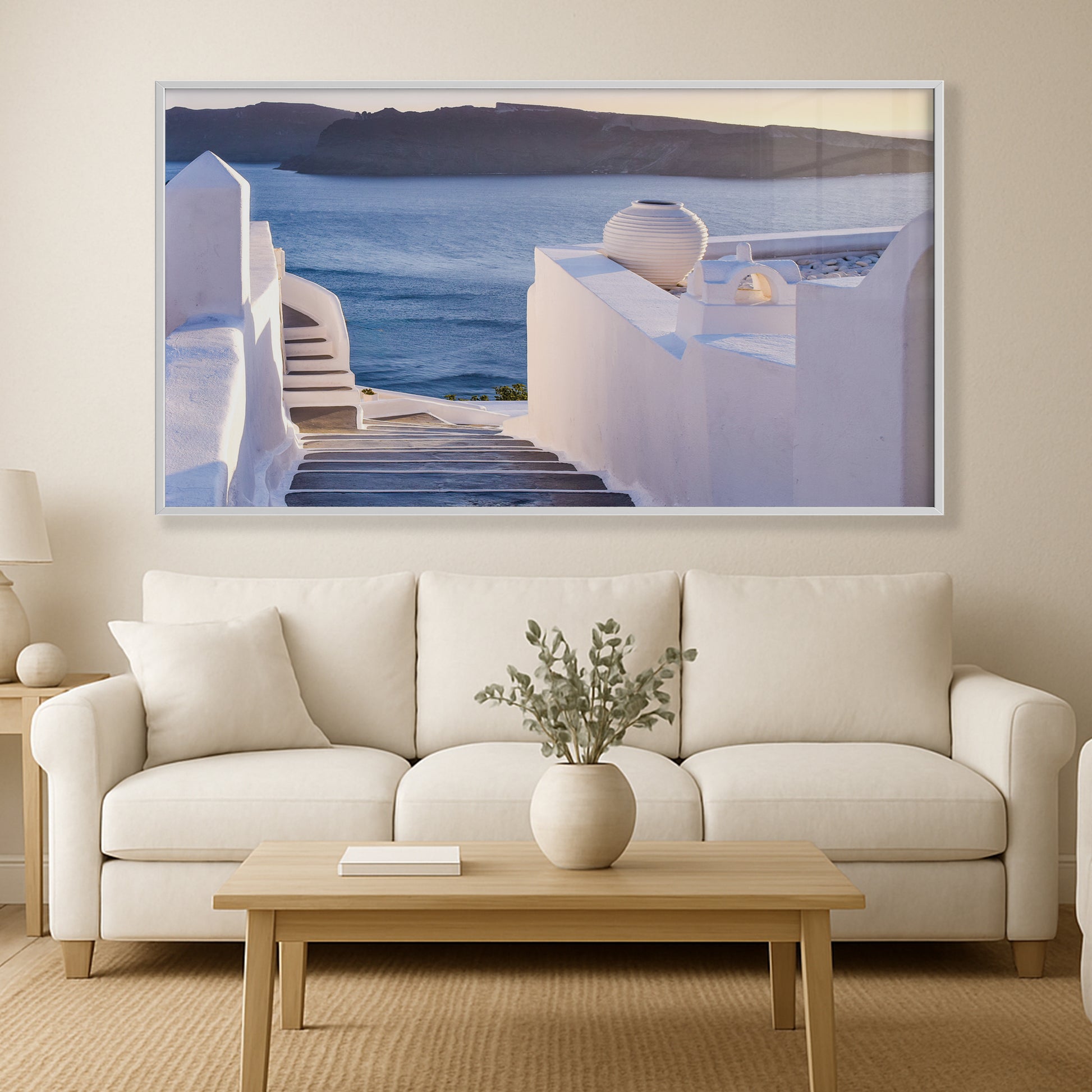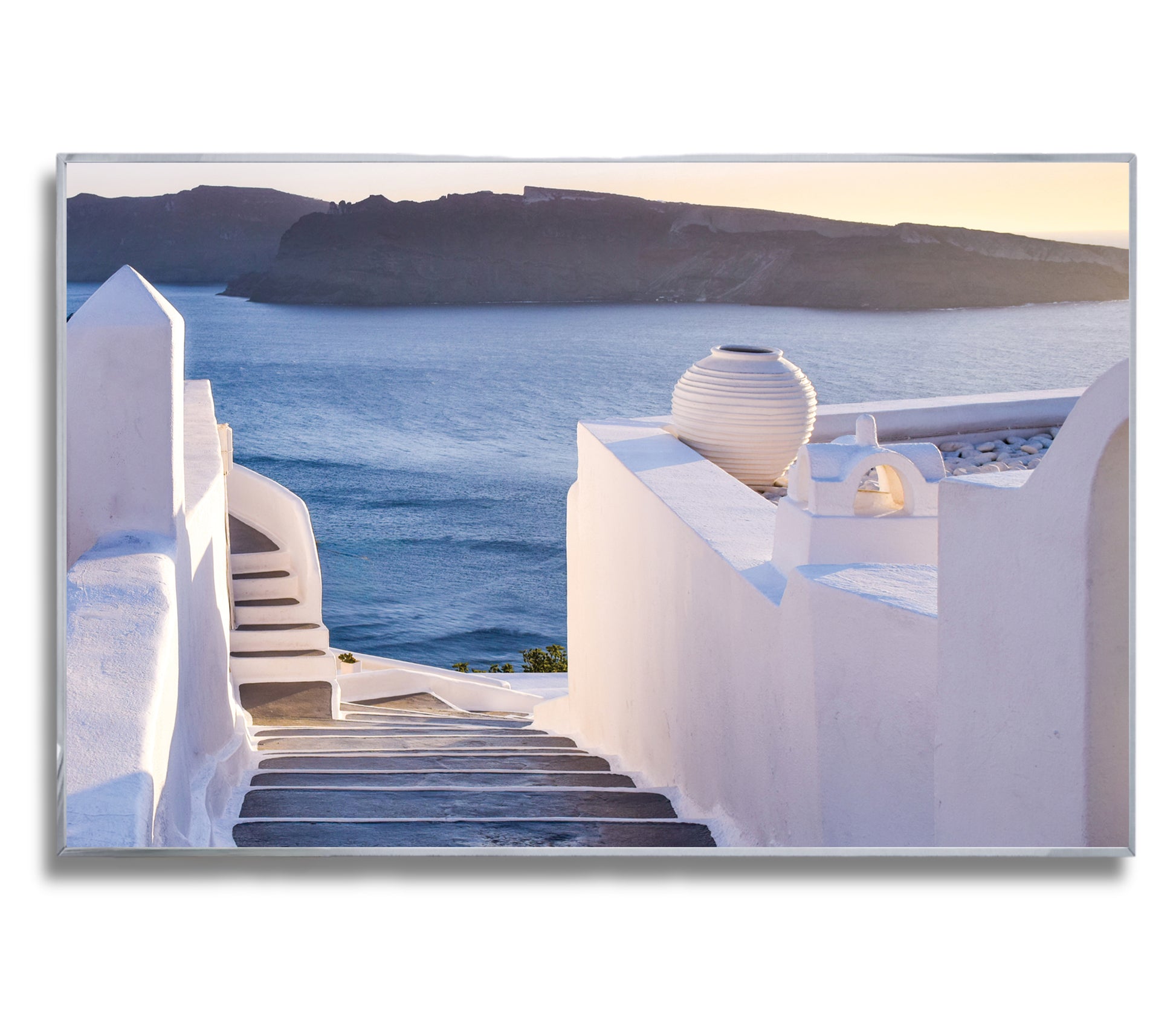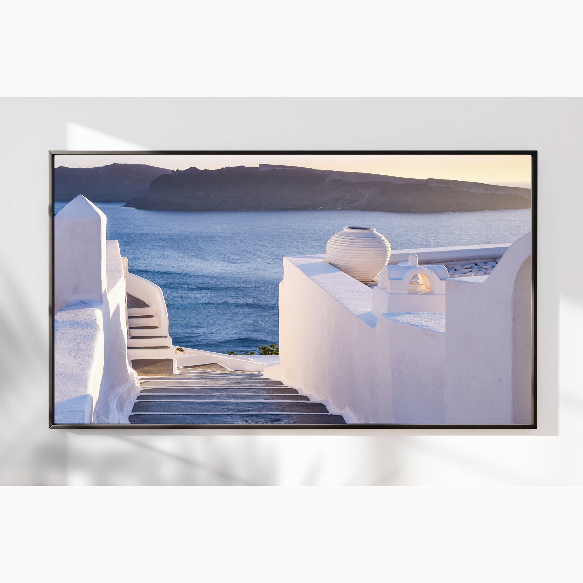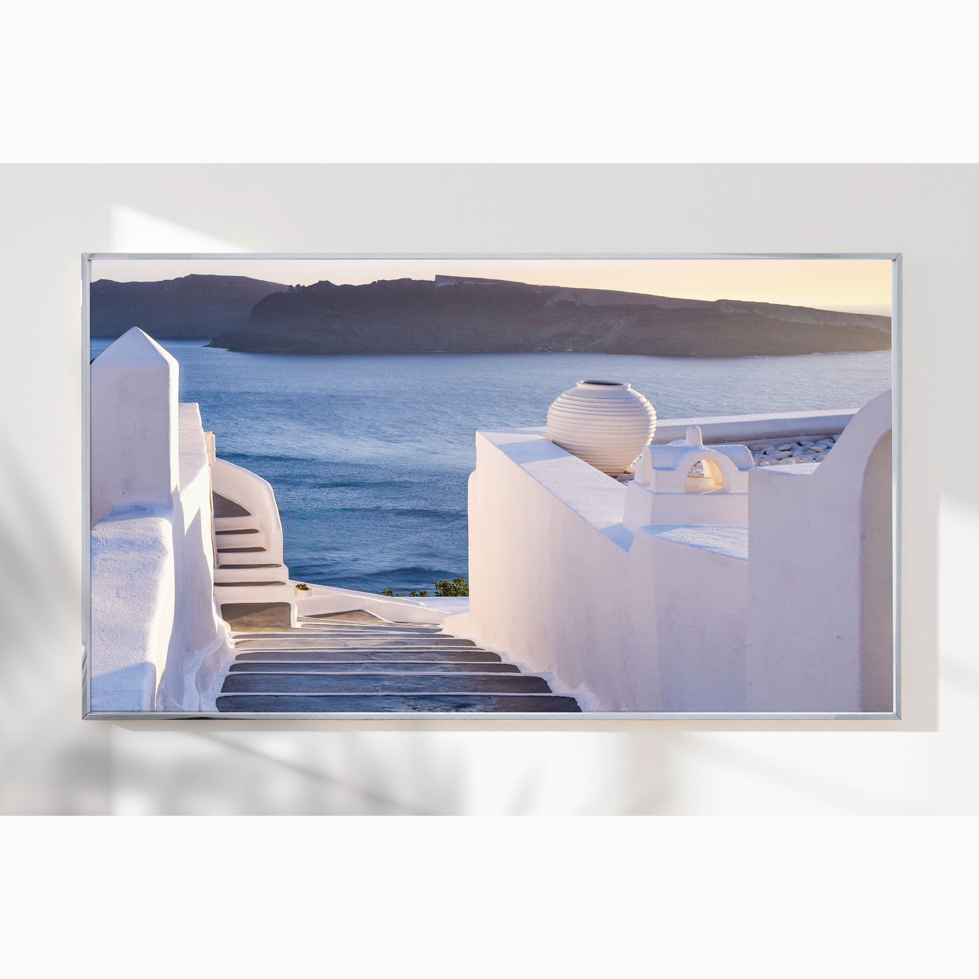 This enchanting image showcases the winding stone steps of Santorini, leading the eye toward the glowing Aegean Sea at sunset. Elegant white walls, soft shadows, and a pastel-hued horizon create a dreamlike Mediterranean ambiance.