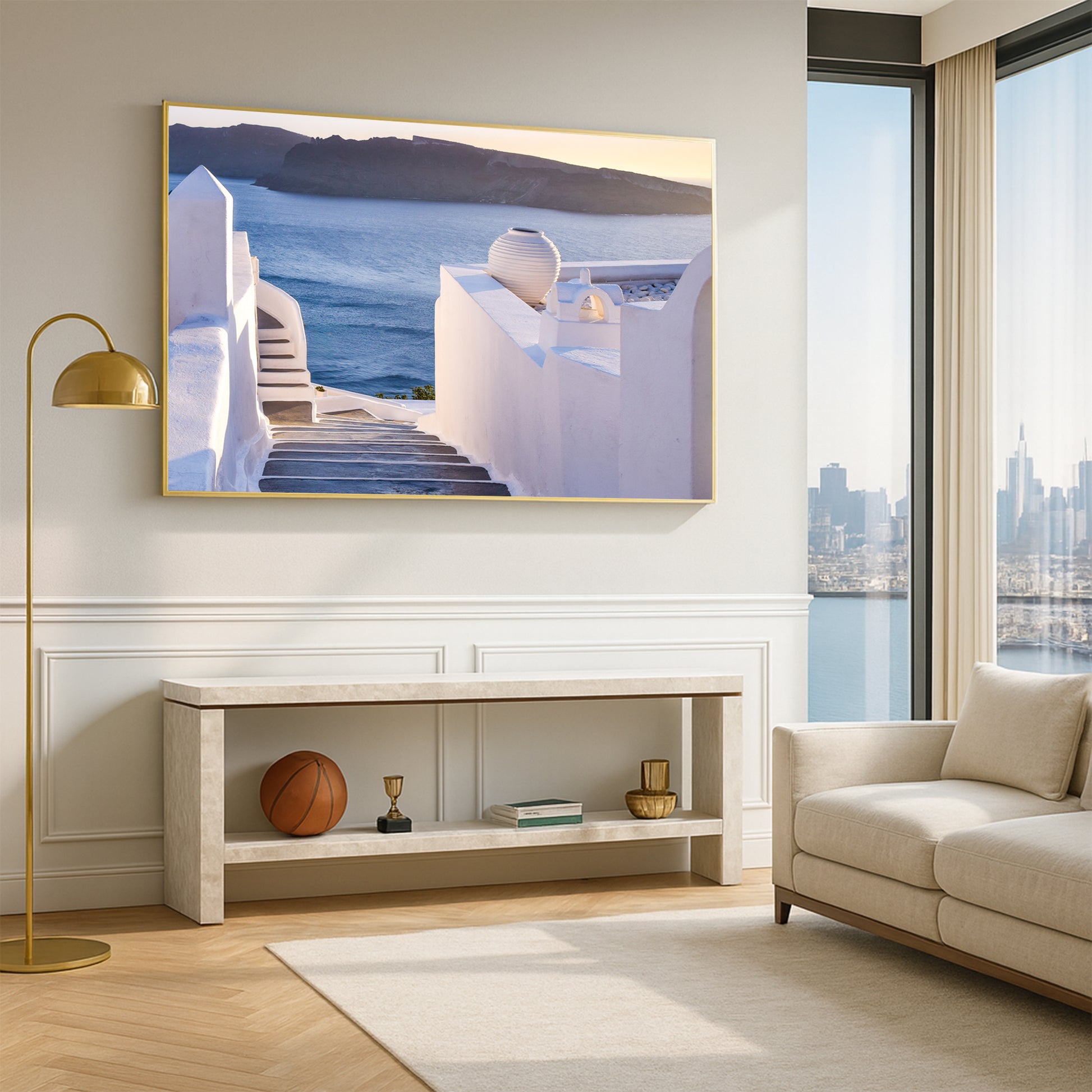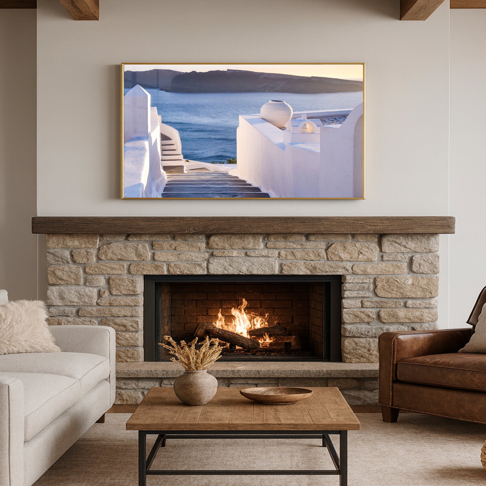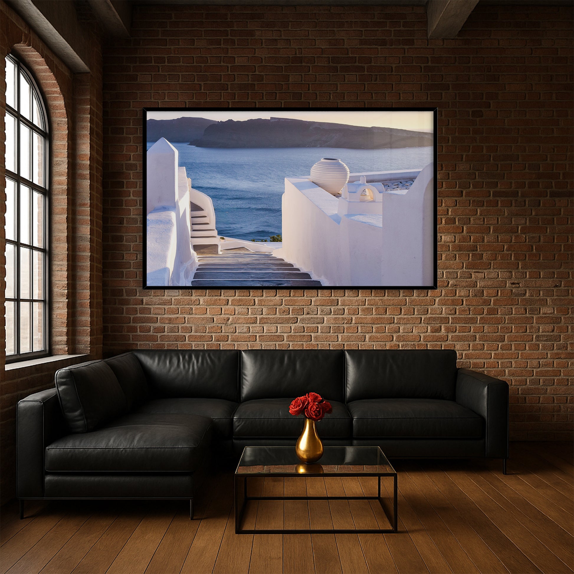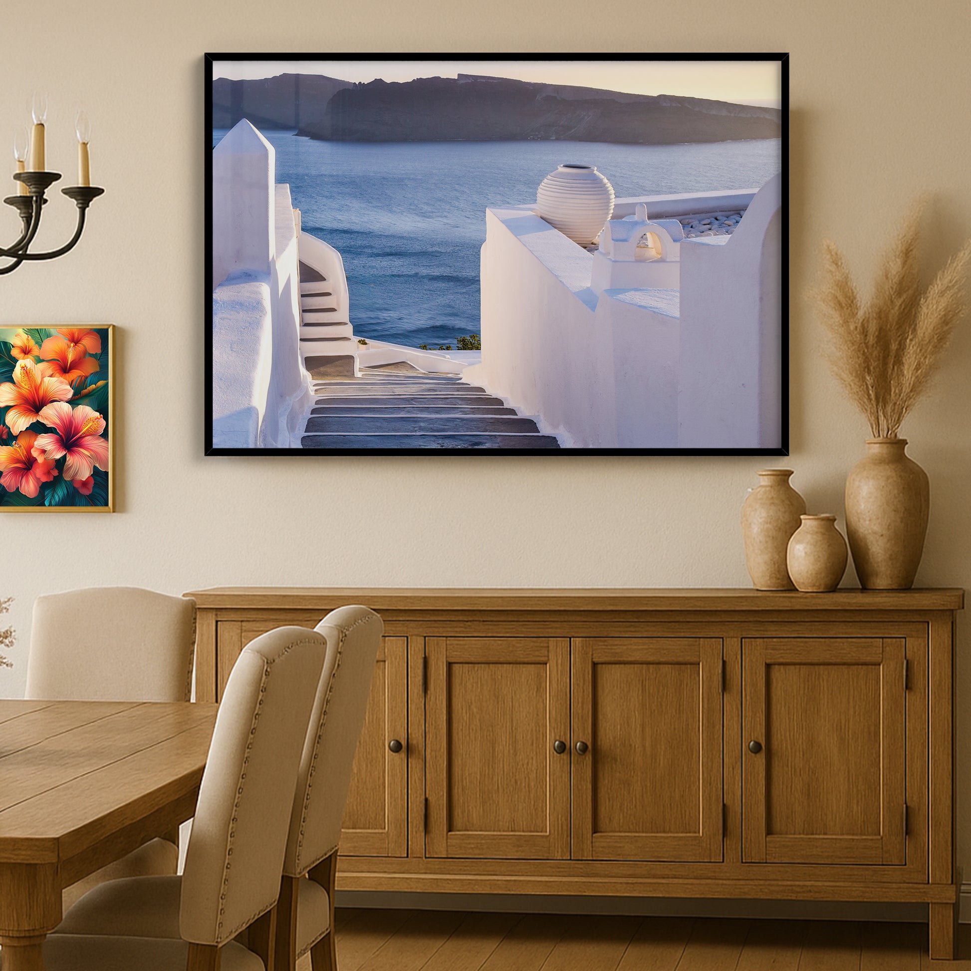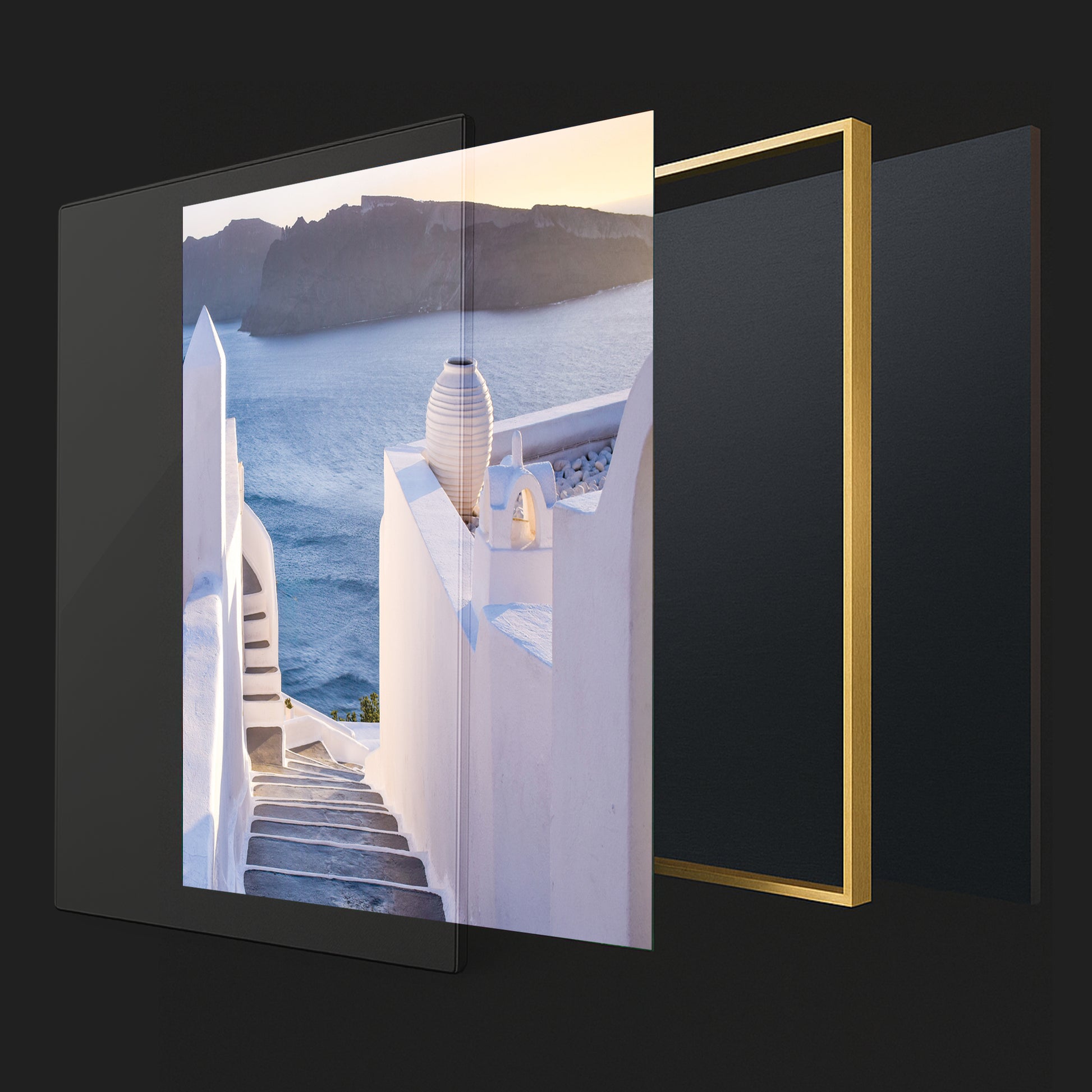 This enchanting image showcases the winding stone steps of Santorini, leading the eye toward the glowing Aegean Sea at sunset. Elegant white walls, soft shadows, and a pastel-hued horizon create a dreamlike Mediterranean ambiance.