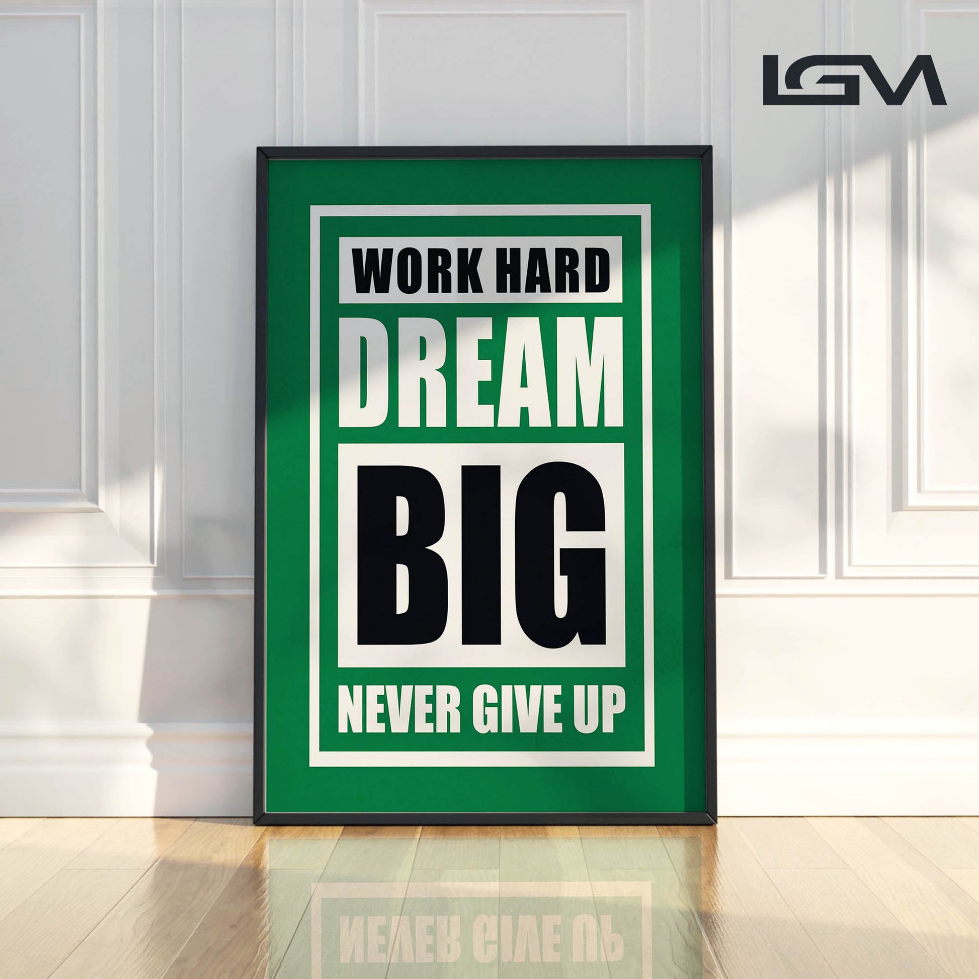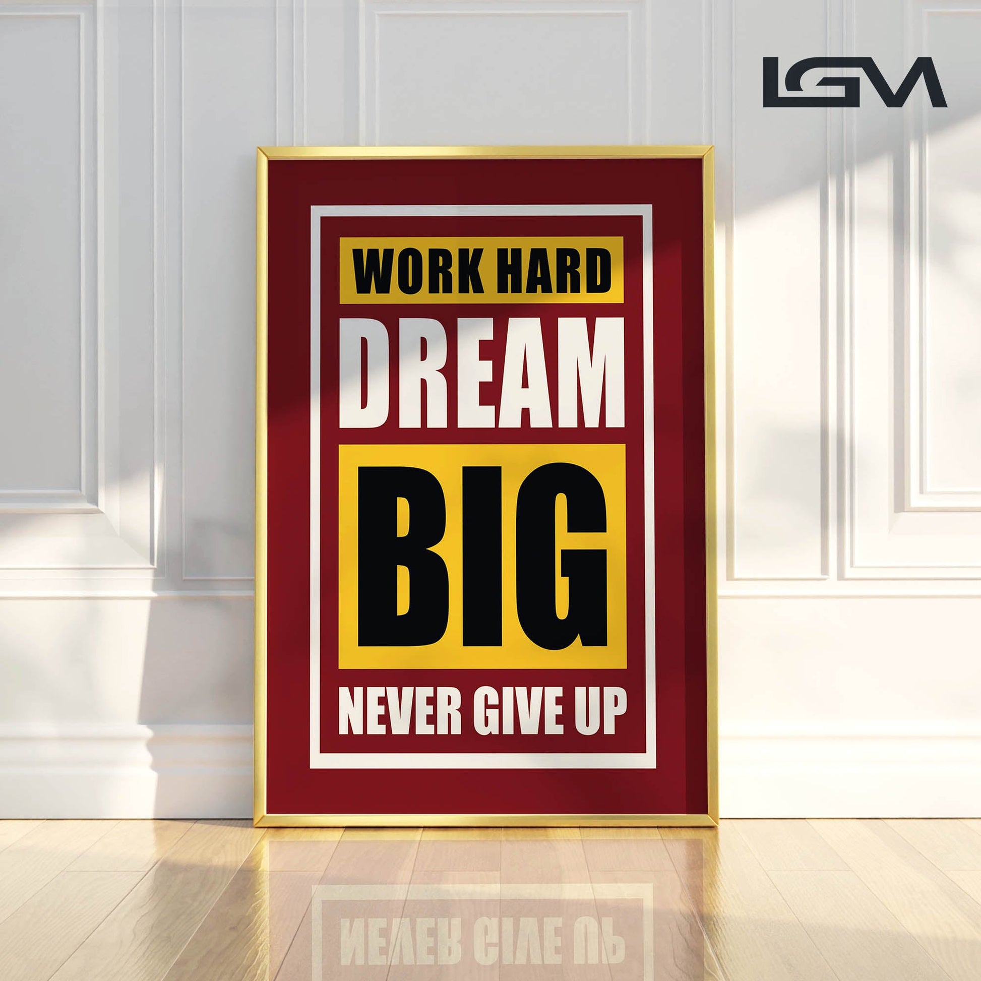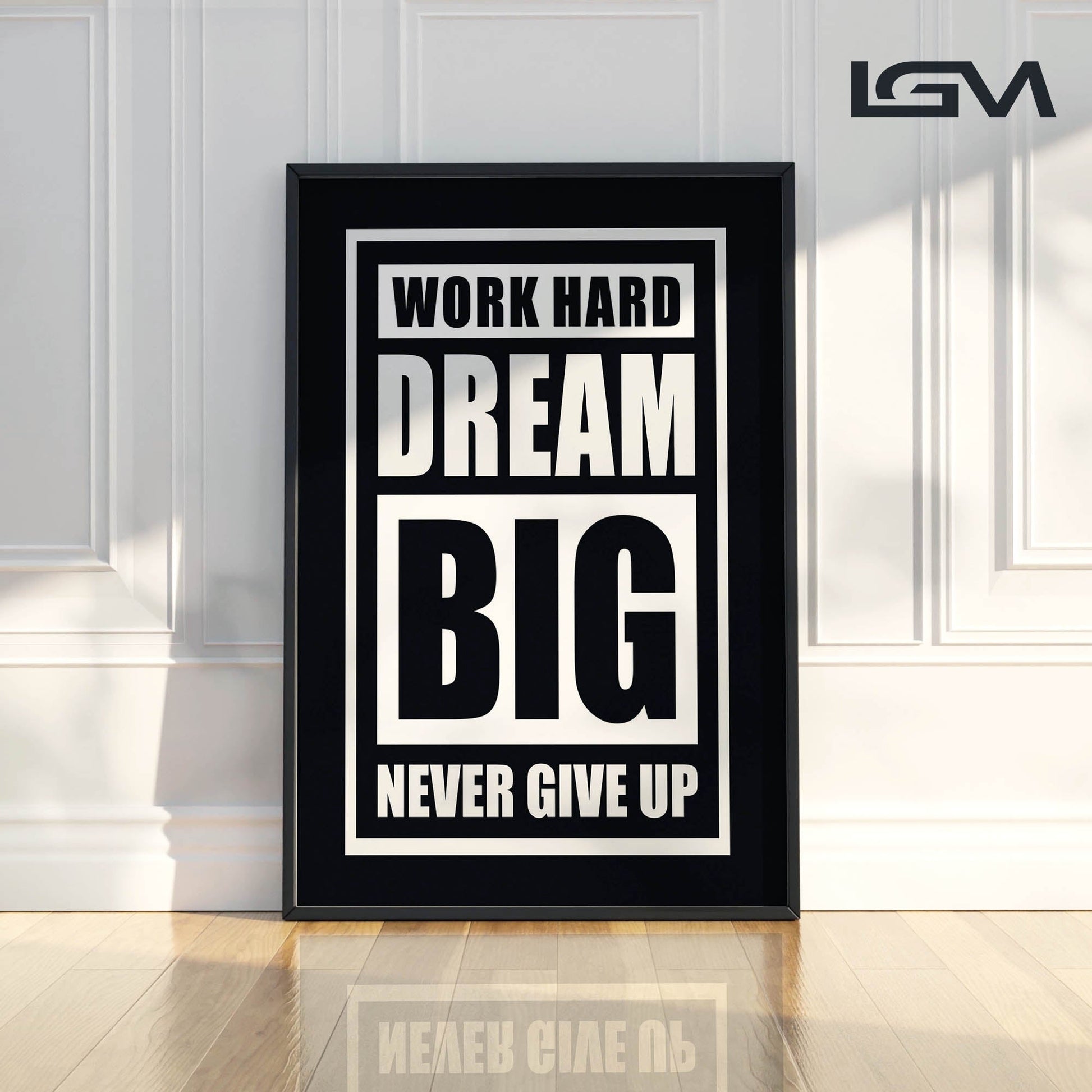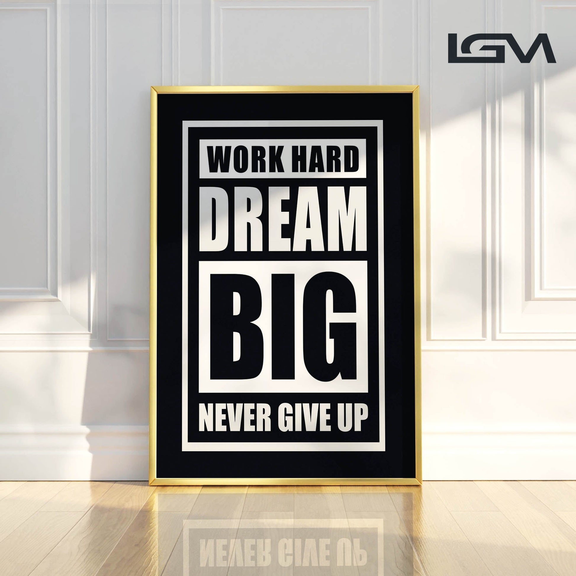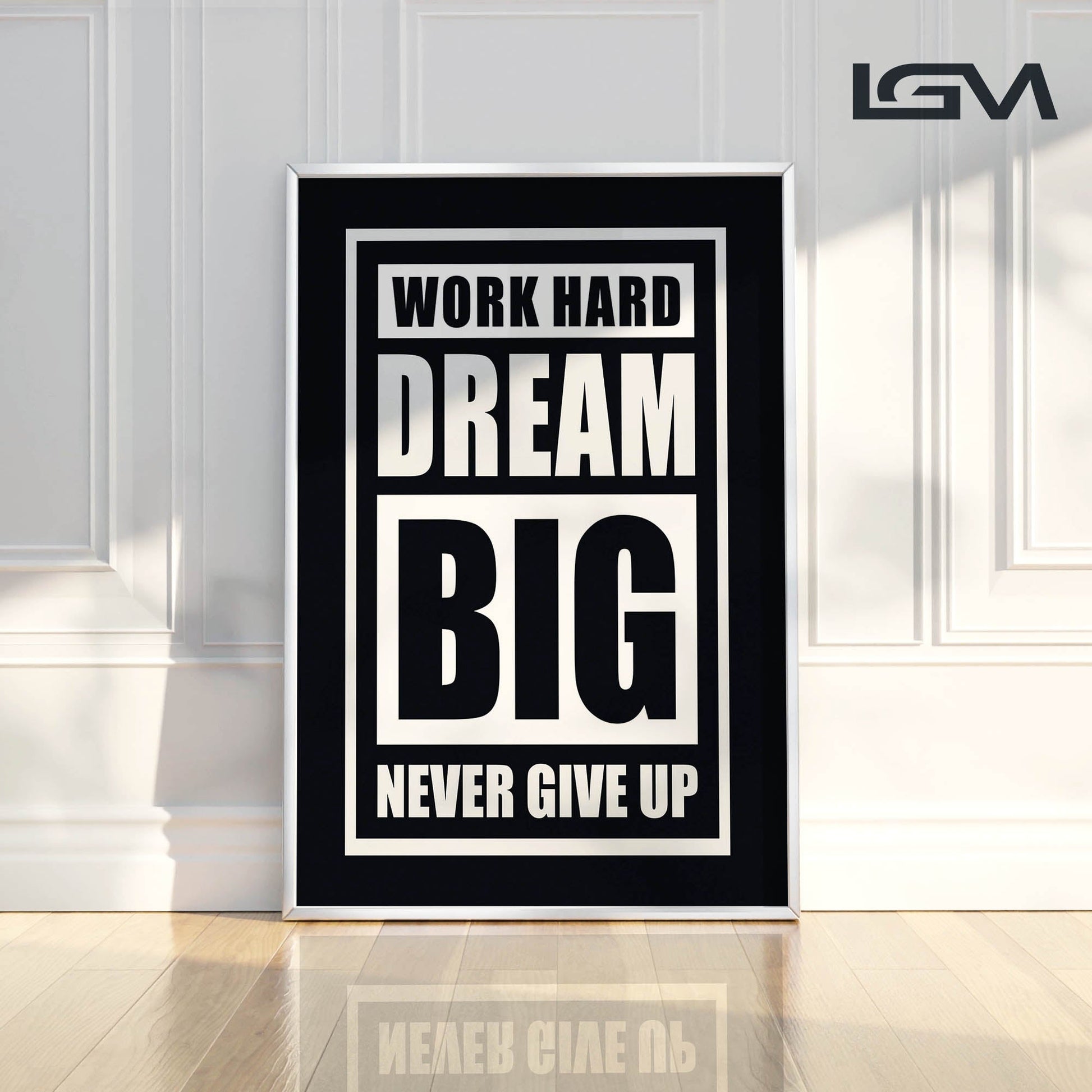Success starts with grit, vision, and perseverance. This bold typography print delivers a powerful triple-shot of motivation to push you forward every single day. With its clean block lettering and commanding layout, it's a strong visual mantra for anyone chasing big goals.