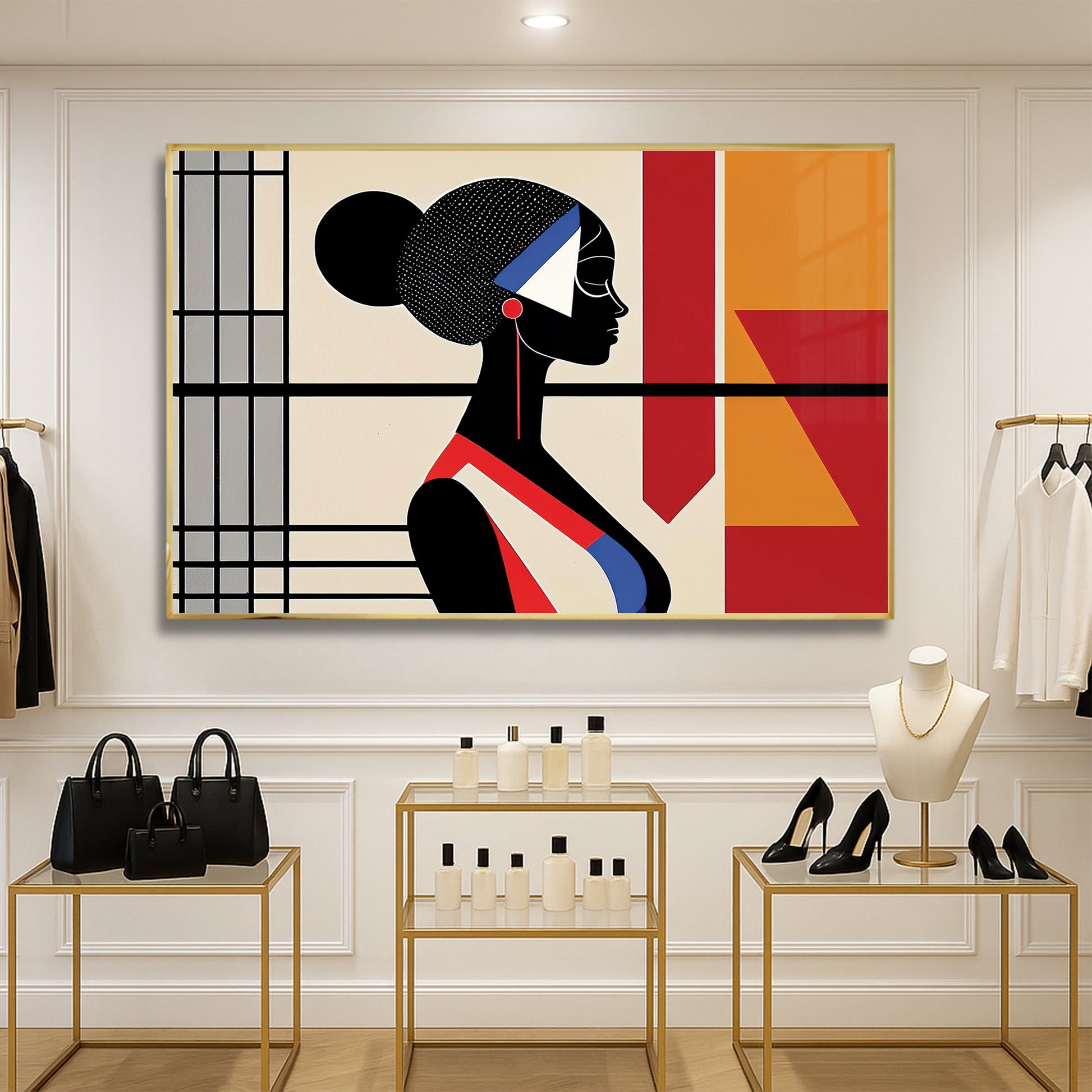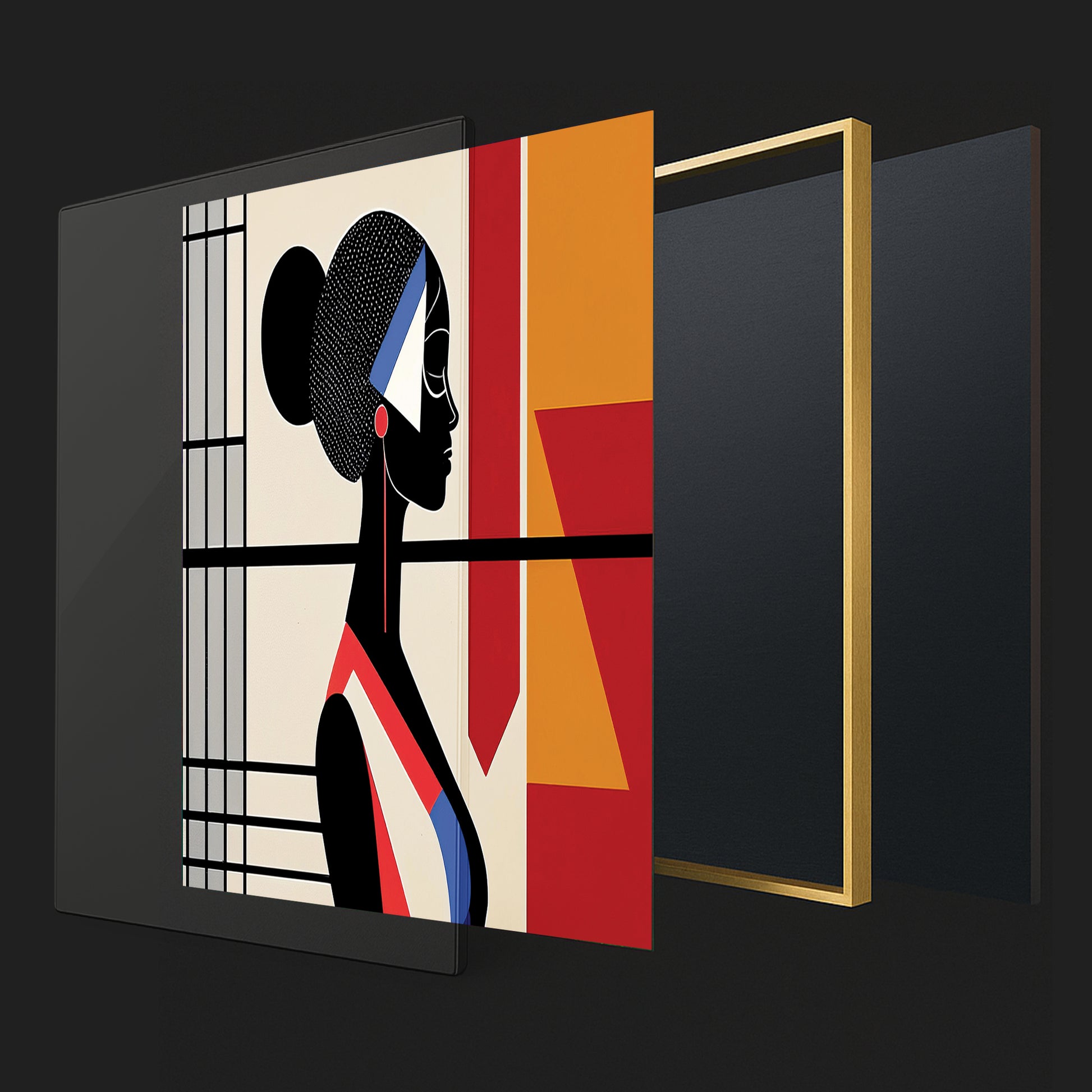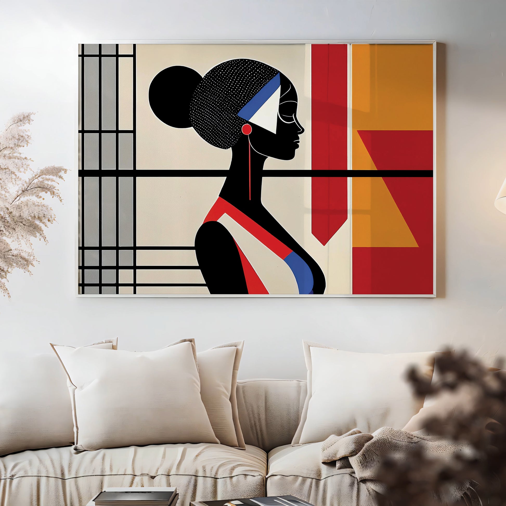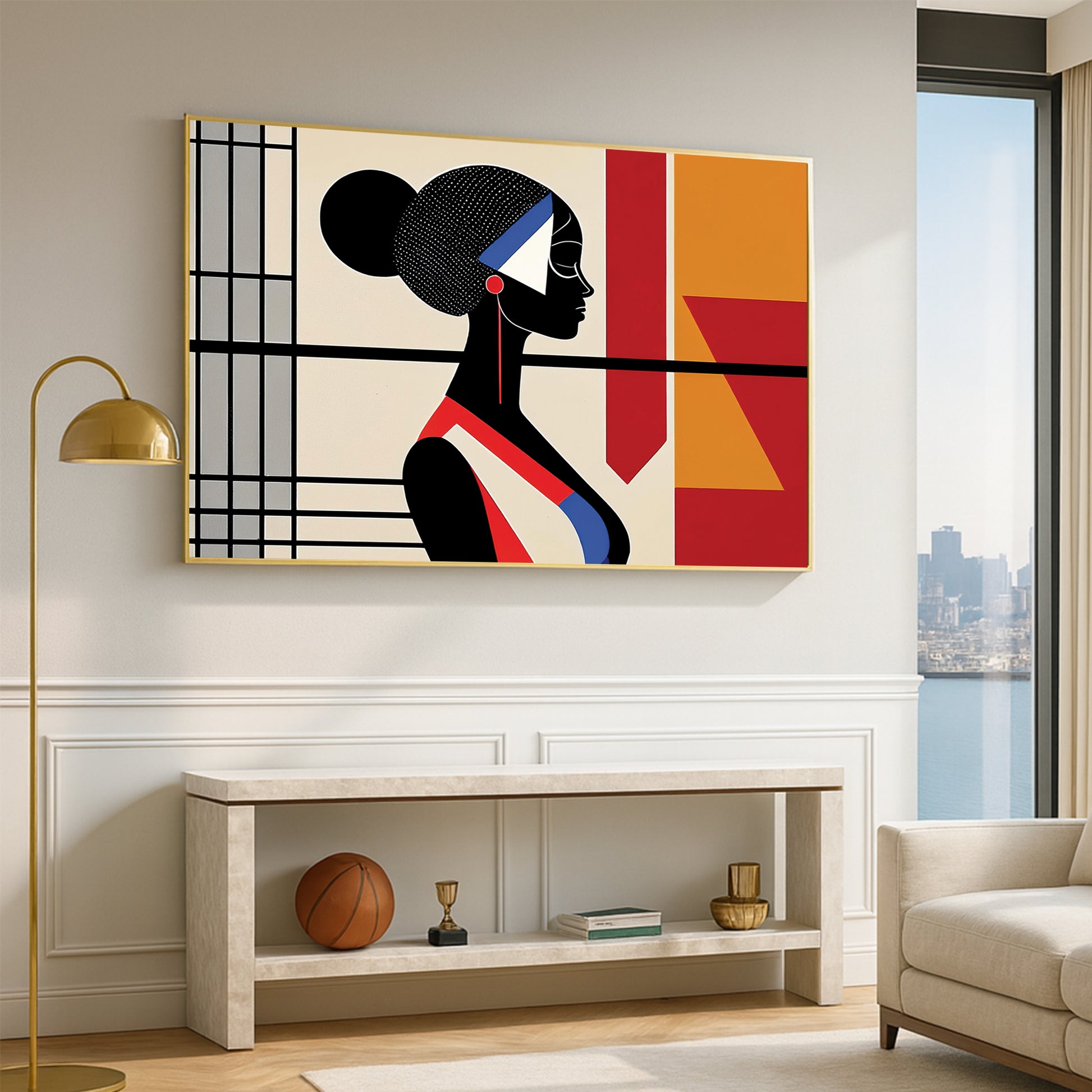 💃 Modern femininity takes form in this elegant celebration of curves, color, and clean design. The graceful figure, outlined in black, is complemented by bold geometric shapes that create a striking visual rhythm. A true conversation piece, this print balances simplicity and strength.