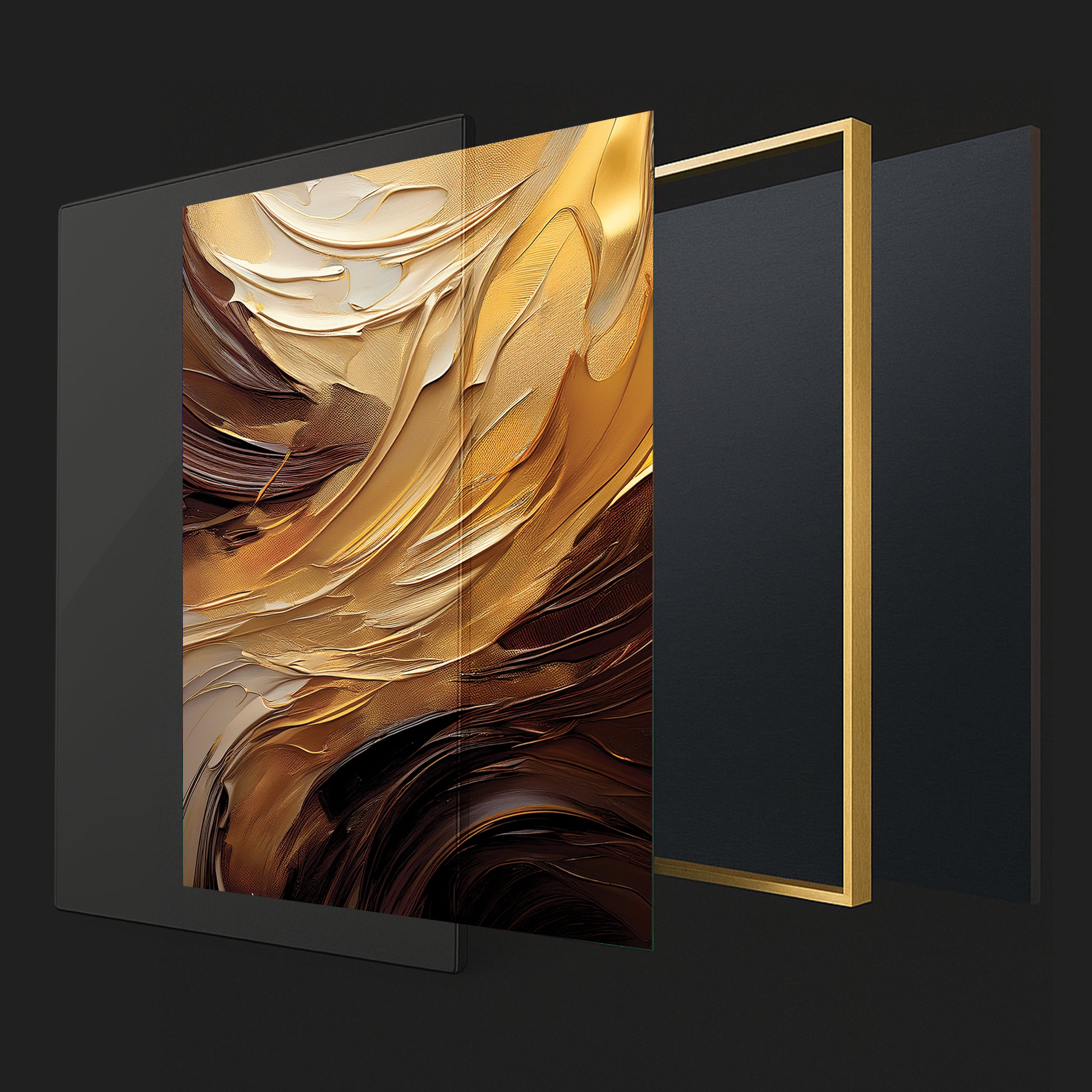 Radiating warmth and refinement, this gold abstract wall art features fluid brushstrokes layered with rich metallic textures. Shades of deep bronze, golden ochre, and shimmering highlights flow together, evoking energy and movement. The dynamic surface detail brings a luxurious feel to the artwork, a stunning centerpiece for living rooms, dining areas, or upscale office spaces.