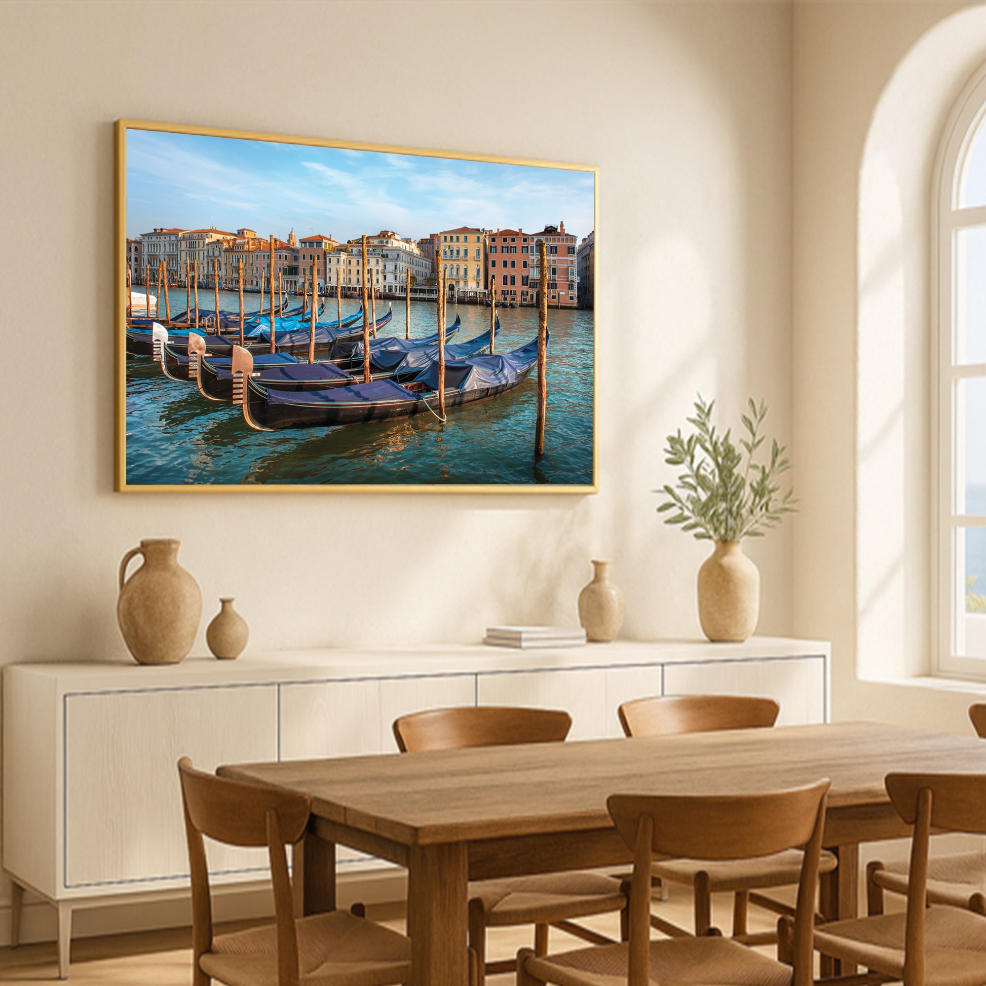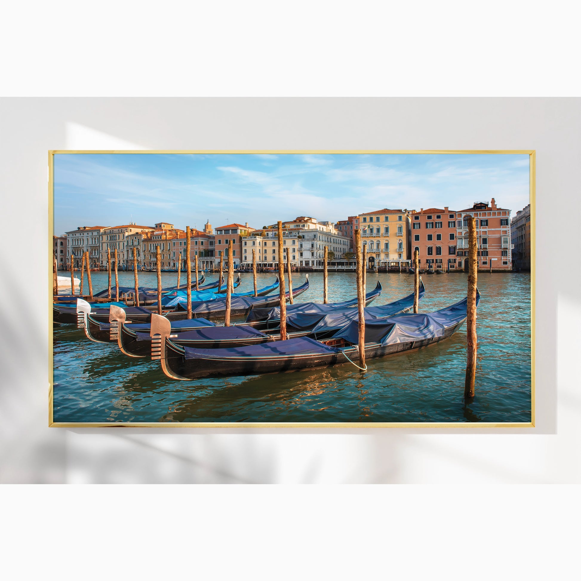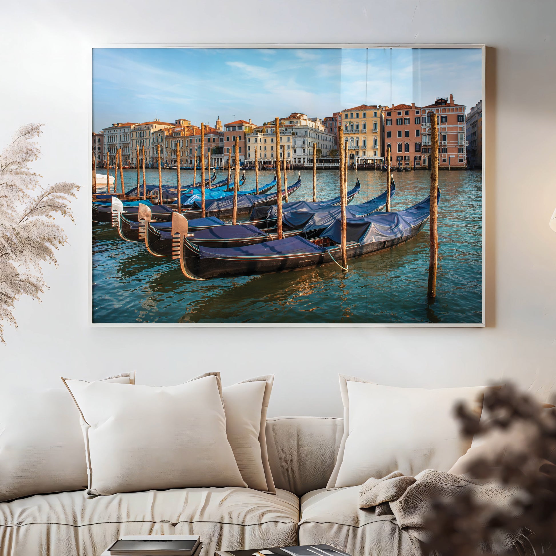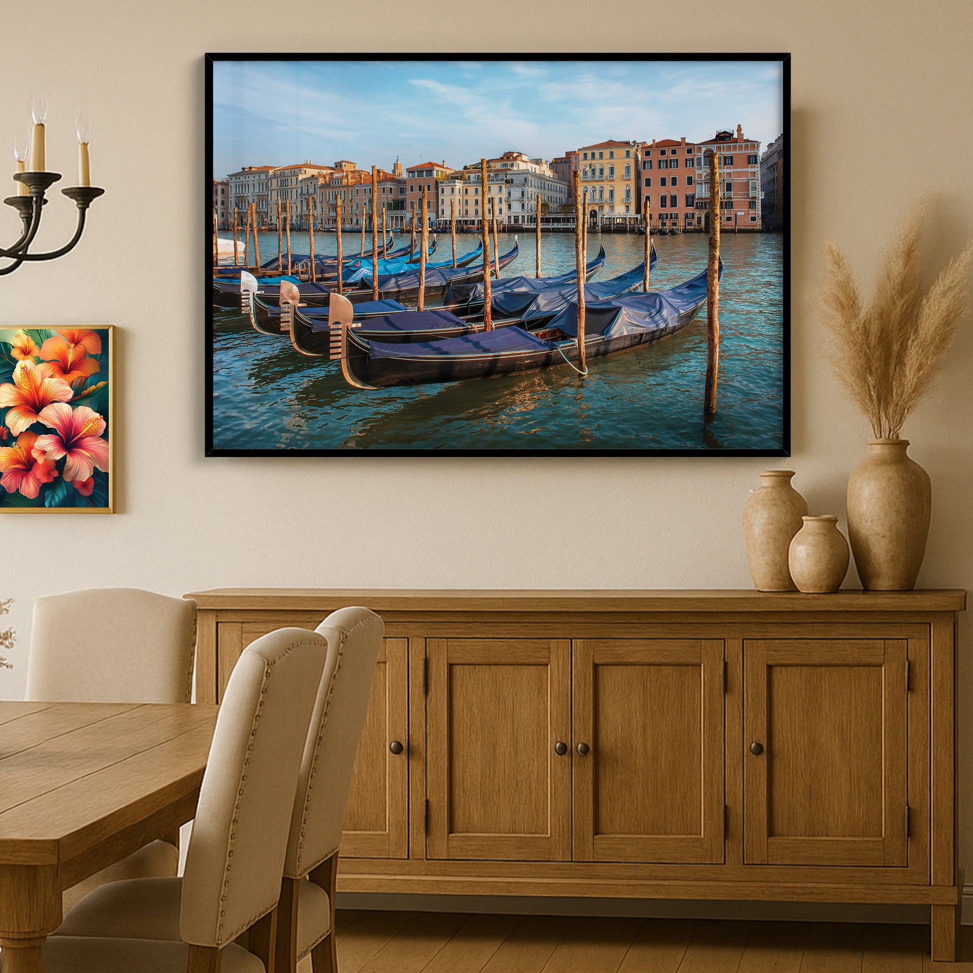 Step into Venetian serenity with this captivating image of gondolas gently docked along the Grand Canal. The pastel buildings of Venice rise behind them, basking in warm light that evokes European charm and timeless romance.