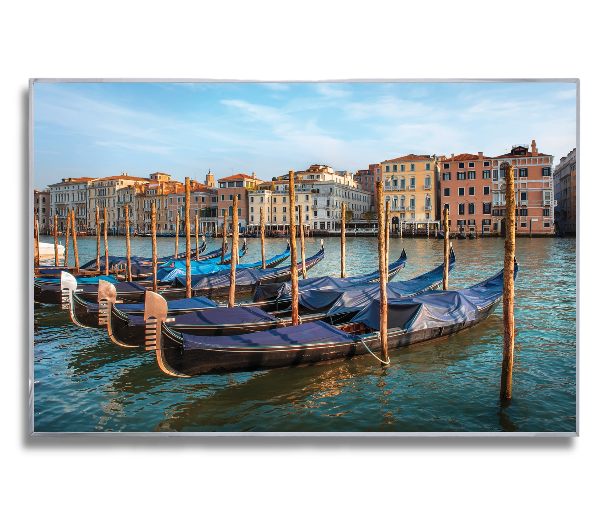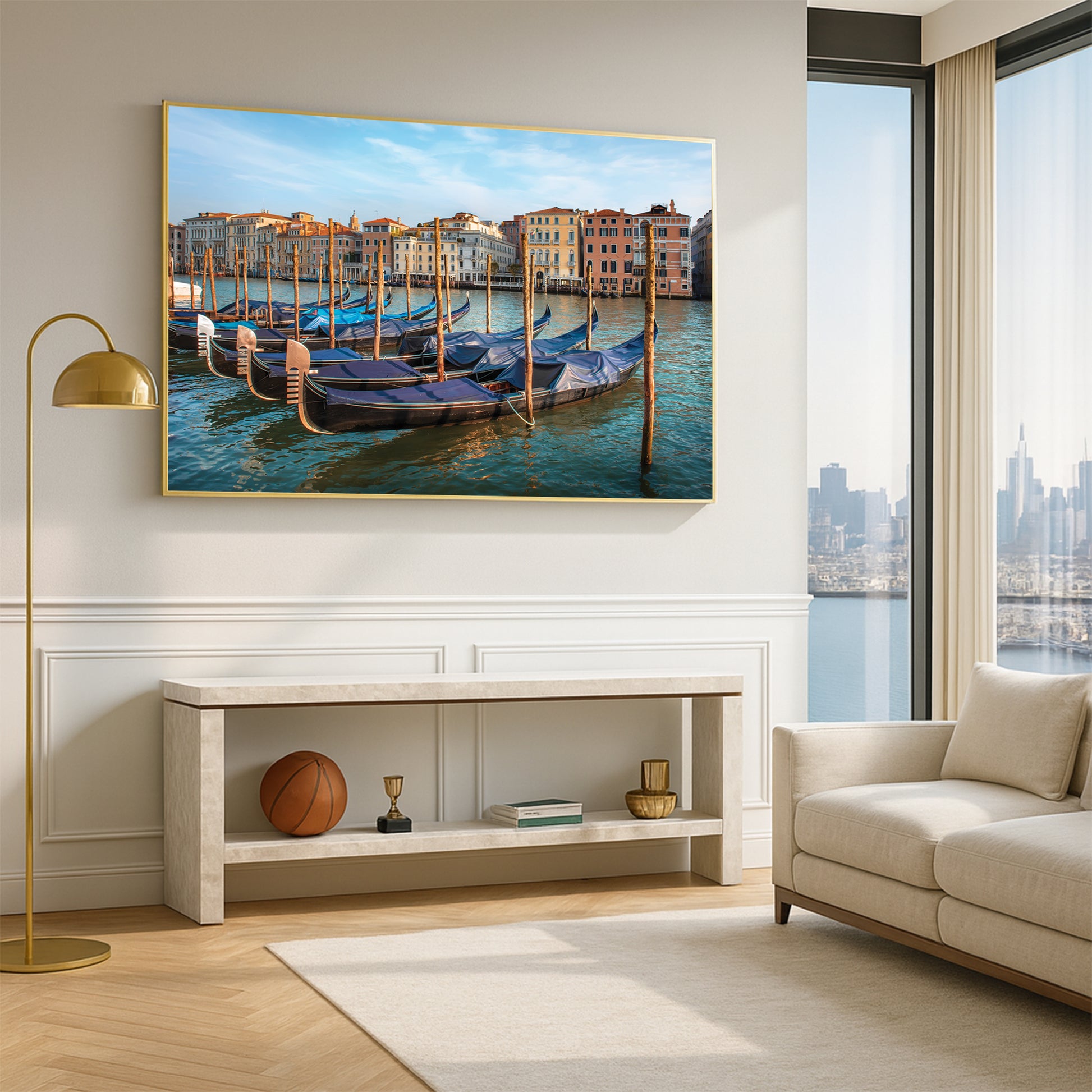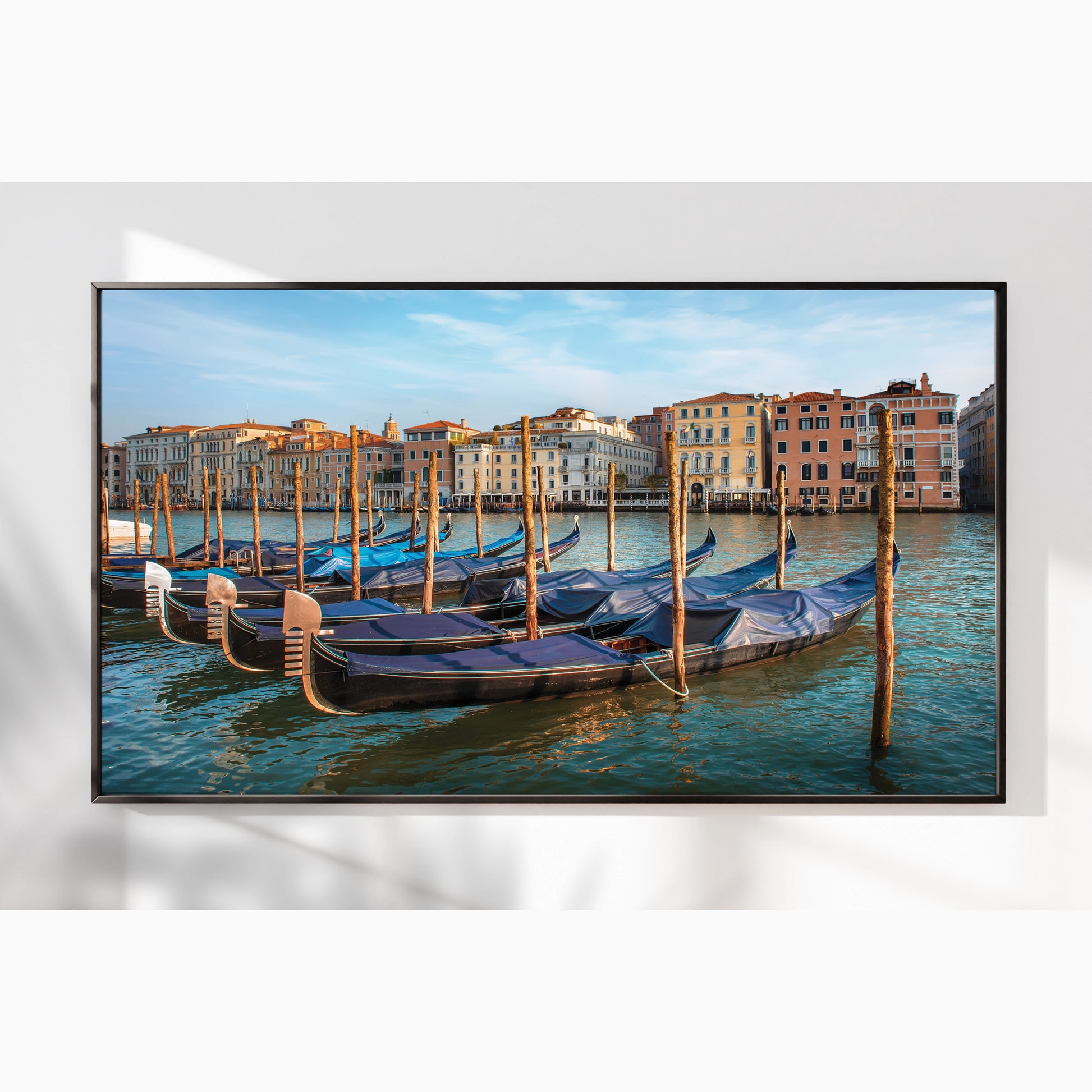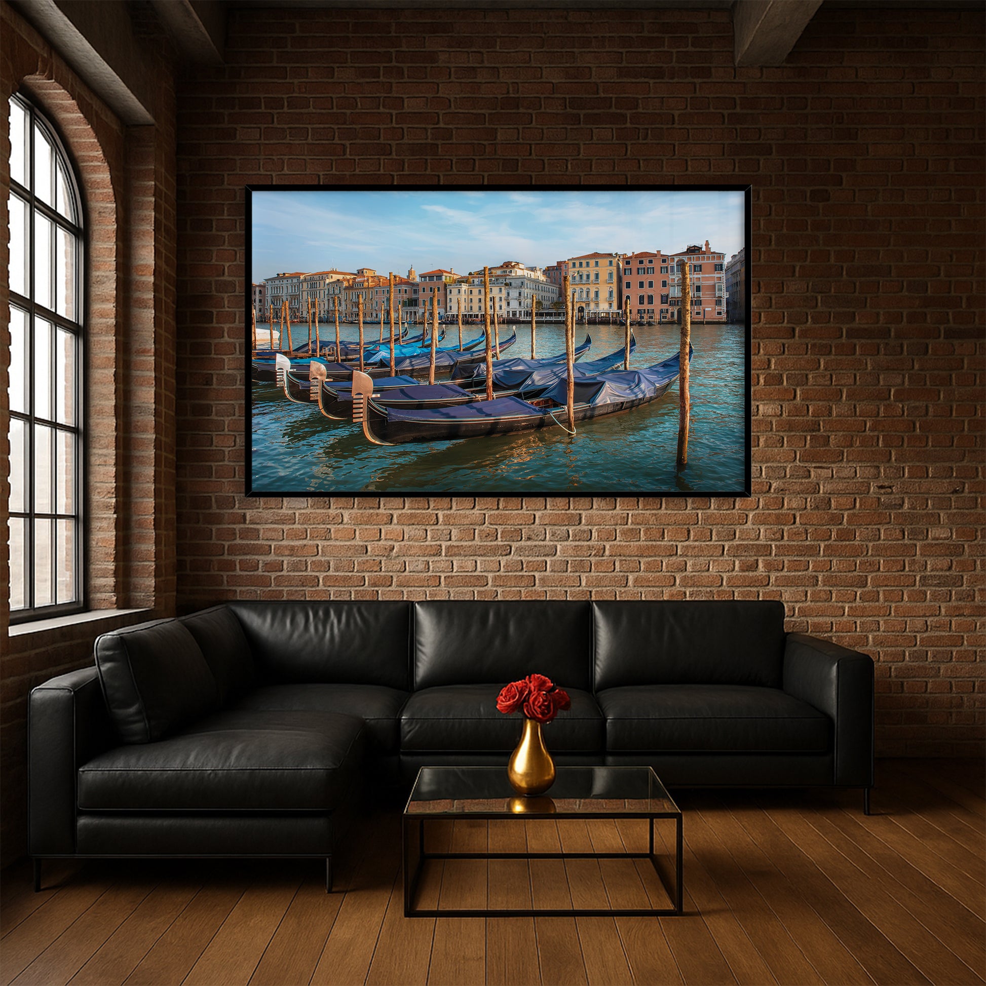 Step into Venetian serenity with this captivating image of gondolas gently docked along the Grand Canal. The pastel buildings of Venice rise behind them, basking in warm light that evokes European charm and timeless romance.