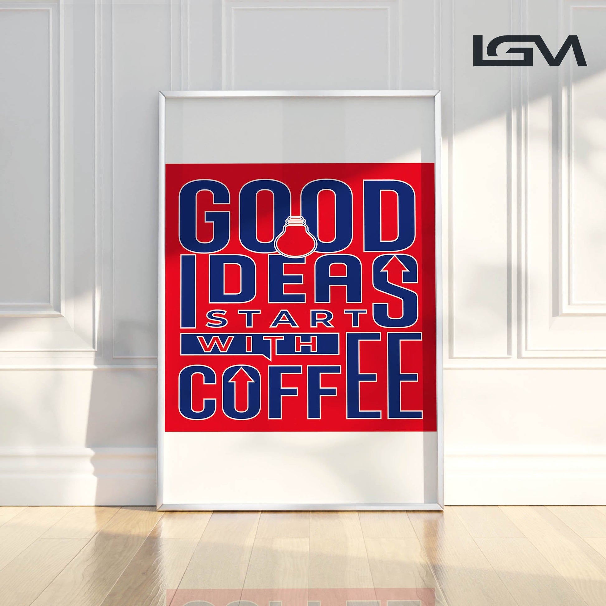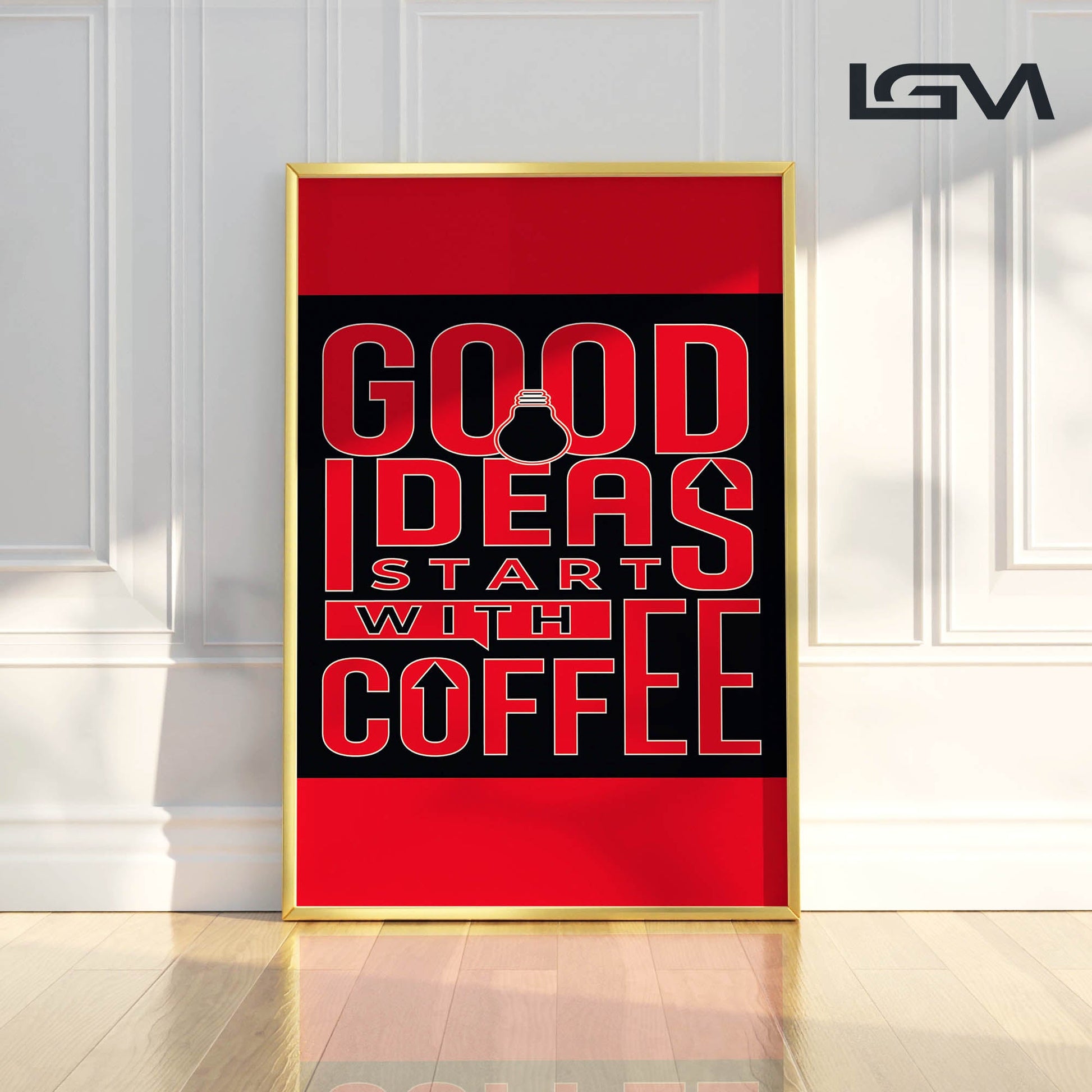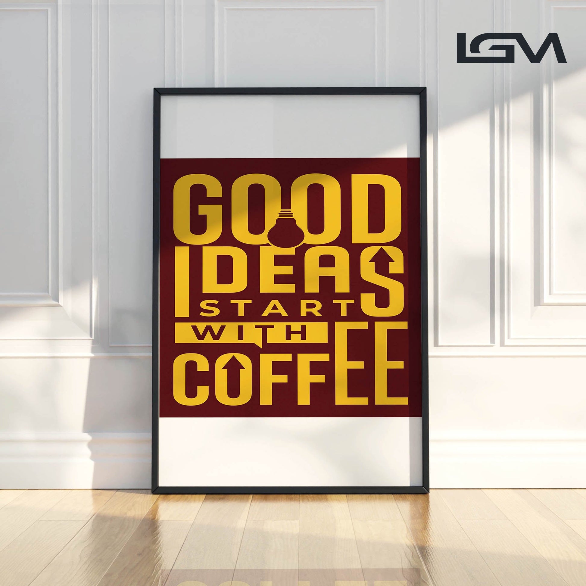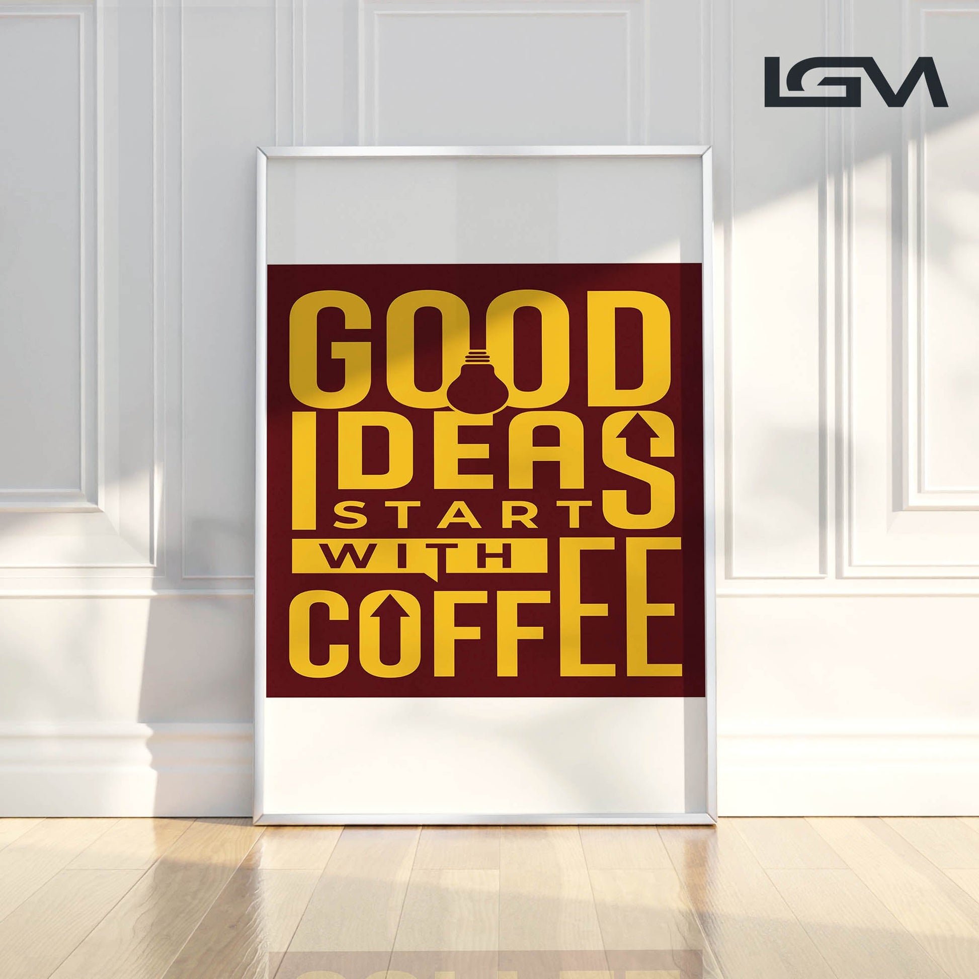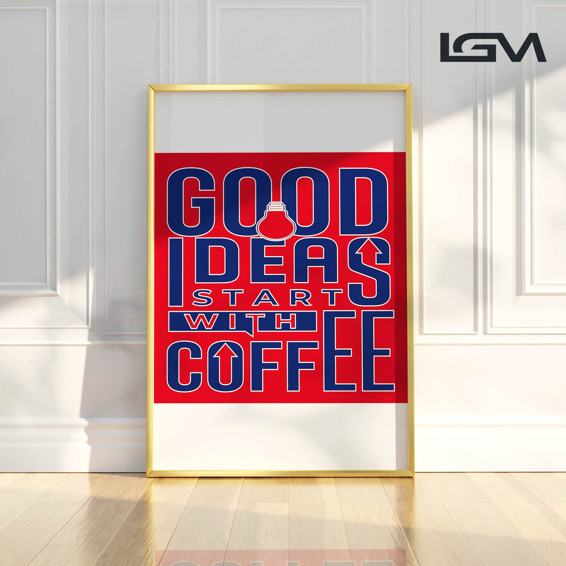 Kickstart your day with inspiration! This modern typography wall art is designed for coffee lovers and creative minds alike. The bold, high-contrast lettering pops against a vibrant background, delivering a daily reminder that great ideas often begin with a strong cup of coffee.