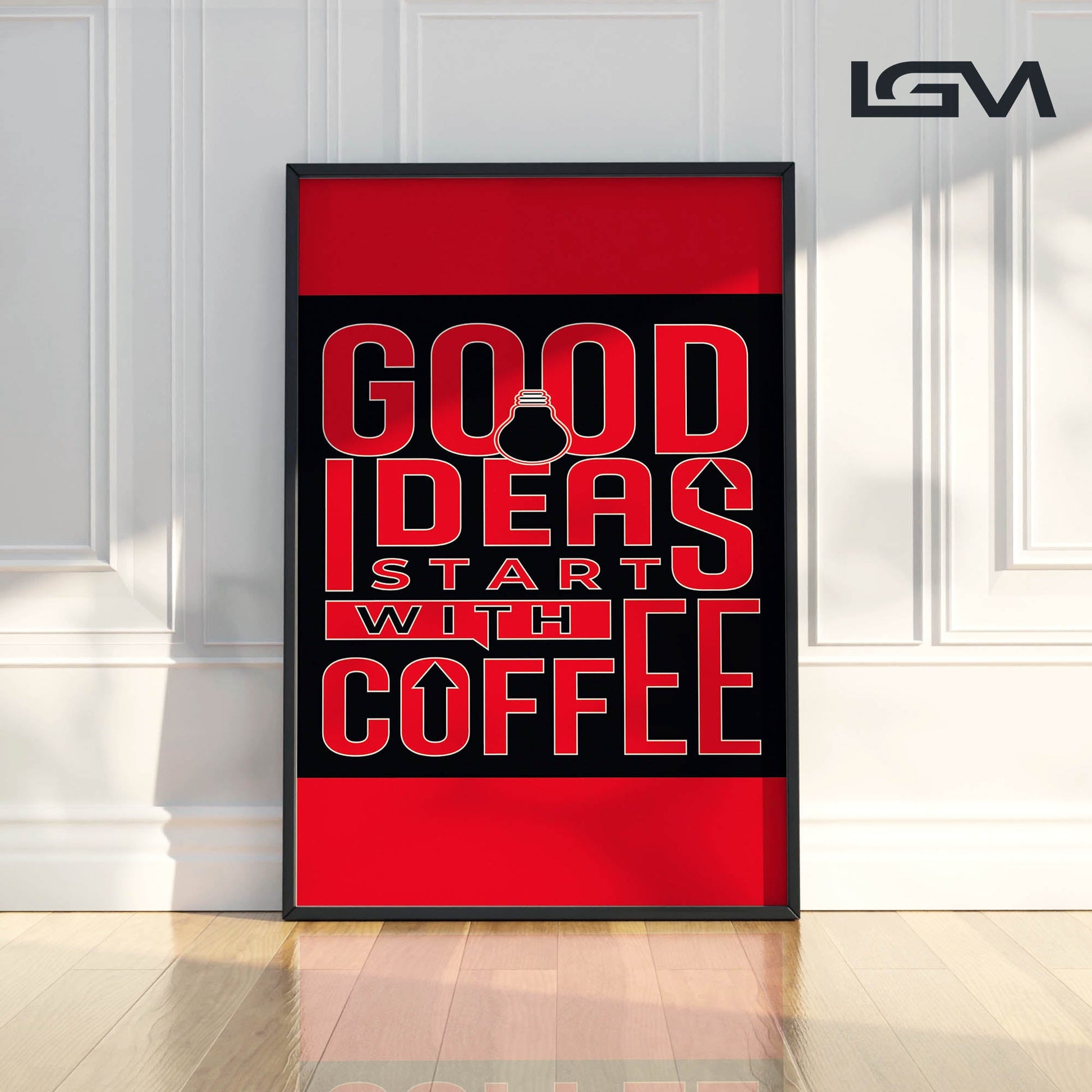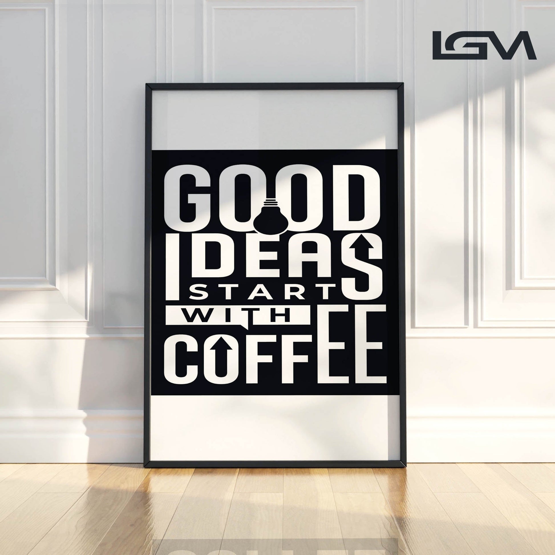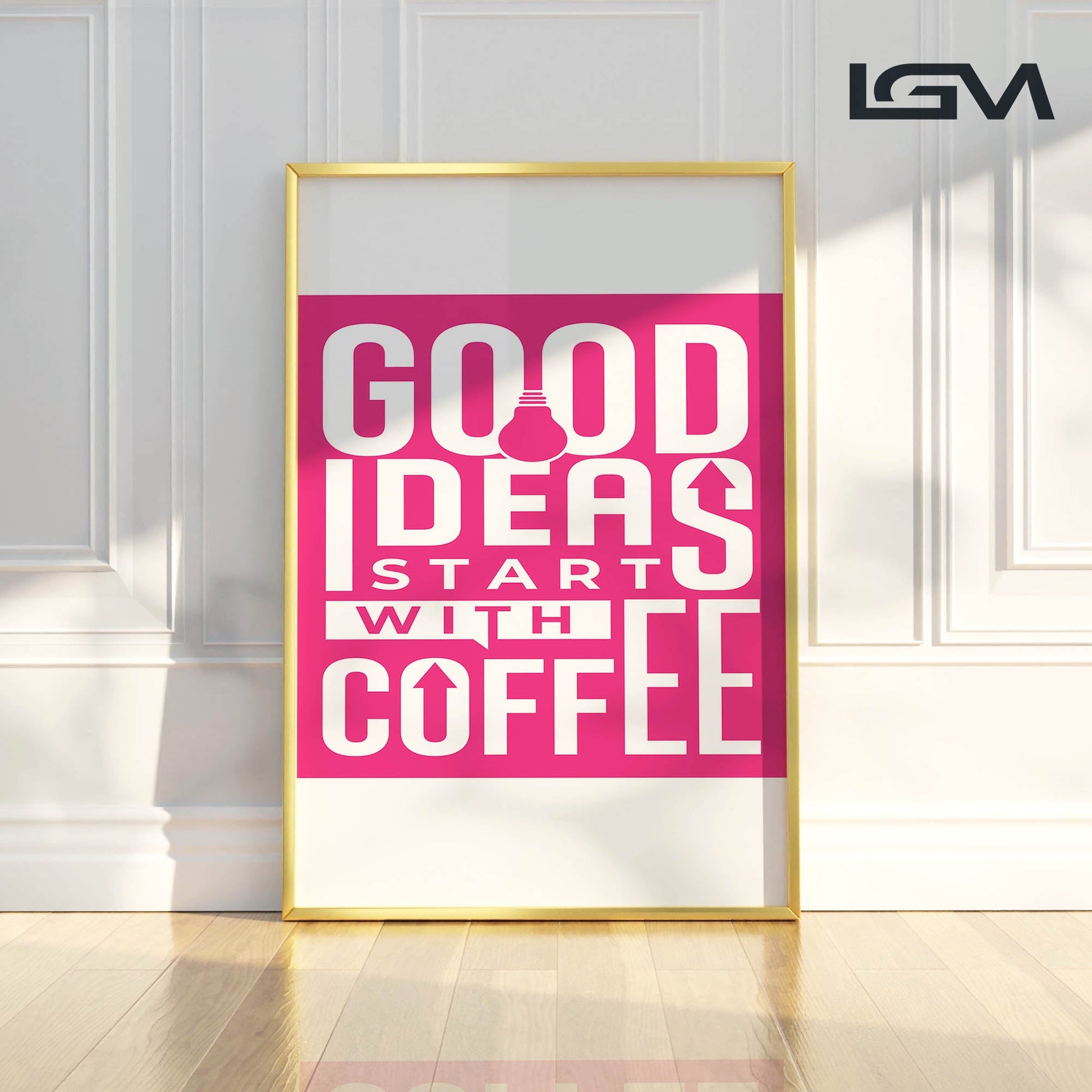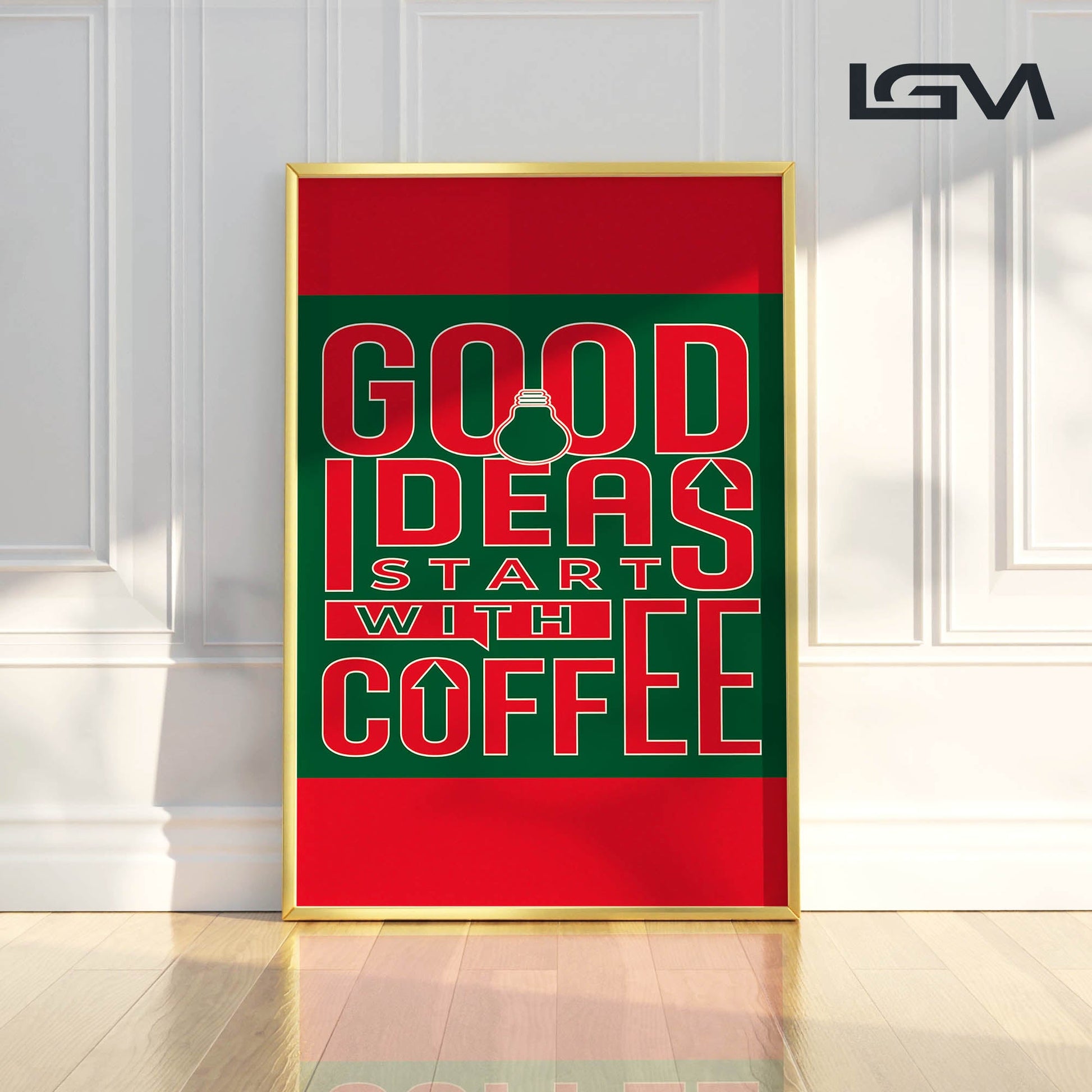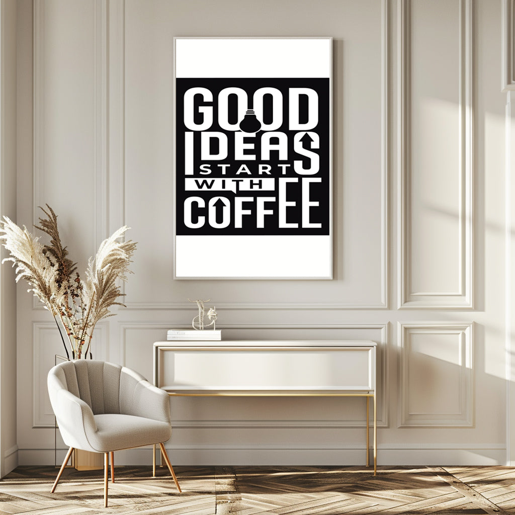 Kickstart your day with inspiration! This modern typography wall art is designed for coffee lovers and creative minds alike. The bold, high-contrast lettering pops against a vibrant background, delivering a daily reminder that great ideas often begin with a strong cup of coffee.