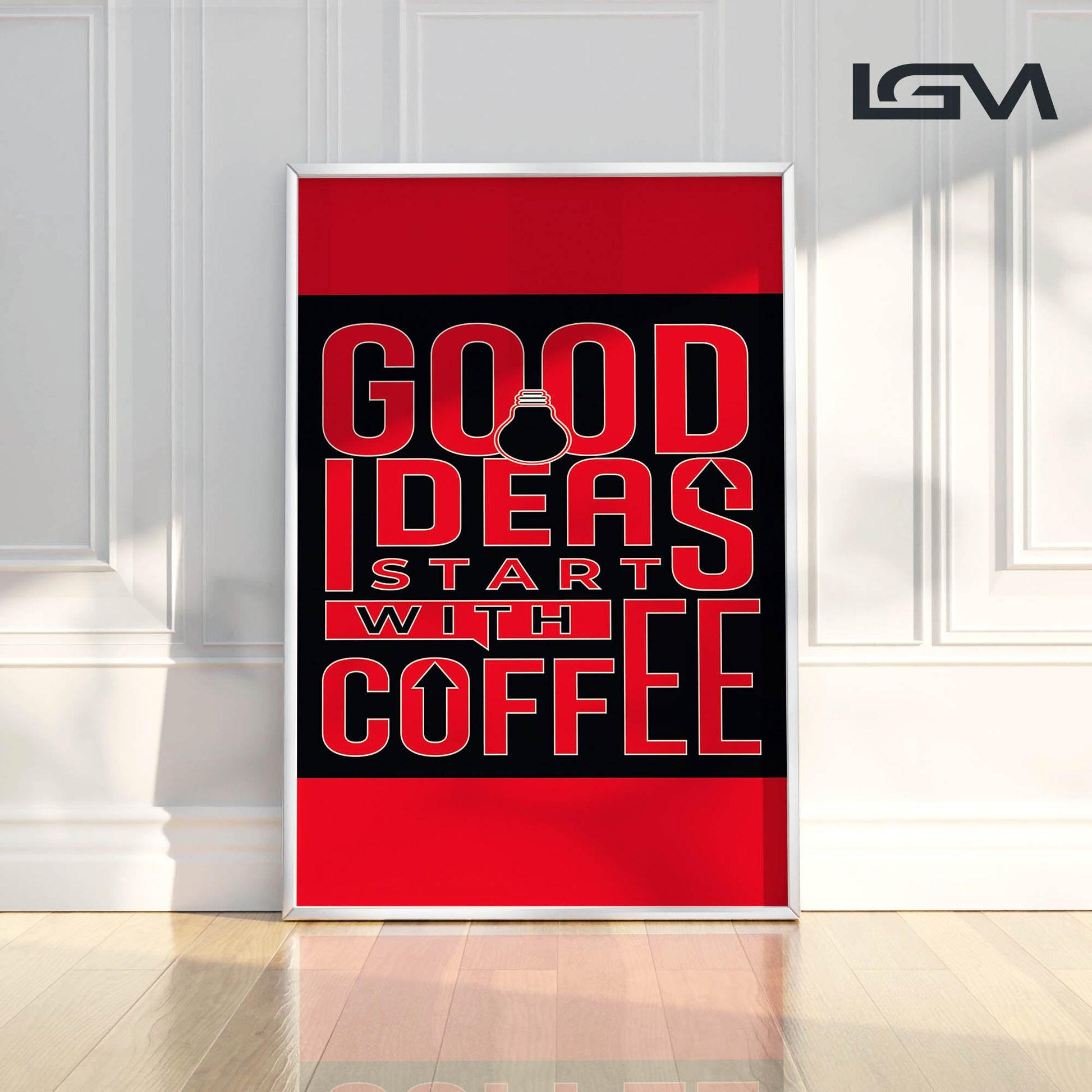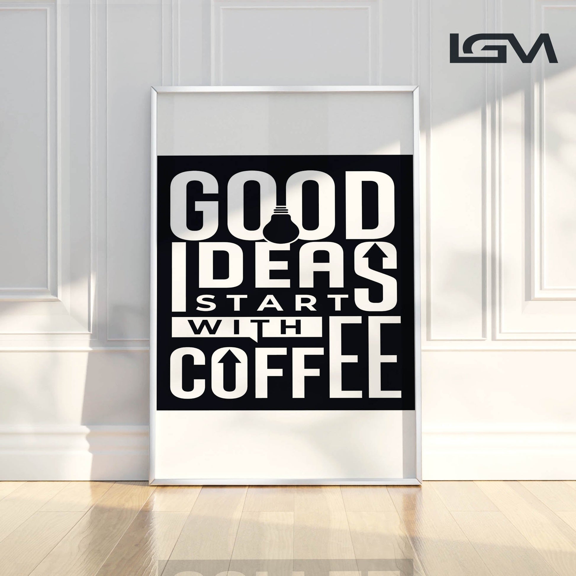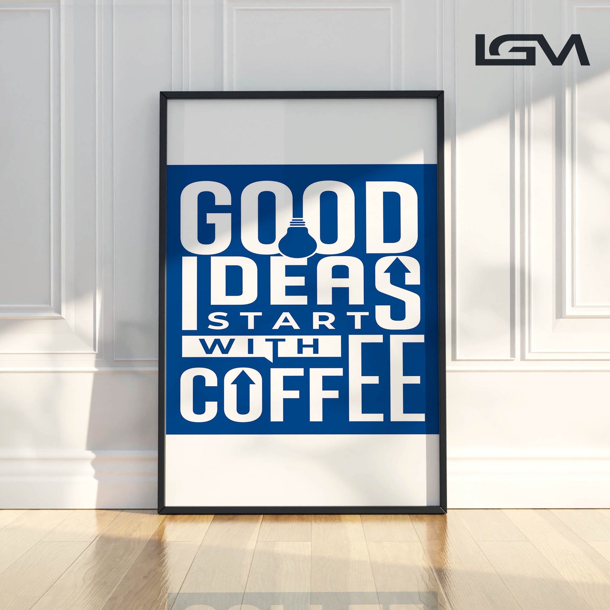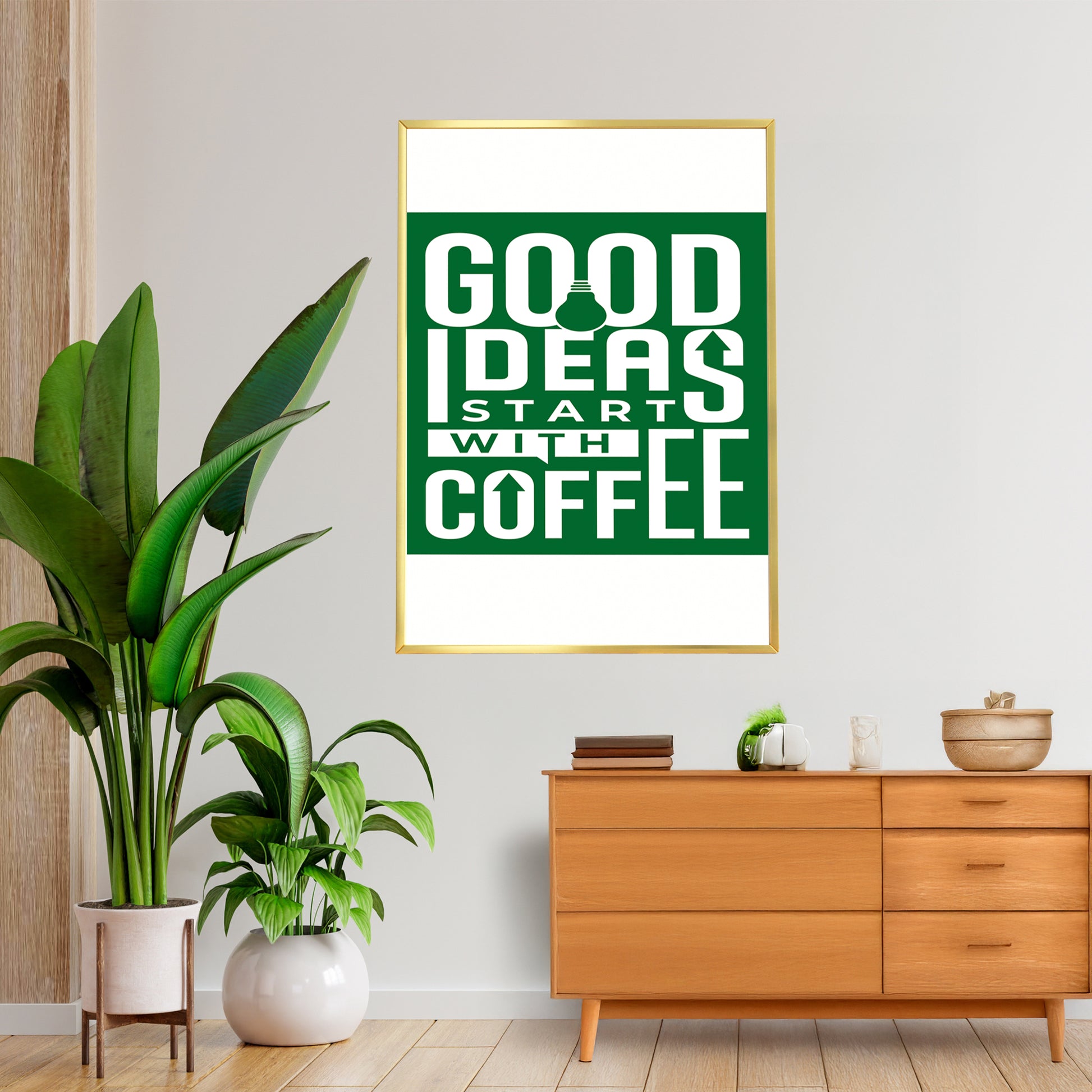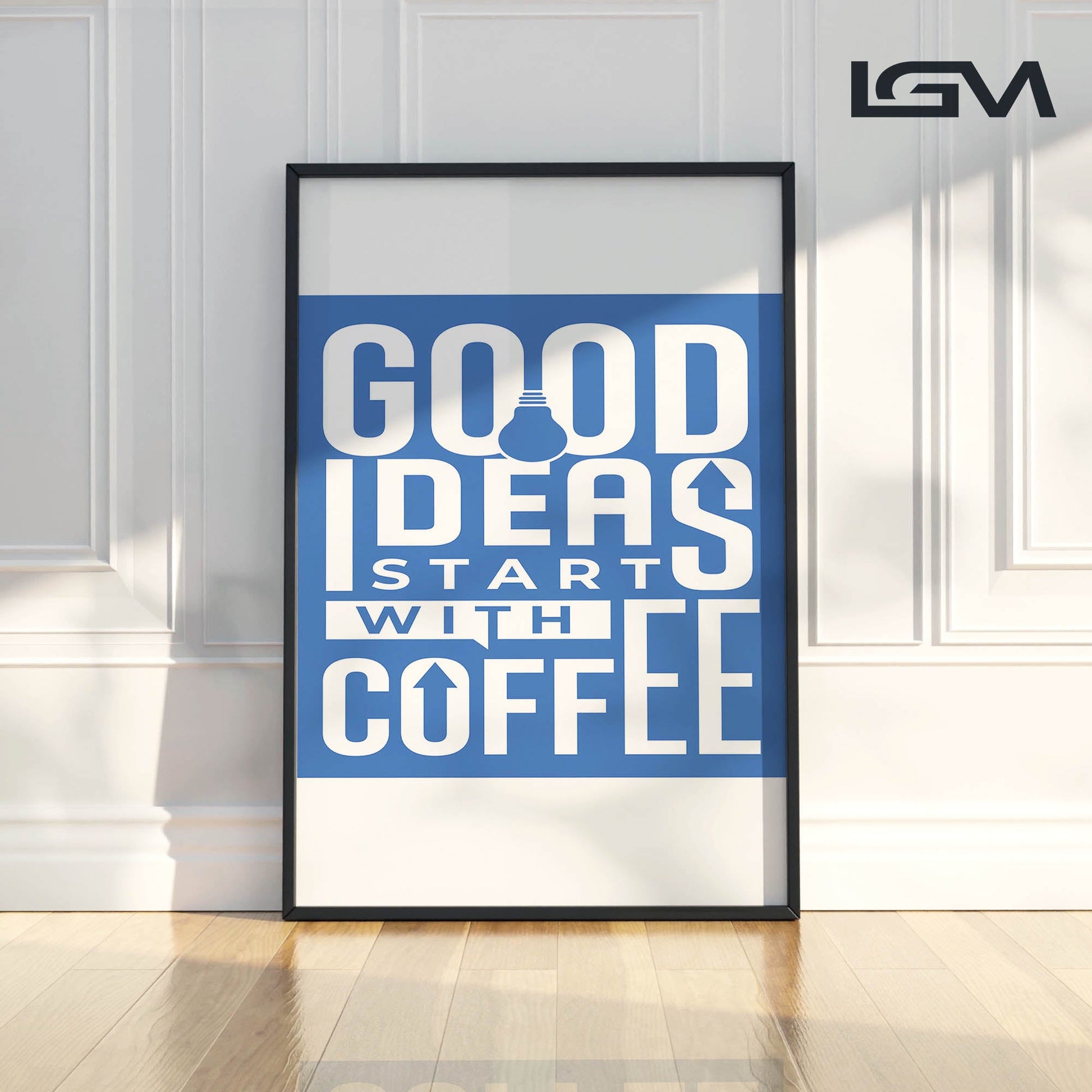 Kickstart your day with inspiration! This modern typography wall art is designed for coffee lovers and creative minds alike. The bold, high-contrast lettering pops against a vibrant background, delivering a daily reminder that great ideas often begin with a strong cup of coffee.