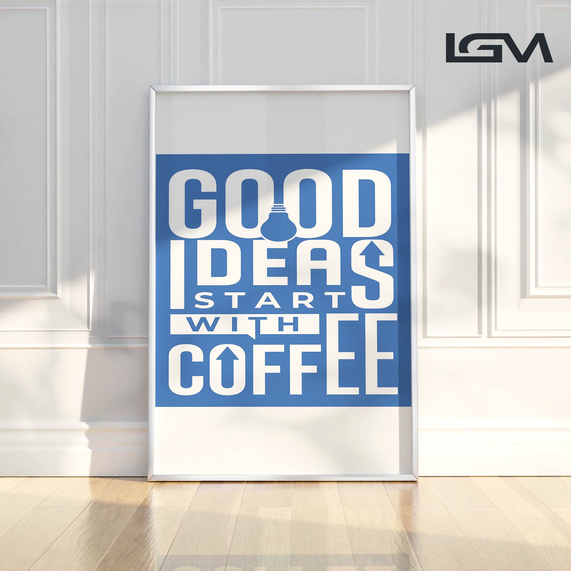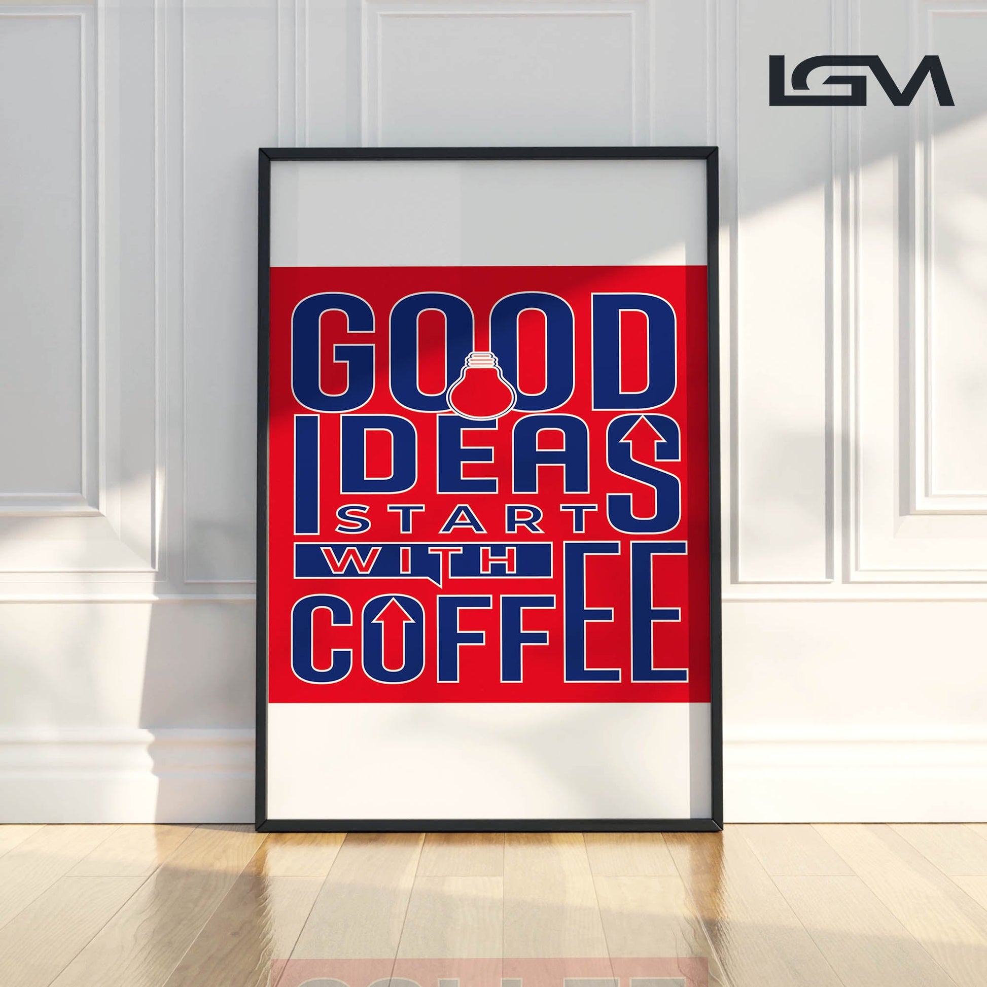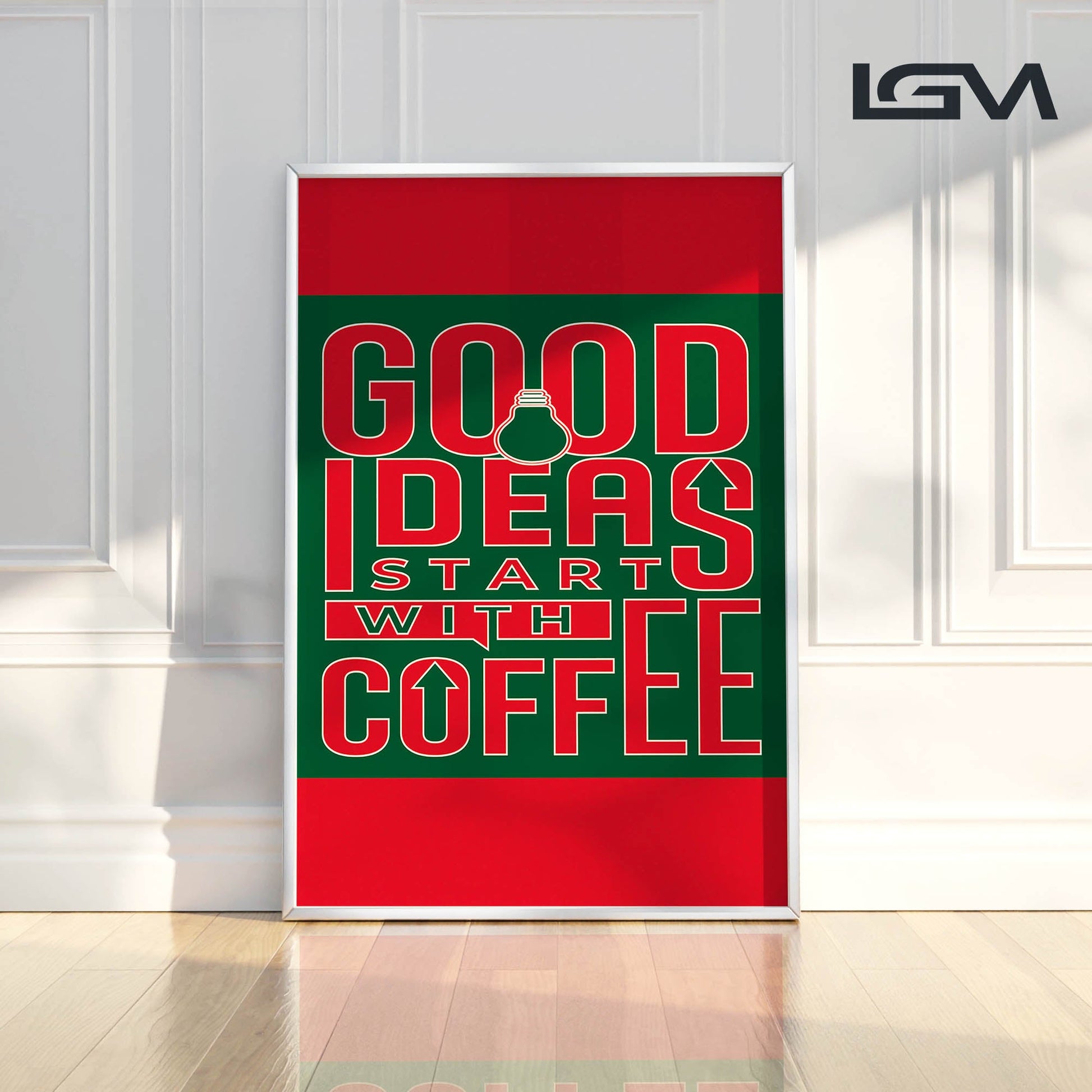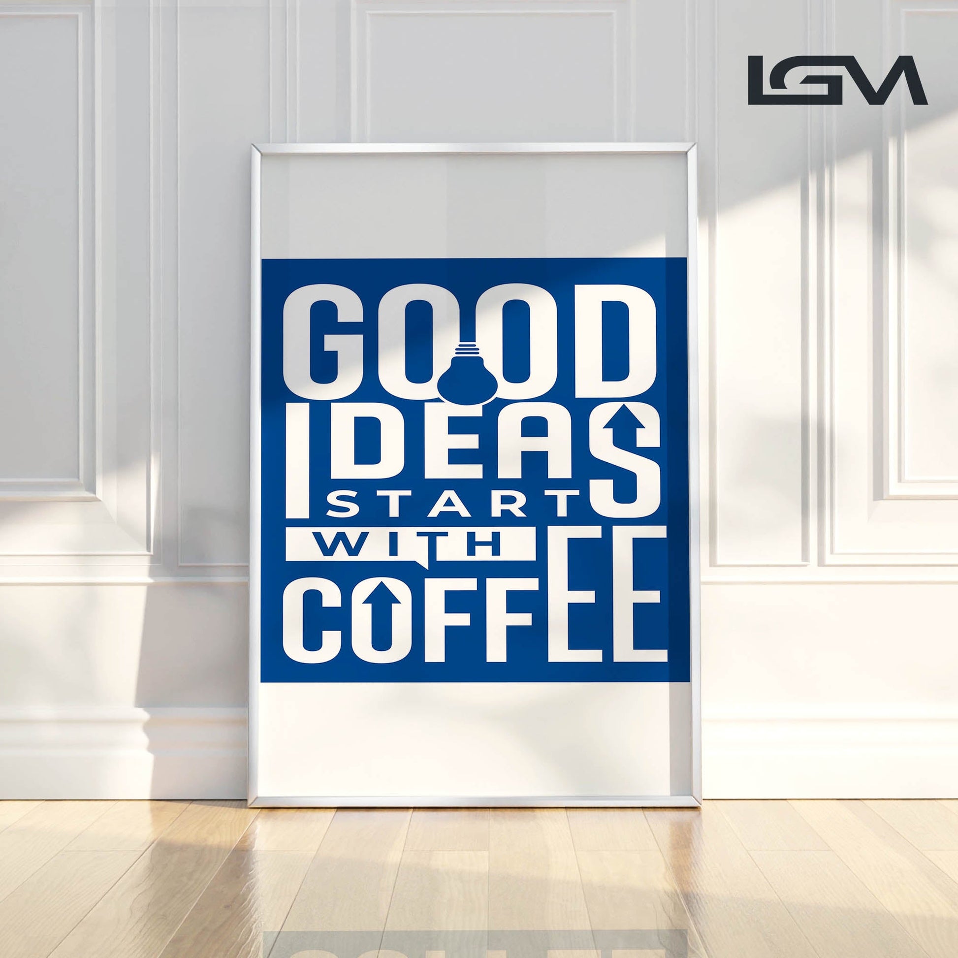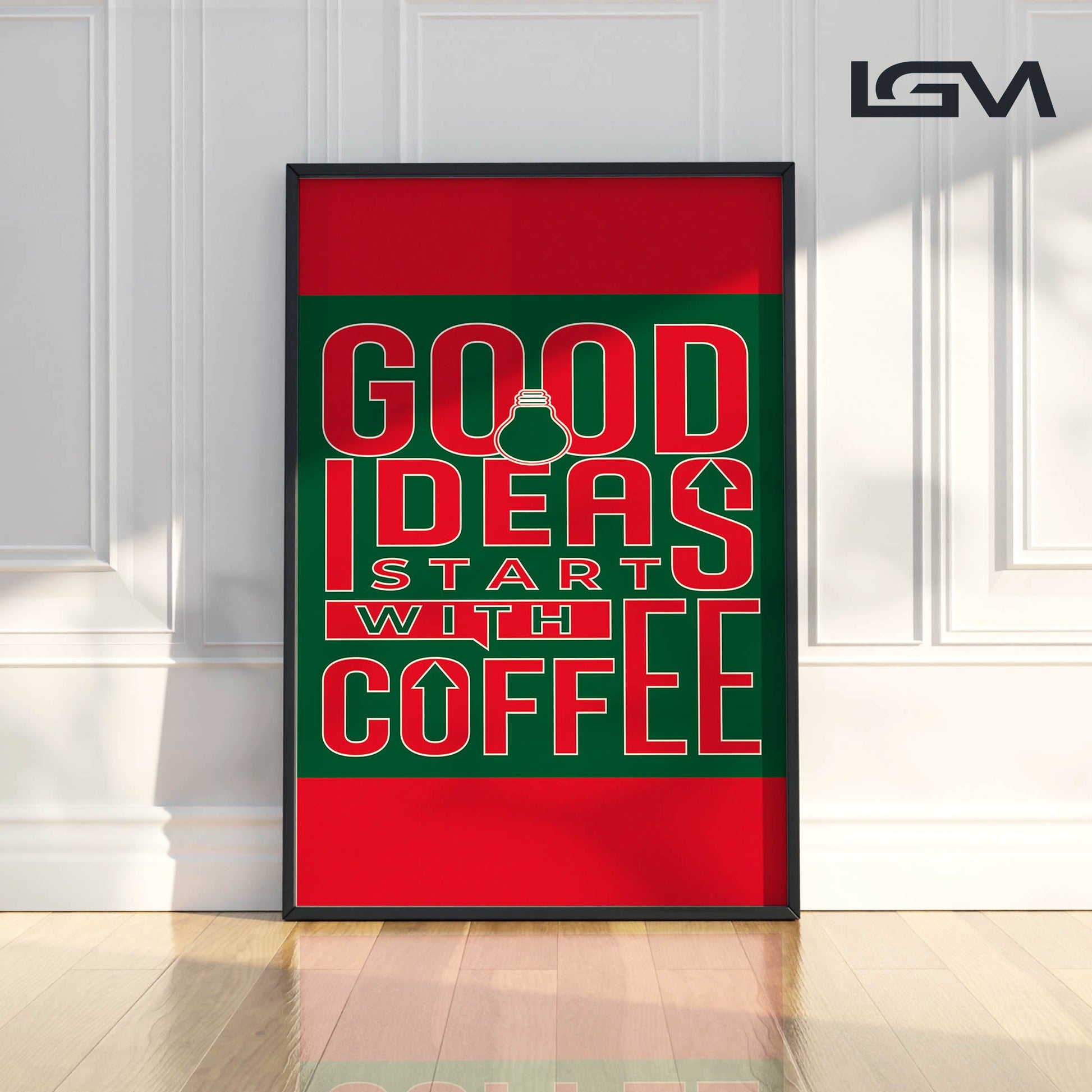 Kickstart your day with inspiration! This modern typography wall art is designed for coffee lovers and creative minds alike. The bold, high-contrast lettering pops against a vibrant background, delivering a daily reminder that great ideas often begin with a strong cup of coffee.