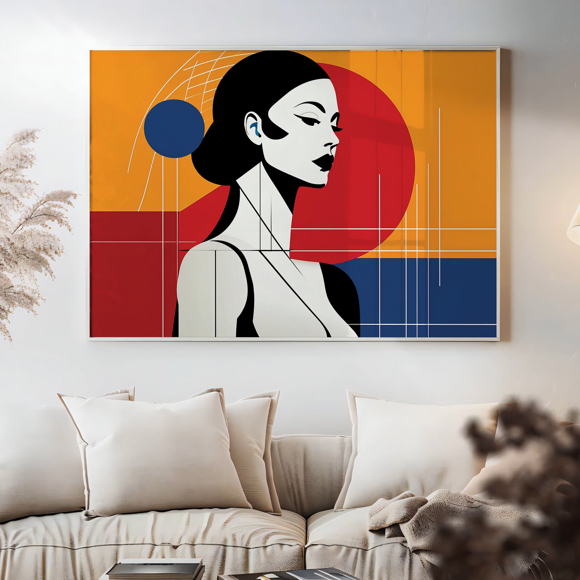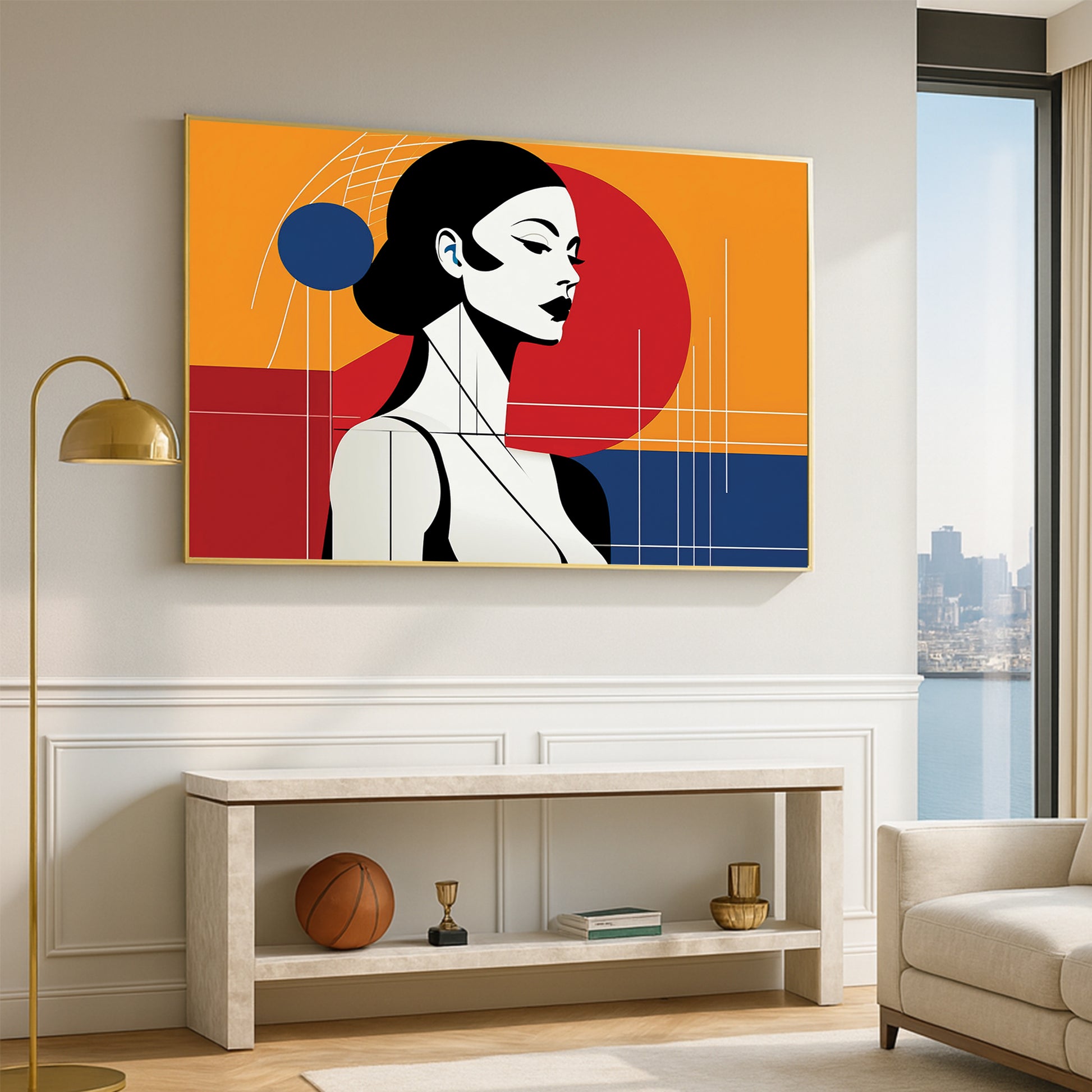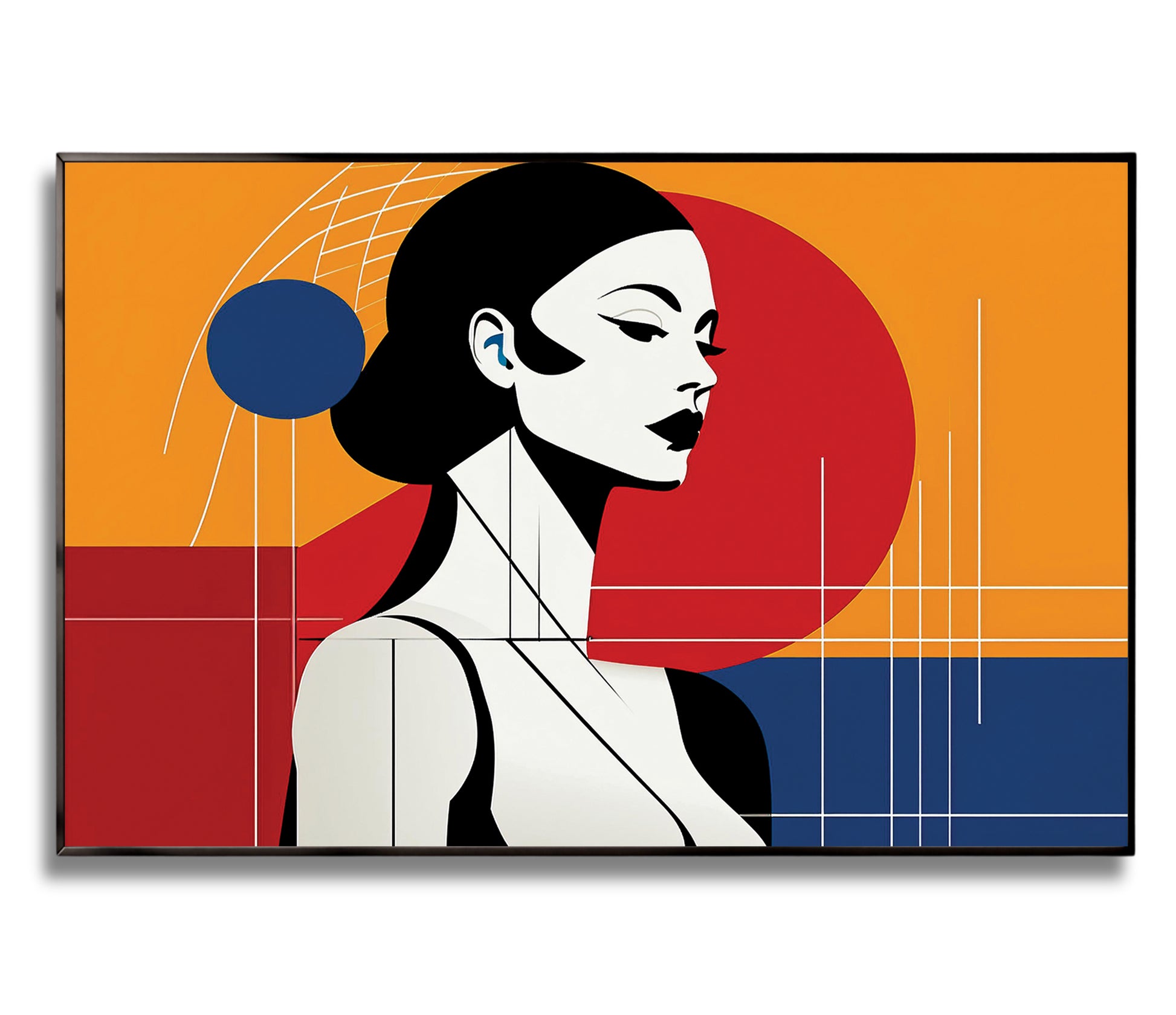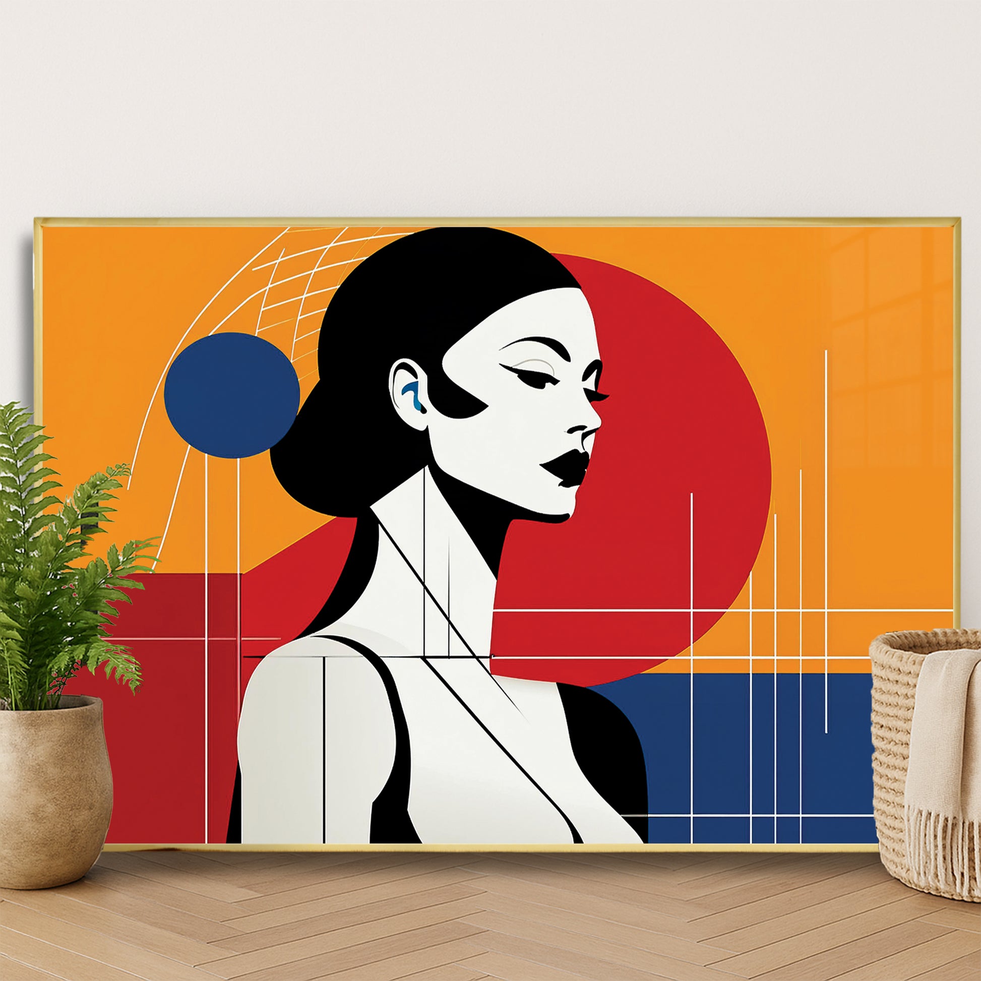 🖼️ A celebration of fluid elegance and structured energy, this abstract piece showcases a woman in movement, framed by a dynamic grid shapes and color. Her minimalist form and graceful posture channel poise, while the balanced layout invites harmony and curiosity into your space.