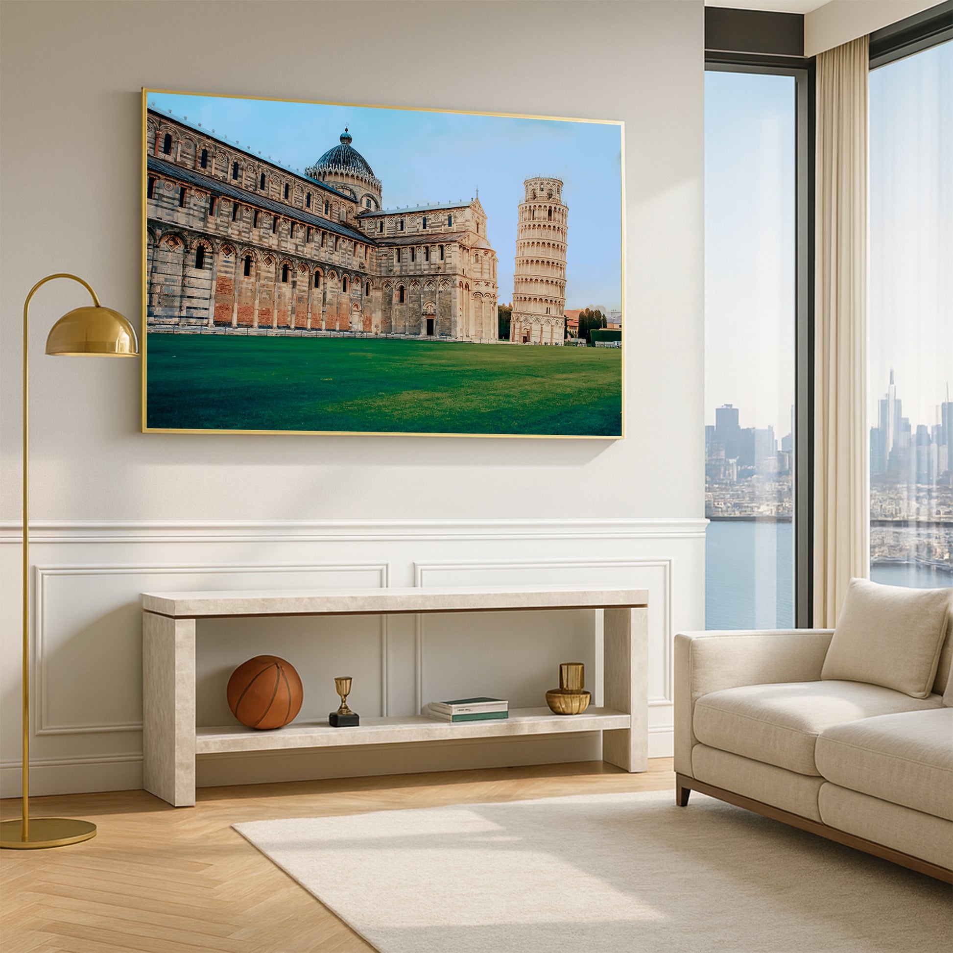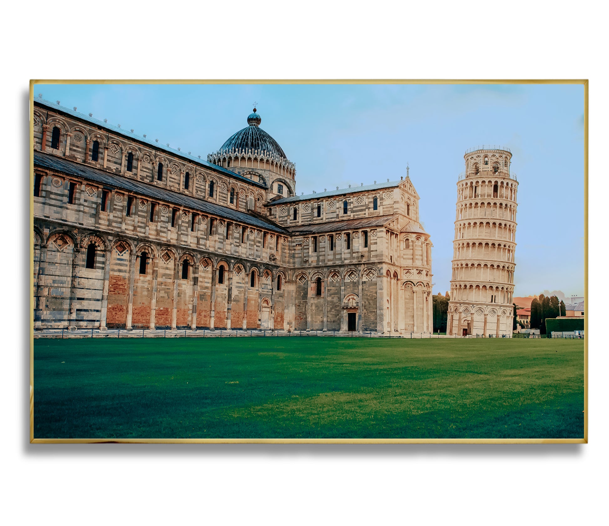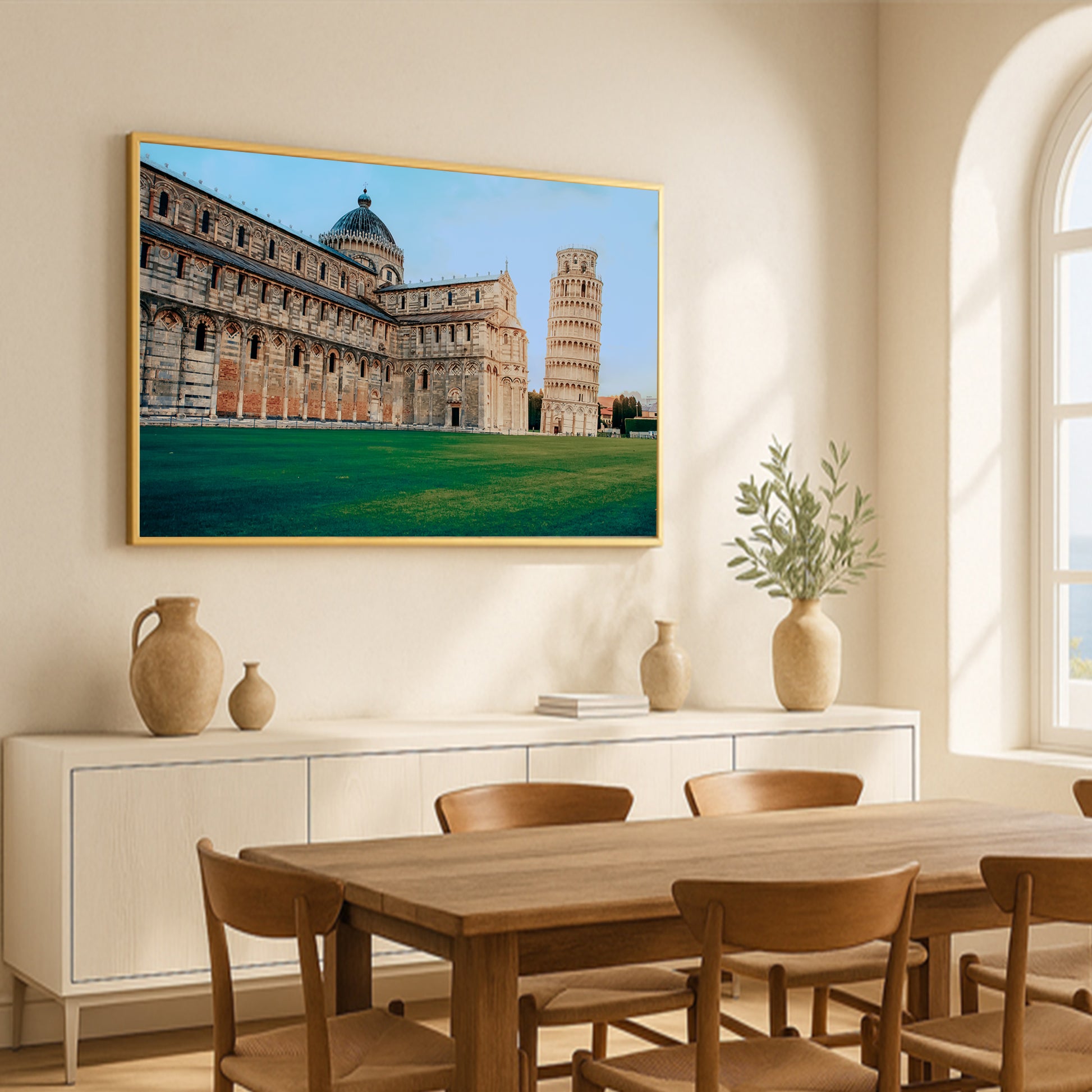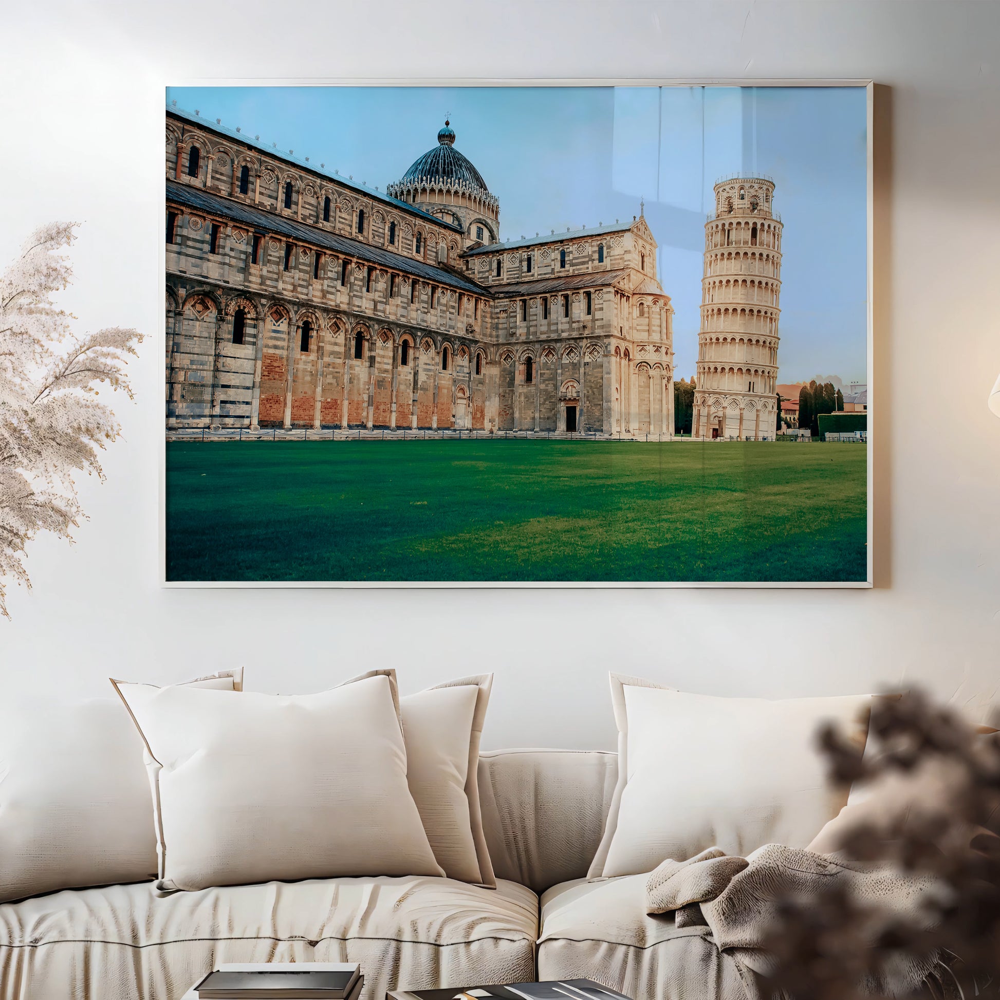 Capture the charm and architectural wonder of Italy with this striking wall art featuring the Leaning Tower of Pisa. Set against a serene blue sky, the iconic tilt of this historic bell tower is perfectly contrasted by the grandeur of the Pisa Cathedral beside it. A symbol of resilience, beauty, and curious engineering, this piece brings a touch of Europe’s timeless elegance into your space.