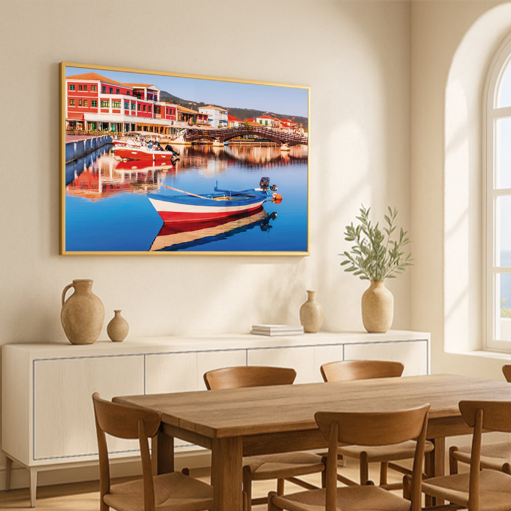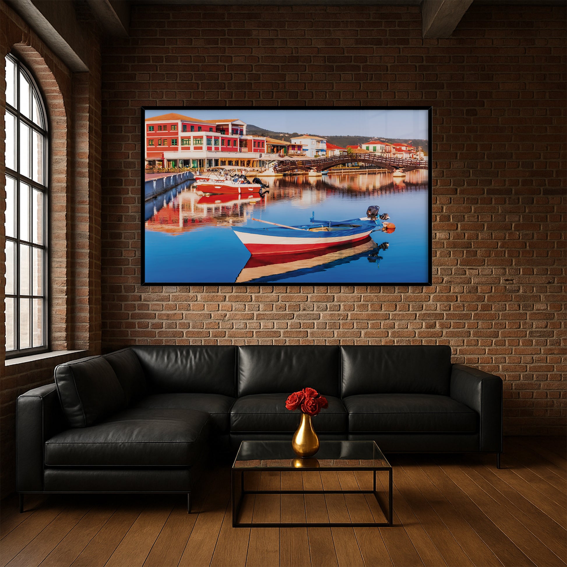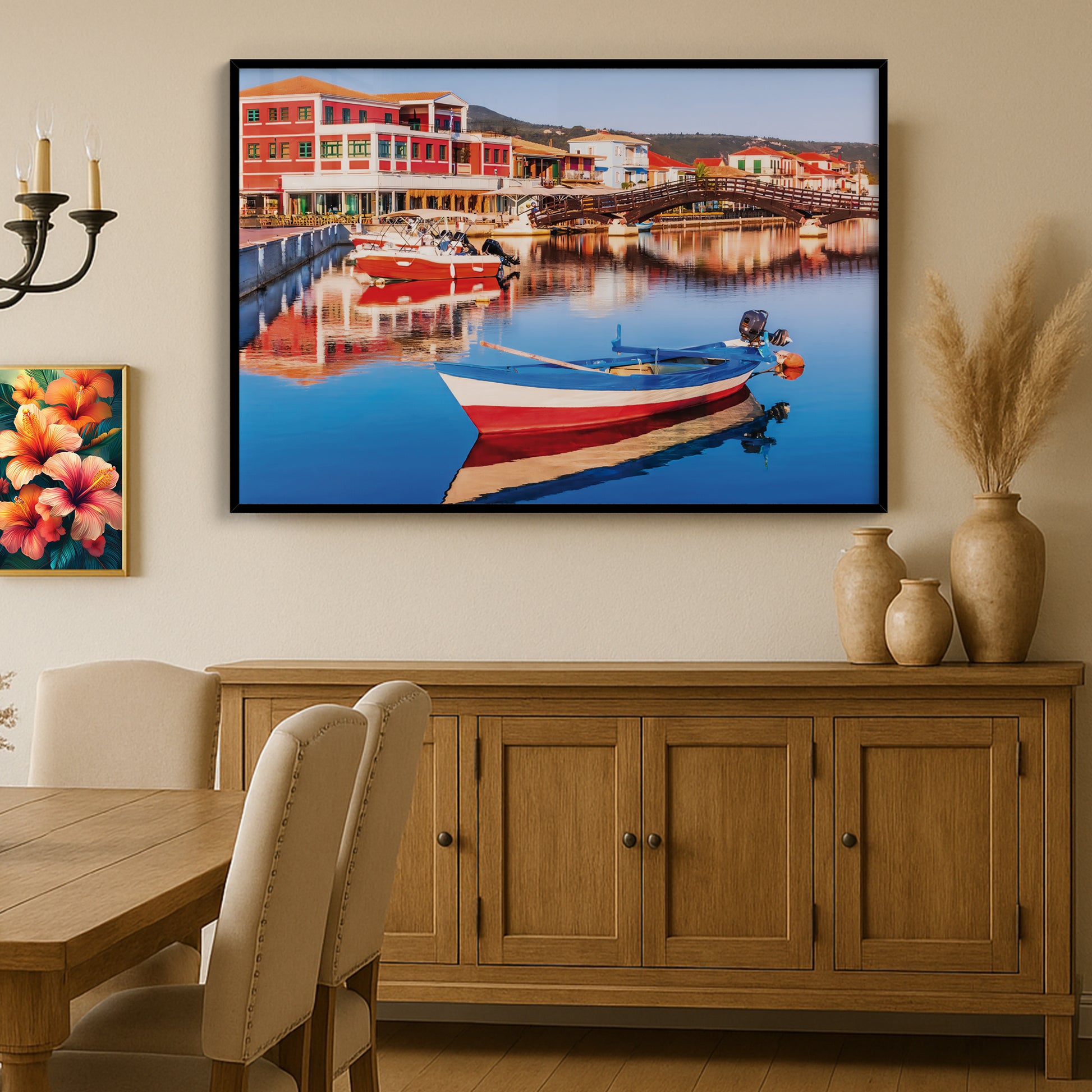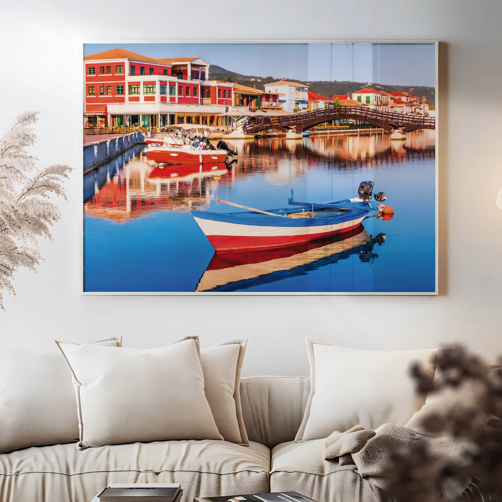Celebrate the vivid life of Lefkada, Greece, with this wall art capturing traditional fishing boats gently floating beside vibrant waterfront buildings and a charming wooden bridge. A perfect harmony of architecture, water, and culture.