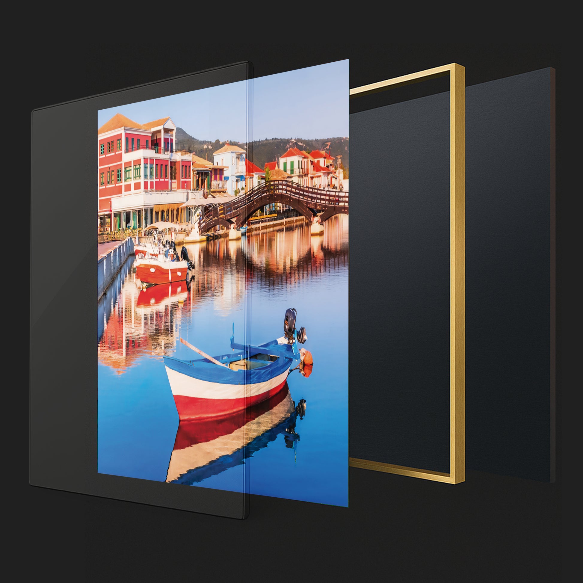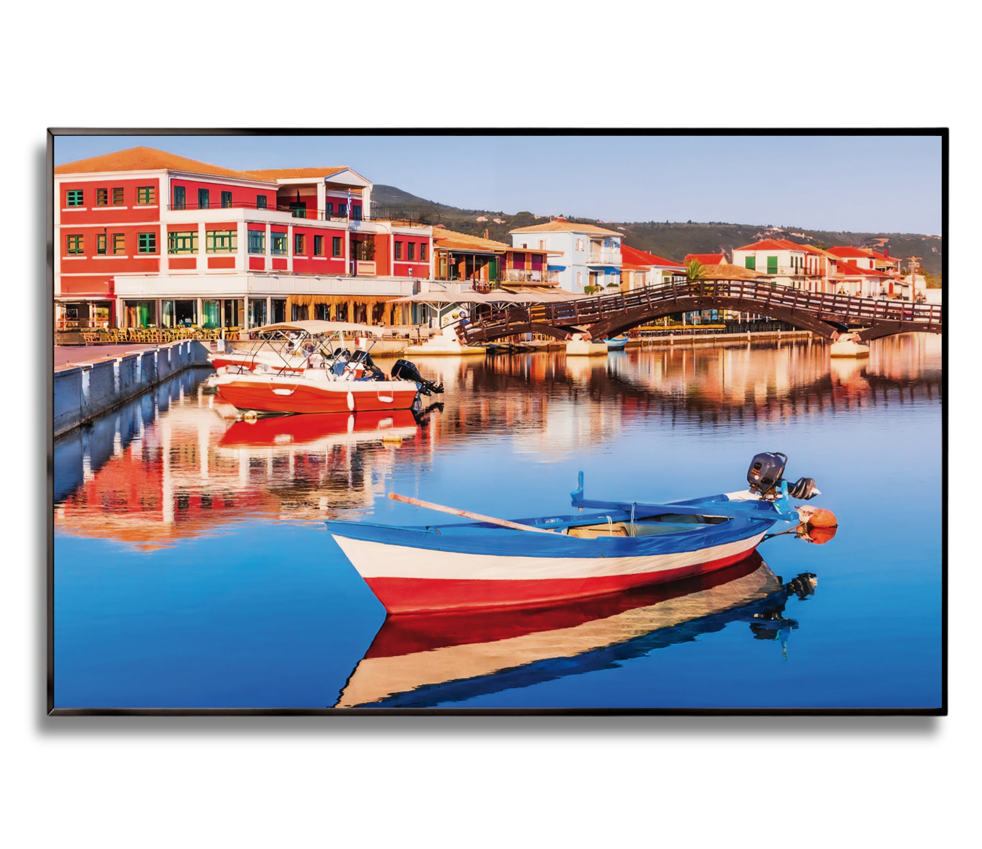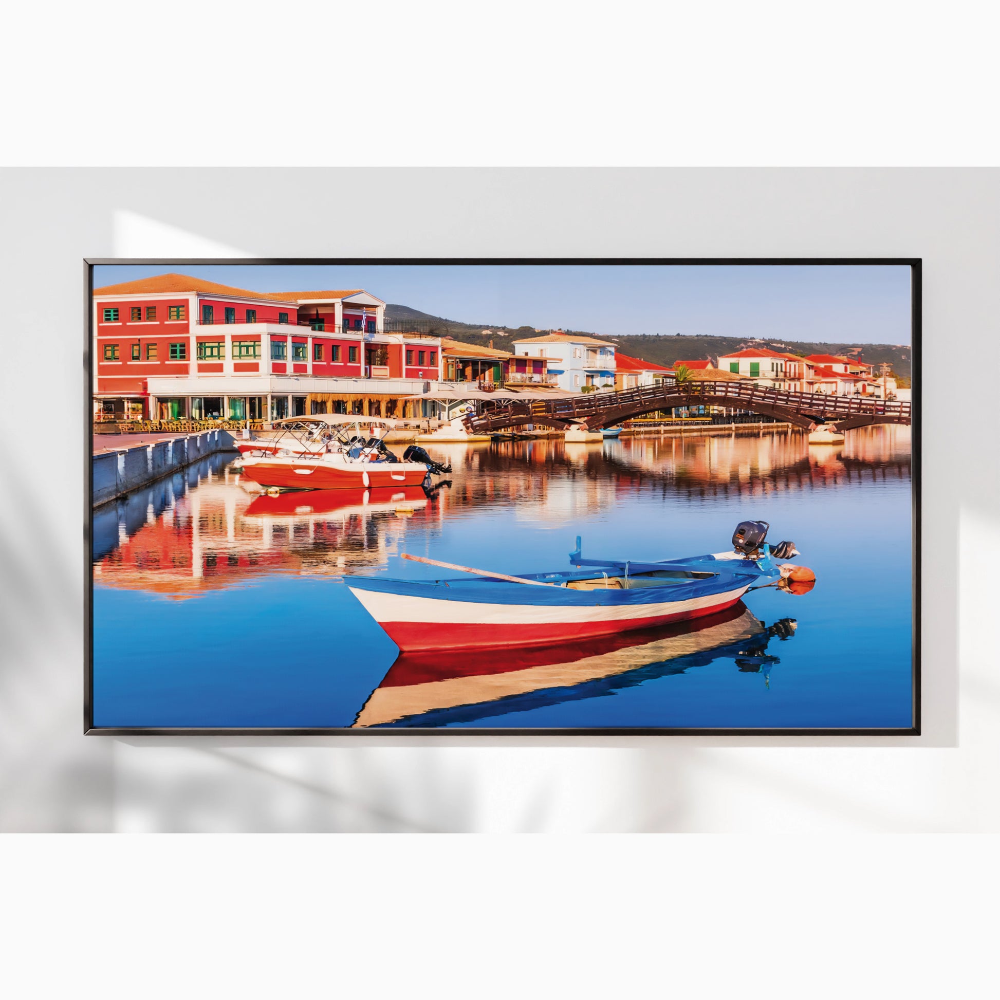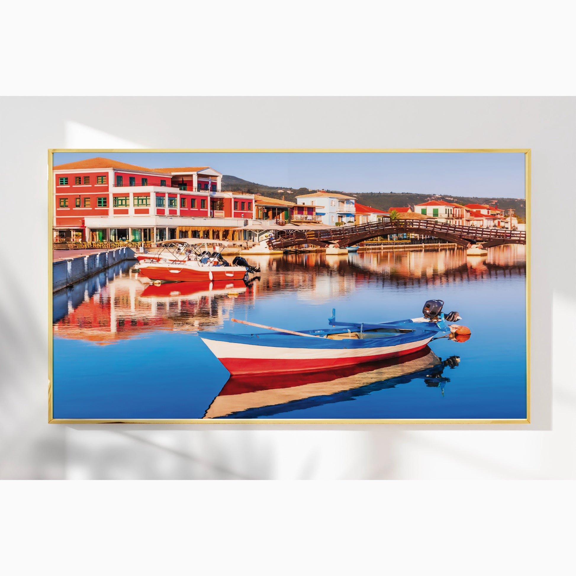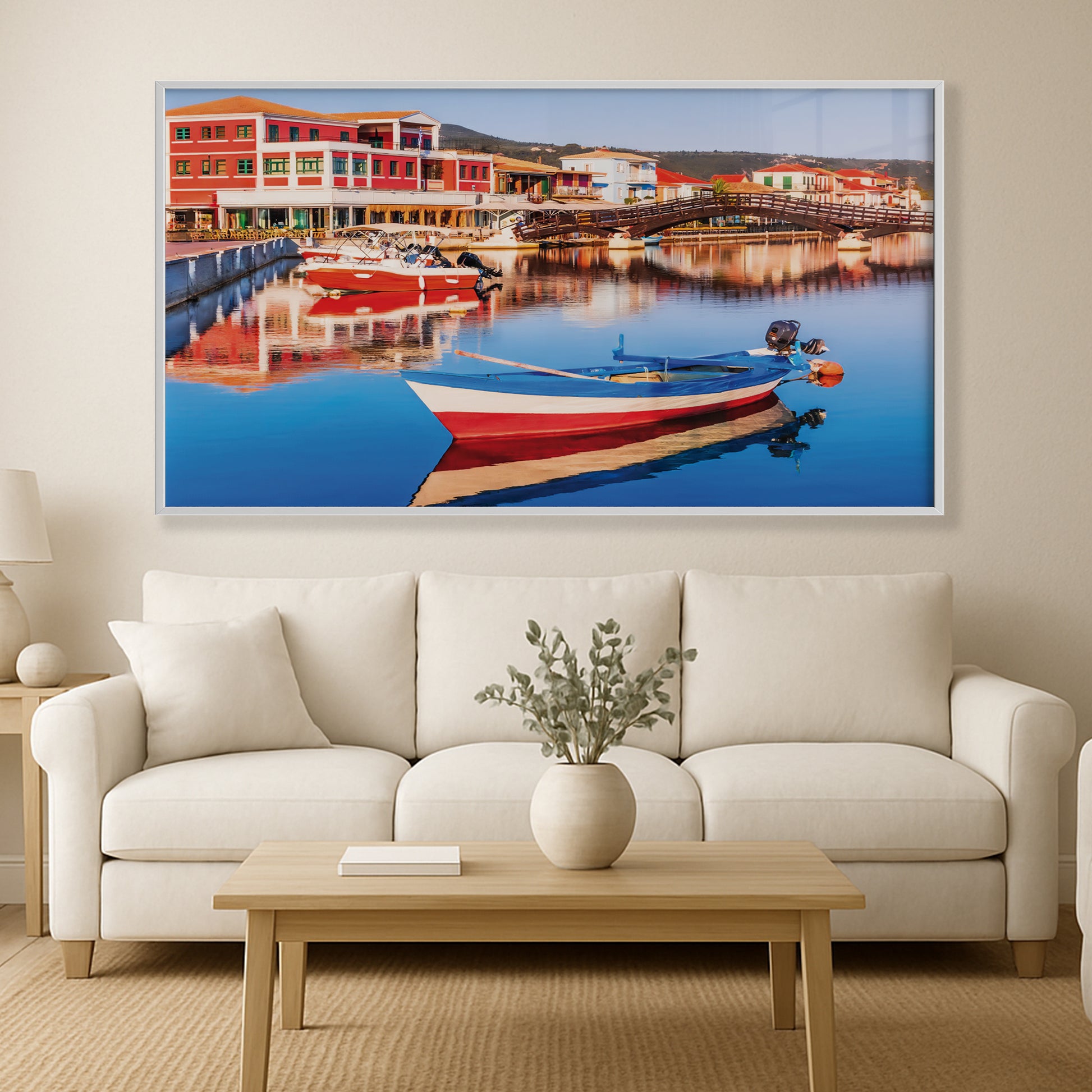 Celebrate the vivid life of Lefkada, Greece, with this wall art capturing traditional fishing boats gently floating beside vibrant waterfront buildings and a charming wooden bridge. A perfect harmony of architecture, water, and culture.