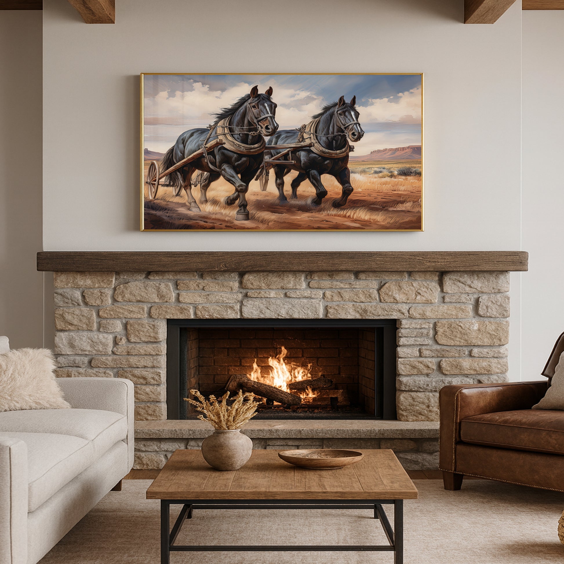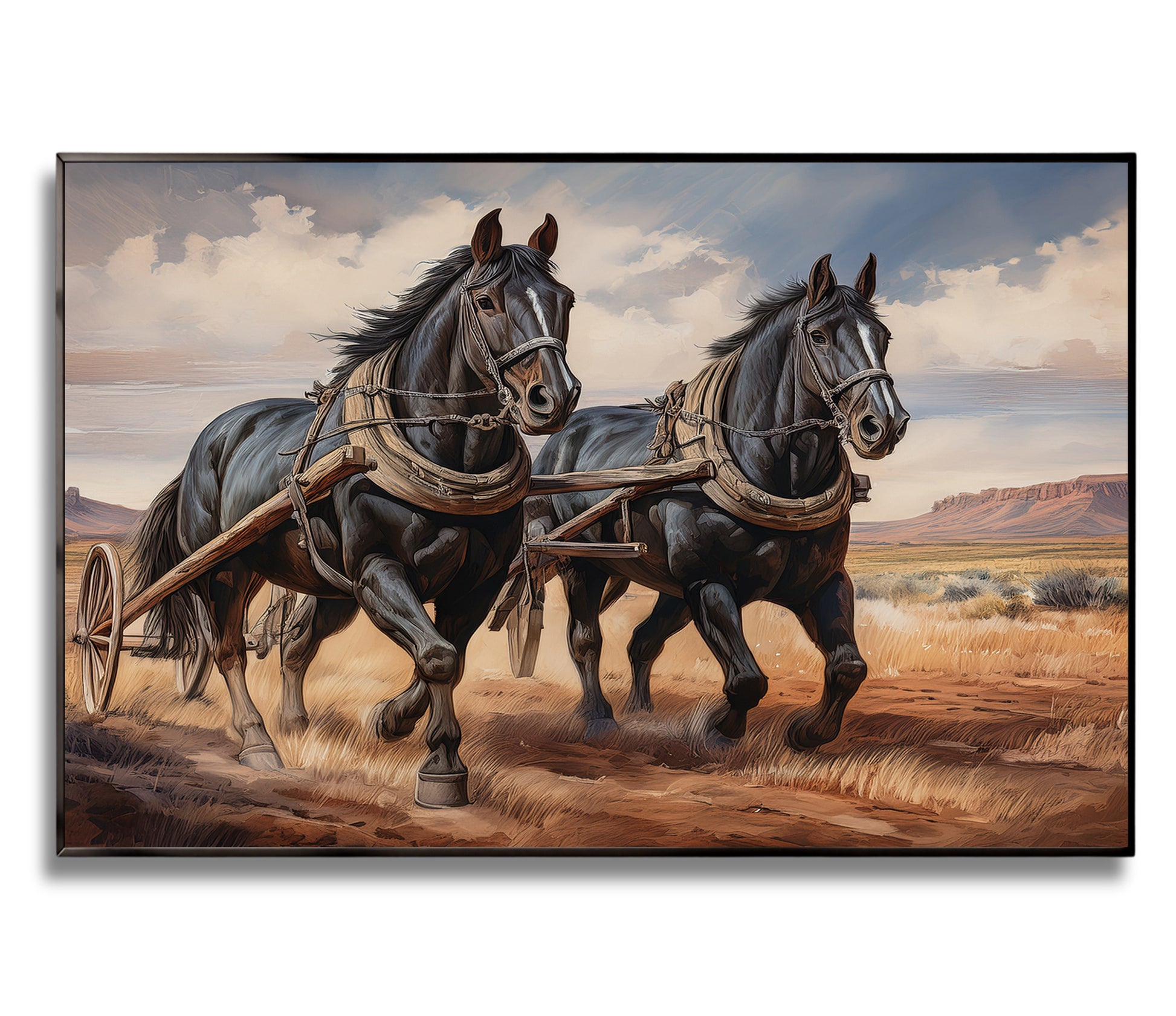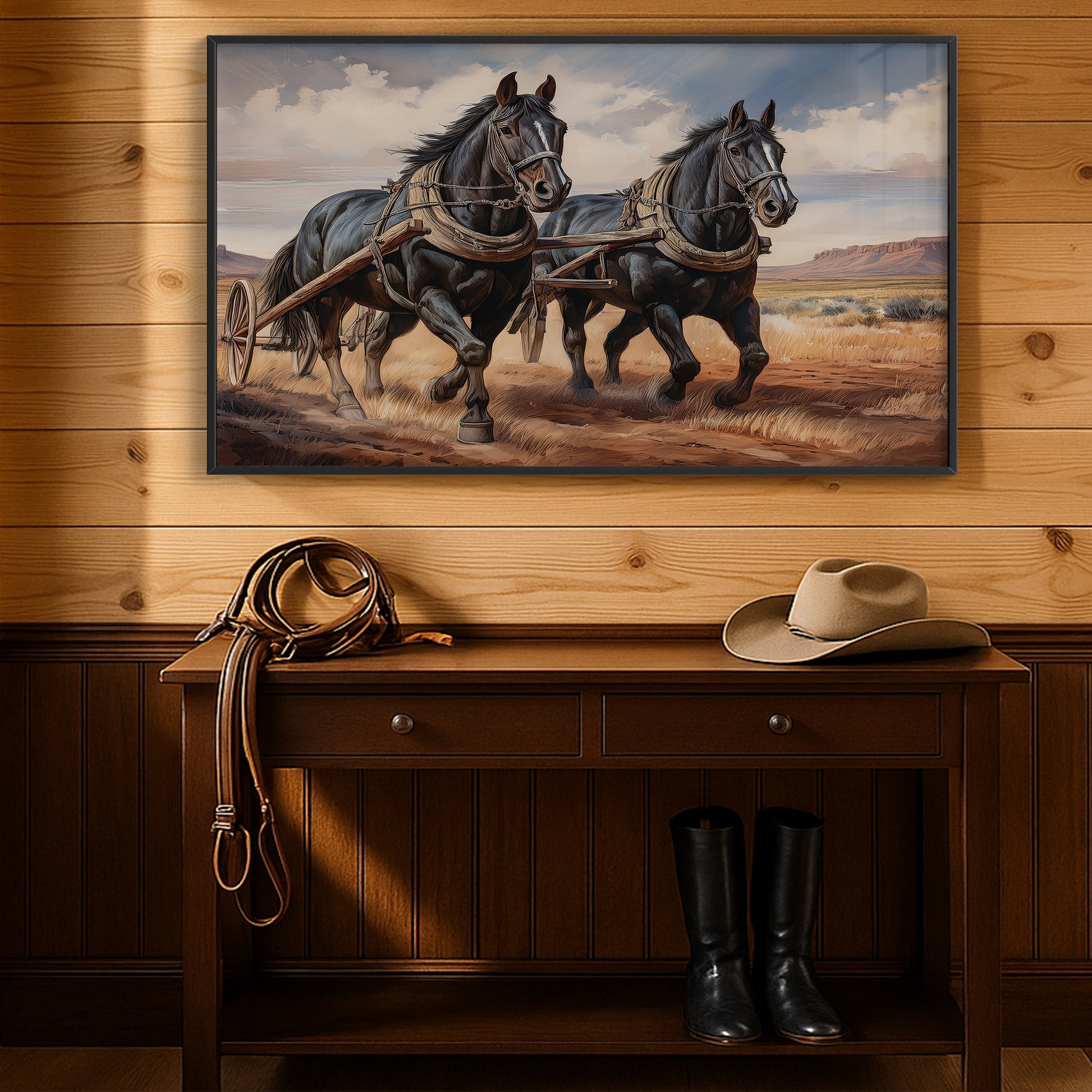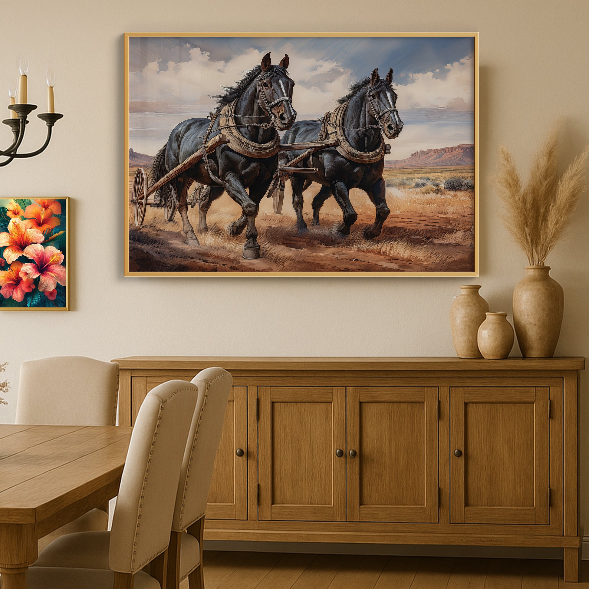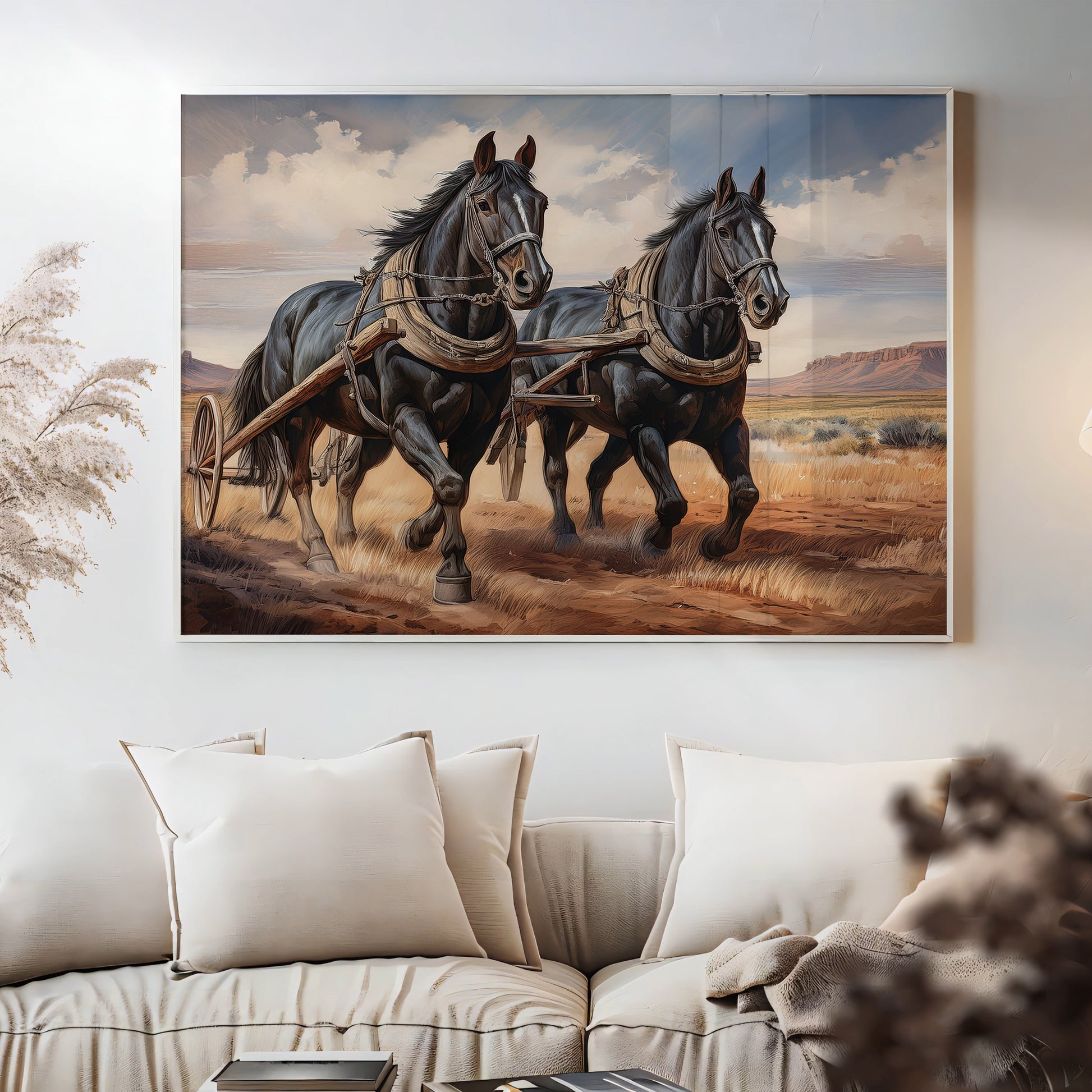 Celebrate tradition and grit with this vintage-style painting of two powerful Percheron draft horses charging across the rugged plains. Their synchronized strength, detailed harnessing, and windswept manes capture the raw beauty of a working heritage. The warm desert tones and hand-painted feel make this a bold statement piece for rustic or Western-inspired spaces.