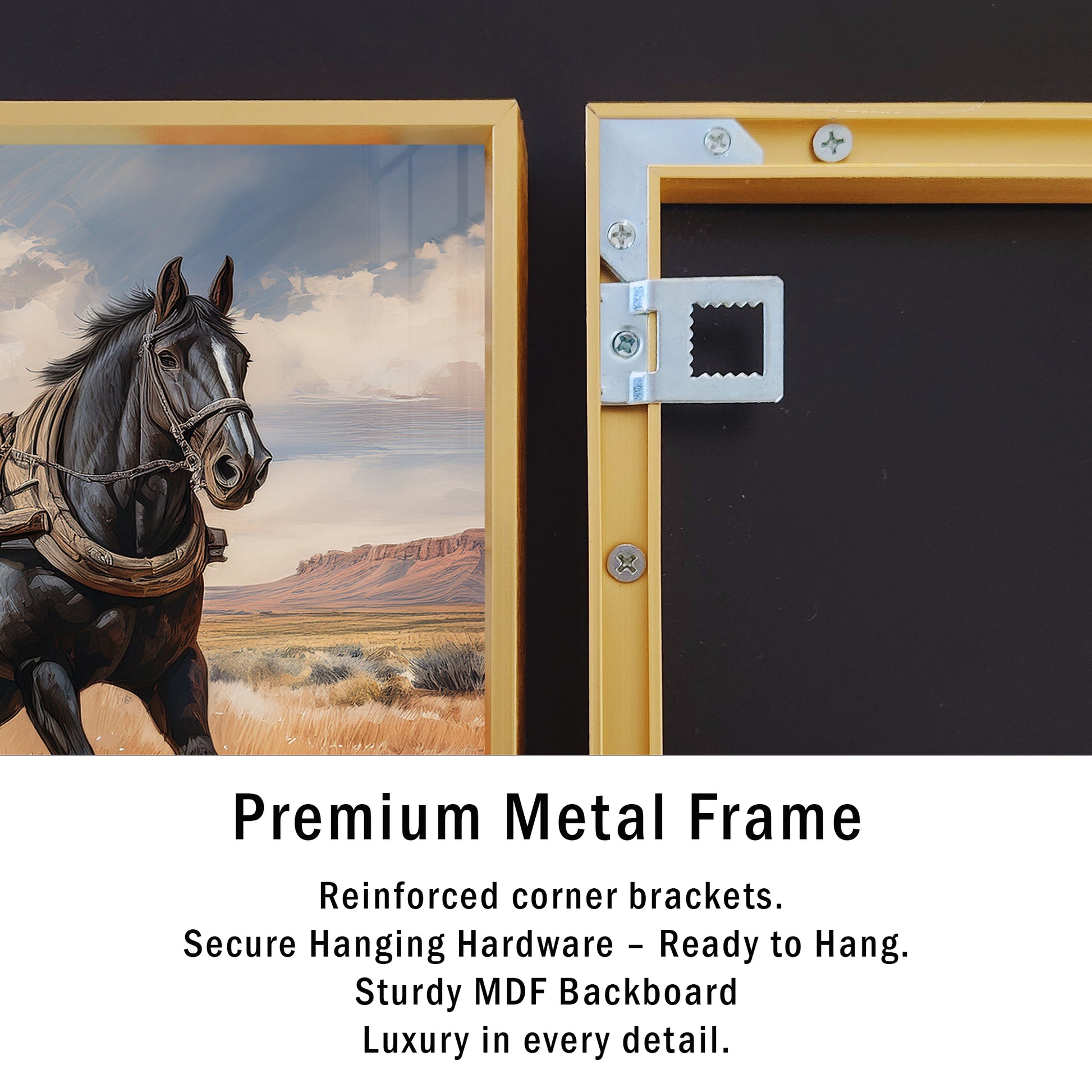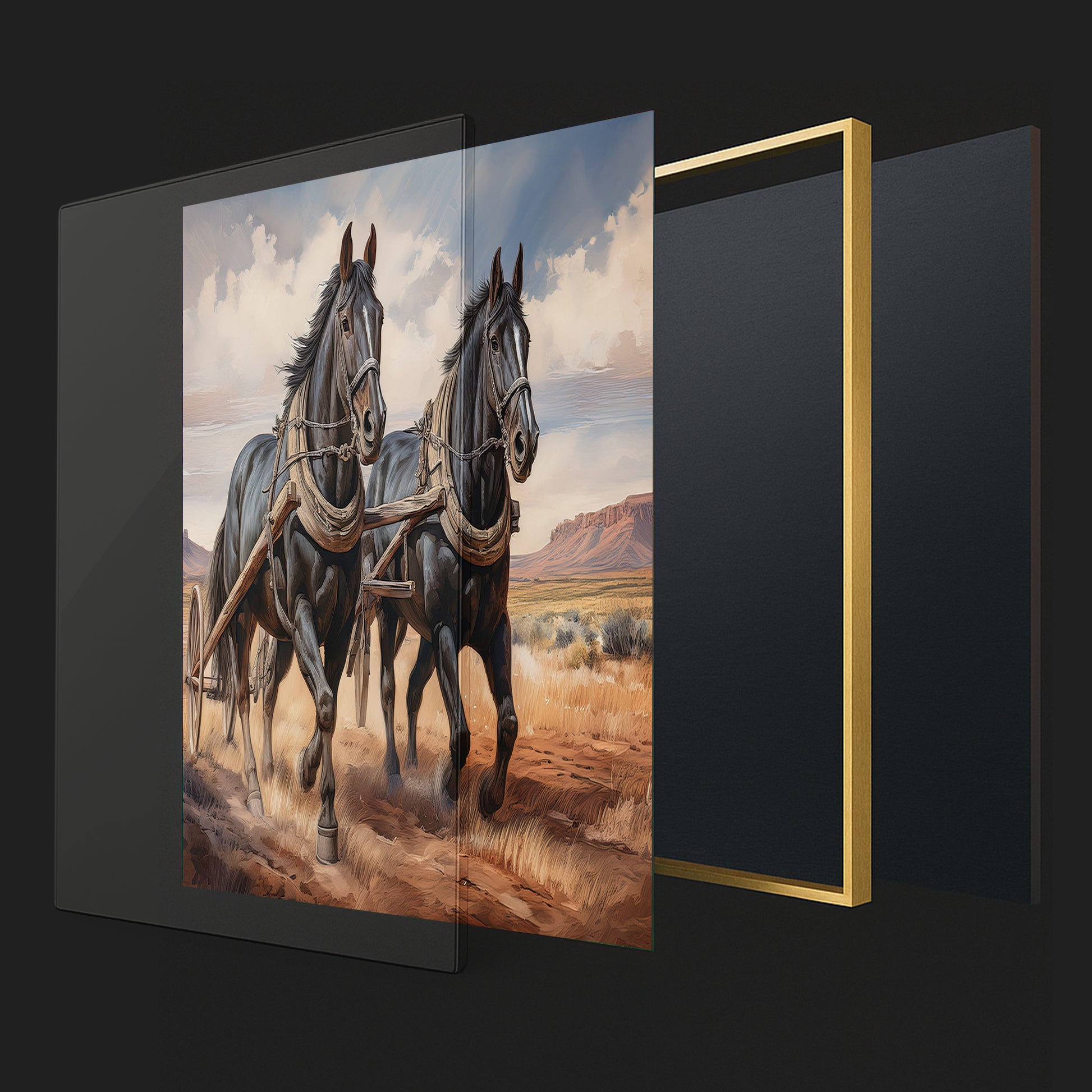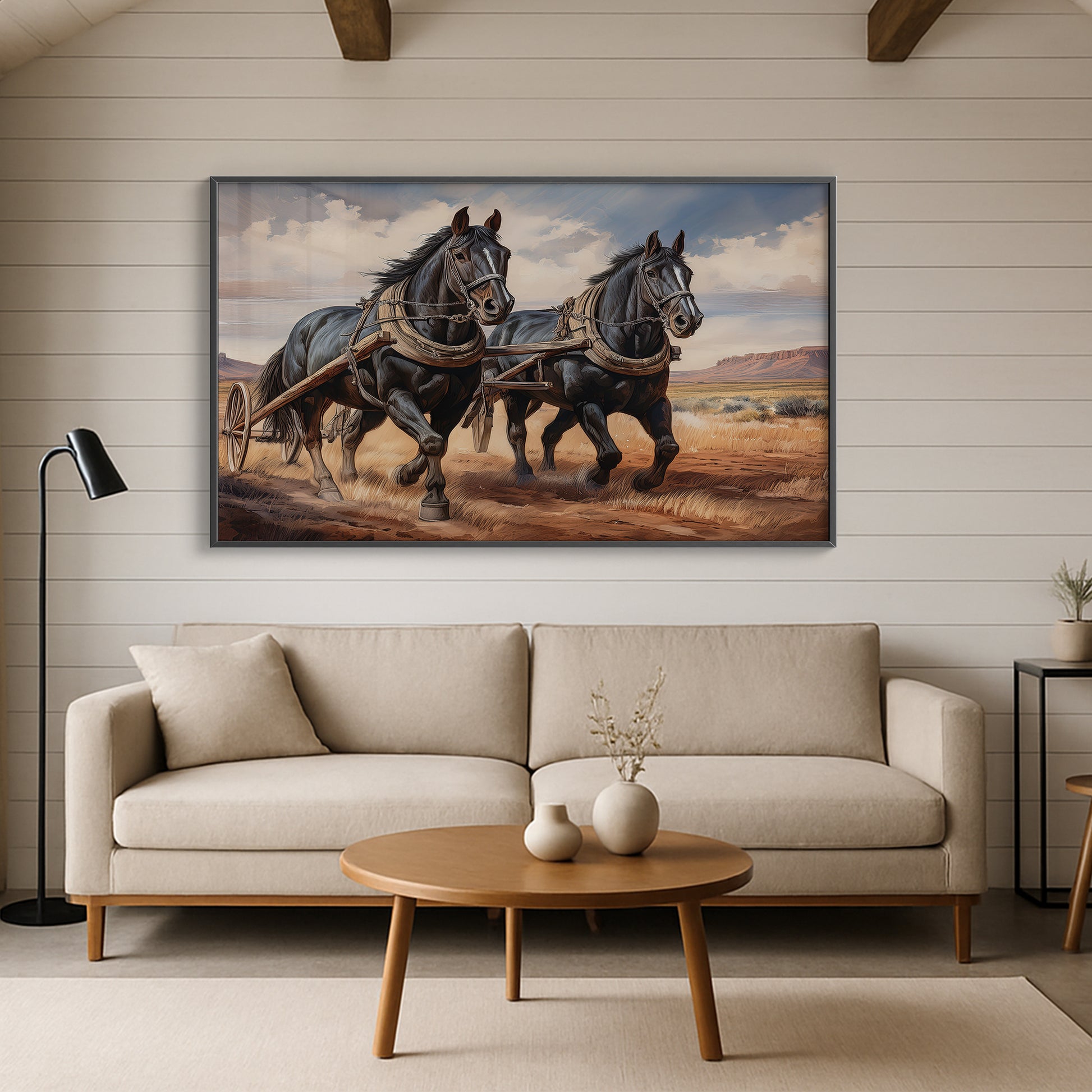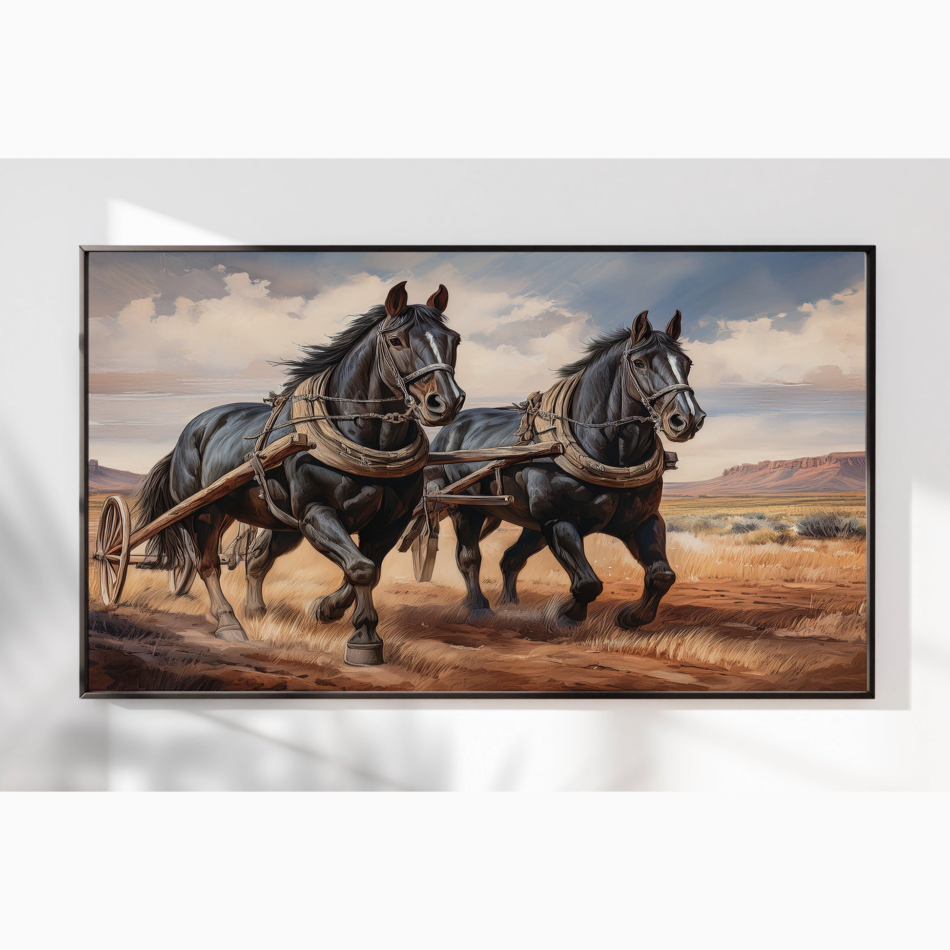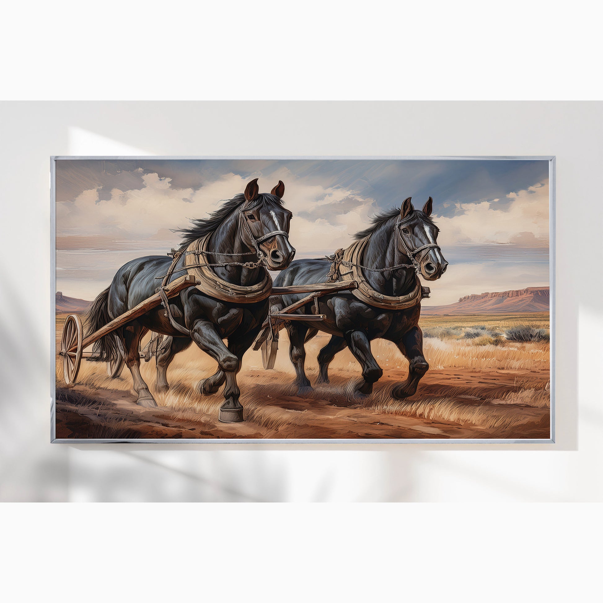Celebrate tradition and grit with this vintage-style painting of two powerful Percheron draft horses charging across the rugged plains. Their synchronized strength, detailed harnessing, and windswept manes capture the raw beauty of a working heritage. The warm desert tones and hand-painted feel make this a bold statement piece for rustic or Western-inspired spaces.