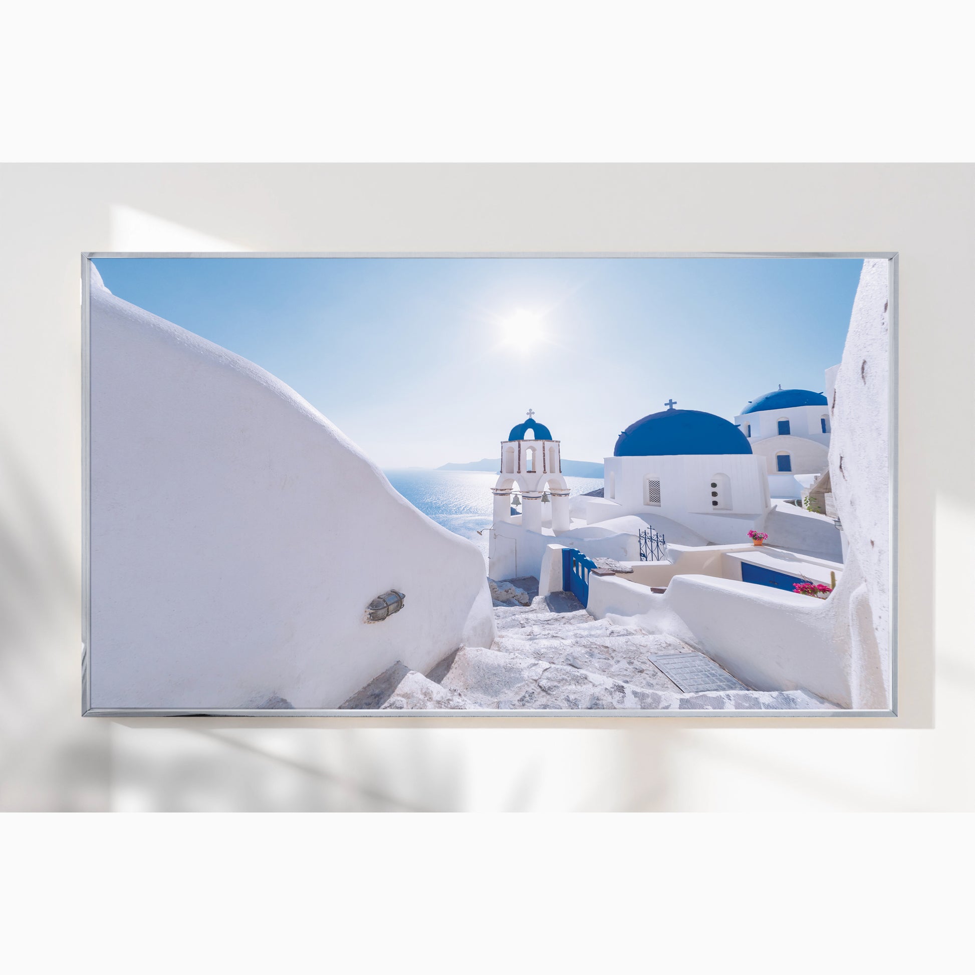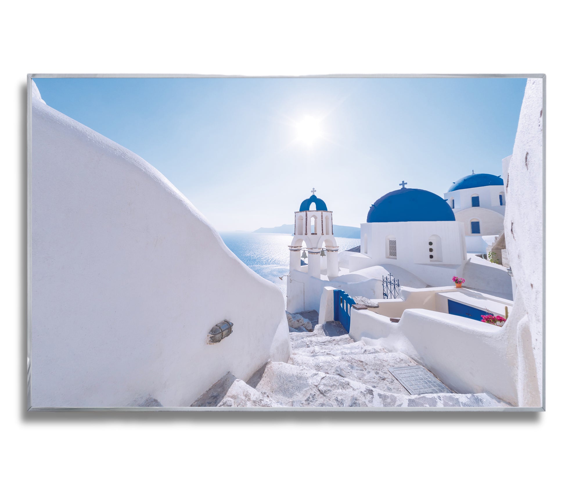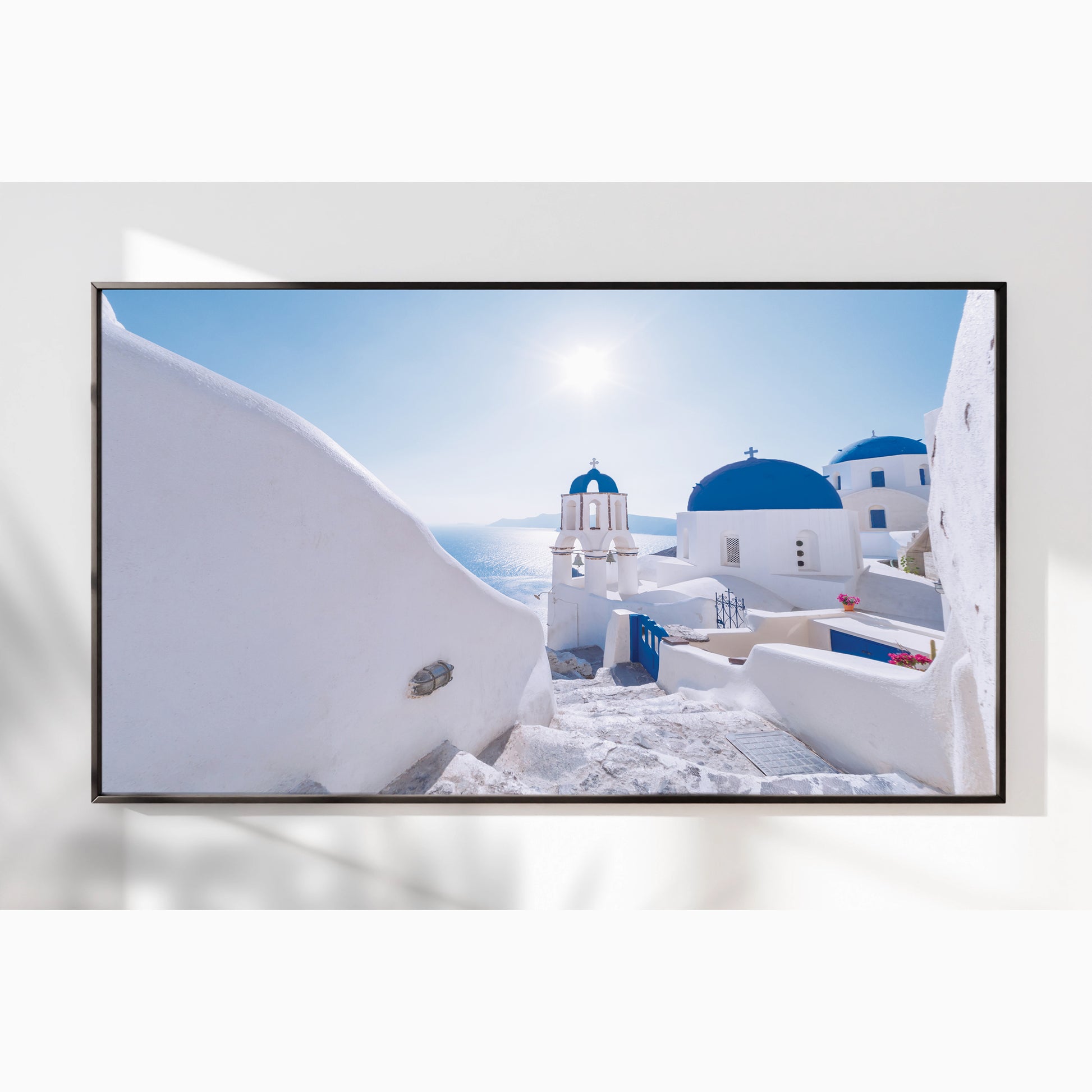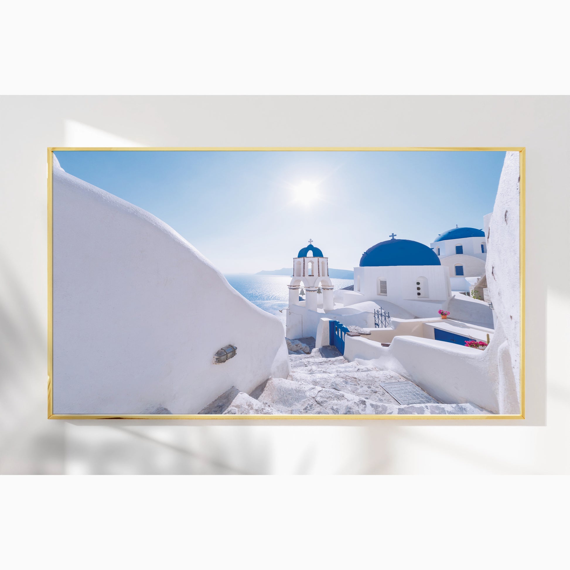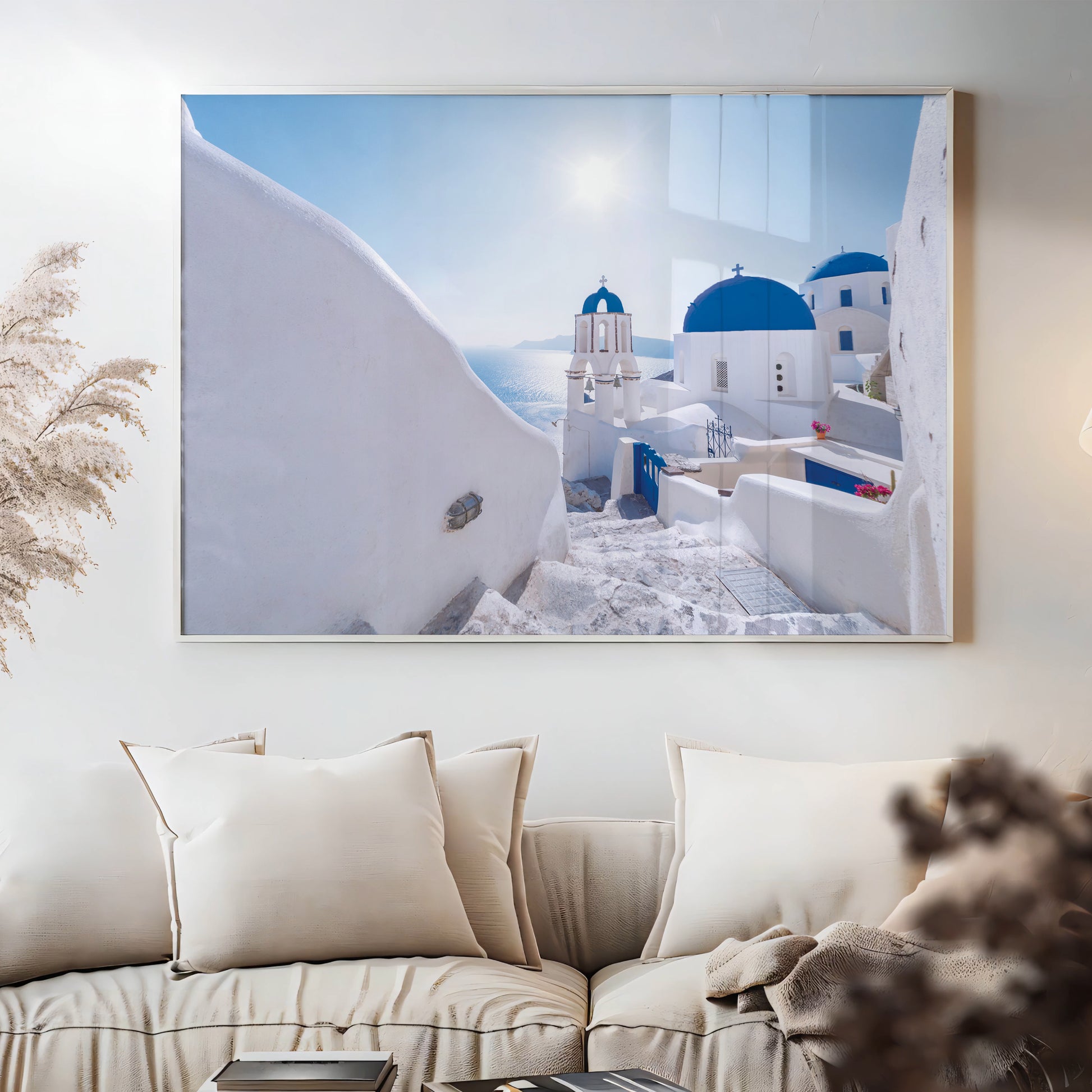 This breathtaking image captures the bell towers and domes of Oia, Santorini glowing under the morning sun. With its clean lines, whitewashed curves, and calm sea, it radiates peace and elegance.