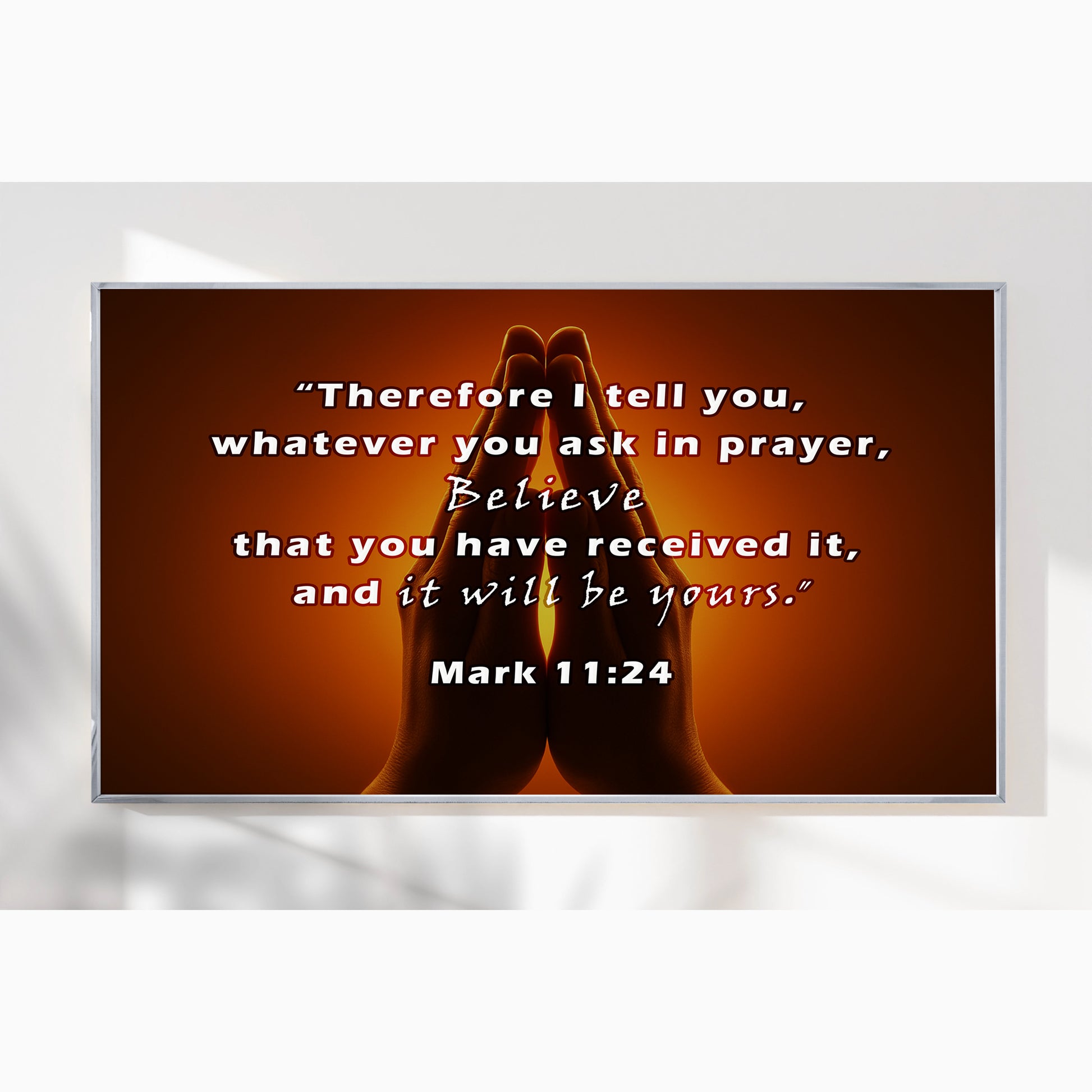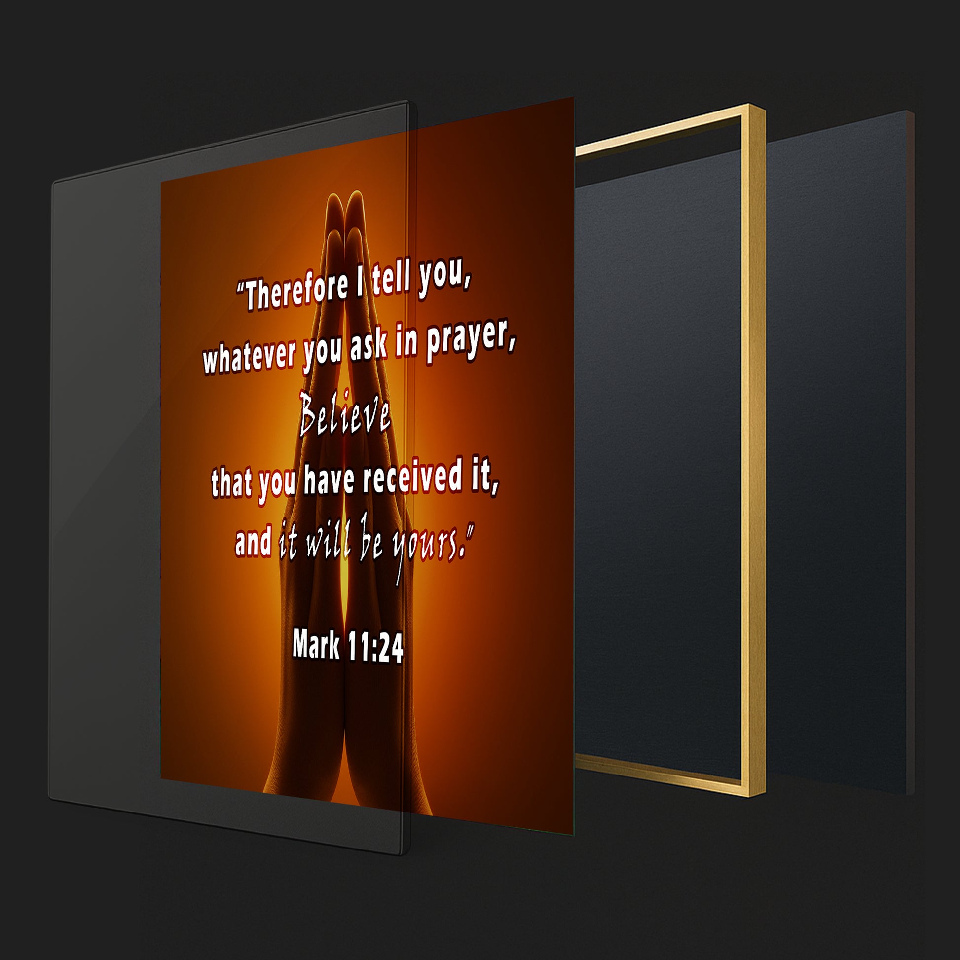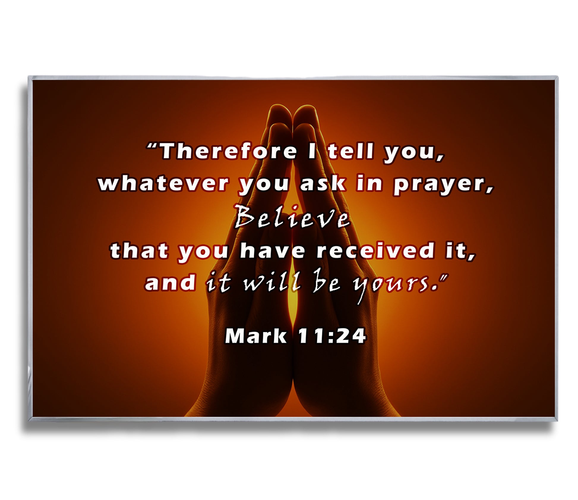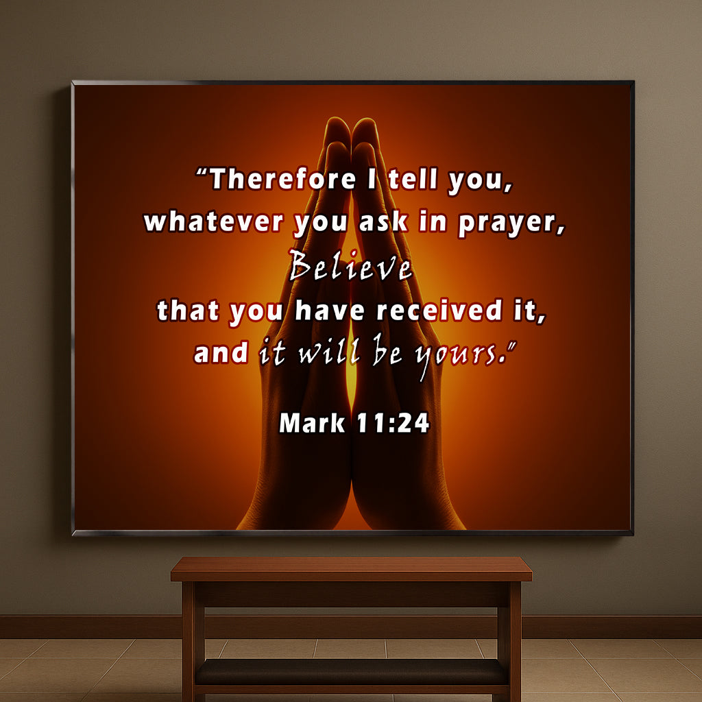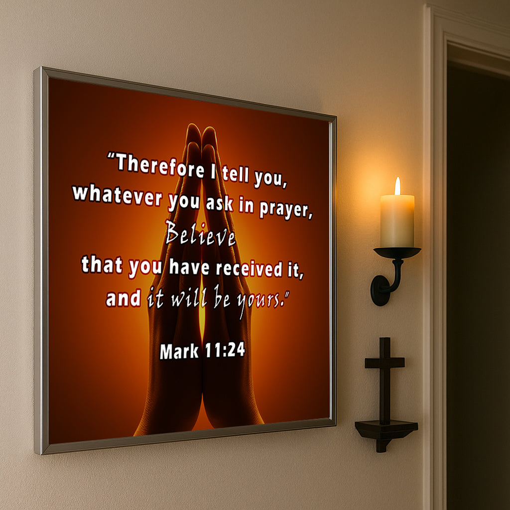 Inspire faith with this Praying Hands Scripture Wall Art, featuring Mark 11:24: “Therefore I tell you, whatever you ask in prayer, believe that you have received it, and it will be yours.” The image of hands joined in prayer against a glowing background creates a powerful reminder of trust, hope, and devotion. Perfect for prayer rooms, churches, or homes seeking spiritual encouragement. Professionally framed in durable metal, it blends timeless scripture with elegant design.