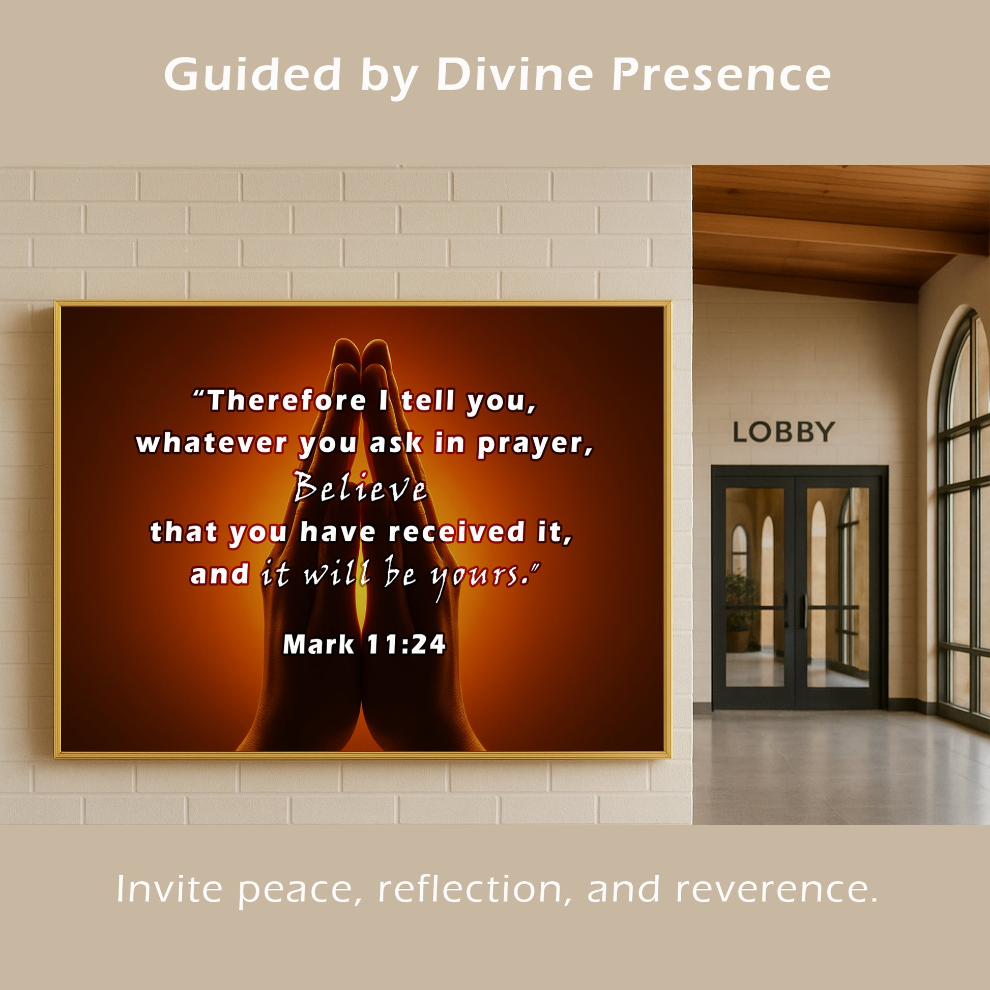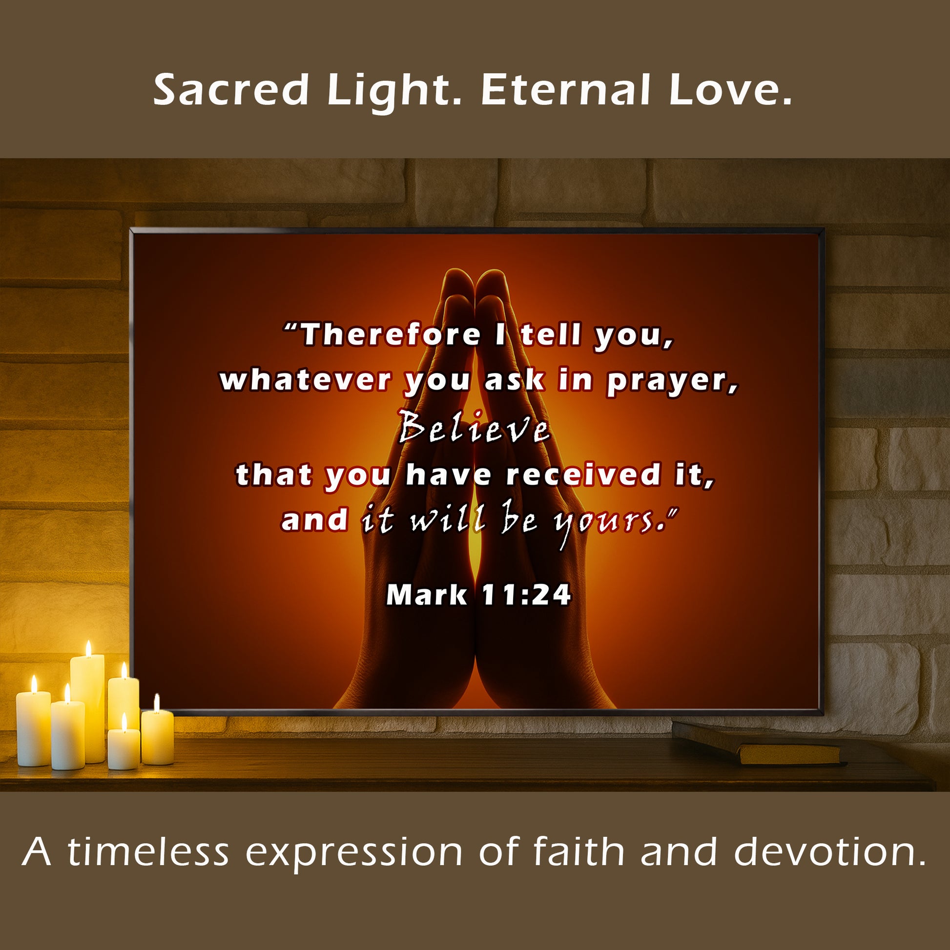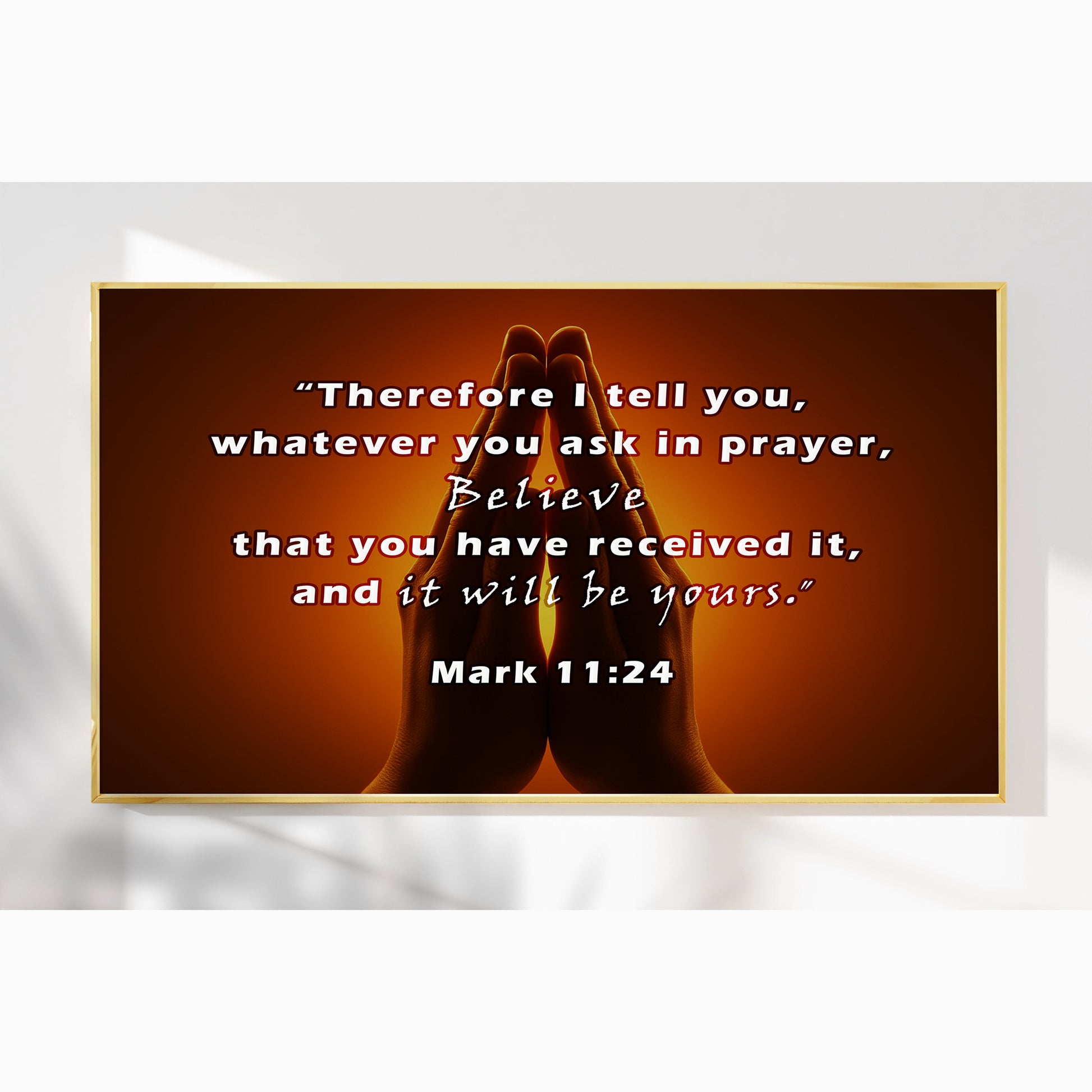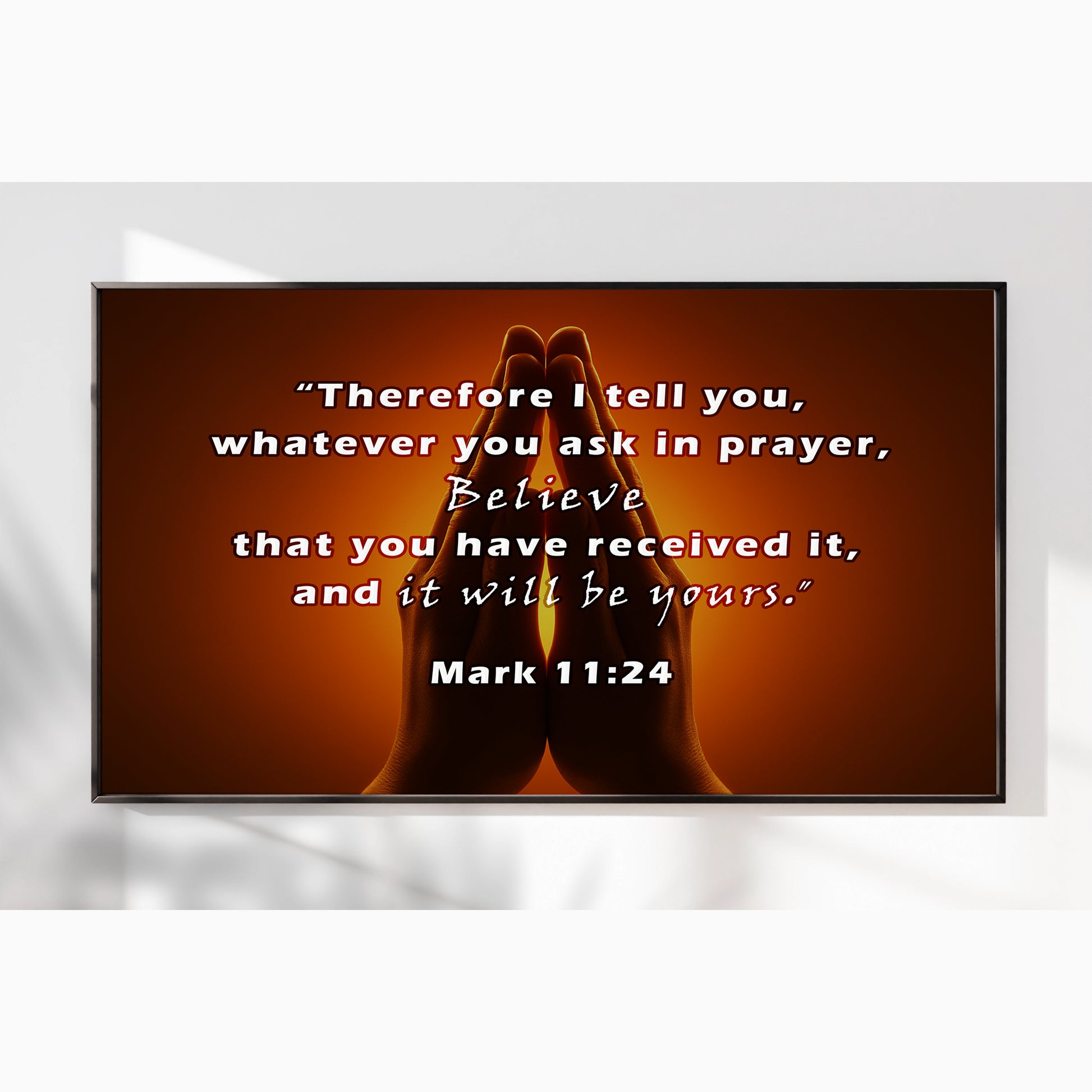 Inspire faith with this Praying Hands Scripture Wall Art, featuring Mark 11:24: “Therefore I tell you, whatever you ask in prayer, believe that you have received it, and it will be yours.” The image of hands joined in prayer against a glowing background creates a powerful reminder of trust, hope, and devotion. Perfect for prayer rooms, churches, or homes seeking spiritual encouragement. Professionally framed in durable metal, it blends timeless scripture with elegant design.