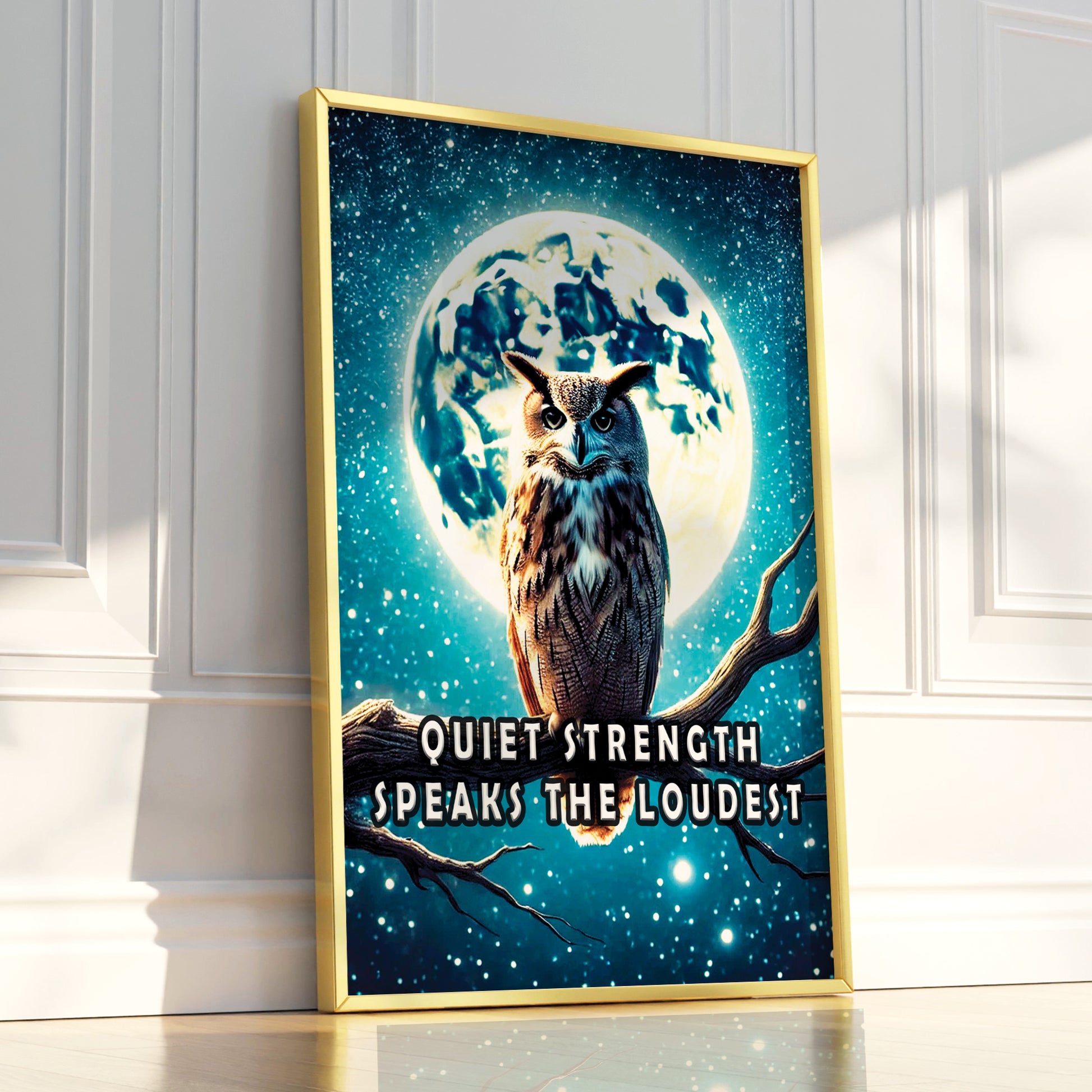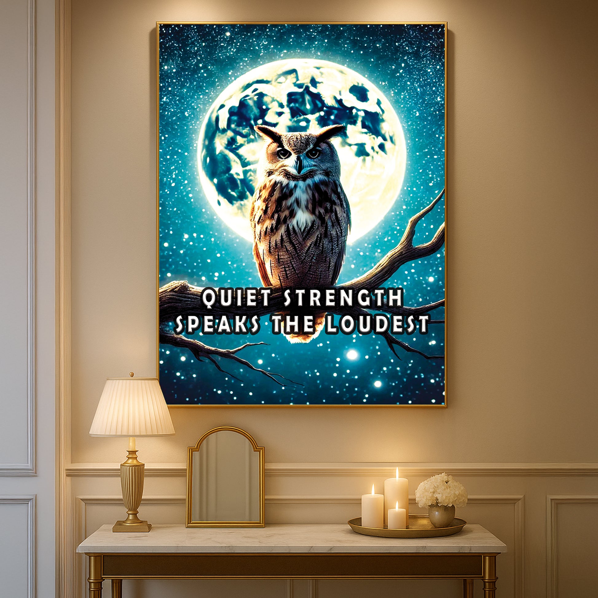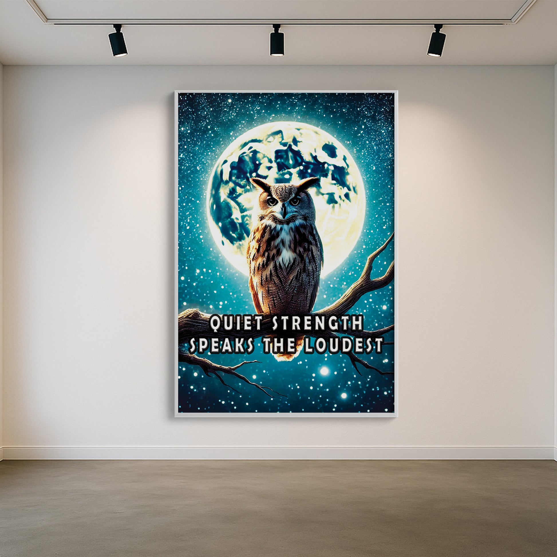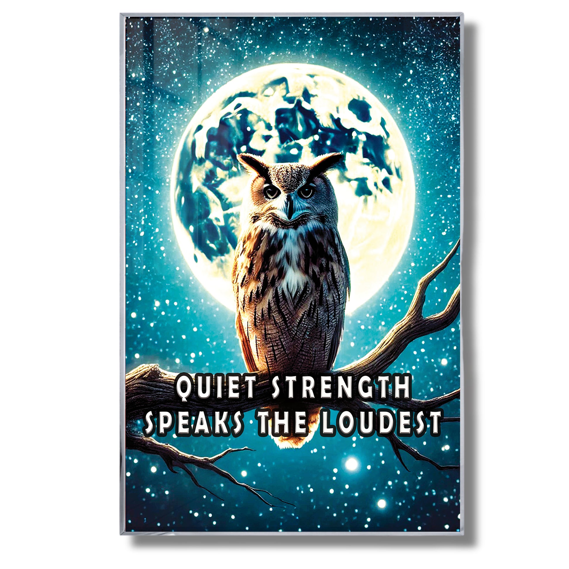 Channel the wisdom of the night with this majestic owl perched beneath a glowing full moon. “Quiet strength speaks the loudest” reminds us that resilience doesn’t need to roar. The dramatic night sky and powerful silhouette offer a bold statement for any room.