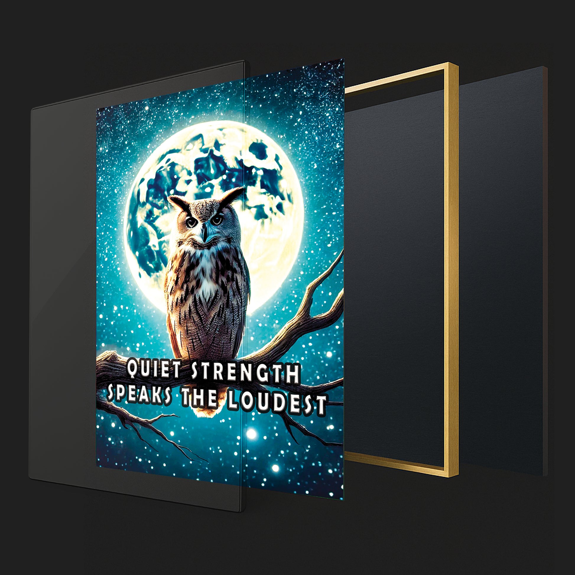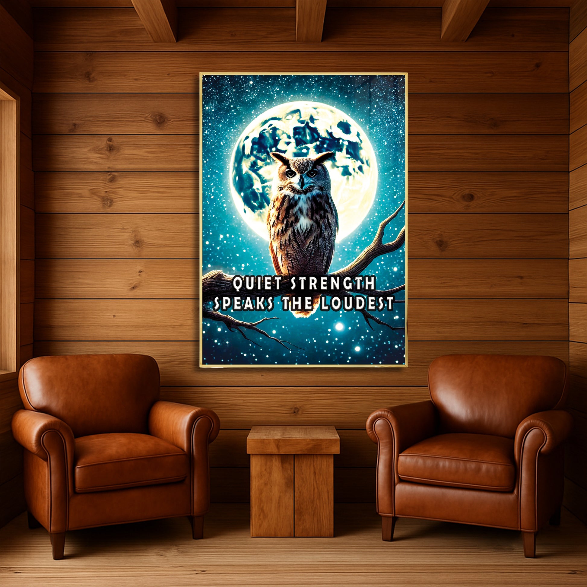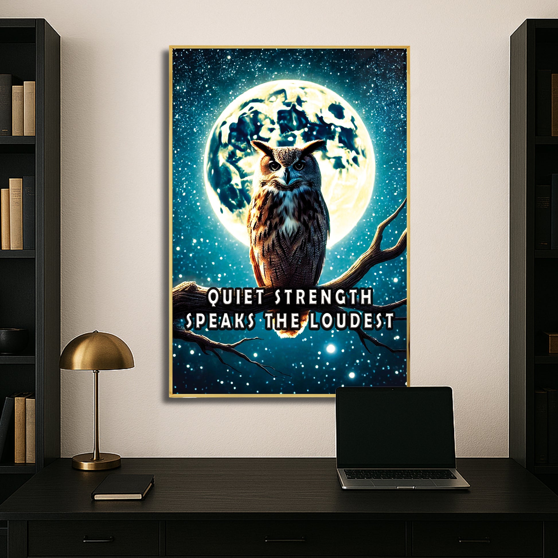 Channel the wisdom of the night with this majestic owl perched beneath a glowing full moon. “Quiet strength speaks the loudest” reminds us that resilience doesn’t need to roar. The dramatic night sky and powerful silhouette offer a bold statement for any room.