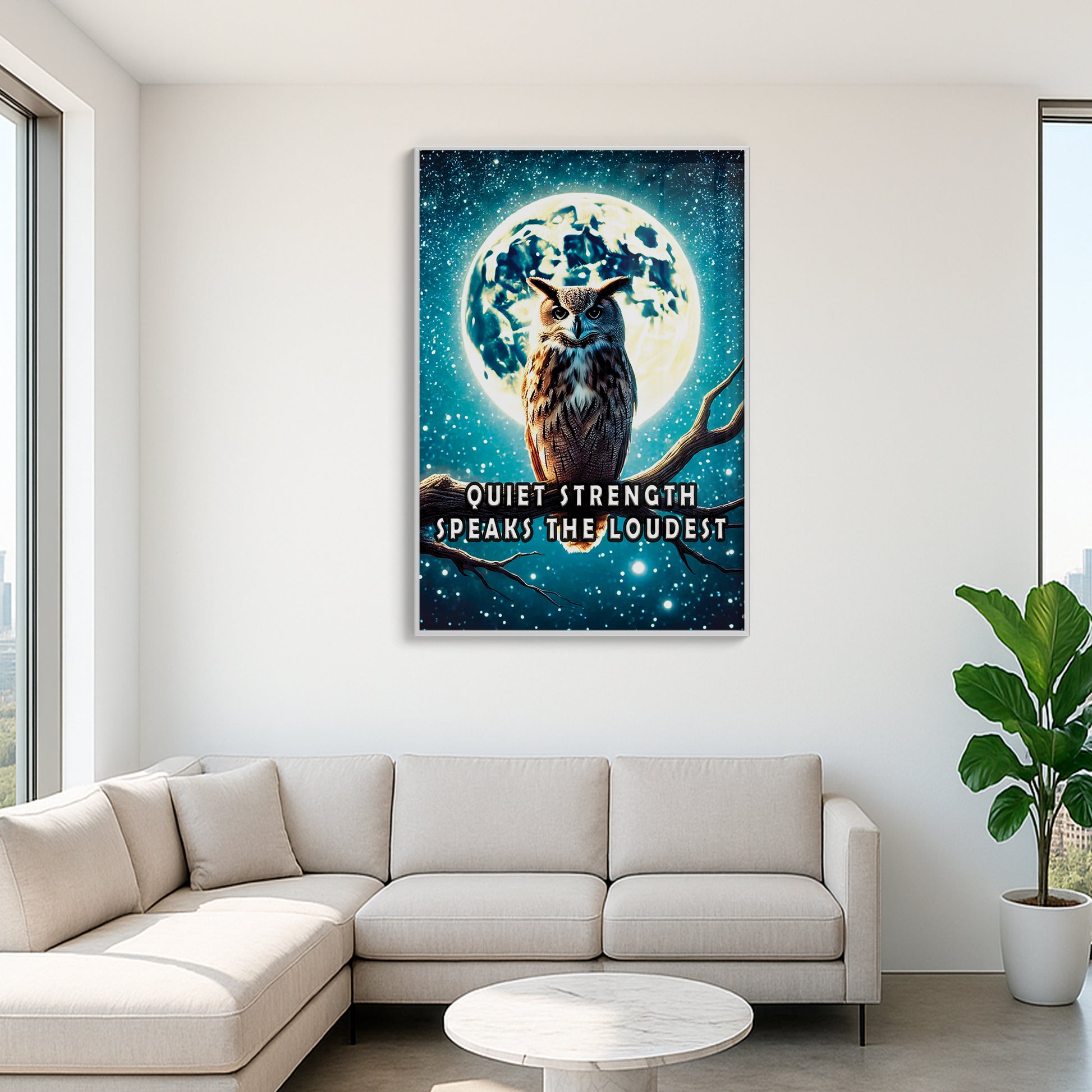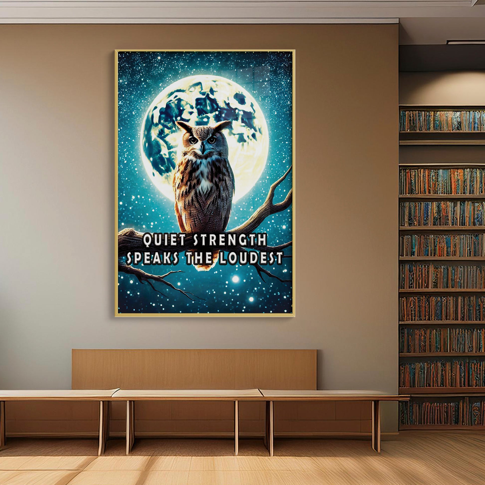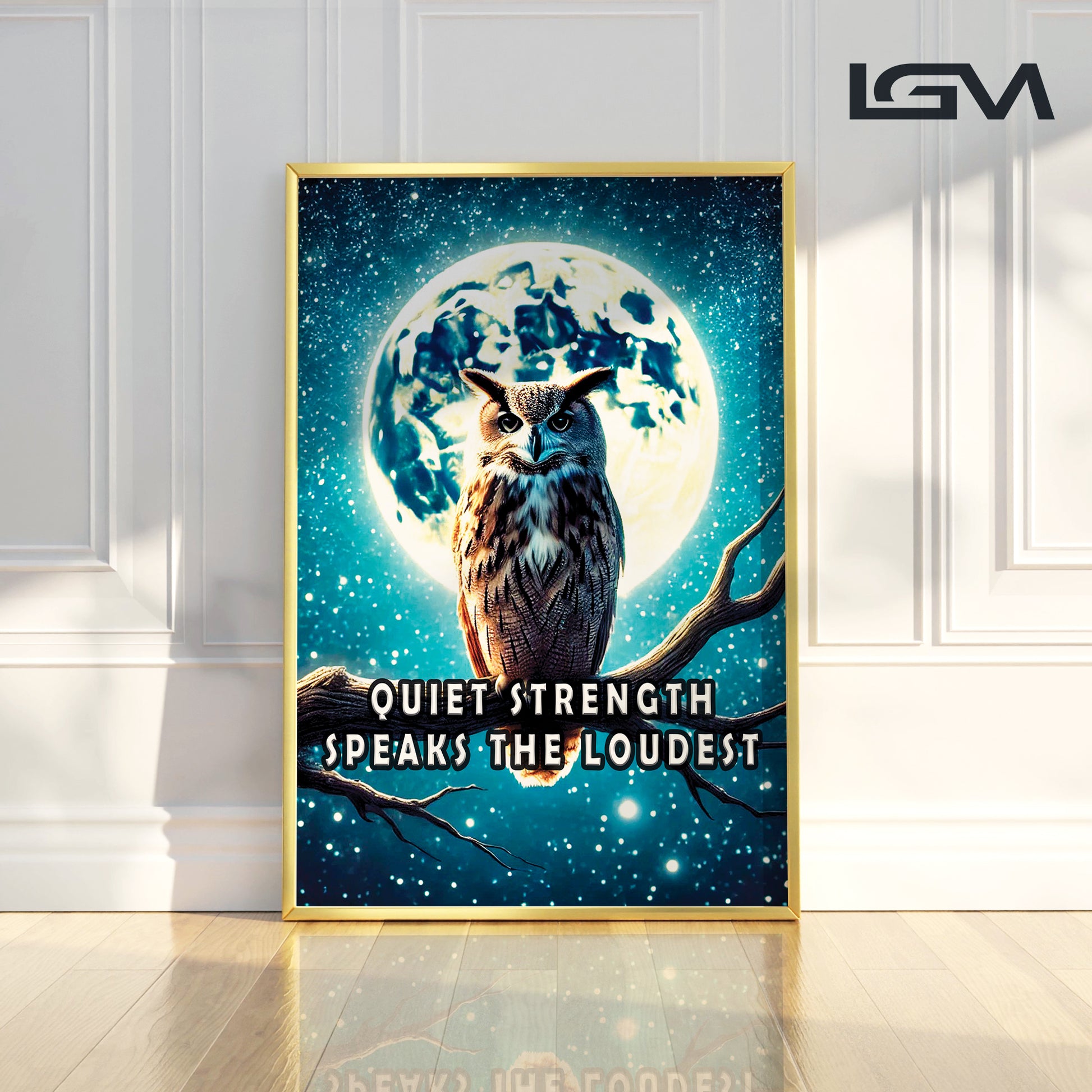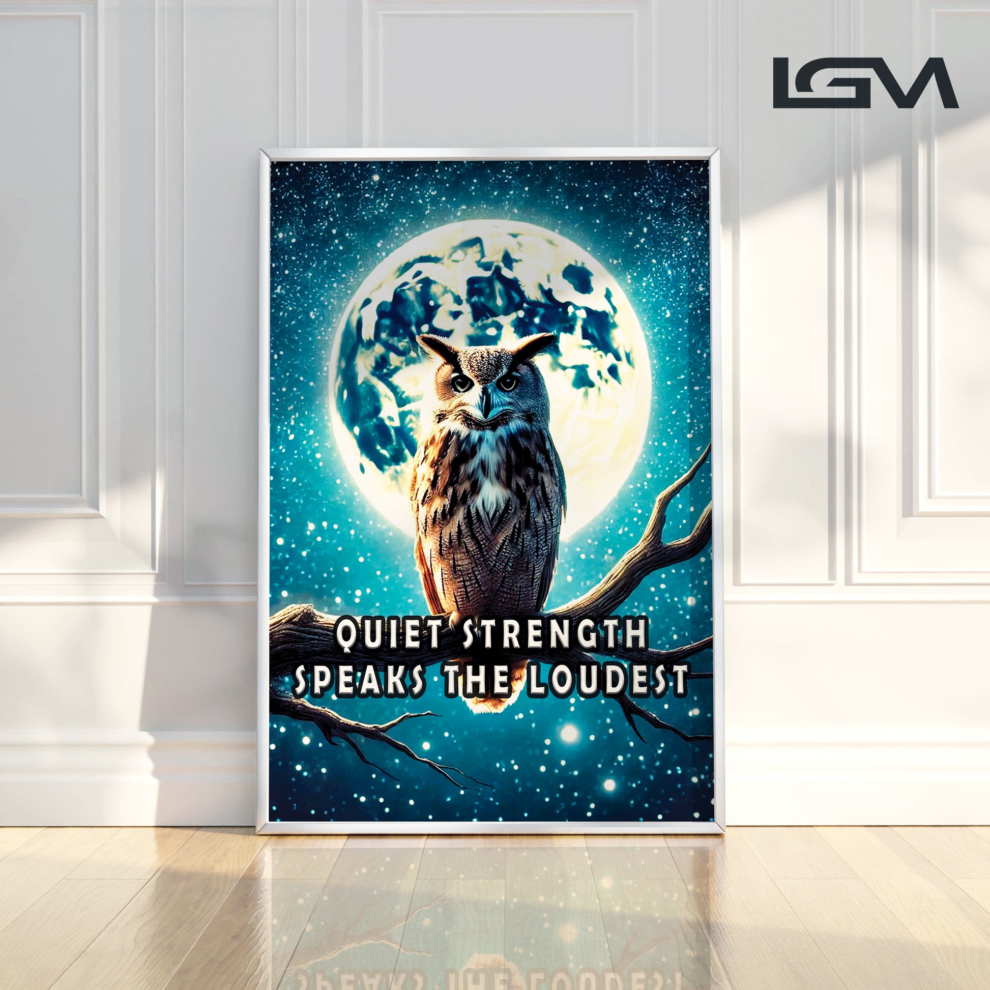 Channel the wisdom of the night with this majestic owl perched beneath a glowing full moon. “Quiet strength speaks the loudest” reminds us that resilience doesn’t need to roar. The dramatic night sky and powerful silhouette offer a bold statement for any room.
