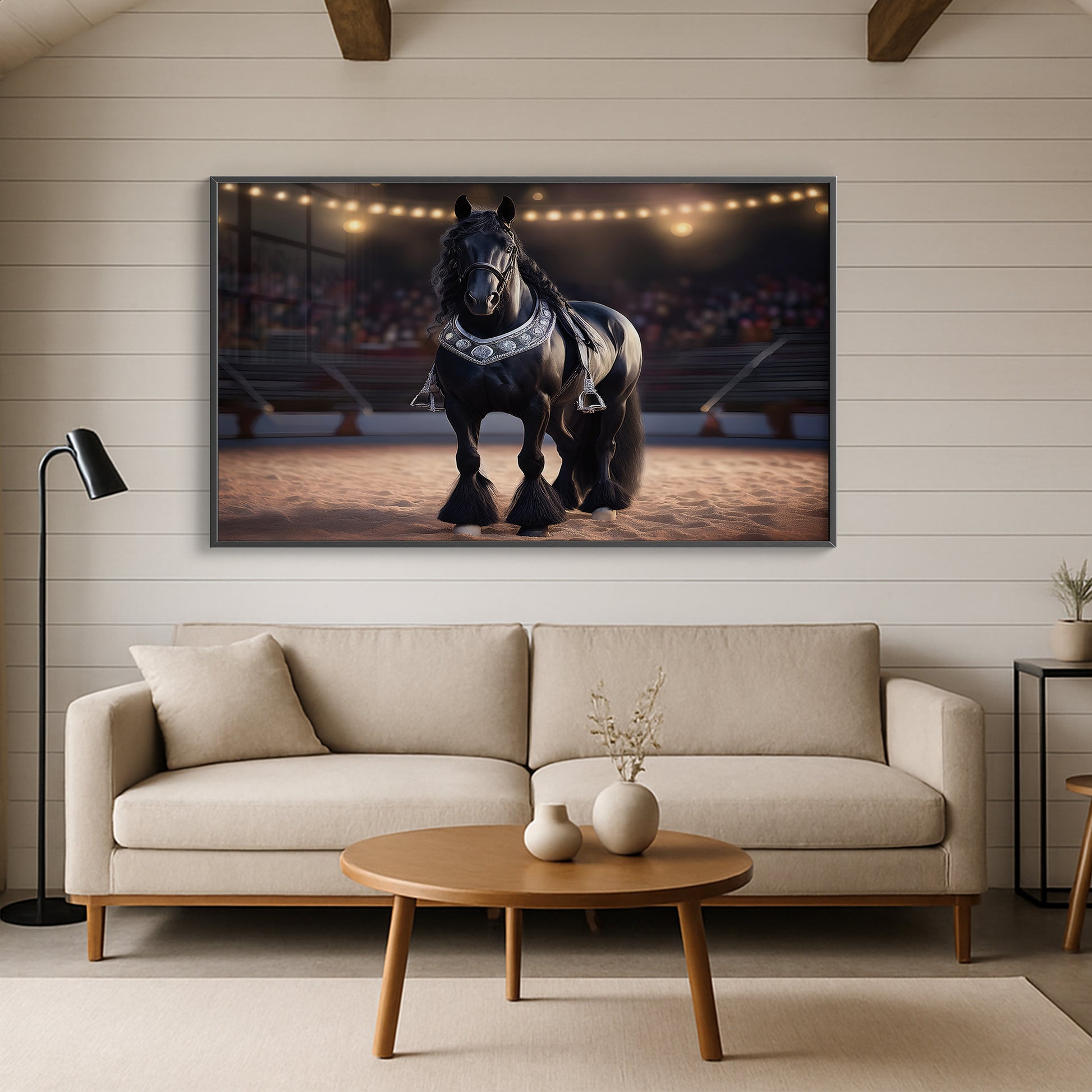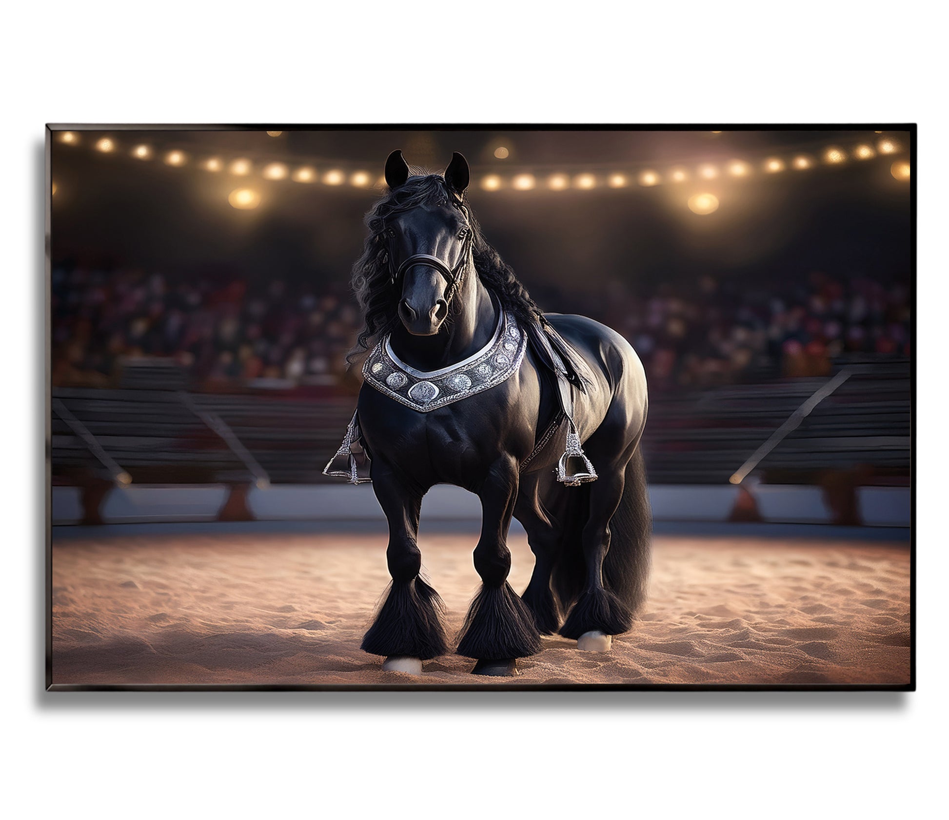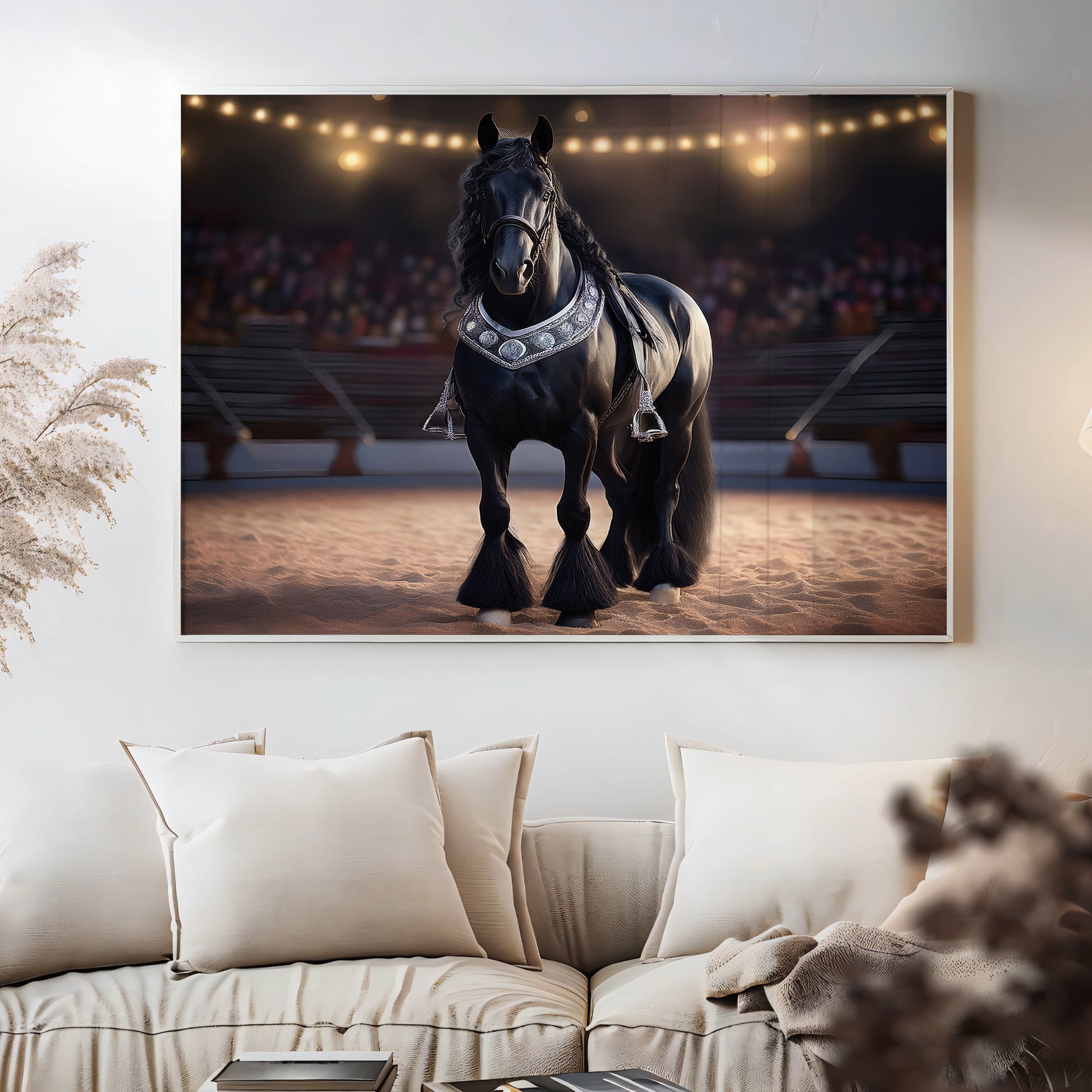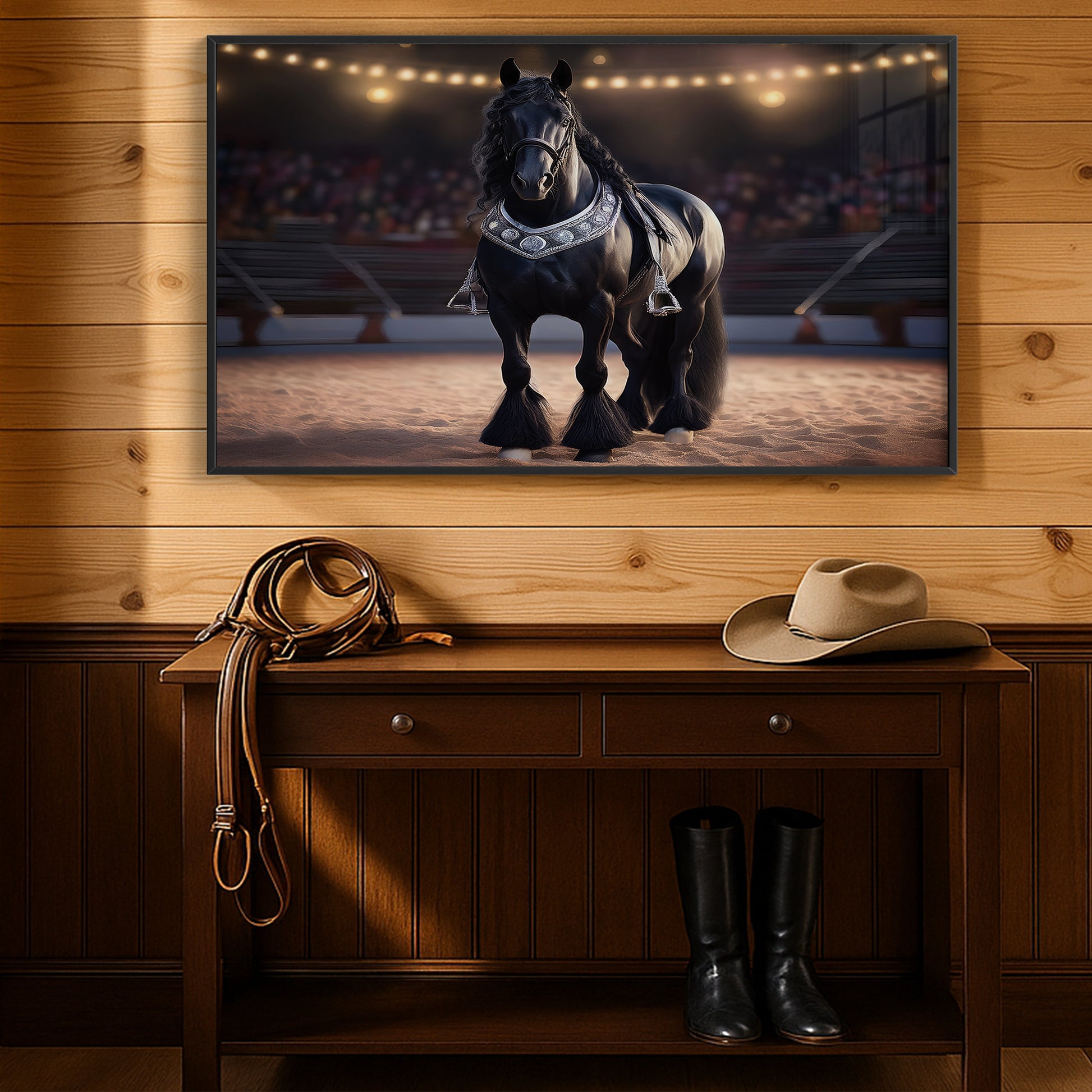 Command attention with this majestic image of a Percheron draft horse proudly posed under arena lights. Adorned in detailed silver tack with feathered hooves and braided mane, this piece captures showtime glamour and noble heritage. A captivating centerpiece for any gallery wall.