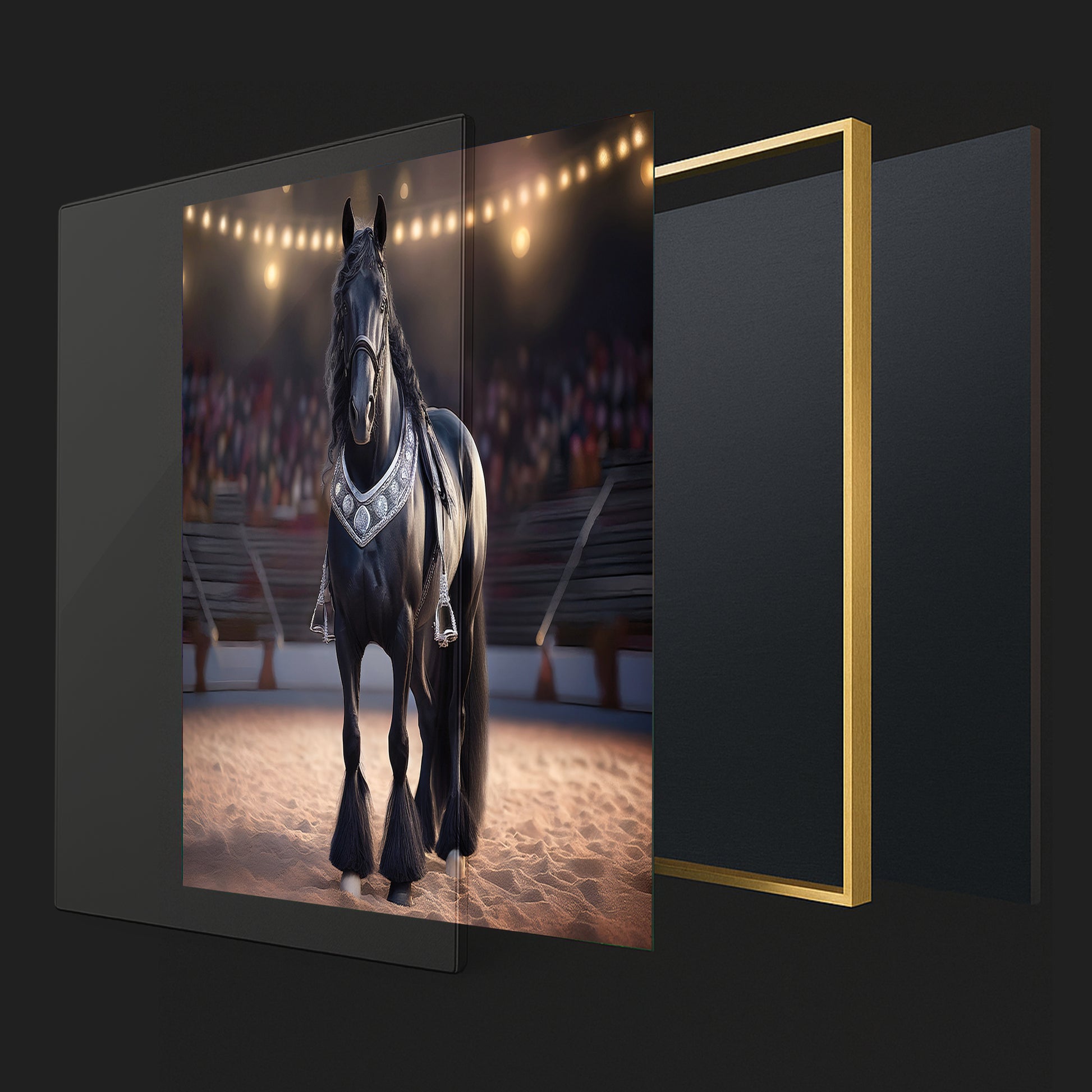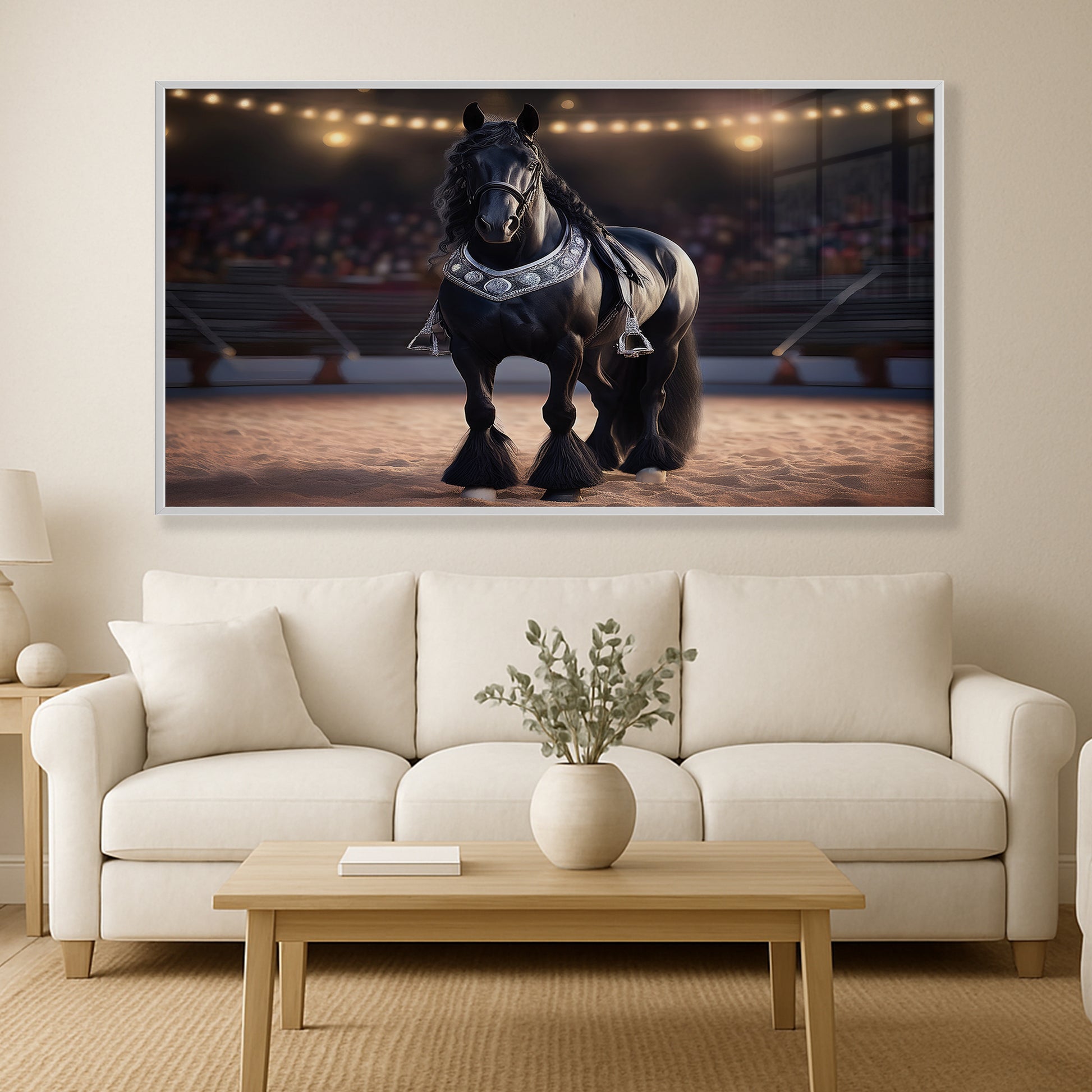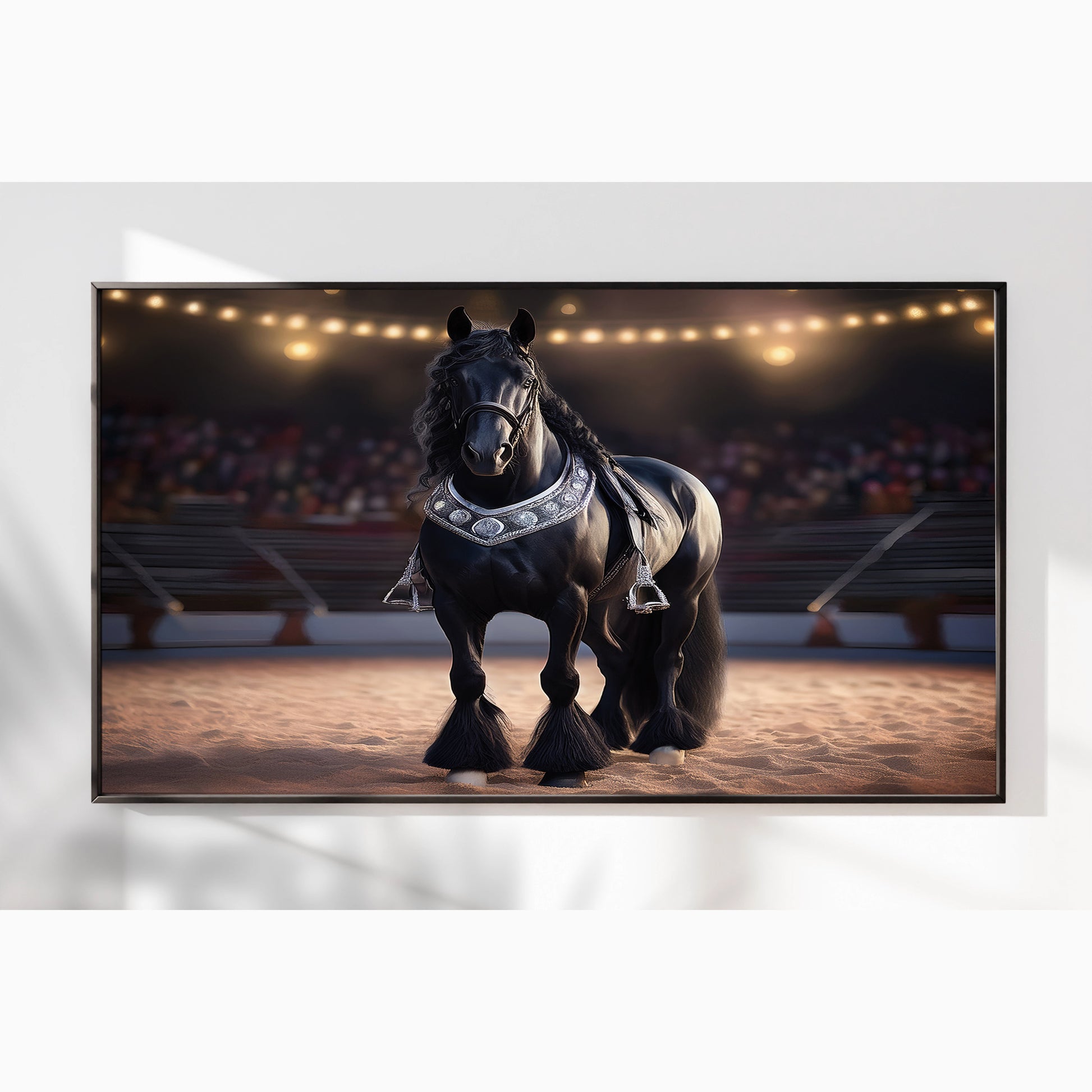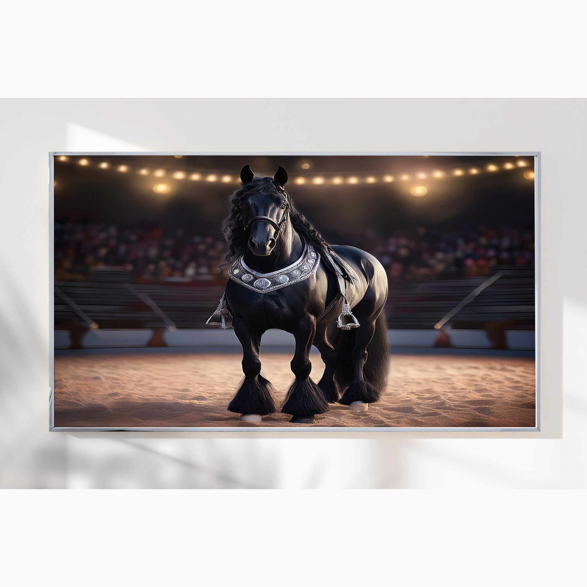 Command attention with this majestic image of a Percheron draft horse proudly posed under arena lights. Adorned in detailed silver tack with feathered hooves and braided mane, this piece captures showtime glamour and noble heritage. A captivating centerpiece for any gallery wall.