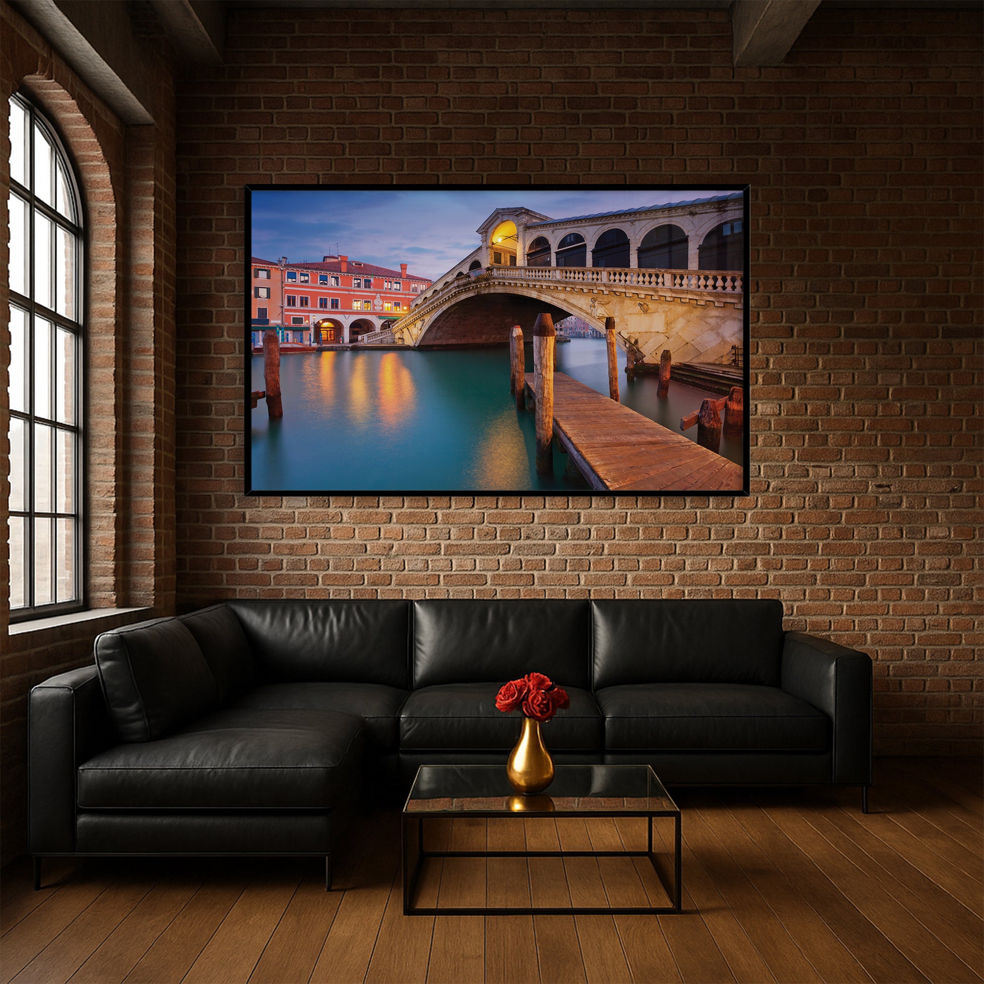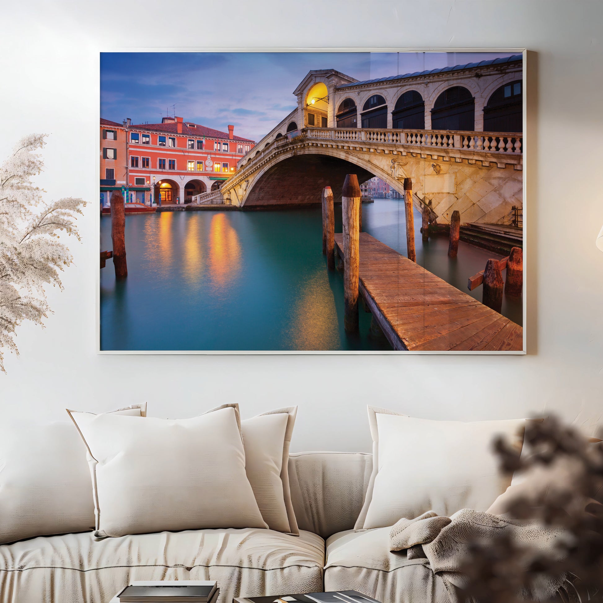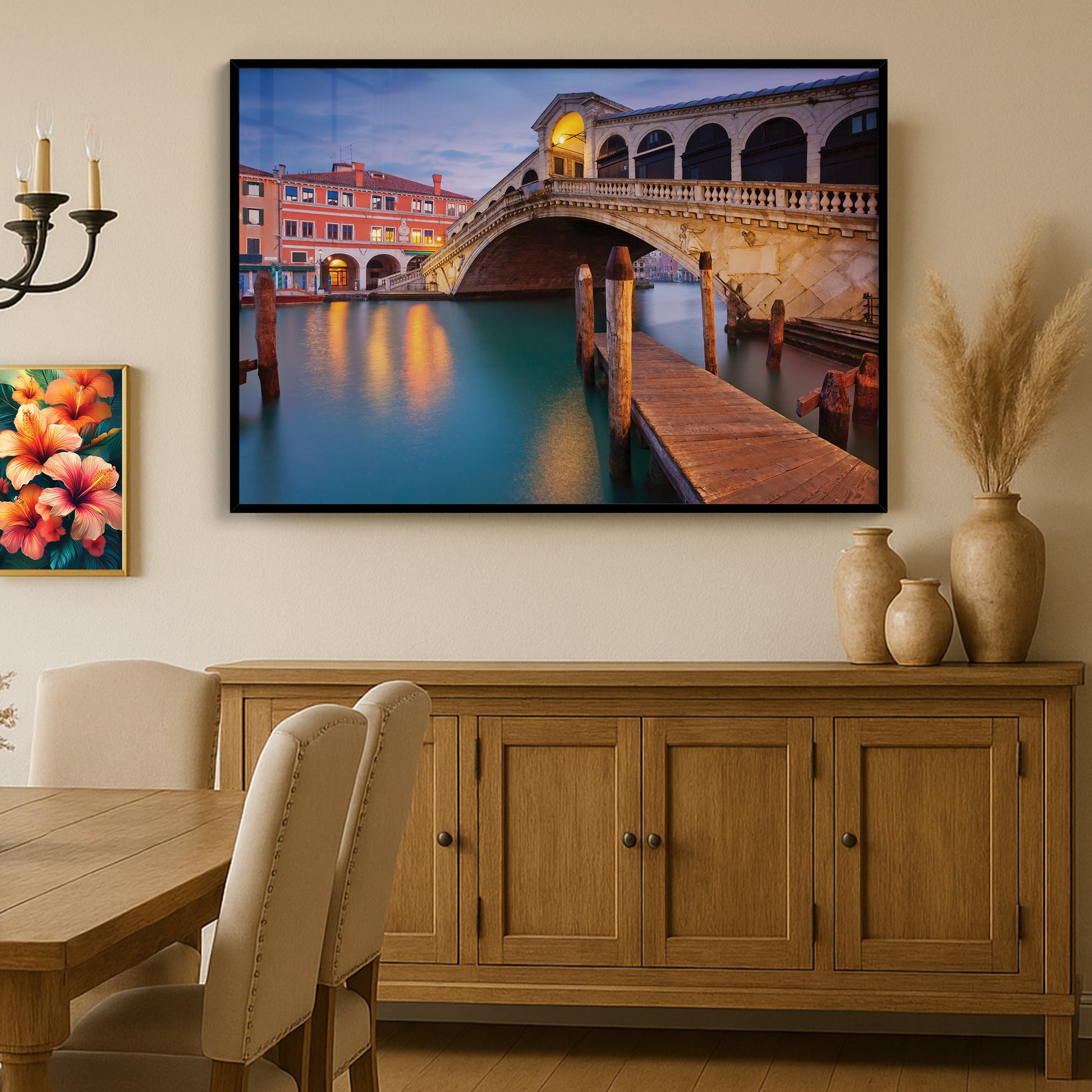 Capture the magic of Venice after dark with this glowing image of the Rialto Bridge lit by golden evening lights. The reflections on the canal and historic buildings create a serene, romantic ambiance perfect for any interior style.