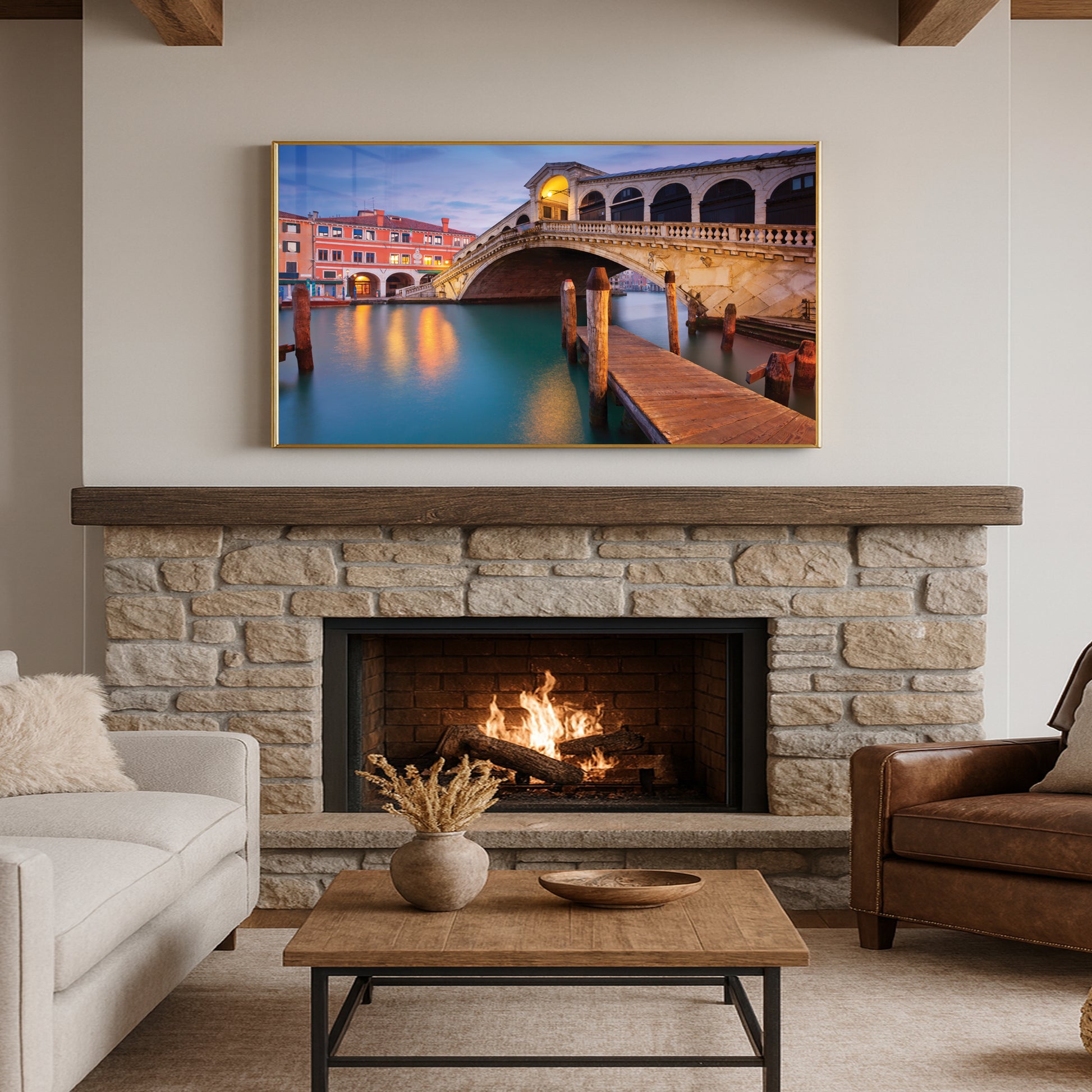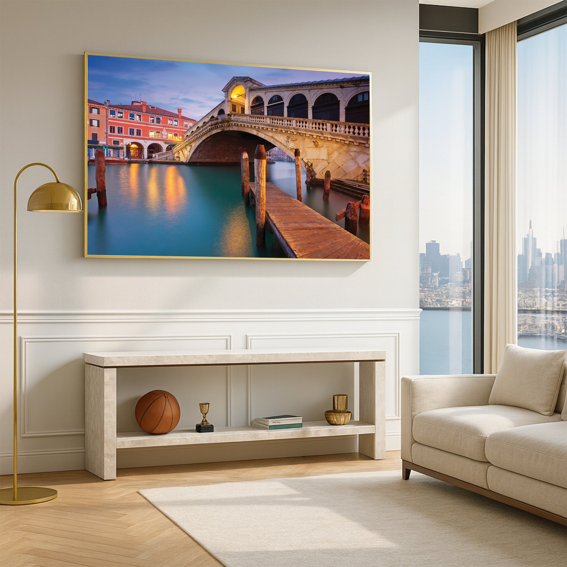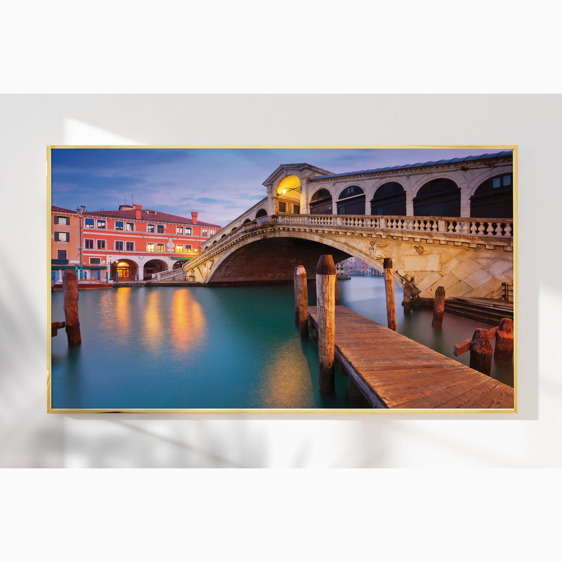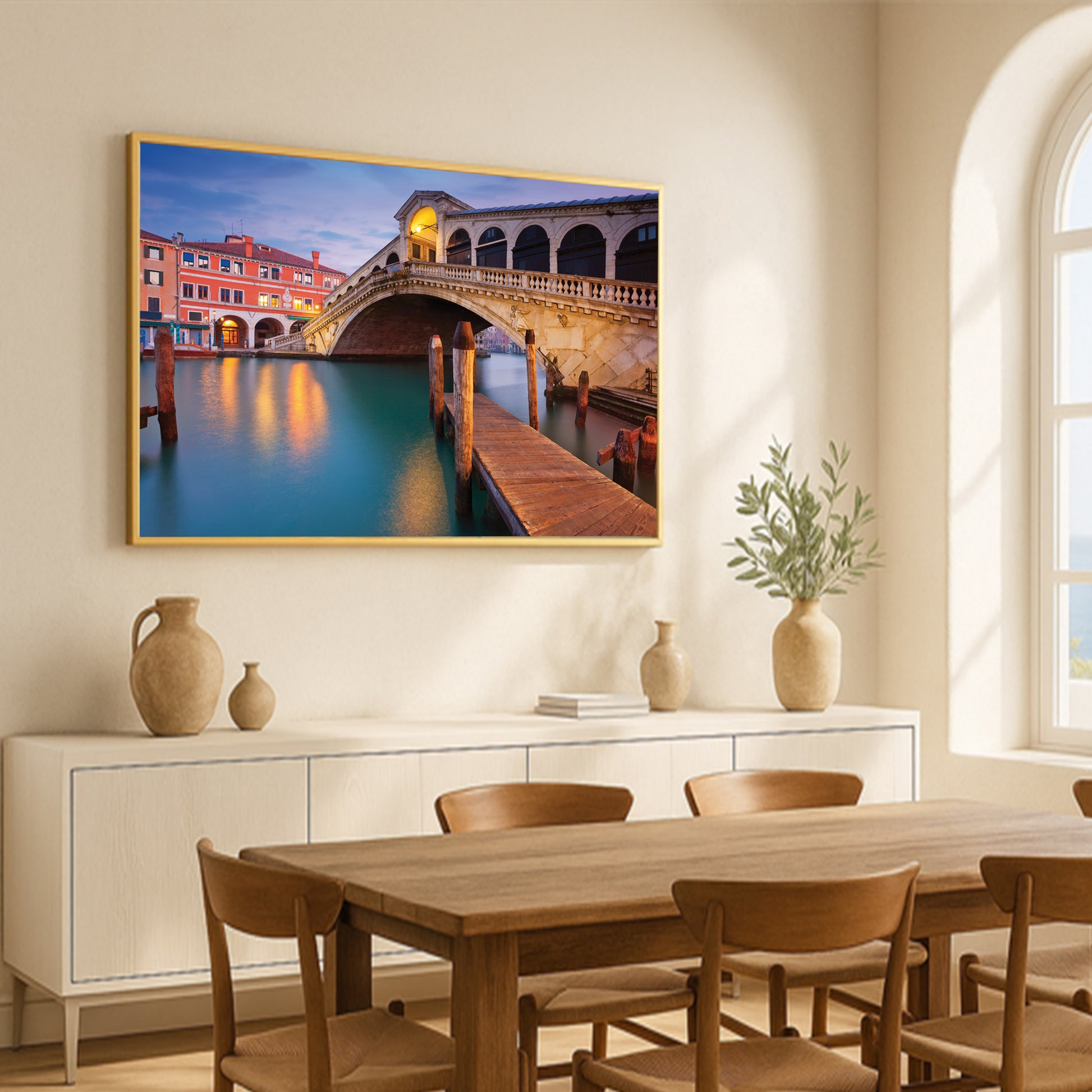 Capture the magic of Venice after dark with this glowing image of the Rialto Bridge lit by golden evening lights. The reflections on the canal and historic buildings create a serene, romantic ambiance perfect for any interior style.