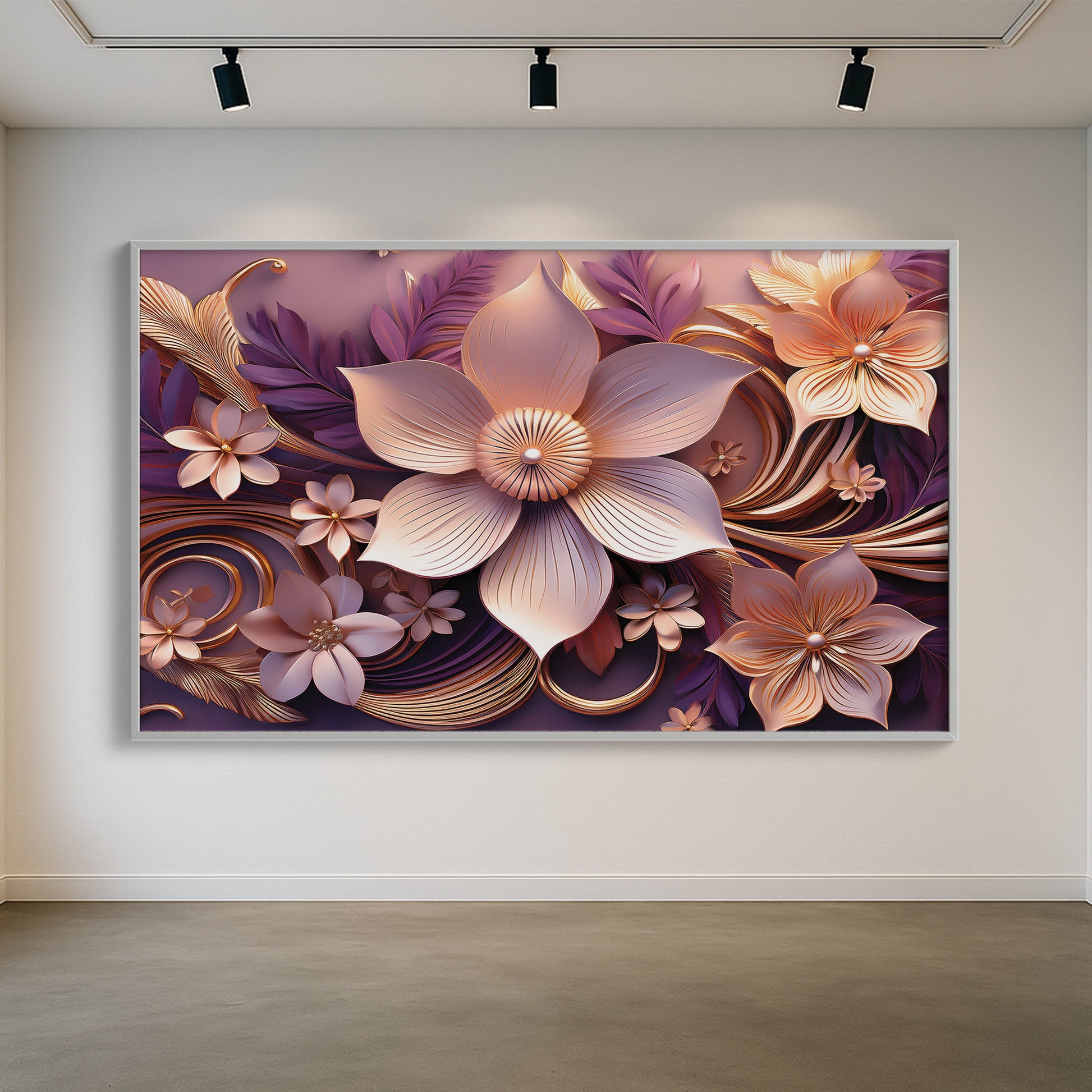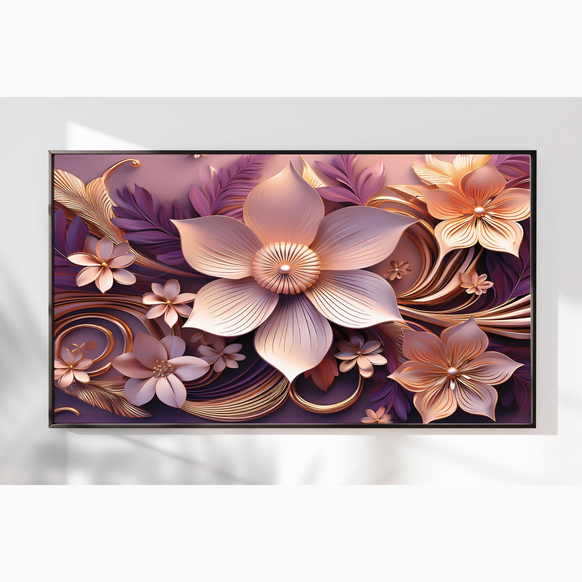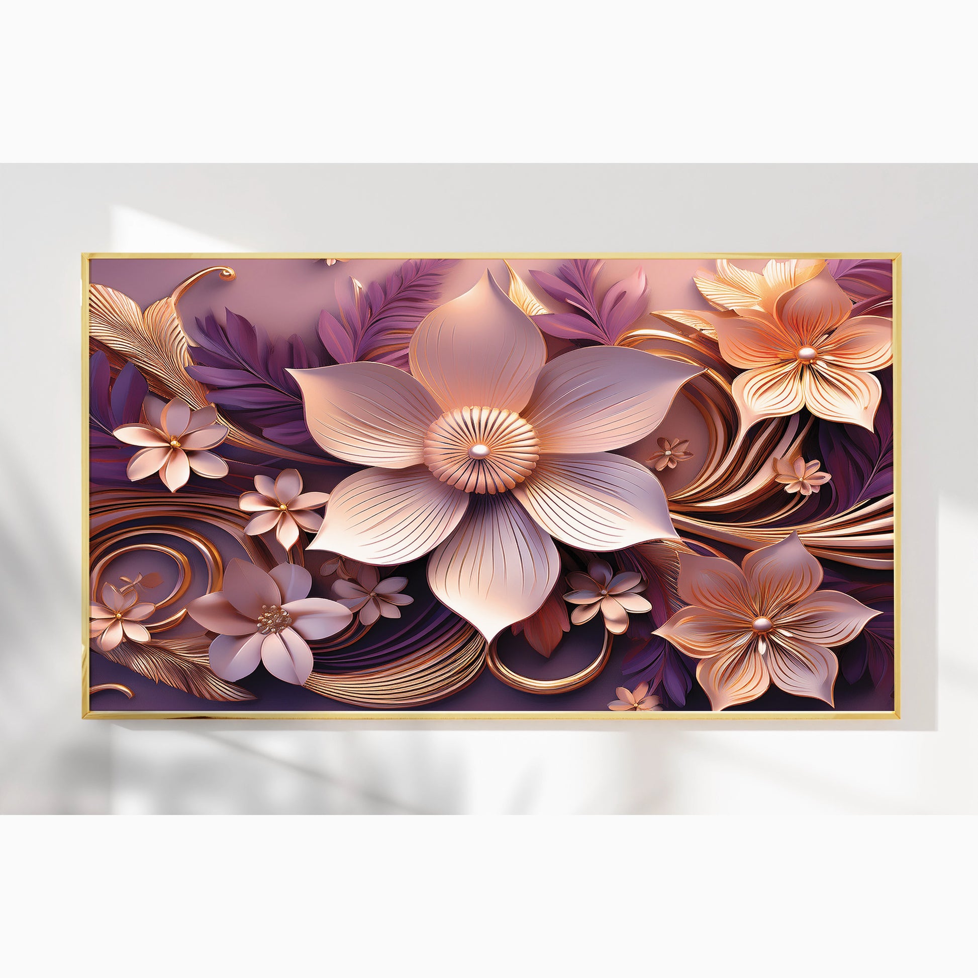 Add warmth and elegance to your home with this Light Pink & Purple Floral Metal Framed Wall Art. Featuring soft blush petals with golden highlights set against flowing purple accents, this piece radiates romance and modern luxury. The detailed metallic finish brings depth and sophistication, making it a versatile artwork for bedrooms, living rooms, or gallery-style walls.