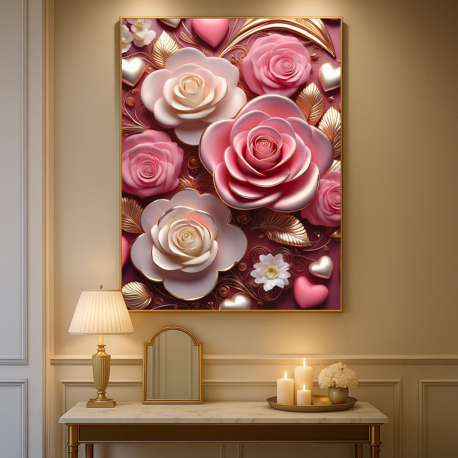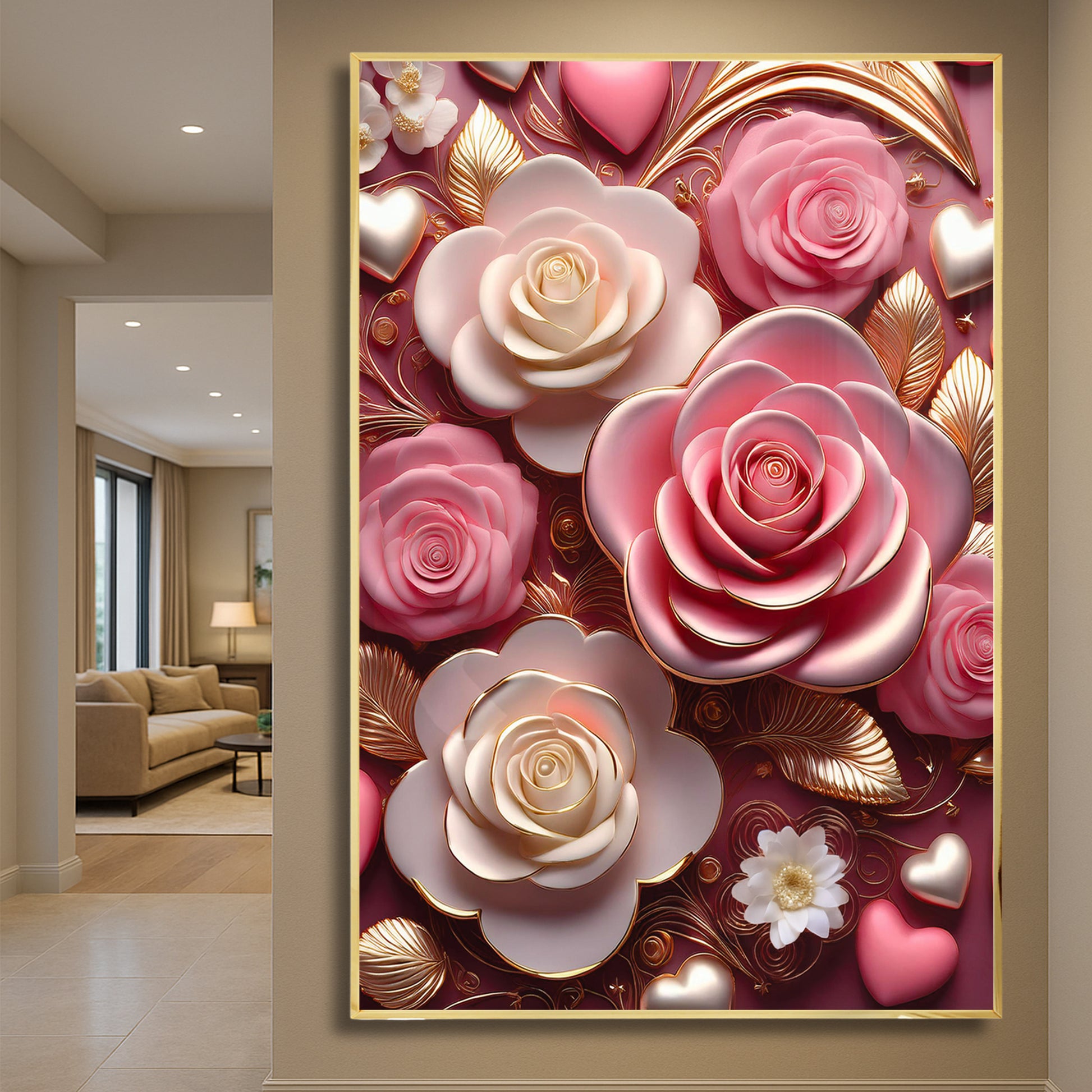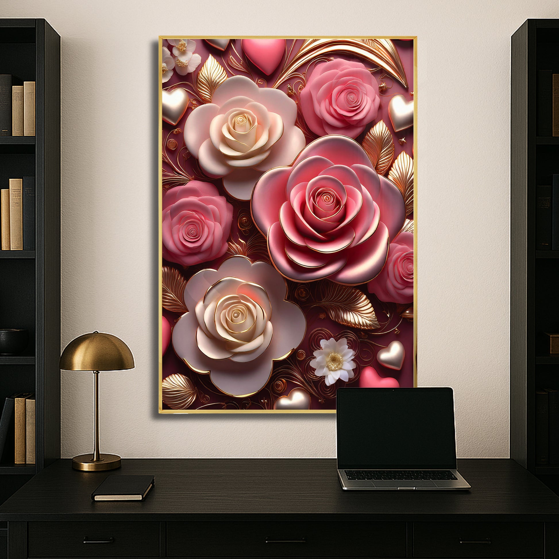 Celebrate timeless romance with this Pink & White Rose Metal Framed Wall Art. Featuring delicate pink and ivory roses accented with golden highlights, this artwork captures elegance and warmth in every detail. The soft color palette paired with metallic detailing creates a dreamy, luxurious finish perfect for bedrooms, living rooms, or gift-giving. Crafted with a sleek metal frame, it brings beauty and sophistication to any modern home.