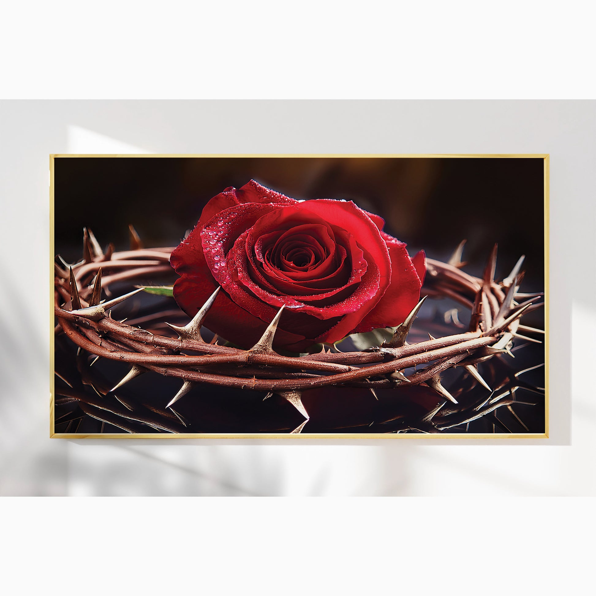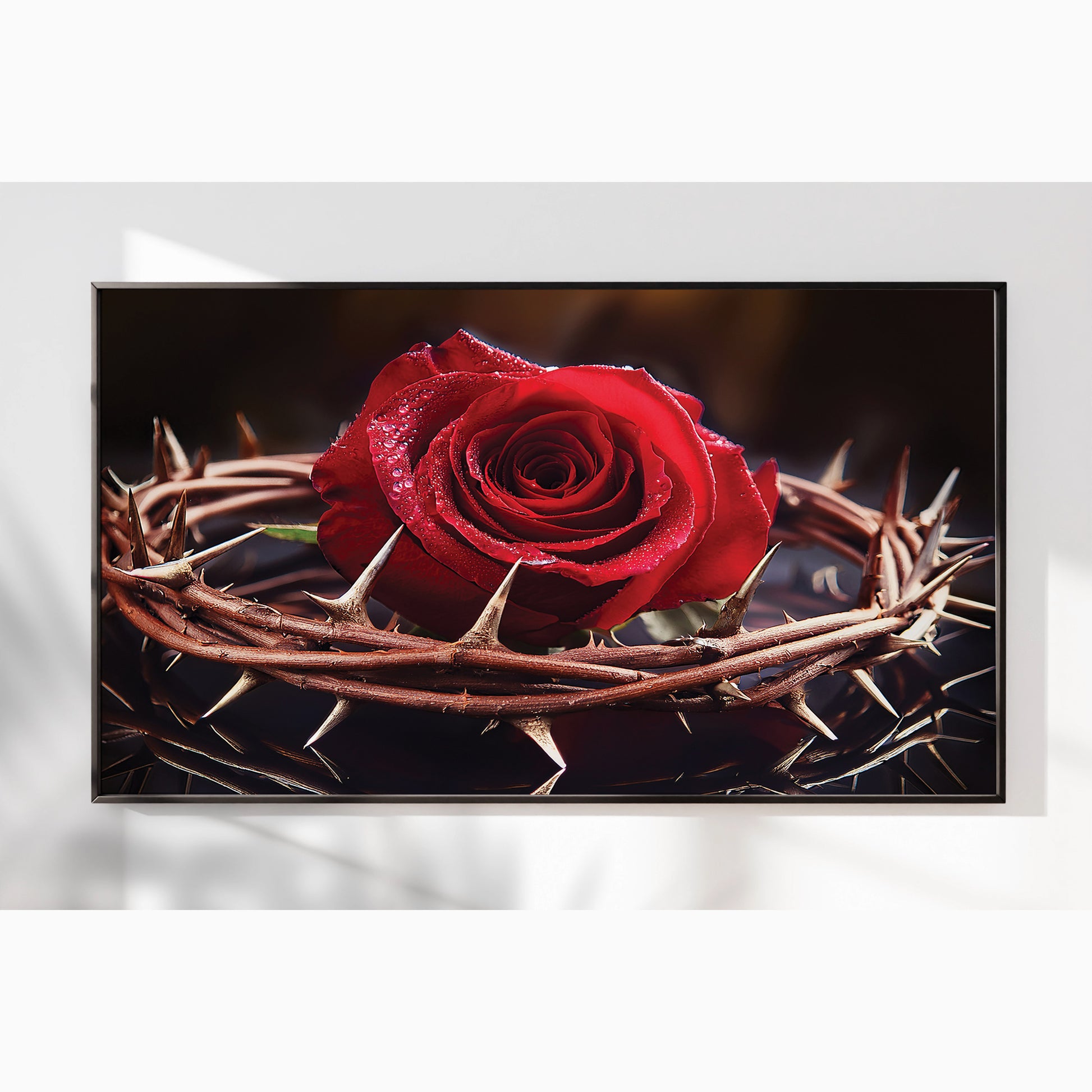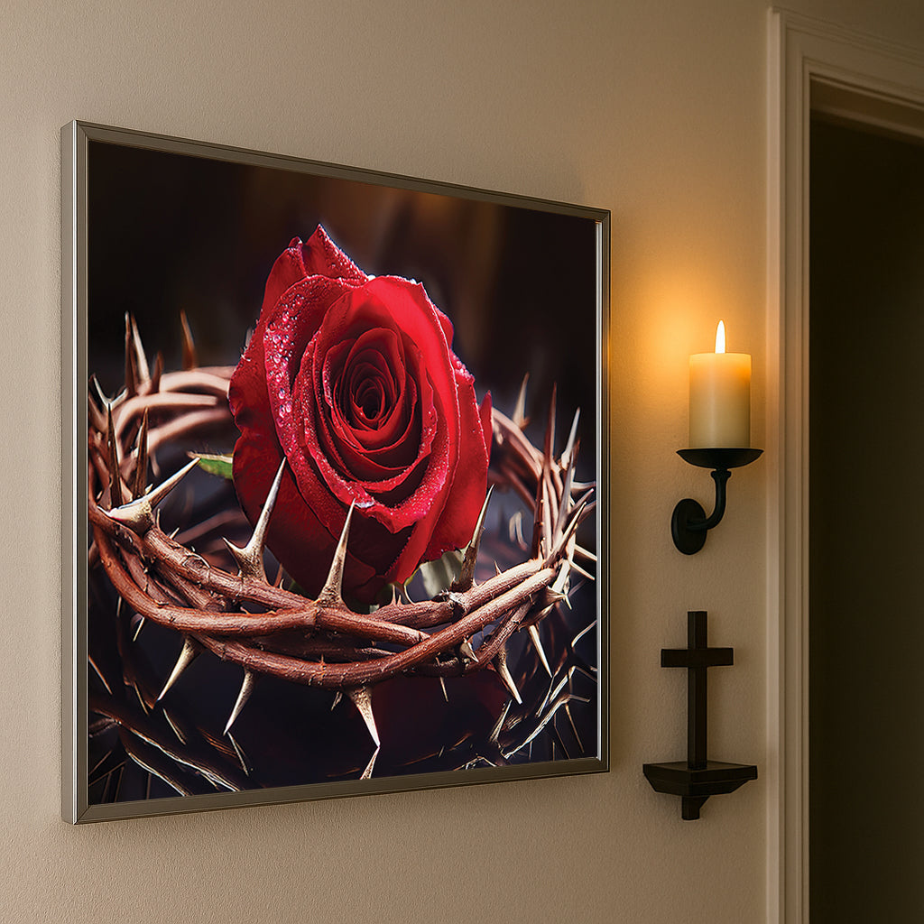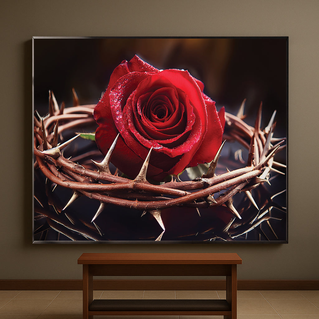 Capture the profound beauty of sacrifice with this Rose with Crown of Thorns Wall Art. Featuring a vivid red rose encircled by a crown of thorns, this artwork represents love, redemption, and Christ’s sacrifice. The striking contrast of vibrant petals against sharp thorns creates an emotional and powerful visual, making it a unique centerpiece for homes, prayer rooms, or sacred spaces. Expertly framed in metal, it delivers depth, elegance, and meaning.