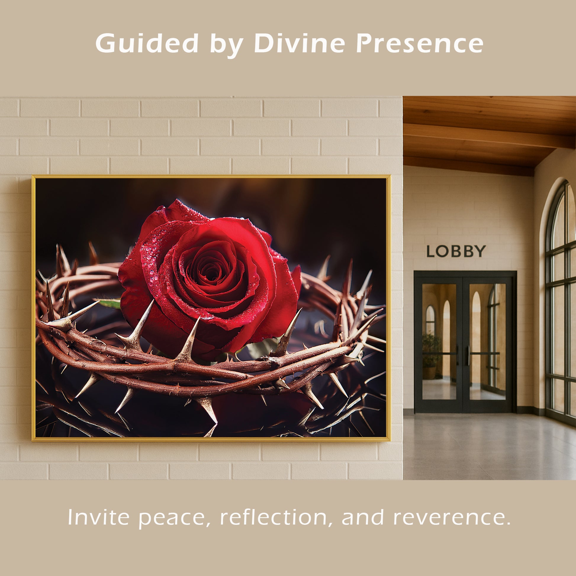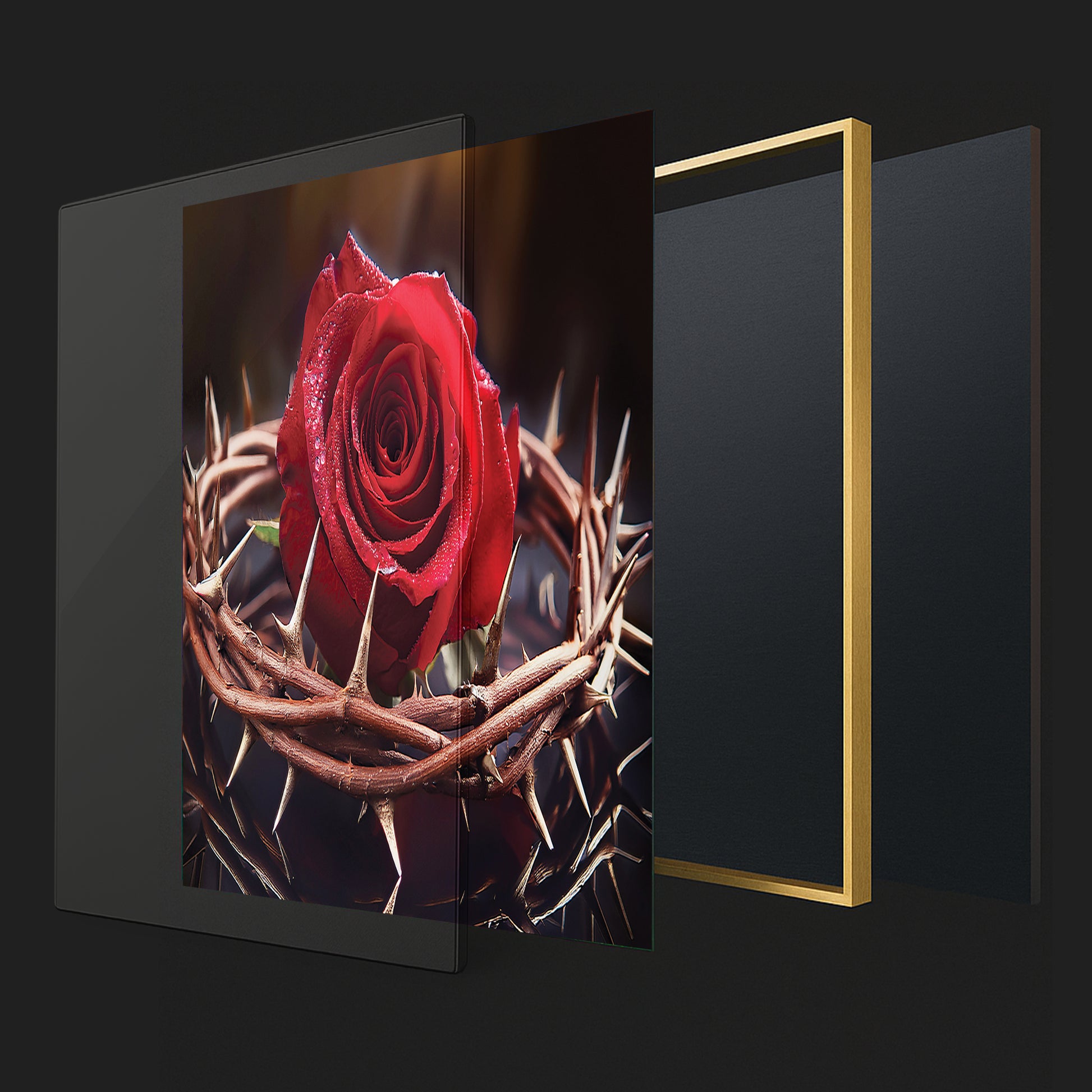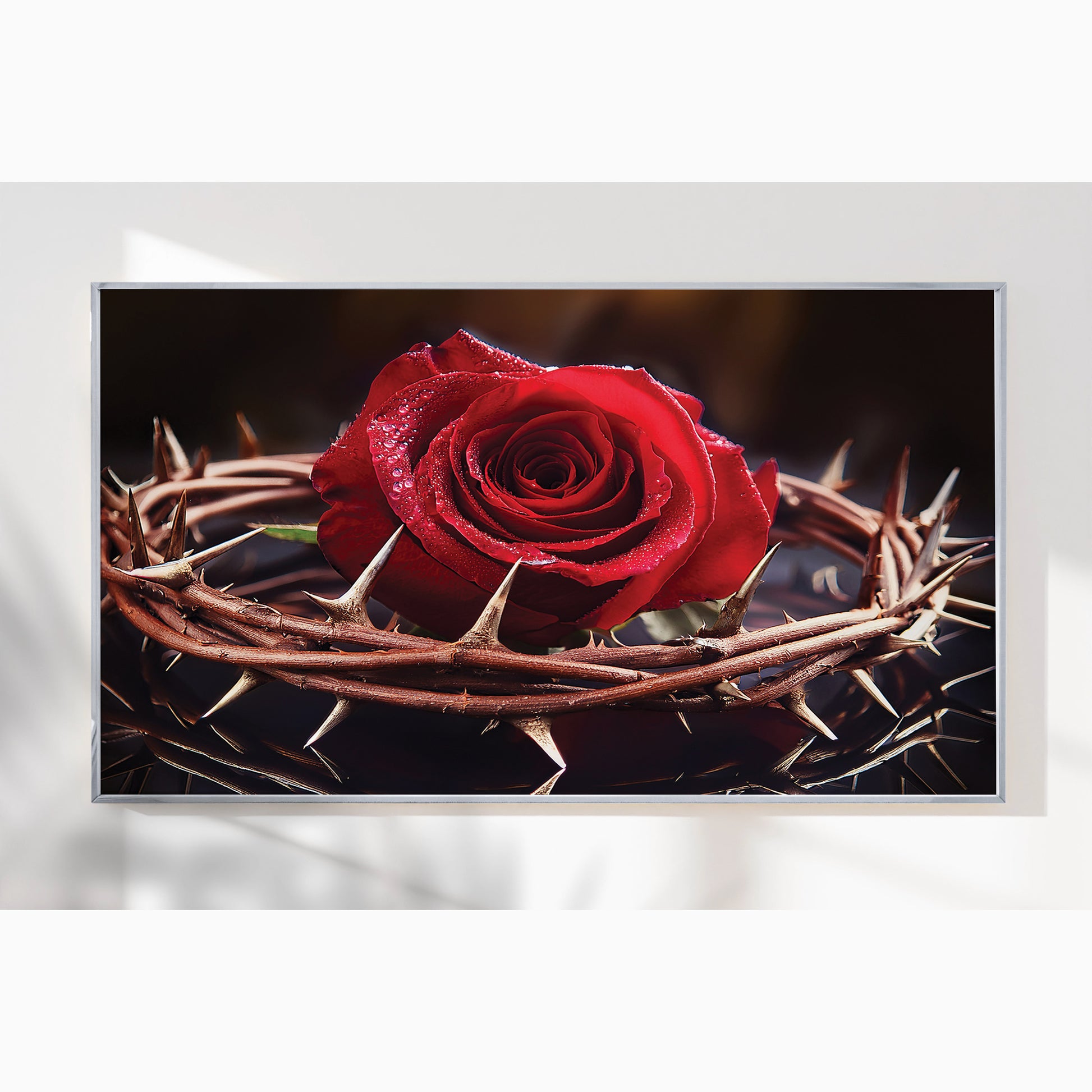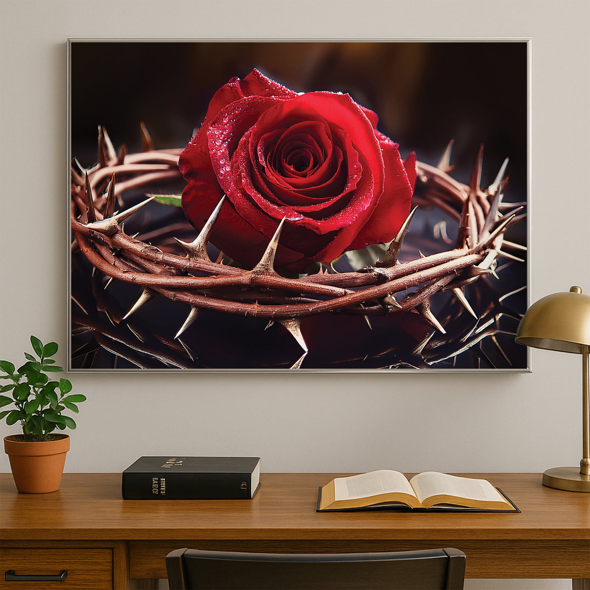 Capture the profound beauty of sacrifice with this Rose with Crown of Thorns Wall Art. Featuring a vivid red rose encircled by a crown of thorns, this artwork represents love, redemption, and Christ’s sacrifice. The striking contrast of vibrant petals against sharp thorns creates an emotional and powerful visual, making it a unique centerpiece for homes, prayer rooms, or sacred spaces. Expertly framed in metal, it delivers depth, elegance, and meaning.